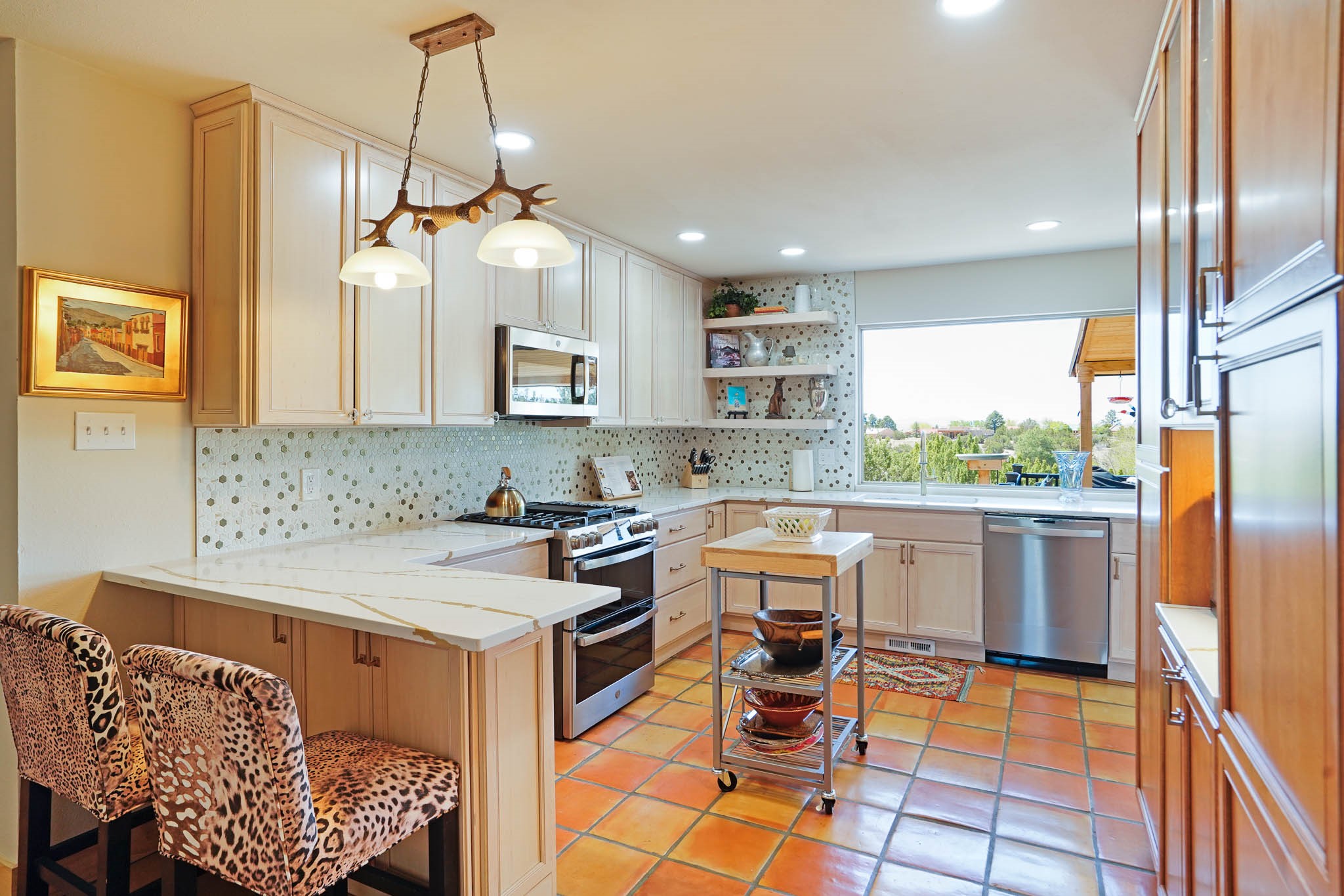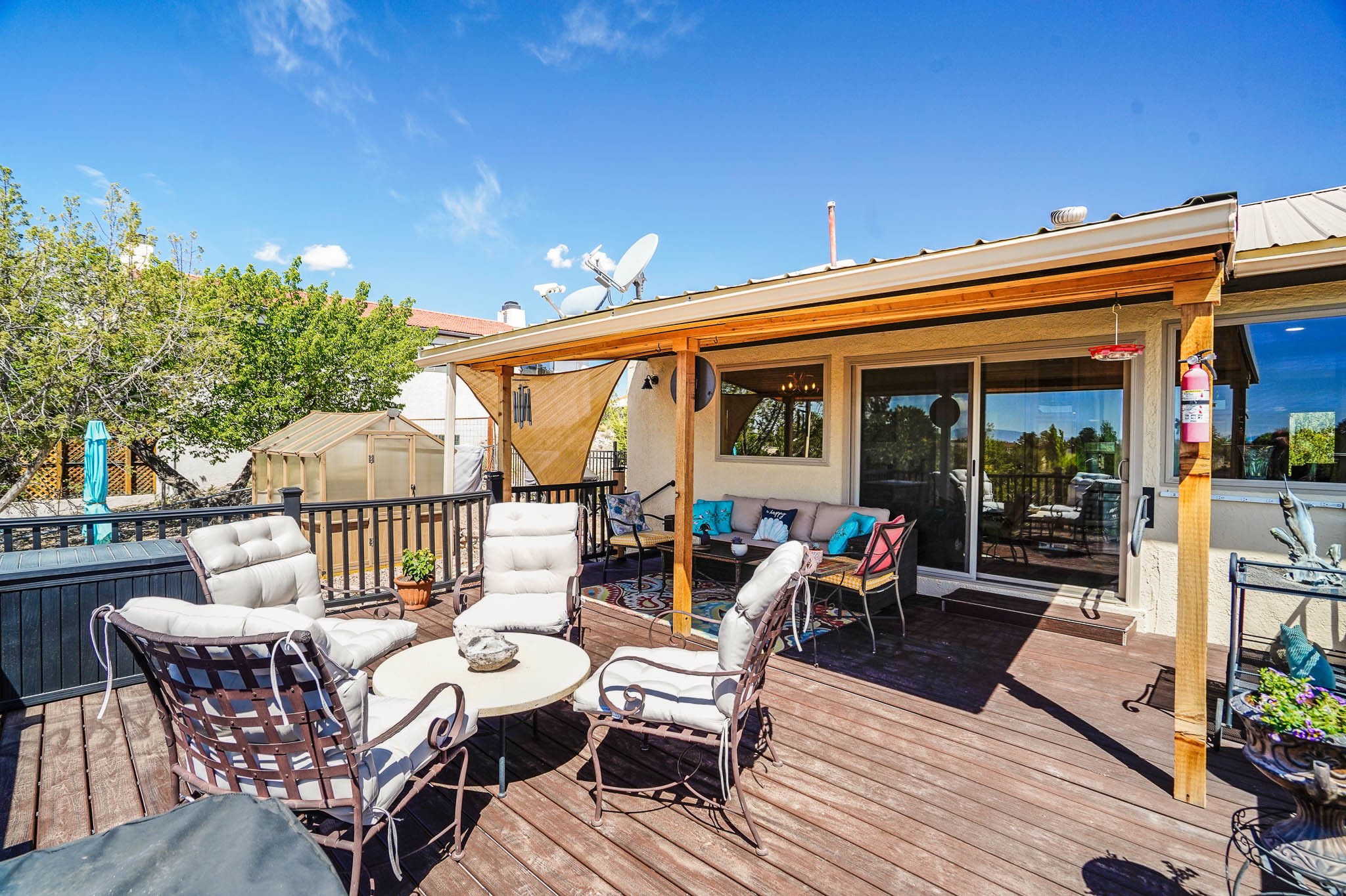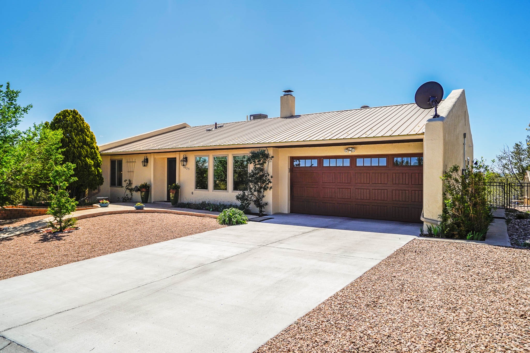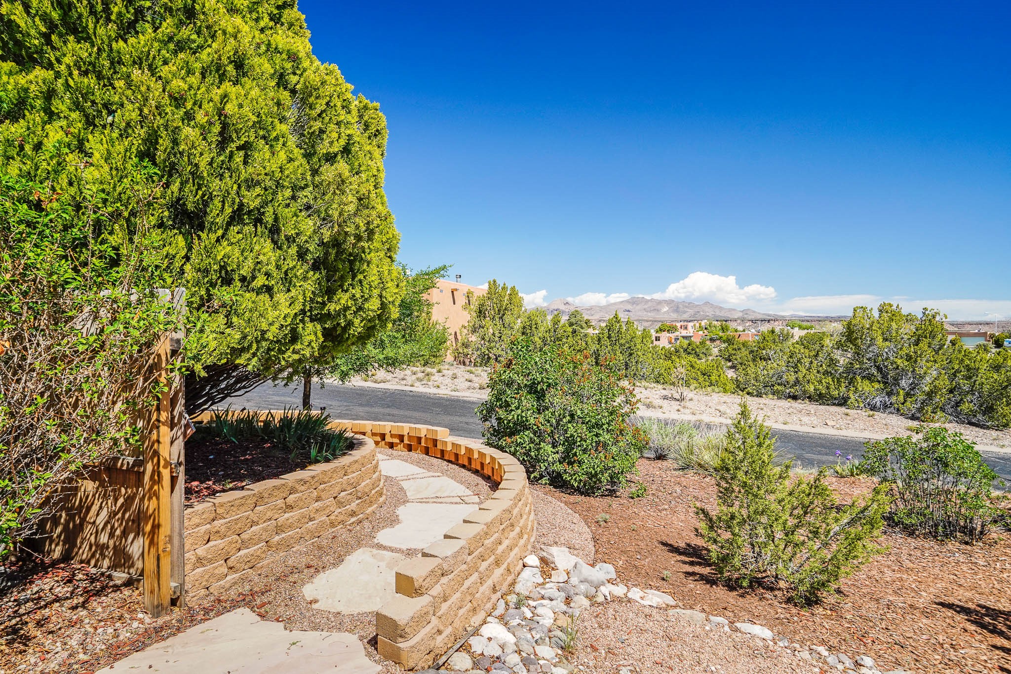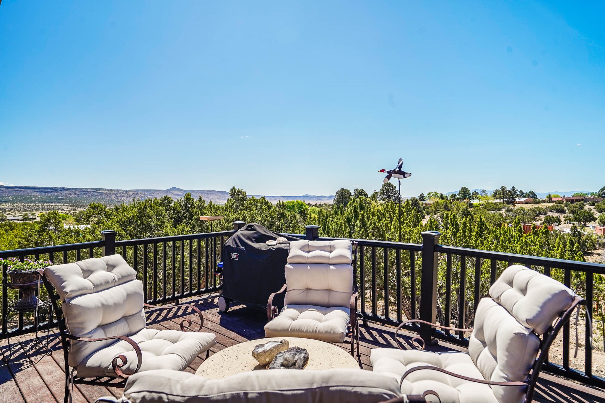 Discover a truly exceptional Cochiti Lake home, fully remodeled in 2023 and thoughtfully enhanced since! Perched on a ridgeline in a peaceful cul-de-sac on a generous .93-acre fenced lot, this property offers unparalleled peace and quiet with breathtaking views toward La Bajada Mesa and Tetilla Peak, especially from the spacious Trex deck off the kitchen. Experience the magic of dark skies, the Milky Way, and vibrant constellations right from your own backyard.Every detail has been addressed: the exterior boasts new paint, a gravel parking pad, updated electrical panel, new driveway, garage door, and a welcoming front door with a screen door. Enjoy enhanced curb appeal with new front porch lights and meticulously refreshed front yard landscaping with flagstone. A 10x20 steel garage/storage building provides ample extra space. All windows and the sliding glass door are new, and a greenhouse adds a touch of charm.Inside, comfort is assured with a new York air-conditioning/heating unit. The interior shines with paneled pine doors and trim throughout, a relocated master entry, and clever shelving by the master bedroom. The acoustic ceilings were removed and the entire house has been freshly painted. Both the master and second bathrooms are updated and remodeled, featuring a new tile floor in the latter and added shelving in the master. The fireplace has been beautifully updated, and new ceiling fans are installed throughout. The complete kitchen remodel features top-end GE appliances, including a gas stove, double oven, French door refrigerator, and stunning quartz countertops. The dining room impresses with deer print wallpaper, while a small office space has been added for productivity. The laundry room is now more functional with an added sink, complemented by a stacked washer/dryer. This home is truly move-in ready and elegantly updated for modern living.