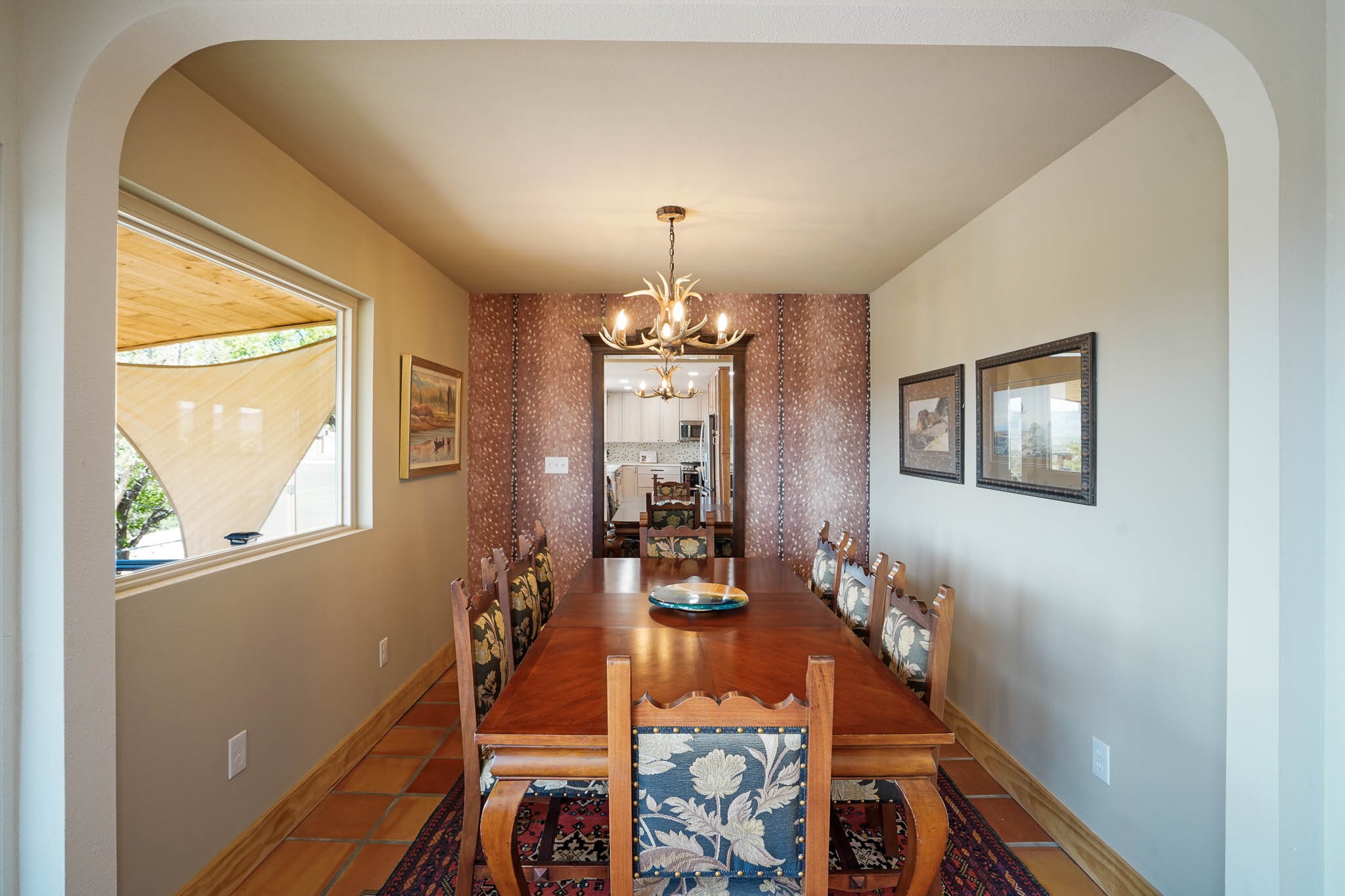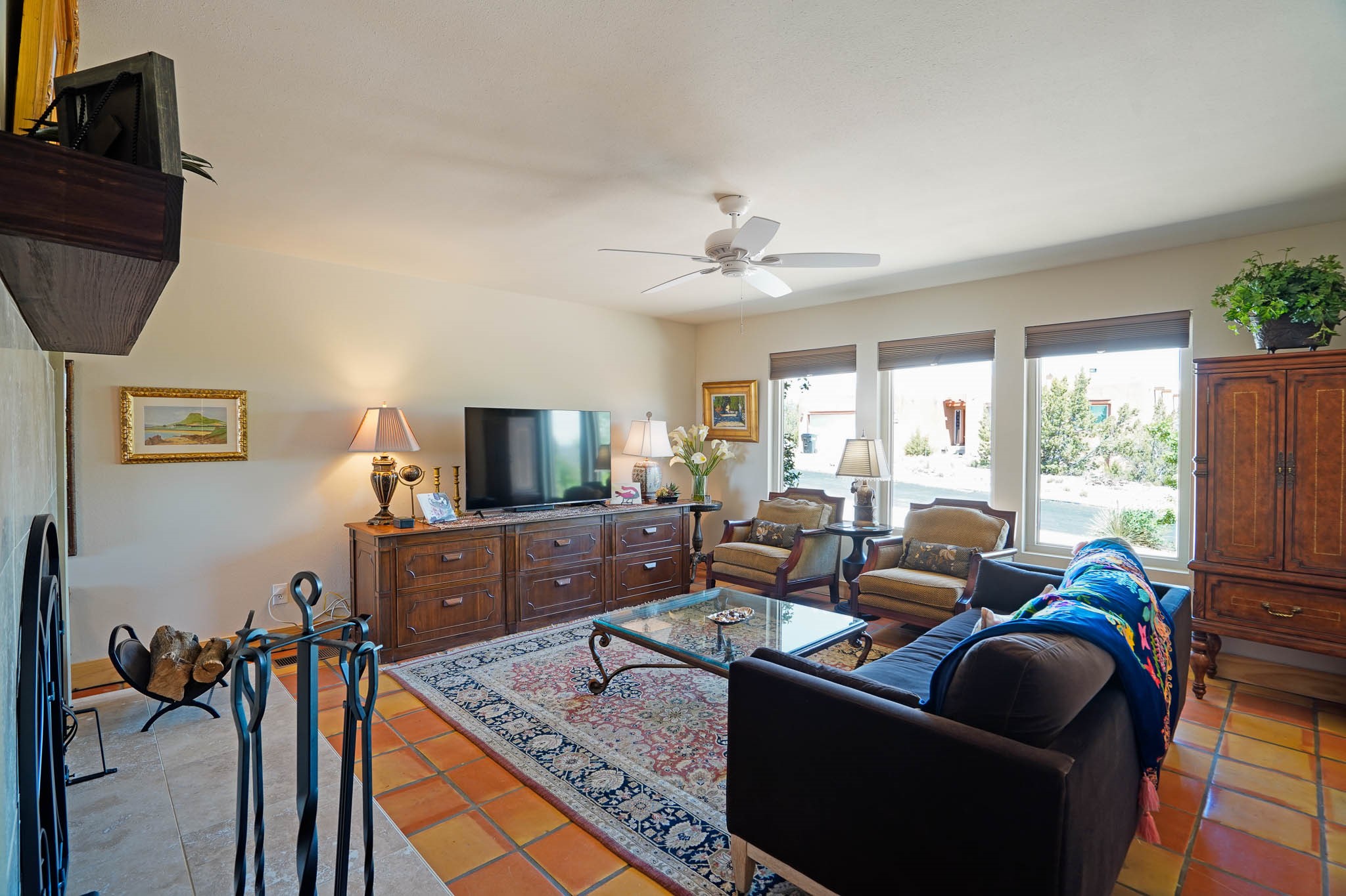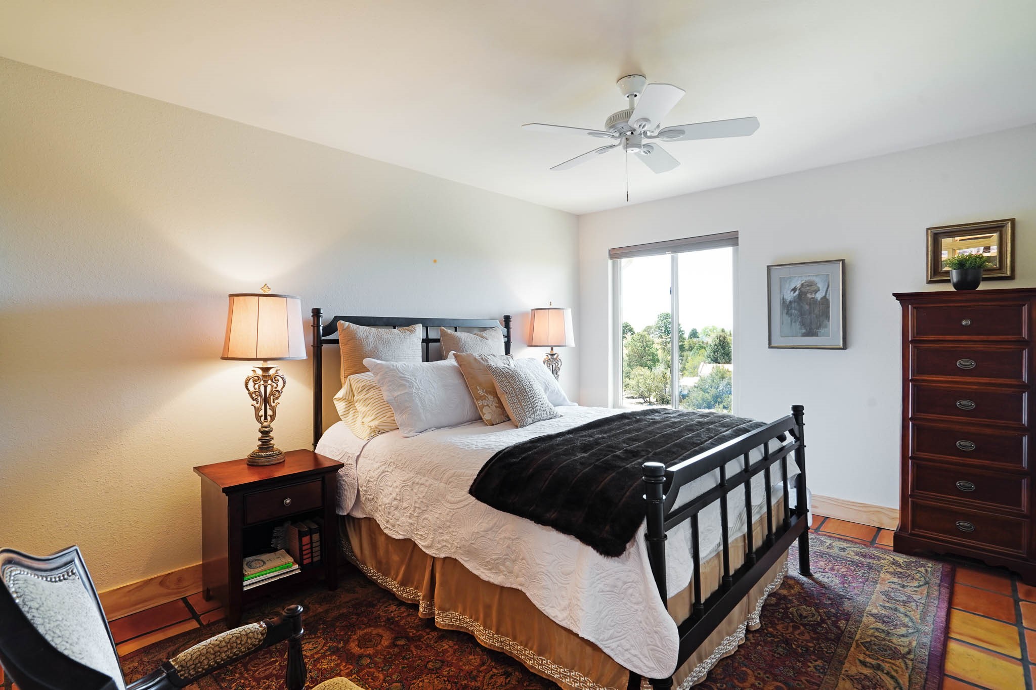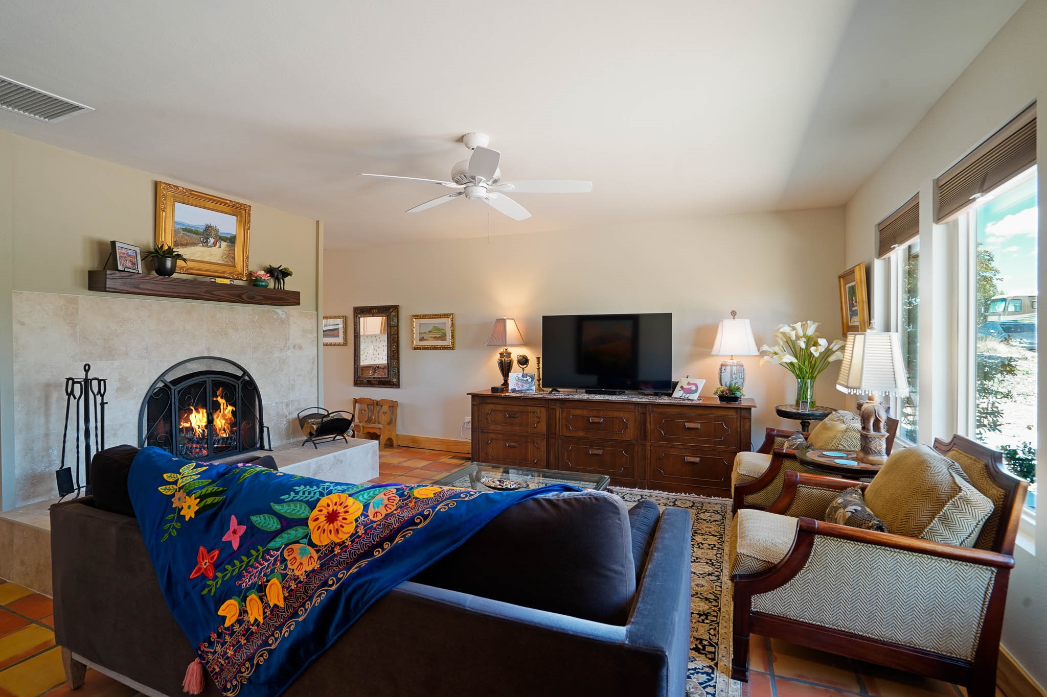 Discover a truly exceptional Cochiti Lake home, fully remodeled in 2023 and thoughtfully enhanced since! Perched on a ridgeline in a peaceful cul-de-sac on a generous .93-acre fenced lot, this property offers unparalleled peace and quiet with breathtaking views toward La Bajada Mesa and Tetilla Peak, especially from the spacious Trex deck off the kitchen. Experience the magic of dark skies, the Milky Way, and vibrant constellations right from your own backyard.Every detail has been addressed: the exterior boasts new paint, a gravel parking pad, updated electrical panel, new driveway, garage door, and a welcoming front door with a screen door. Enjoy enhanced curb appeal with new front porch lights and meticulously refreshed front yard landscaping with flagstone. A 10x20 steel garage/storage building provides ample extra space. All windows and the sliding glass door are new, and a greenhouse adds a touch of charm.Inside, comfort is assured with a new York air-conditioning/heating unit. The interior shines with paneled pine doors and trim throughout, a relocated master entry, and clever shelving by the master bedroom. The acoustic ceilings were removed and the entire house has been freshly painted. Both the master and second bathrooms are updated and remodeled, featuring a new tile floor in the latter and added shelving in the master. The fireplace has been beautifully updated, and new ceiling fans are installed throughout. The complete kitchen remodel features top-end GE appliances, including a gas stove, double oven, French door refrigerator, and stunning quartz countertops. The dining room impresses with deer print wallpaper, while a small office space has been added for productivity. The laundry room is now more functional with an added sink, complemented by a stacked washer/dryer. This home is truly move-in ready and elegantly updated for modern living.