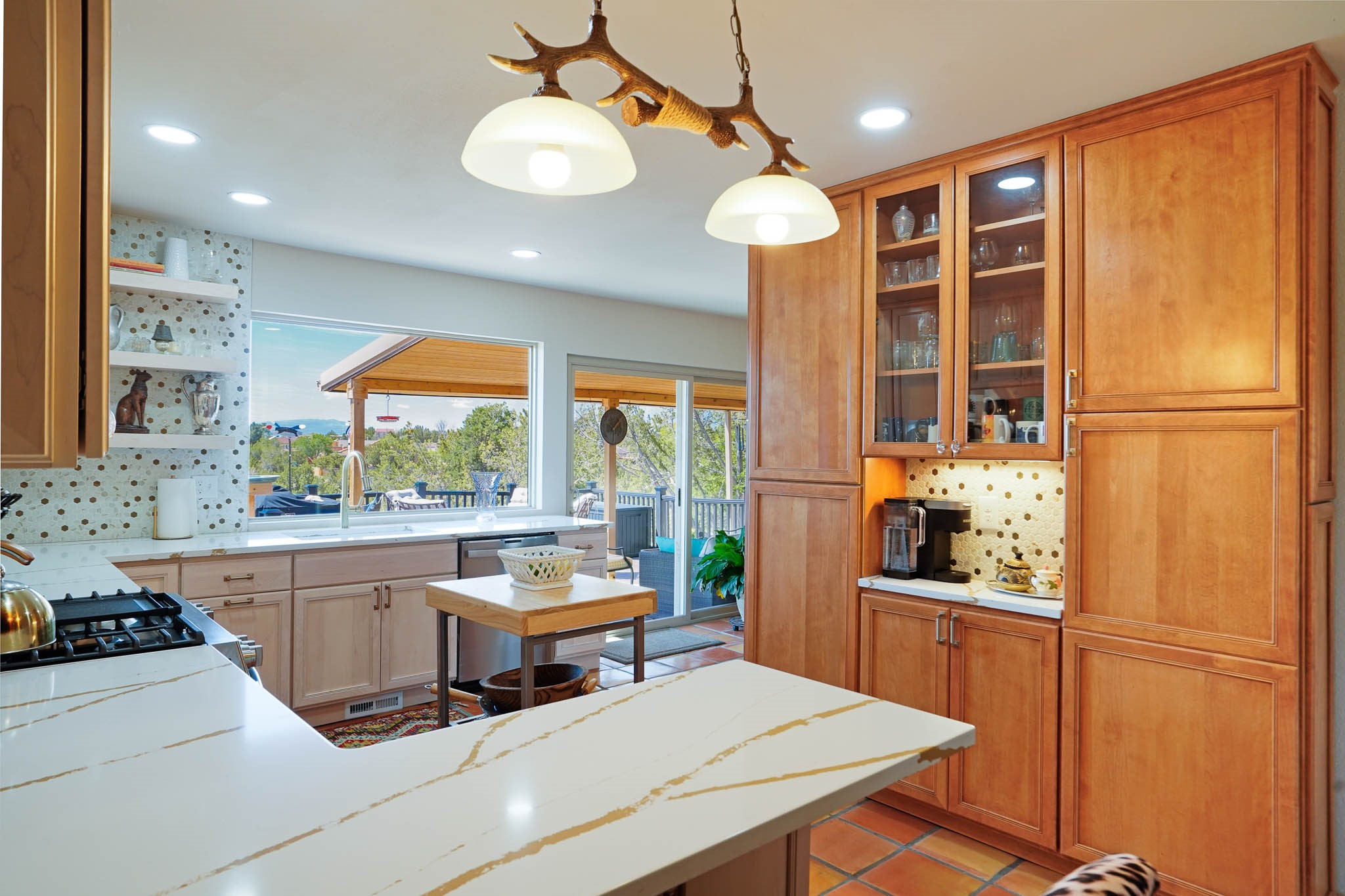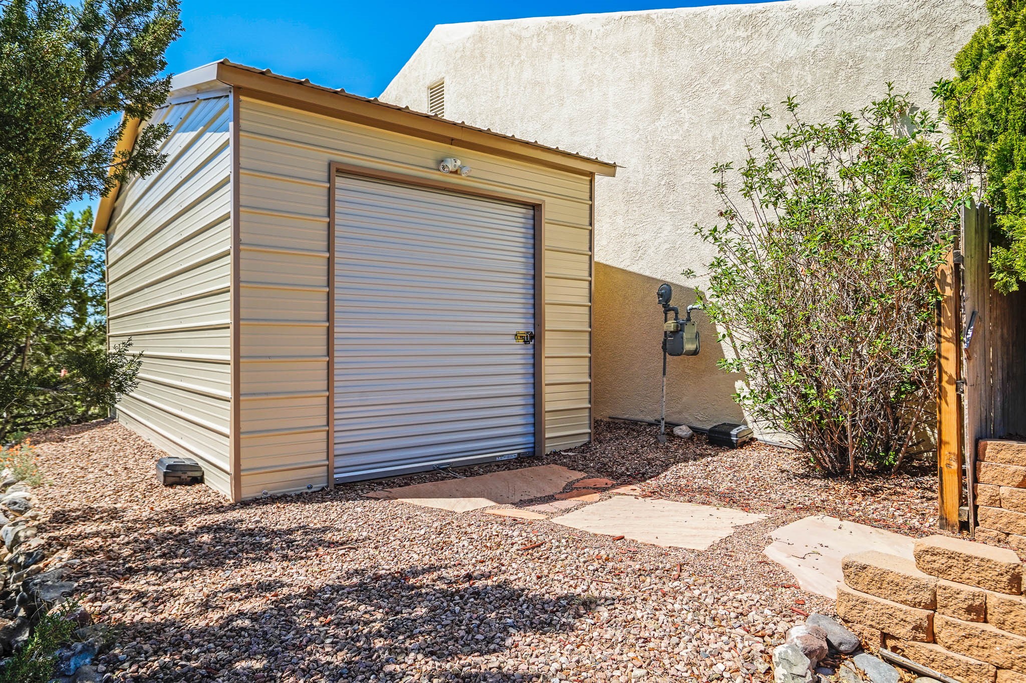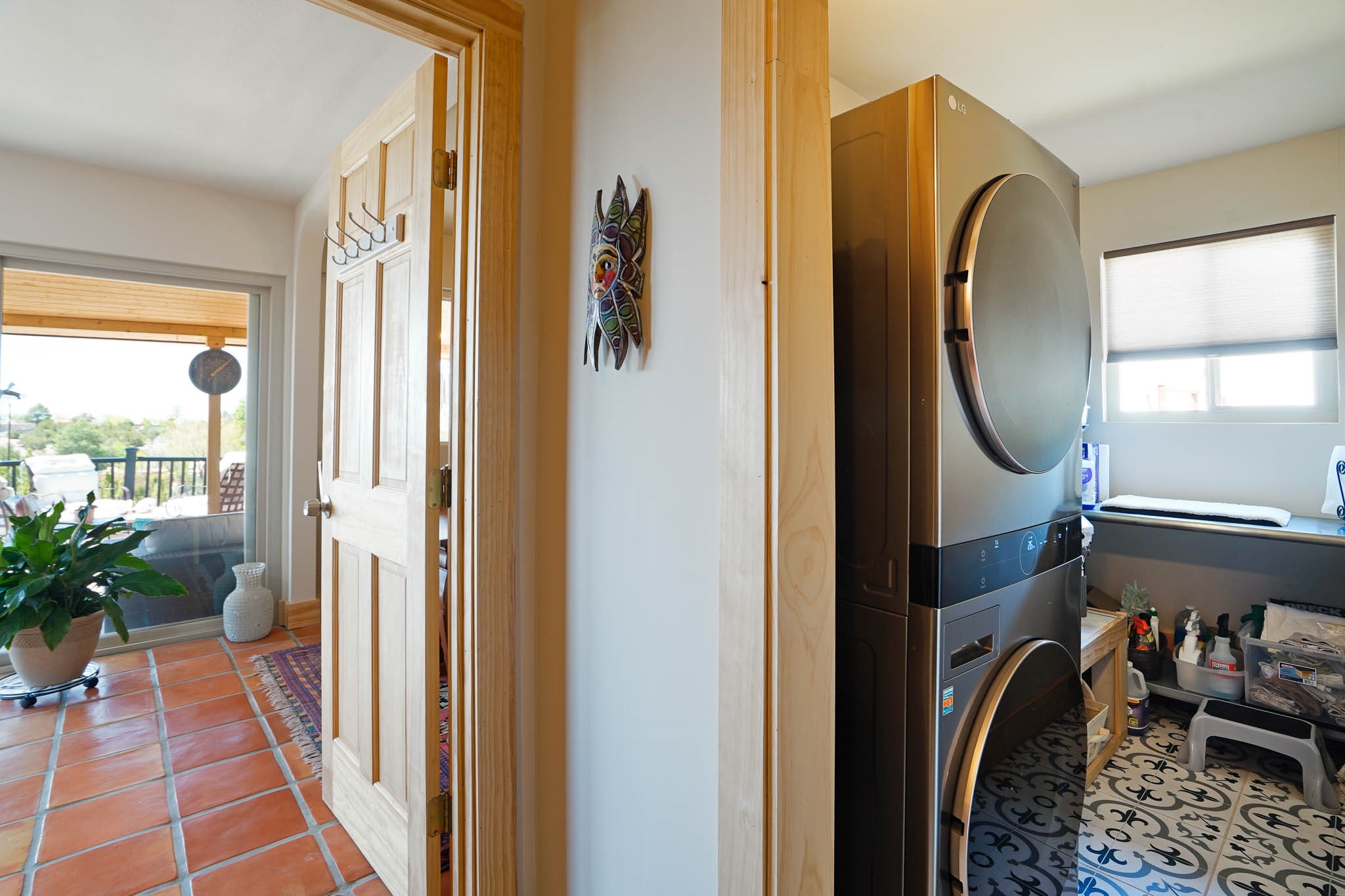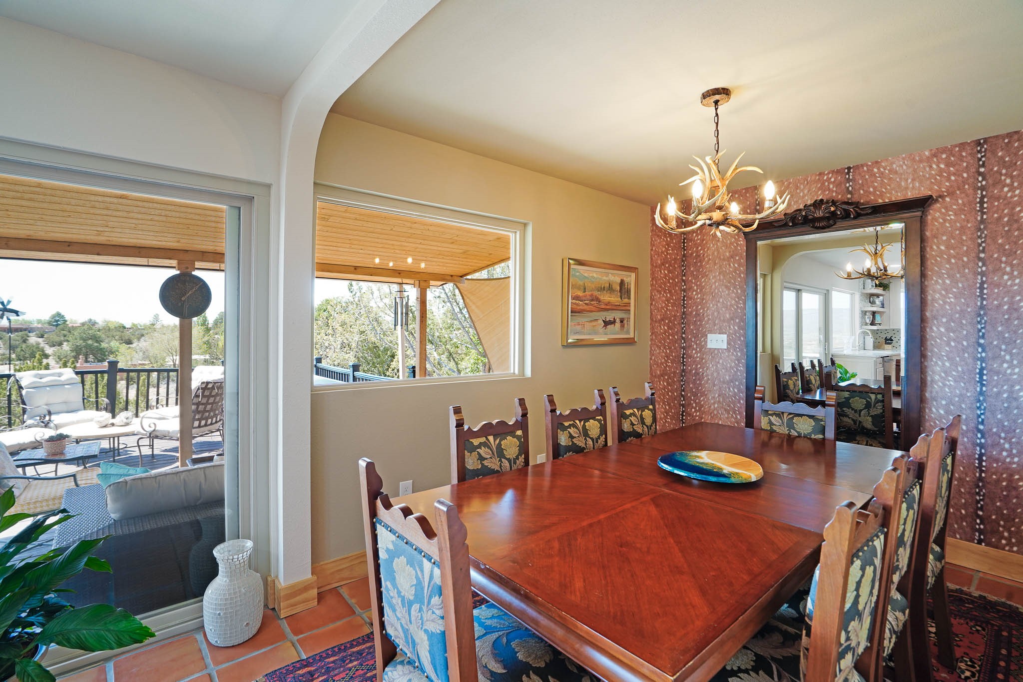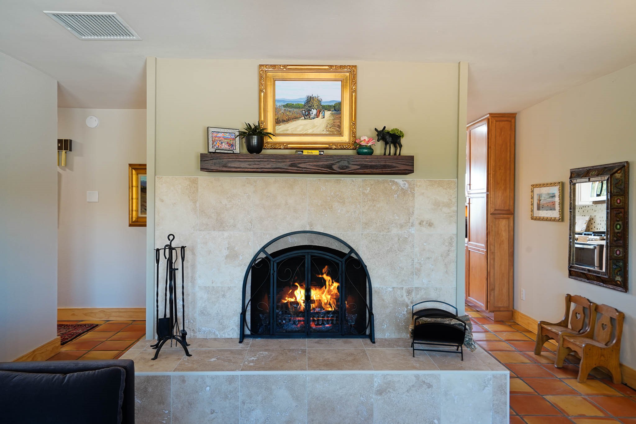 Discover a truly exceptional Cochiti Lake home, fully remodeled in 2023 and thoughtfully enhanced since! Perched on a ridgeline in a peaceful cul-de-sac on a generous .93-acre fenced lot, this property offers unparalleled peace and quiet with breathtaking views toward La Bajada Mesa and Tetilla Peak, especially from the spacious Trex deck off the kitchen. Experience the magic of dark skies, the Milky Way, and vibrant constellations right from your own backyard.Every detail has been addressed: the exterior boasts new paint, a gravel parking pad, updated electrical panel, new driveway, garage door, and a welcoming front door with a screen door. Enjoy enhanced curb appeal with new front porch lights and meticulously refreshed front yard landscaping with flagstone. A 10x20 steel garage/storage building provides ample extra space. All windows and the sliding glass door are new, and a greenhouse adds a touch of charm.Inside, comfort is assured with a new York air-conditioning/heating unit. The interior shines with paneled pine doors and trim throughout, a relocated master entry, and clever shelving by the master bedroom. The acoustic ceilings were removed and the entire house has been freshly painted. Both the master and second bathrooms are updated and remodeled, featuring a new tile floor in the latter and added shelving in the master. The fireplace has been beautifully updated, and new ceiling fans are installed throughout. The complete kitchen remodel features top-end GE appliances, including a gas stove, double oven, French door refrigerator, and stunning quartz countertops. The dining room impresses with deer print wallpaper, while a small office space has been added for productivity. The laundry room is now more functional with an added sink, complemented by a stacked washer/dryer. This home is truly move-in ready and elegantly updated for modern living.