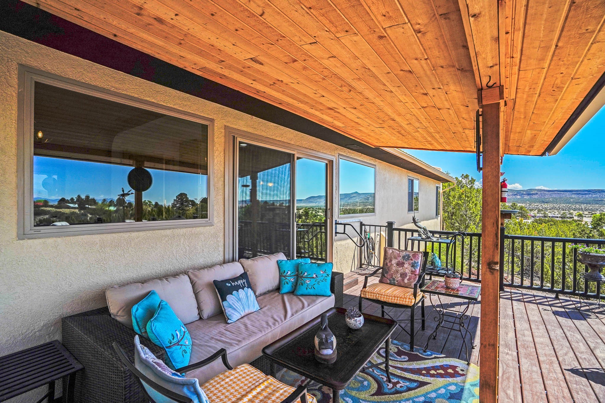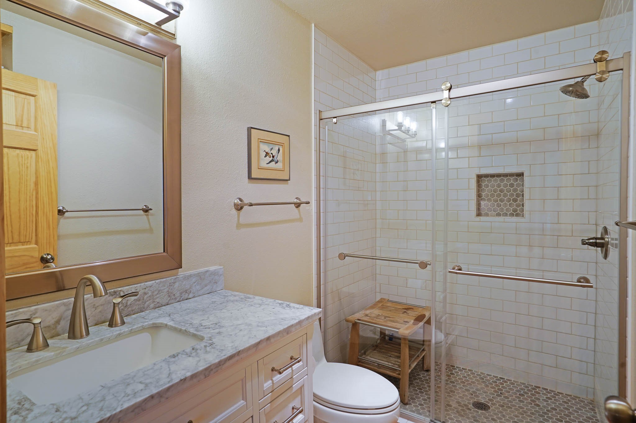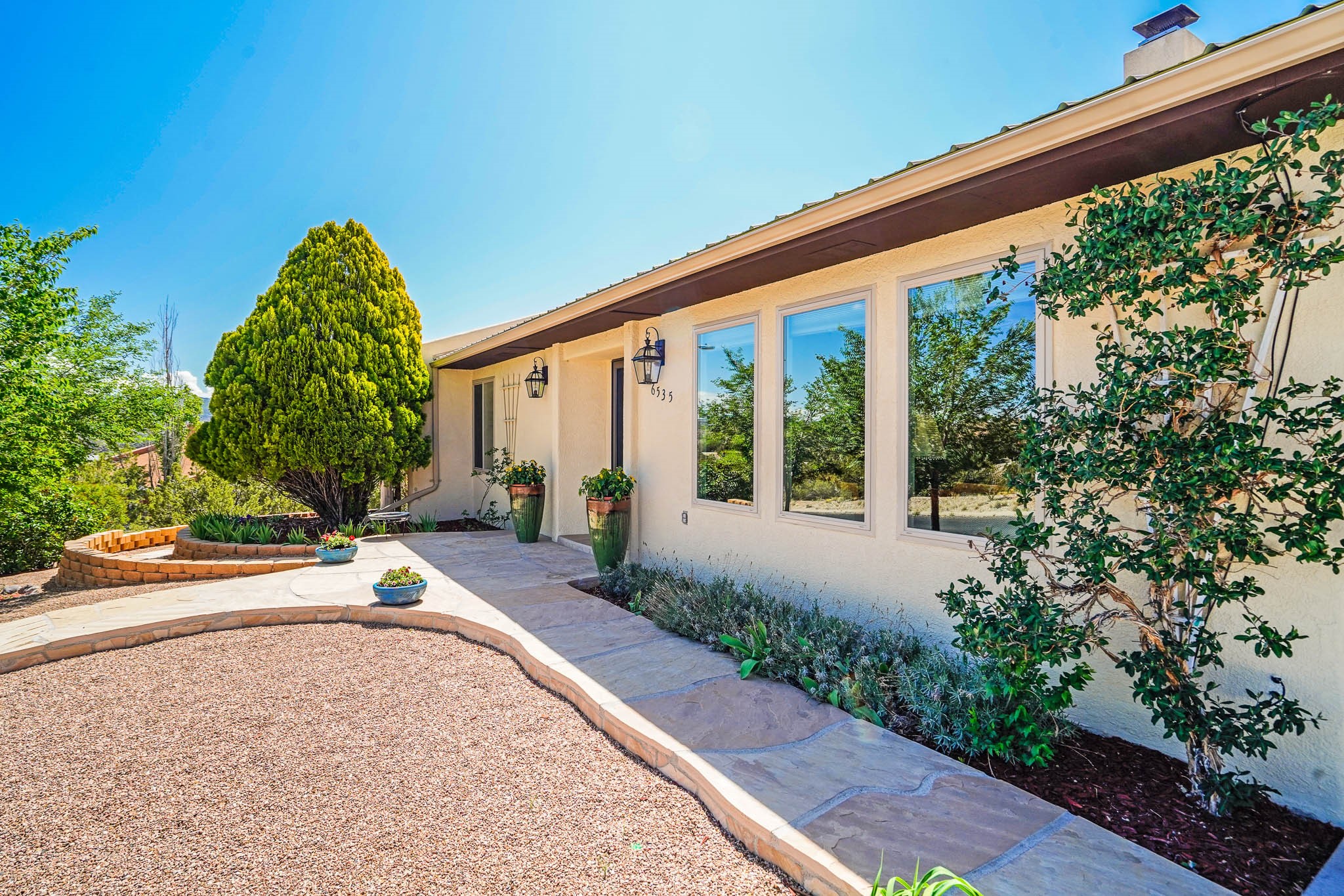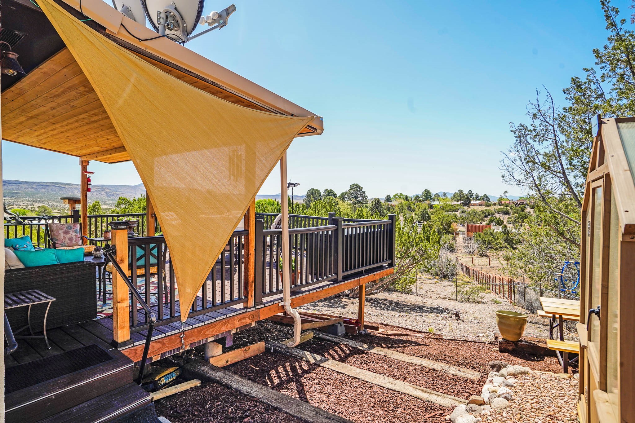 Discover a truly exceptional Cochiti Lake home, fully remodeled in 2023 and thoughtfully enhanced since! Perched on a ridgeline in a peaceful cul-de-sac on a generous .93-acre fenced lot, this property offers unparalleled peace and quiet with breathtaking views toward La Bajada Mesa and Tetilla Peak, especially from the spacious Trex deck off the kitchen. Experience the magic of dark skies, the Milky Way, and vibrant constellations right from your own backyard.Every detail has been addressed: the exterior boasts new paint, a gravel parking pad, updated electrical panel, new driveway, garage door, and a welcoming front door with a screen door. Enjoy enhanced curb appeal with new front porch lights and meticulously refreshed front yard landscaping with flagstone. A 10x20 steel garage/storage building provides ample extra space. All windows and the sliding glass door are new, and a greenhouse adds a touch of charm.Inside, comfort is assured with a new York air-conditioning/heating unit. The interior shines with paneled pine doors and trim throughout, a relocated master entry, and clever shelving by the master bedroom. The acoustic ceilings were removed and the entire house has been freshly painted. Both the master and second bathrooms are updated and remodeled, featuring a new tile floor in the latter and added shelving in the master. The fireplace has been beautifully updated, and new ceiling fans are installed throughout. The complete kitchen remodel features top-end GE appliances, including a gas stove, double oven, French door refrigerator, and stunning quartz countertops. The dining room impresses with deer print wallpaper, while a small office space has been added for productivity. The laundry room is now more functional with an added sink, complemented by a stacked washer/dryer. This home is truly move-in ready and elegantly updated for modern living.