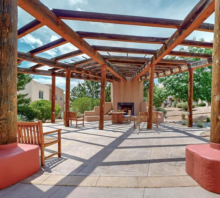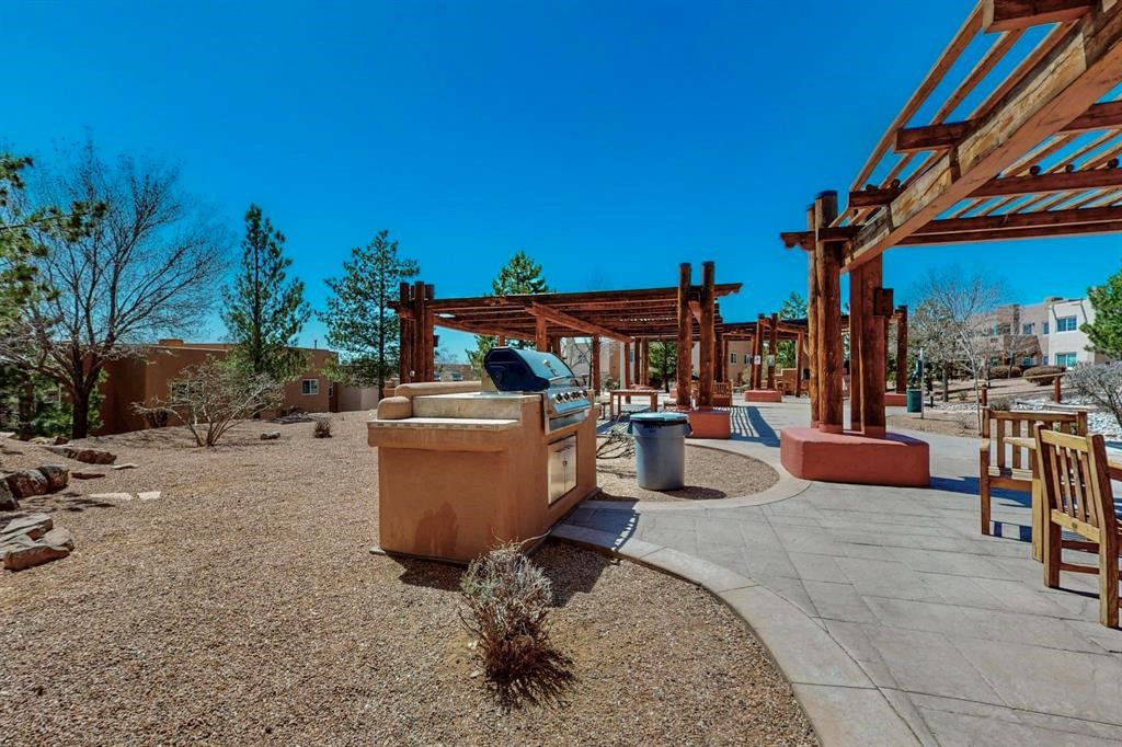Welcome to the Dos Santos community a lovely town home end unit offering enhanced privacy and beautiful views of the mountains to the east and west. Located next to a greenbelt, this two-bedroom, two-bath home features approximately 950 square feet of well-designed living space, including an open-concept living and dining area with Saltillo tile floors, a wood-burning fireplace, and a kitchen ideal for entertaining. The upstairs includes a primary suite with an en suite bath, a walk-in closet, and attractive window treatments. Outside, the home offers a covered front patio and a fenced yard, with patio furniture included. Residents of Dos Santos enjoy access to a range of amenities, including a heated saltwater pool, hot tub, clubhouse, fitness center with exercise equipment, outdoor entertainment gazebos with gas grills, walking paths, and an expansive dog park. Located just minutes from downtown Santa Fe, close to shopping, St Vincent Hospital and direct access to Santa Fe's 'Rail Trail' for commuting, hiking and biking. The property also offers an easy commute throughout Santa Fe and to Los Alamos. Association fees cover community area maintenance, exterior building and roof maintenance, parking upkeep, recreational facilities, security, as well as water, sewer, and refuse services. E-Z to show.