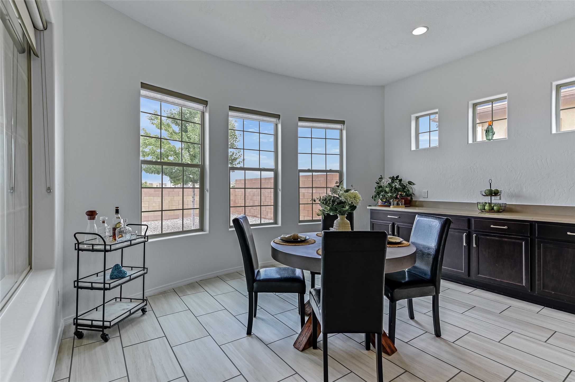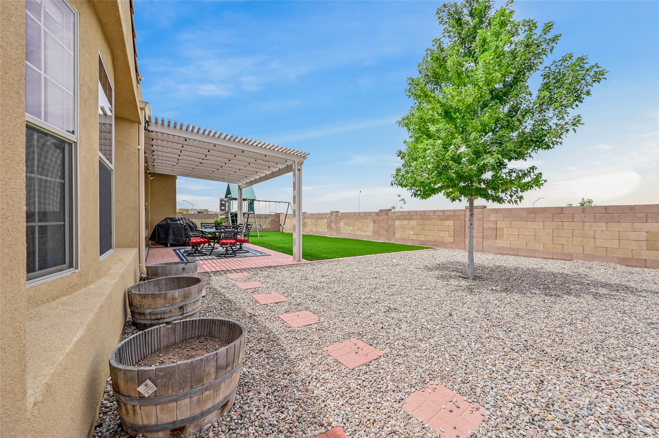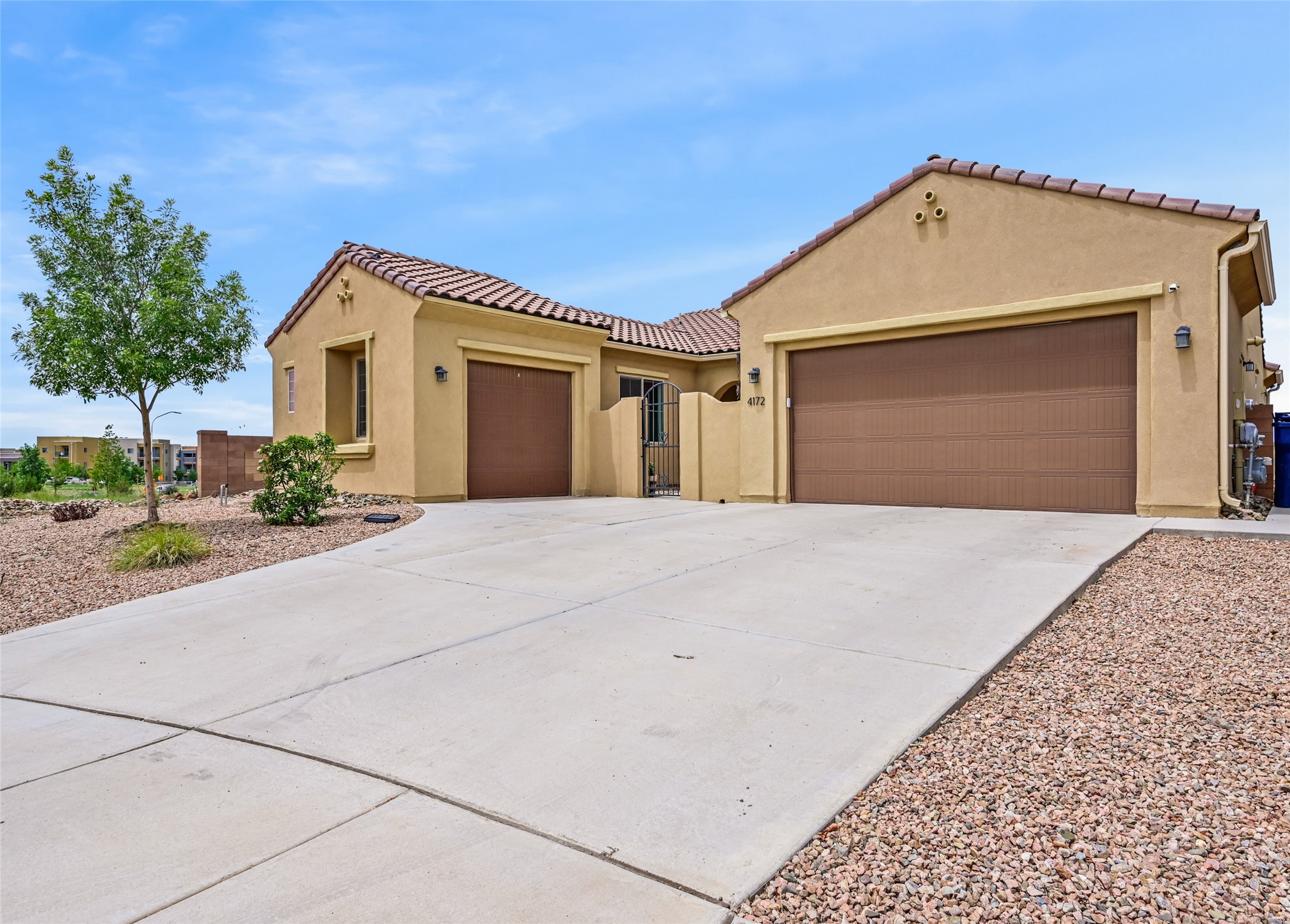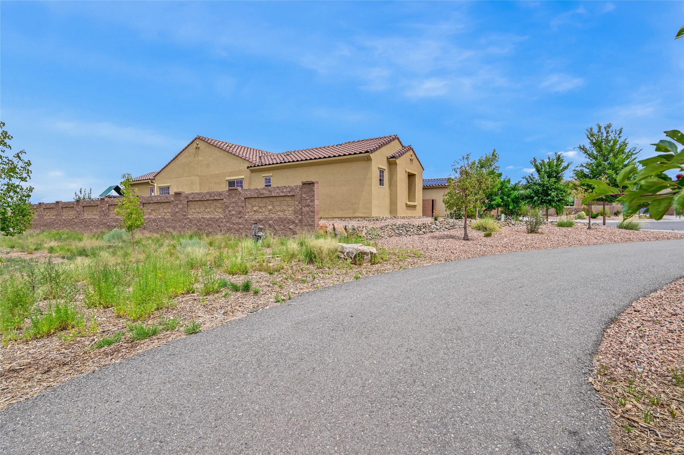 Located on a quiet cul-de-sac in Las Soleras, this 4-bedroom (or 3 bedroom + office), 2.5-bath home offers the perfect balance of comfort and convenience. Just over five years old, it sits next to a trail and the neighborhood park is across the street from the backyard wall. With only one neighbor, there's added privacy. You're minutes from I-25, shopping, restaurants, and Presbyterian Hospital. Inside, the home features high ceilings throughout, with an open-concept living room that includes a wood accent ceiling and large windows that fill the space with natural light. The kitchen is designed for gatherings, with a quartz countertop island, herringbone-patterned backsplash, and plenty of room to cook and connect. French doors lead to a private office, perfect for working from home. The spacious primary suite includes a walk-in closet and a spa-like bath with separate tub and shower. A 3-car garage includes an EV charger, storage room and sink. Out back, enjoy sunset views from a landscaped yard featuring turf, gravel, a pergola, and an outdoor fireplace--an ideal space for relaxing or entertaining. The home also includes a private courtyard entry, and fresh carpet and paint as of July 2025. This home checks all the boxes: great layout, natural light, indoor/outdoor flow, and a prime location near everyday essentials. Seller including 1 year home warranty.