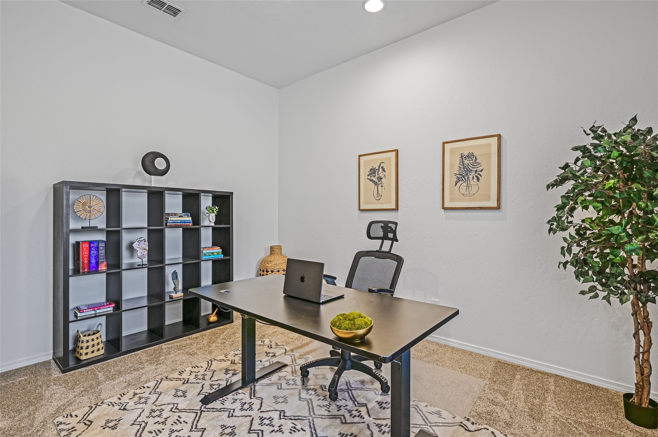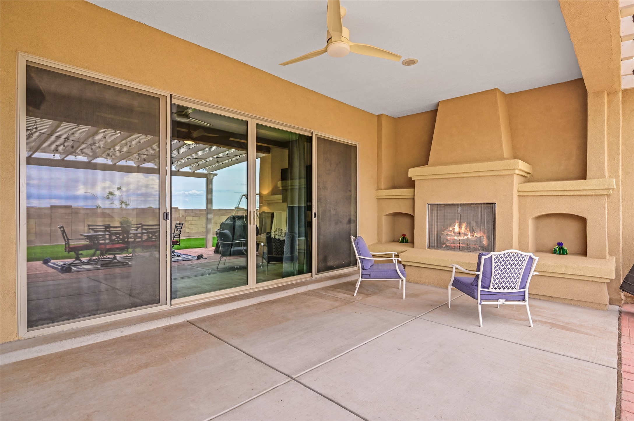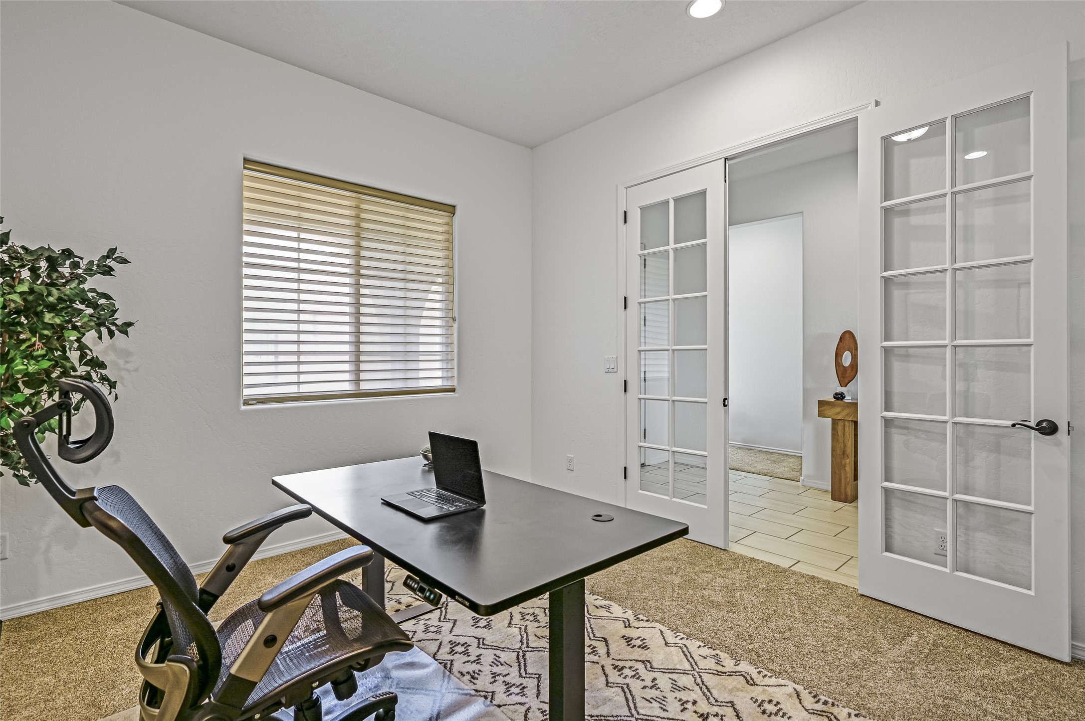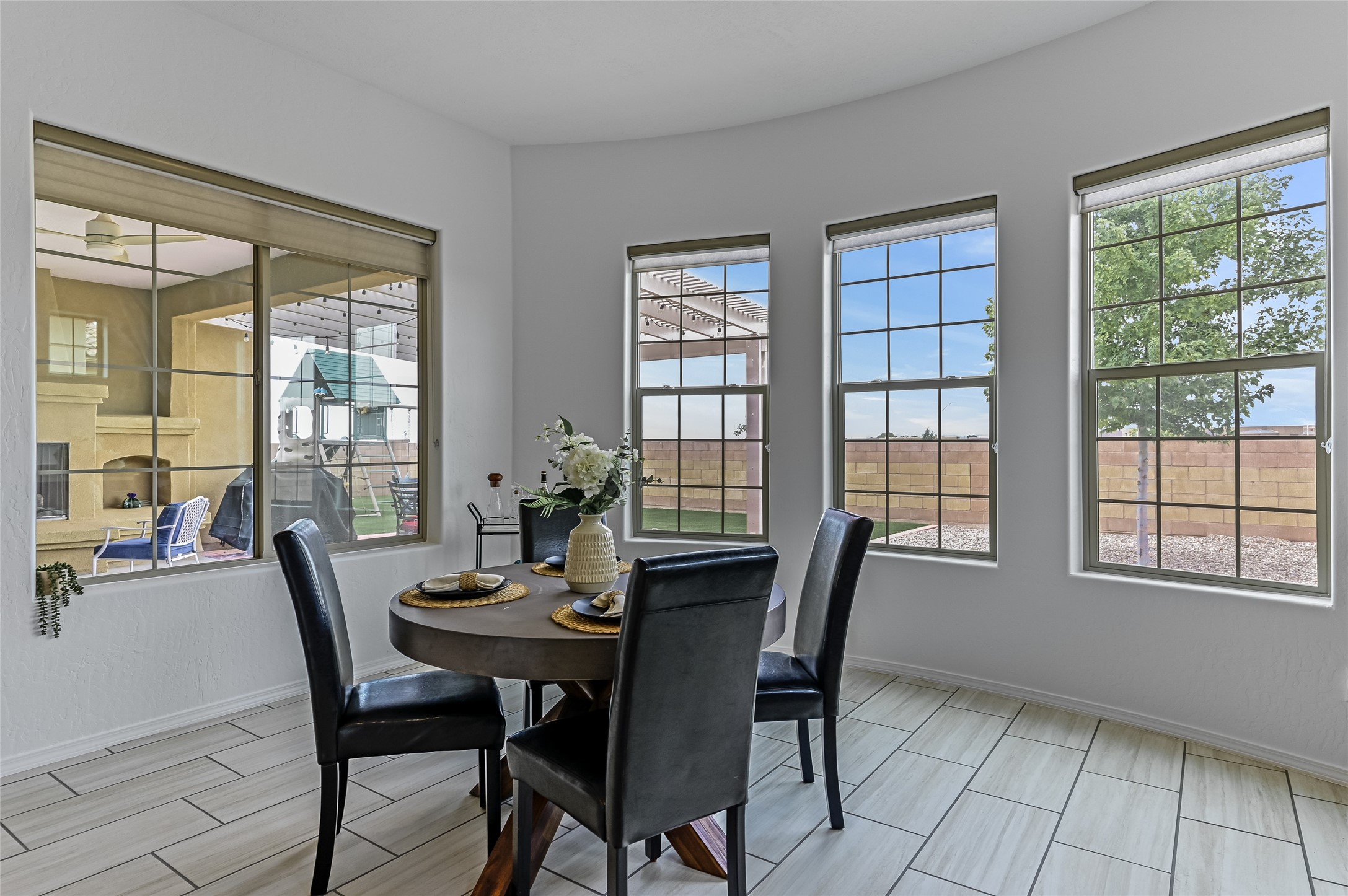 Located on a quiet cul-de-sac in Las Soleras, this 4-bedroom (or 3 bedroom + office), 2.5-bath home offers the perfect balance of comfort and convenience. Just over five years old, it sits next to a trail and the neighborhood park is across the street from the backyard wall. With only one neighbor, there's added privacy. You're minutes from I-25, shopping, restaurants, and Presbyterian Hospital. Inside, the home features high ceilings throughout, with an open-concept living room that includes a wood accent ceiling and large windows that fill the space with natural light. The kitchen is designed for gatherings, with a quartz countertop island, herringbone-patterned backsplash, and plenty of room to cook and connect. French doors lead to a private office, perfect for working from home. The spacious primary suite includes a walk-in closet and a spa-like bath with separate tub and shower. A 3-car garage includes an EV charger, storage room and sink. Out back, enjoy sunset views from a landscaped yard featuring turf, gravel, a pergola, and an outdoor fireplace--an ideal space for relaxing or entertaining. The home also includes a private courtyard entry, and fresh carpet and paint as of July 2025. This home checks all the boxes: great layout, natural light, indoor/outdoor flow, and a prime location near everyday essentials. Seller including 1 year home warranty.