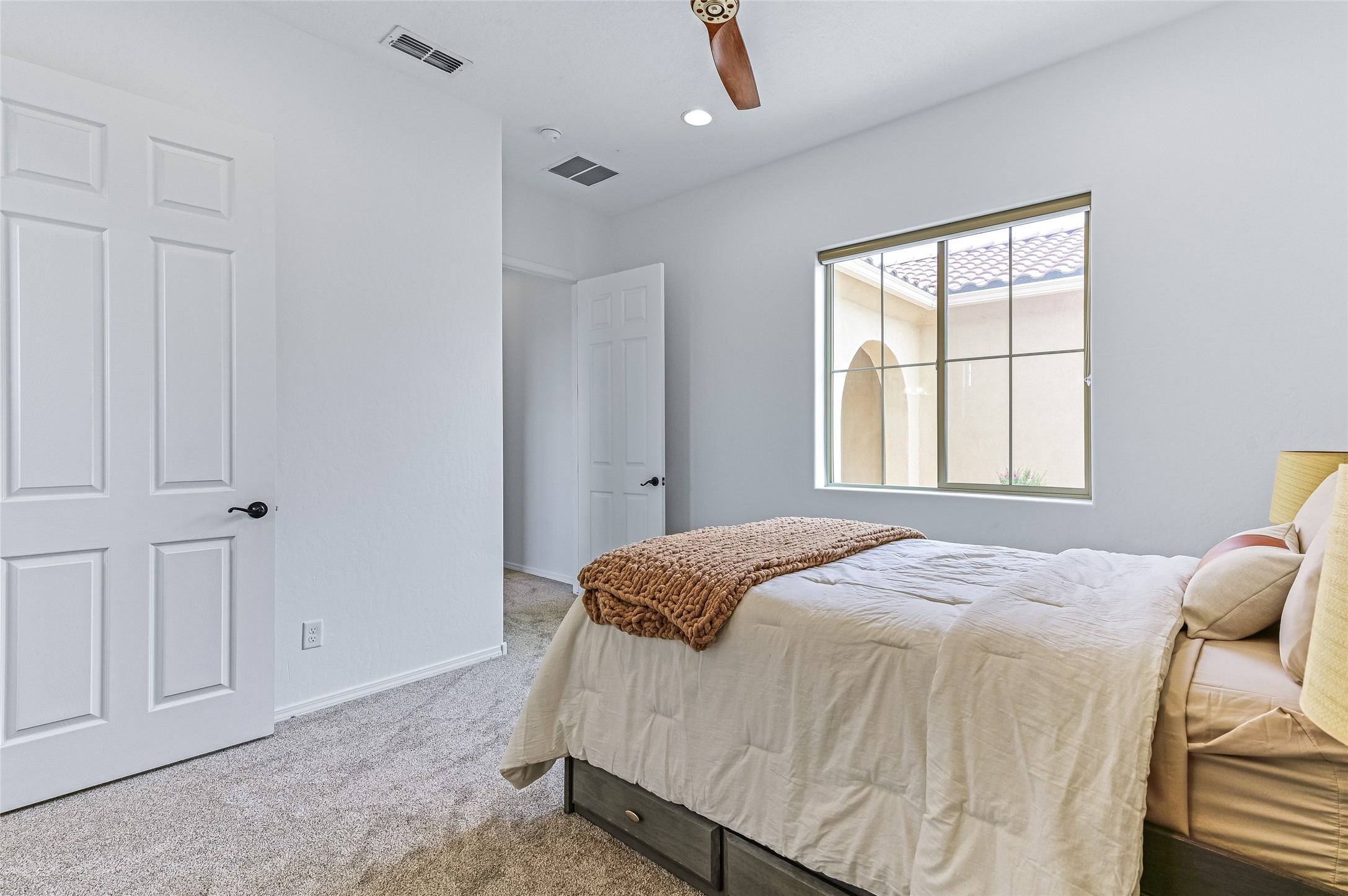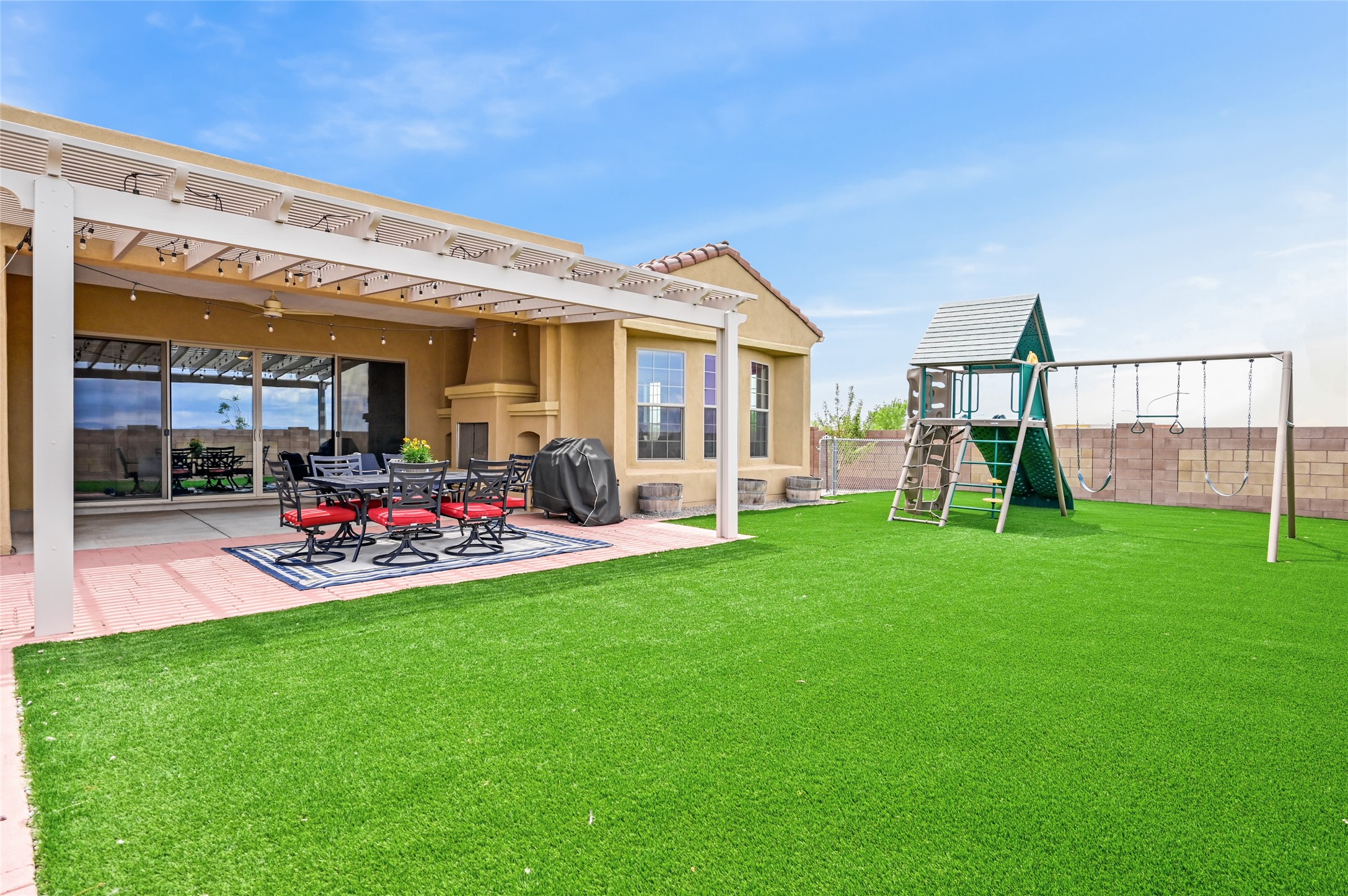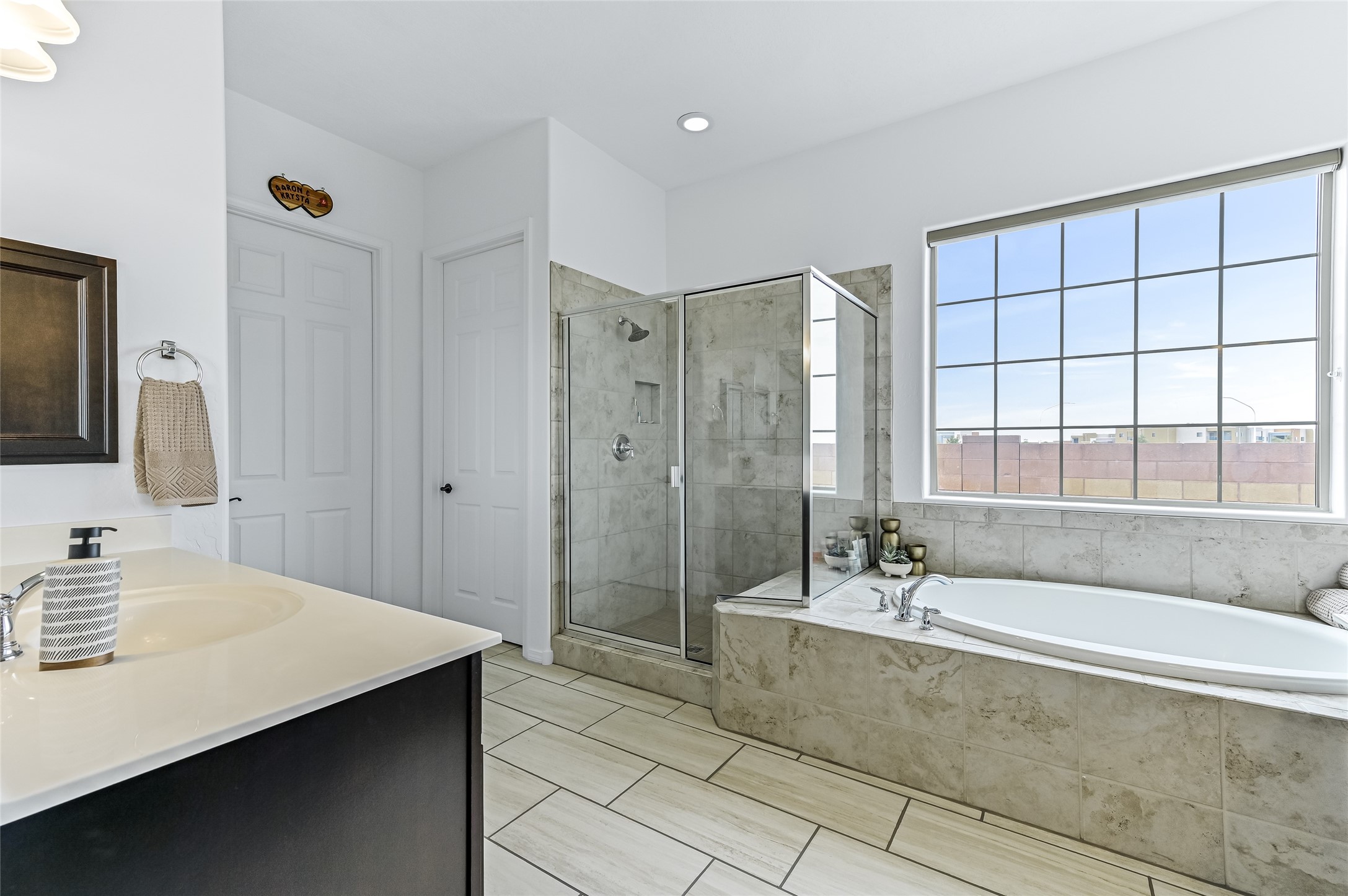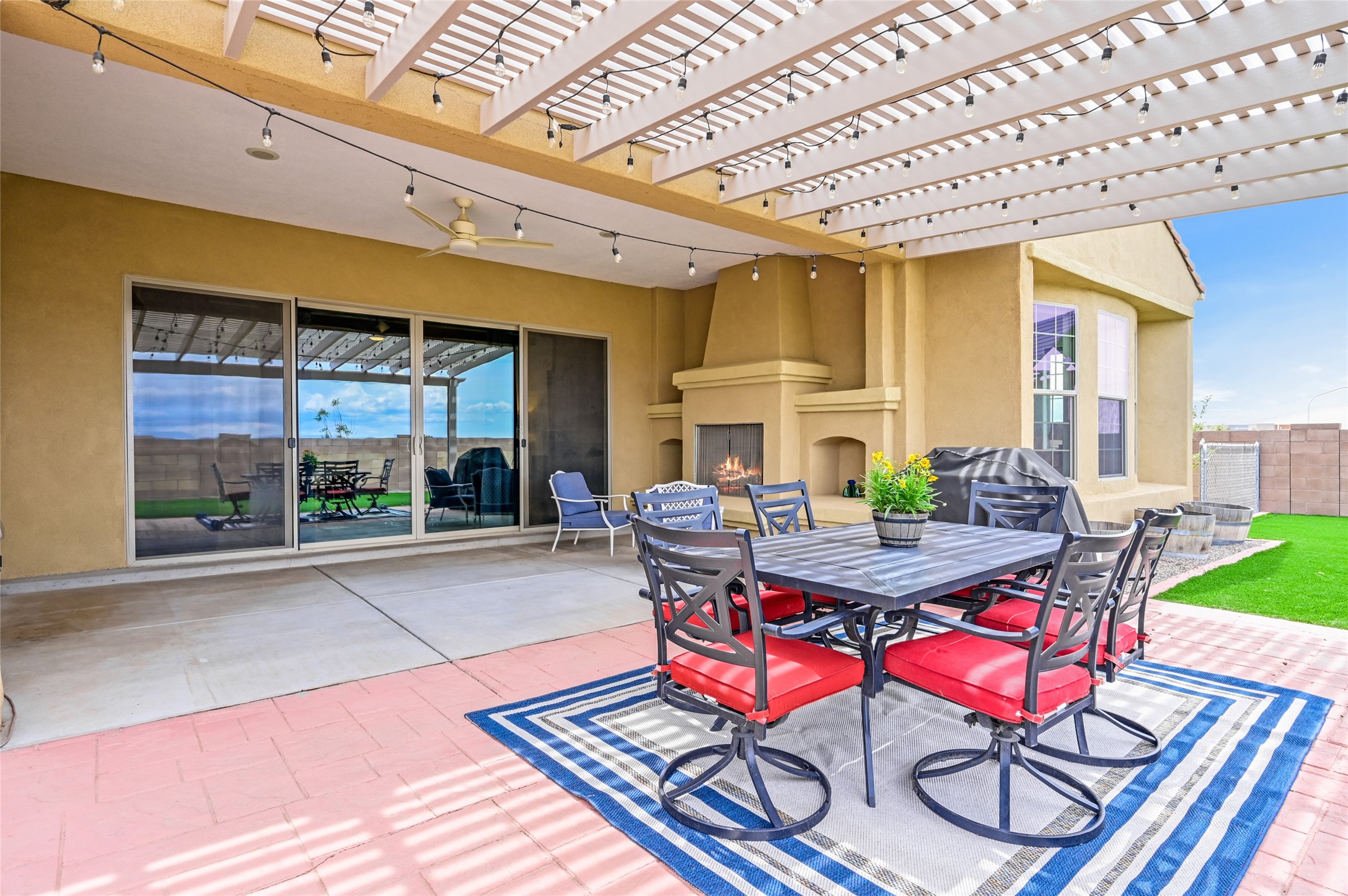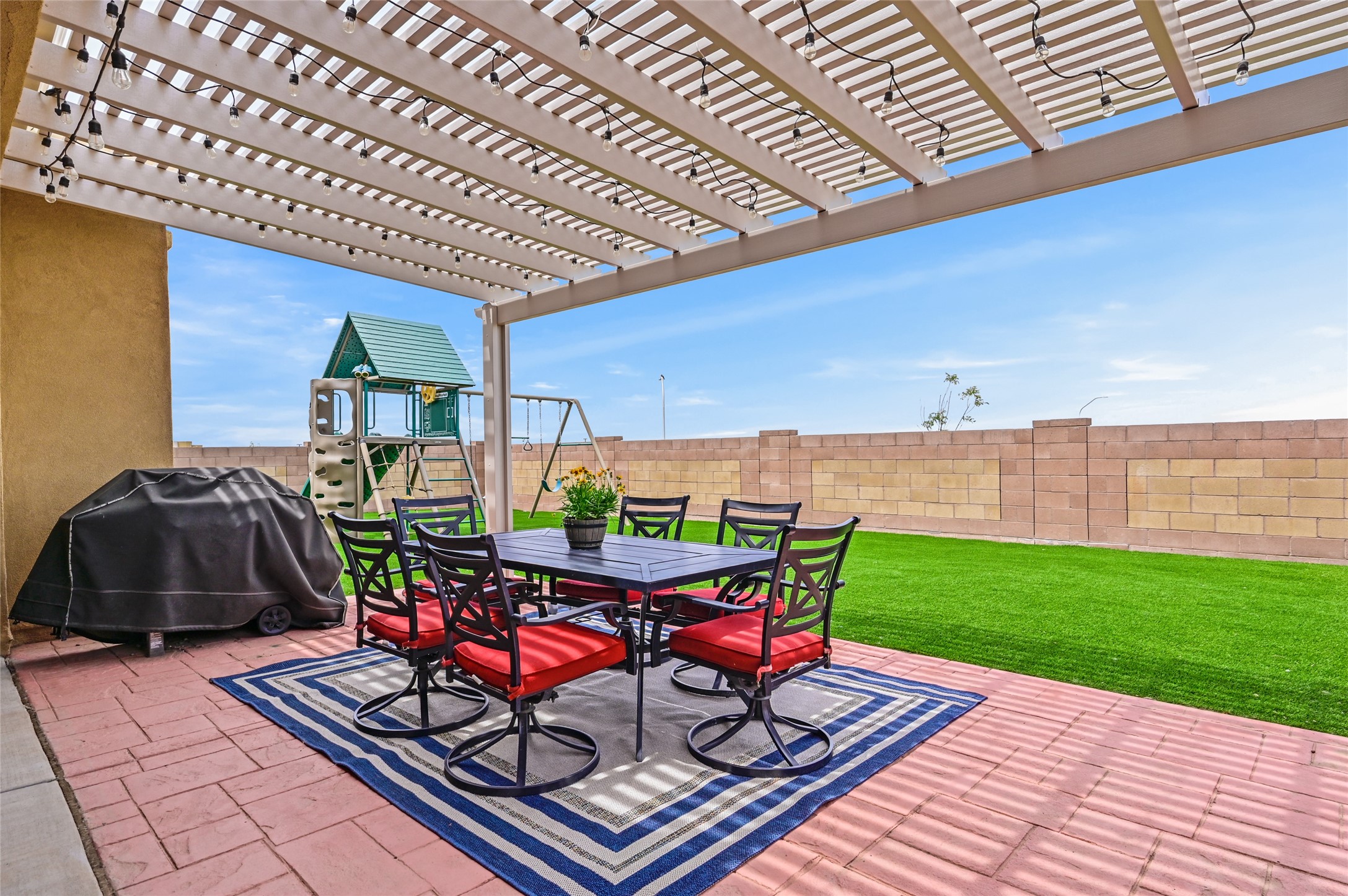 Located on a quiet cul-de-sac in Las Soleras, this 4-bedroom (or 3 bedroom + office), 2.5-bath home offers the perfect balance of comfort and convenience. Just over five years old, it sits next to a trail and the neighborhood park is across the street from the backyard wall. With only one neighbor, there's added privacy. You're minutes from I-25, shopping, restaurants, and Presbyterian Hospital. Inside, the home features high ceilings throughout, with an open-concept living room that includes a wood accent ceiling and large windows that fill the space with natural light. The kitchen is designed for gatherings, with a quartz countertop island, herringbone-patterned backsplash, and plenty of room to cook and connect. French doors lead to a private office, perfect for working from home. The spacious primary suite includes a walk-in closet and a spa-like bath with separate tub and shower. A 3-car garage includes an EV charger, storage room and sink. Out back, enjoy sunset views from a landscaped yard featuring turf, gravel, a pergola, and an outdoor fireplace--an ideal space for relaxing or entertaining. The home also includes a private courtyard entry, and fresh carpet and paint as of July 2025. This home checks all the boxes: great layout, natural light, indoor/outdoor flow, and a prime location near everyday essentials. Seller including 1 year home warranty.