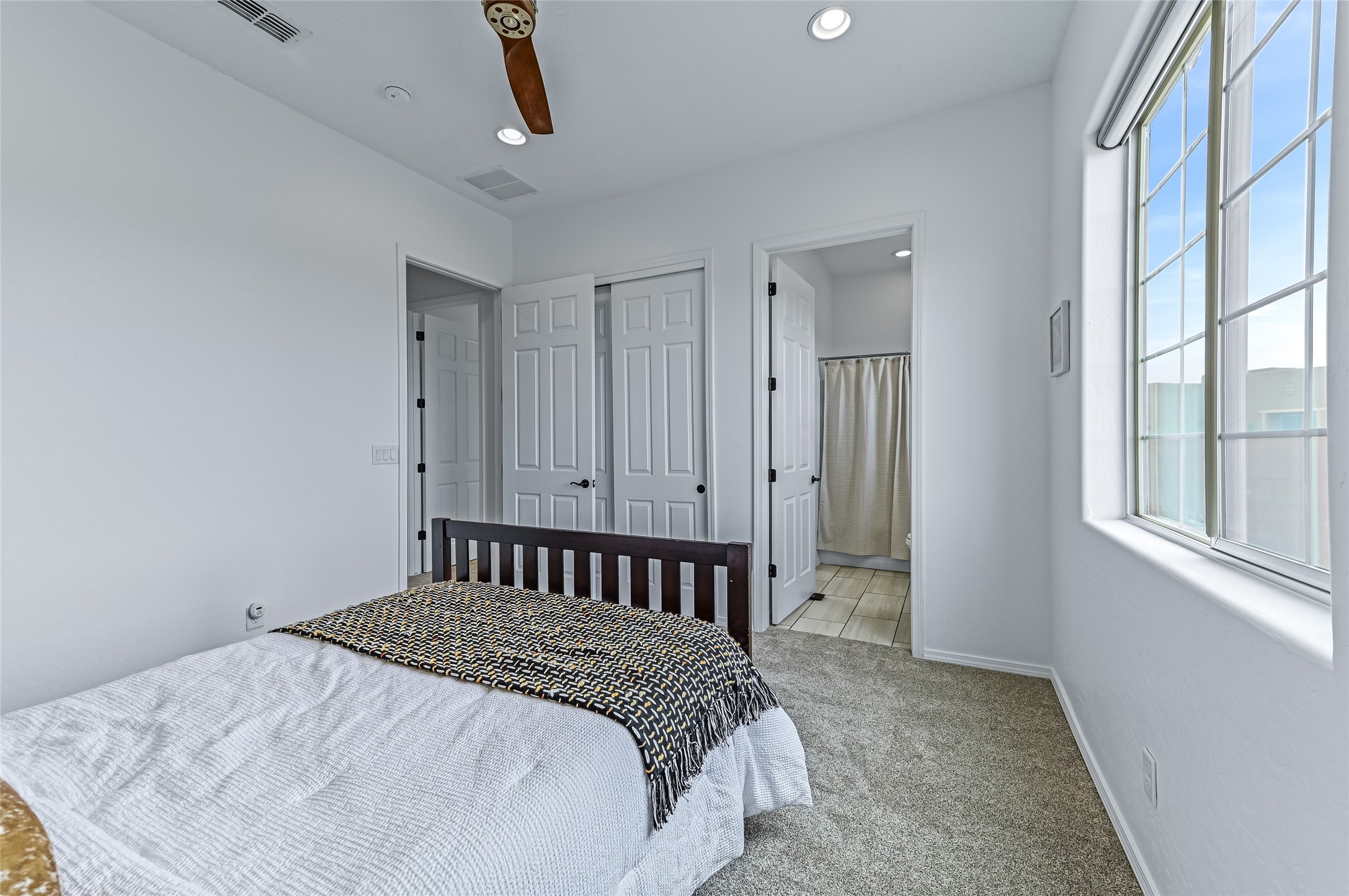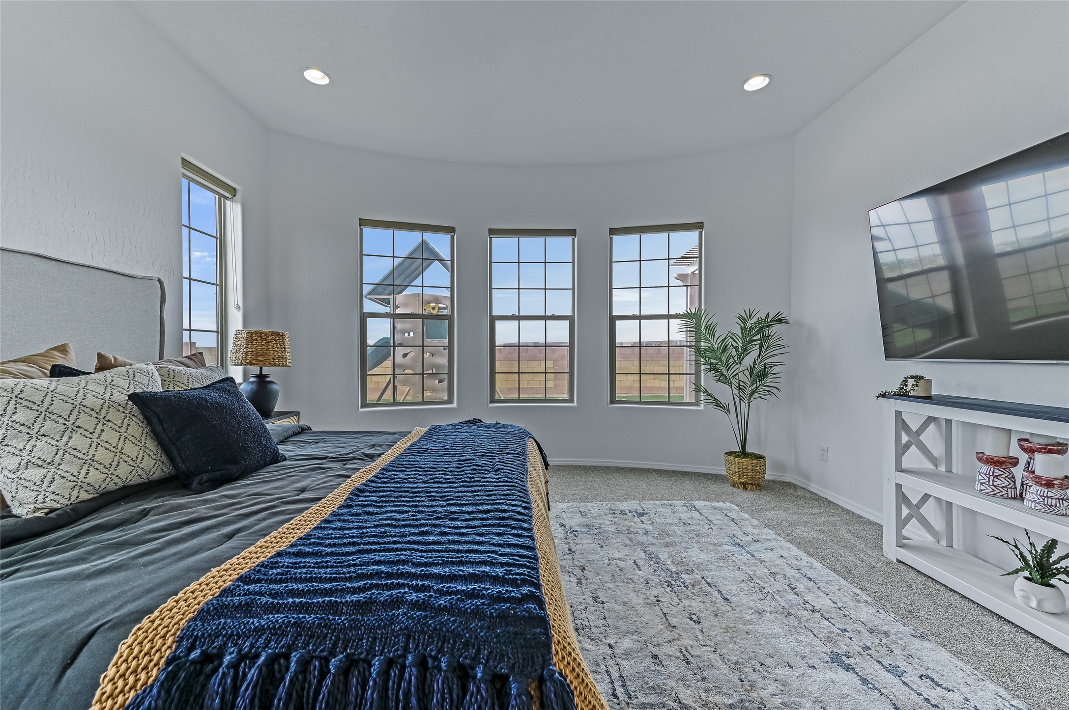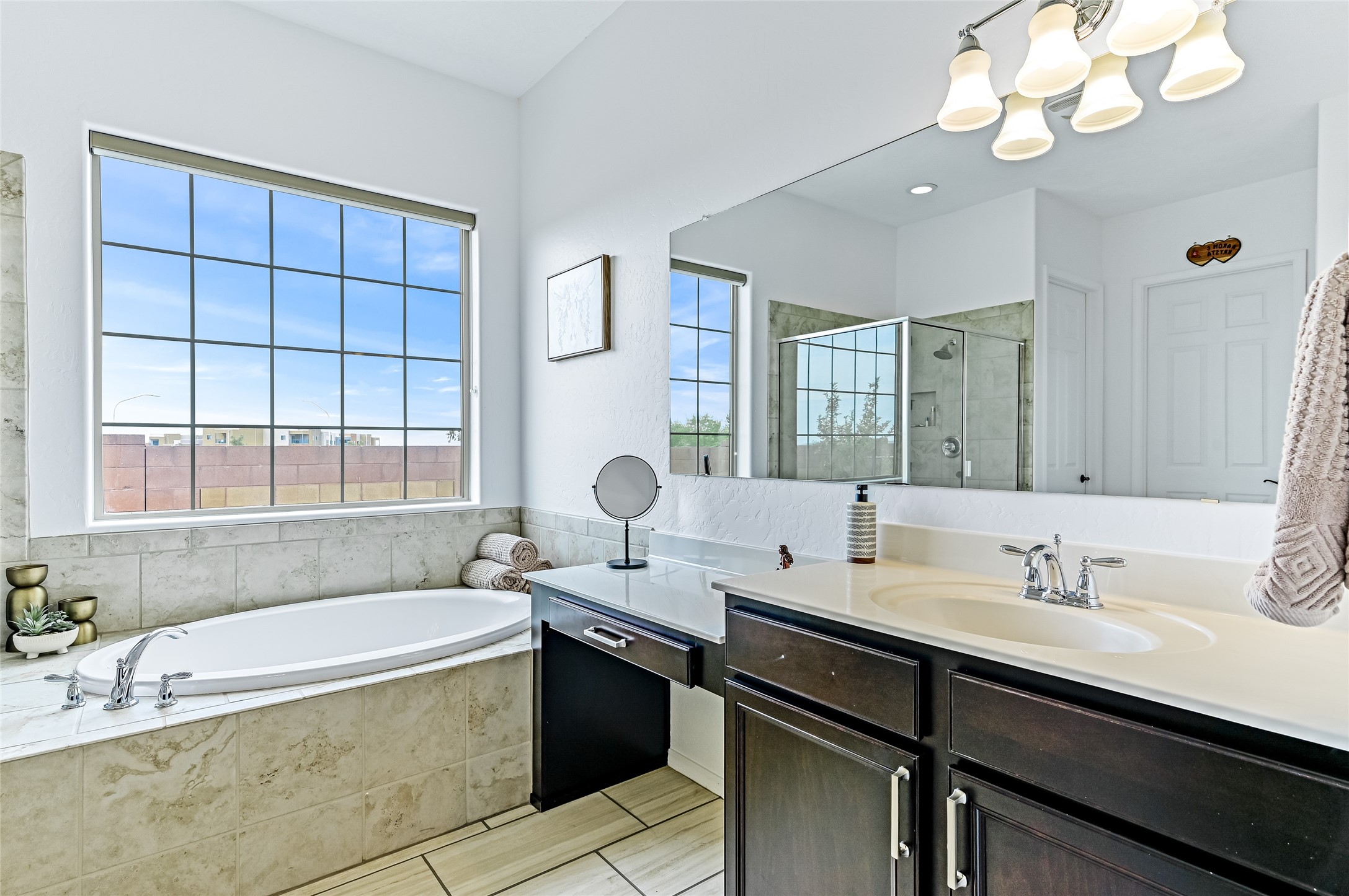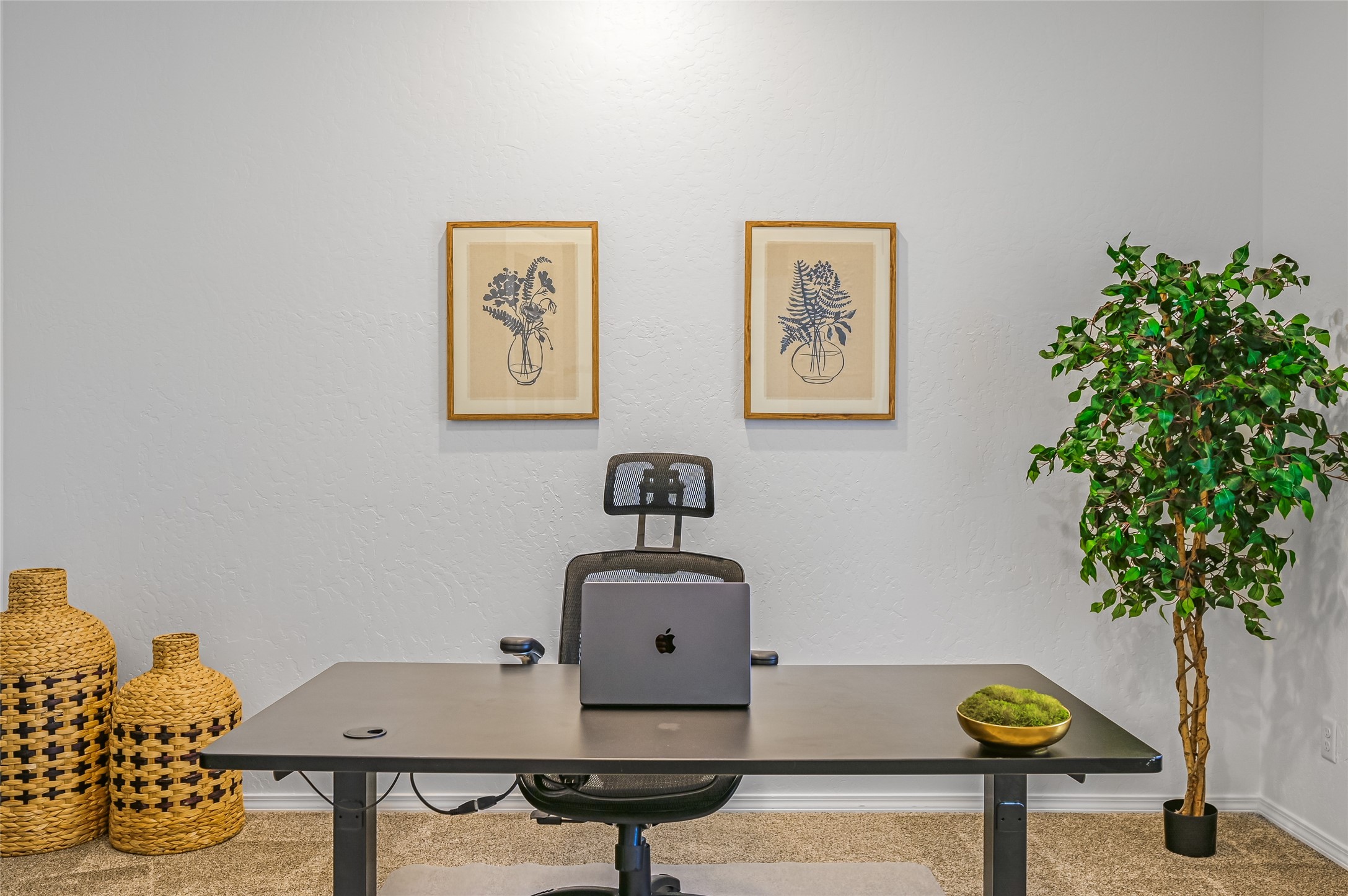 Located on a quiet cul-de-sac in Las Soleras, this 4-bedroom (or 3 bedroom + office), 2.5-bath home offers the perfect balance of comfort and convenience. Just over five years old, it sits next to a trail and the neighborhood park is across the street from the backyard wall. With only one neighbor, there's added privacy. You're minutes from I-25, shopping, restaurants, and Presbyterian Hospital. Inside, the home features high ceilings throughout, with an open-concept living room that includes a wood accent ceiling and large windows that fill the space with natural light. The kitchen is designed for gatherings, with a quartz countertop island, herringbone-patterned backsplash, and plenty of room to cook and connect. French doors lead to a private office, perfect for working from home. The spacious primary suite includes a walk-in closet and a spa-like bath with separate tub and shower. A 3-car garage includes an EV charger, storage room and sink. Out back, enjoy sunset views from a landscaped yard featuring turf, gravel, a pergola, and an outdoor fireplace--an ideal space for relaxing or entertaining. The home also includes a private courtyard entry, and fresh carpet and paint as of July 2025. This home checks all the boxes: great layout, natural light, indoor/outdoor flow, and a prime location near everyday essentials. Seller including 1 year home warranty.