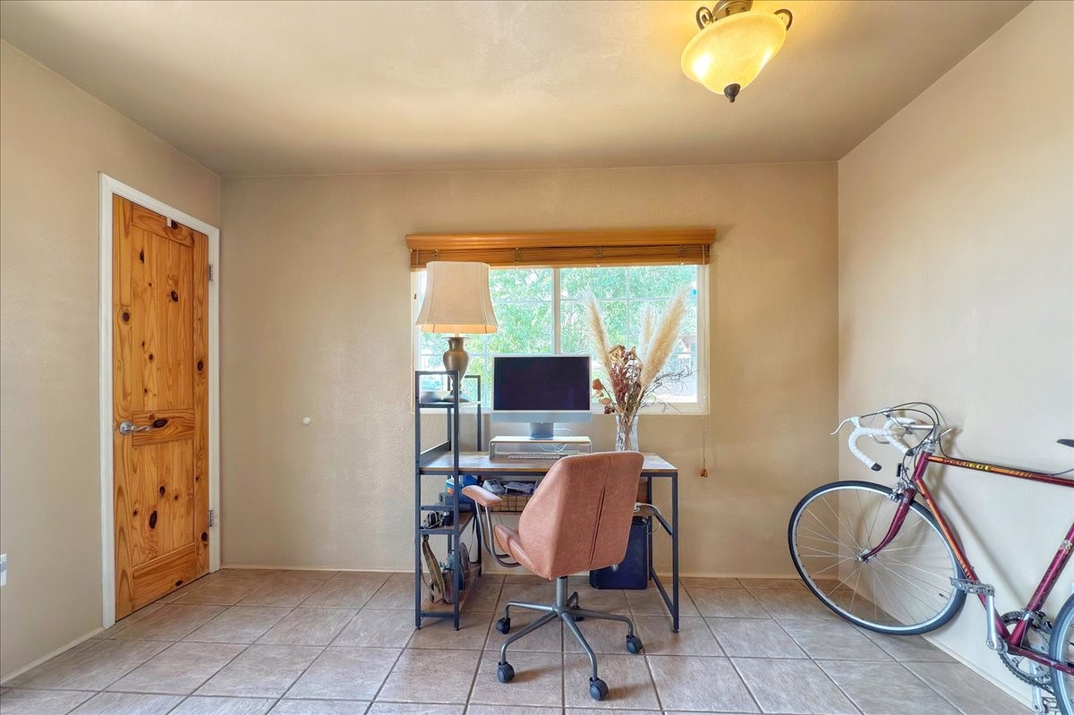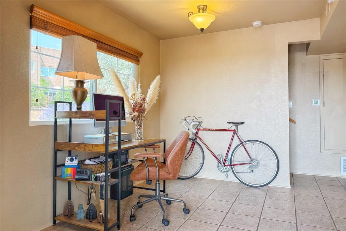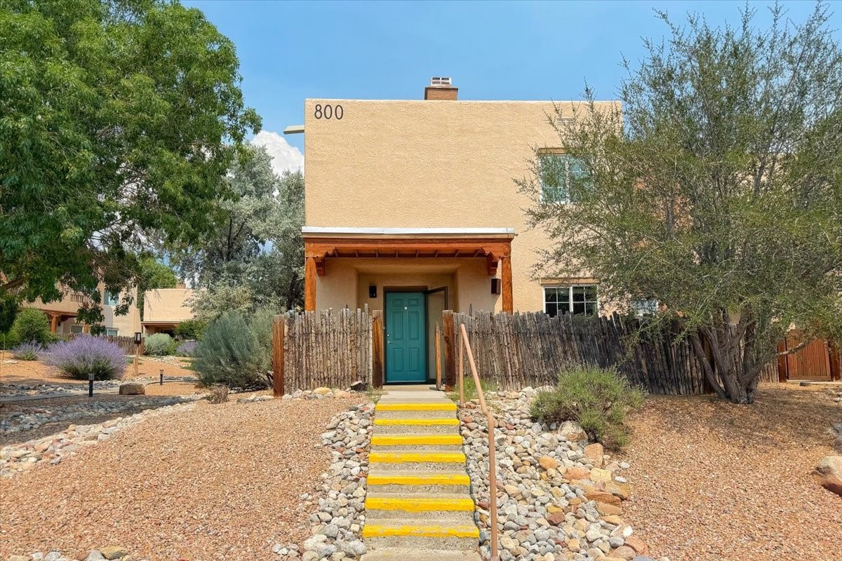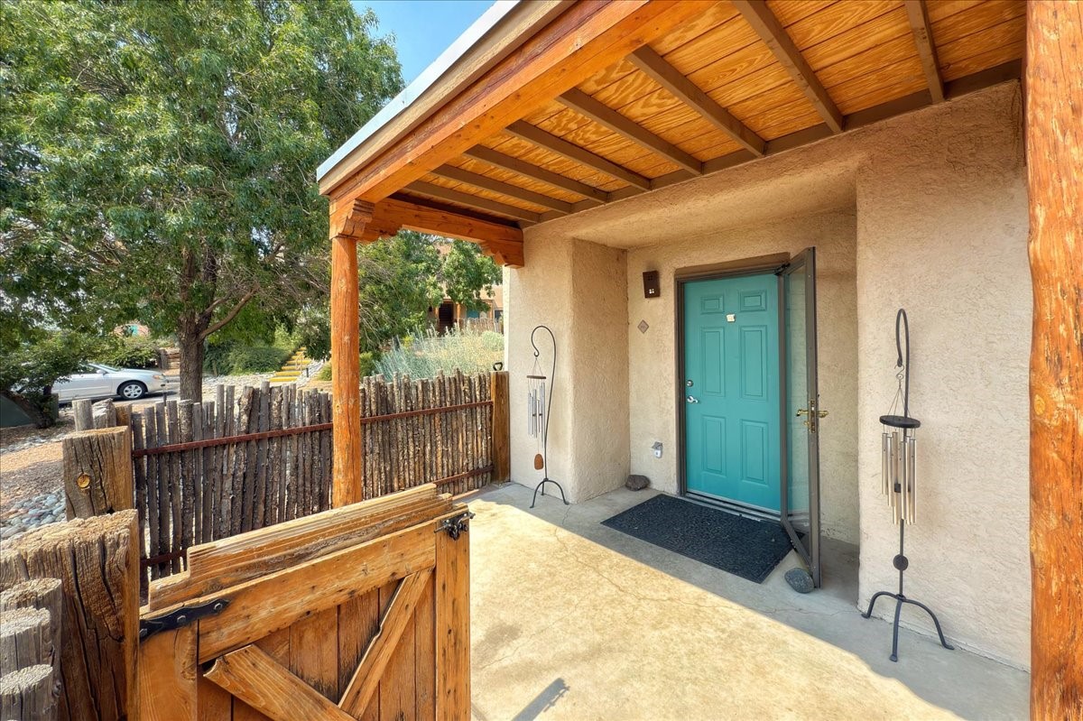 A thoughtfully designed hilltop condo which offers everything you need to enjoy Santa Fe. Centrally located making an easy commute throughout Santa Fe. Uniquely situated in Dos Santos, this unit offers one of the best sunset views available. Comes with an in unit washer and dryer and a brand new evaporative cooler. At 950 square feet, this 2-bedroom, 2-bathroom unit is versatile enough for a family, remote worker or anyone who splits time in Santa Fe. A private and secure community, Dos Santos is packed with amenities. A year round heated pool, fitness center, community fire pits, hot tub, dog park. Does Santos is gated and secure. Fees cover roofs, exteriors stucco, windows, front doors, all common elements throughout the community, evaporative cooler.