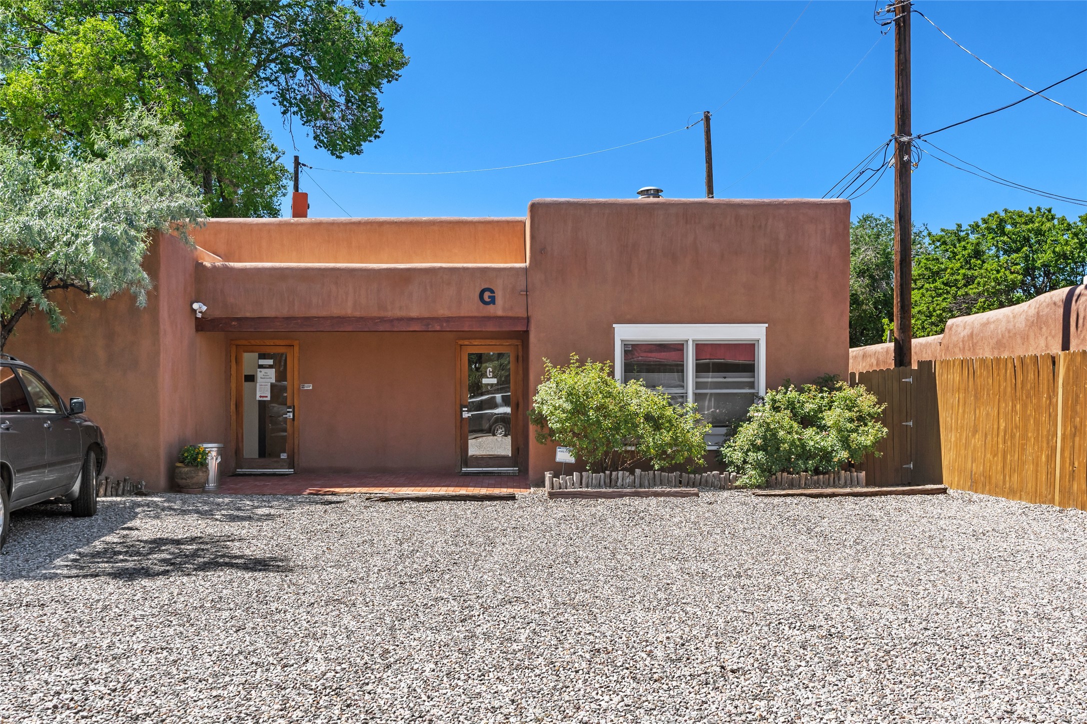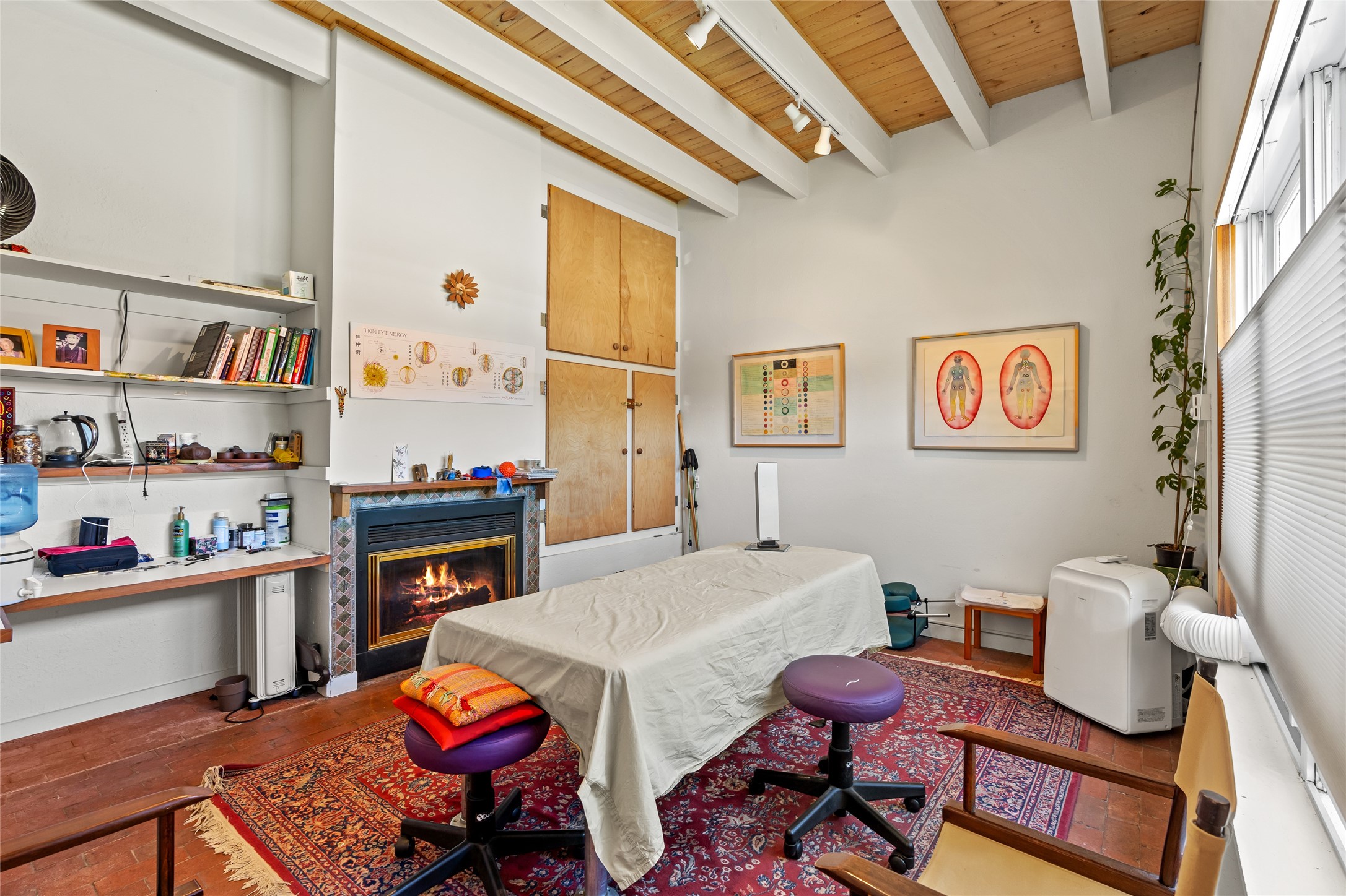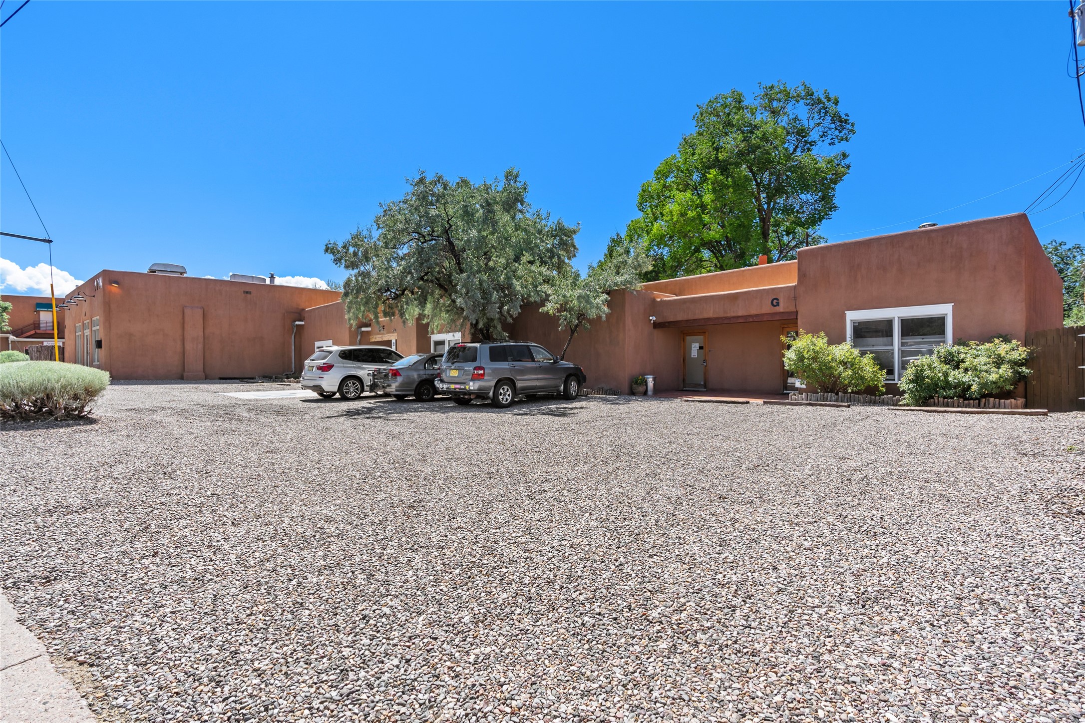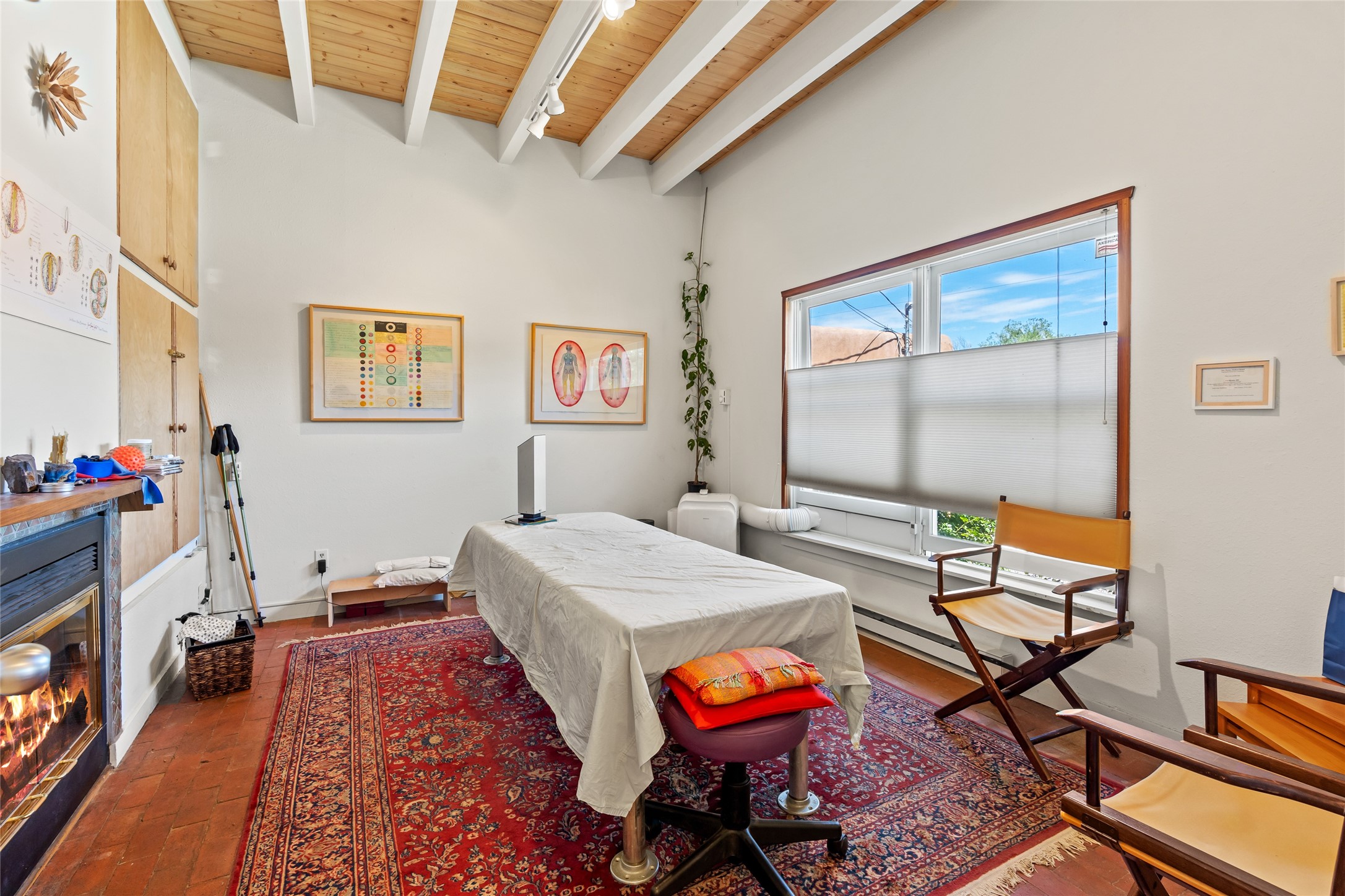 Located directly across from the Tune-Up Caf, this unique corner office condo offers two separate rental units and a private back courtyard--an ideal setup for owner-occupants, investors, or creative professionals. The main space (approx. 600 sq. ft.) features lofty ceilings, brick floors, a kitchenette, storage area, and direct access to a charming courtyard--perfect for client meetings or a quiet outdoor break. The design blends contemporary and industrial elements, echoing the creative spirit of the nearby Railyard District. The front unit (approx. 300 sq. ft.) includes a large window that floods the space with natural light and provides a view of Tune-Up Caf. A cozy fireplace adds character, making it an ideal office or practitioner's suite. Shared restrooms are located in the hallway just steps away. The Hickox Office Condo complex has recently been re-stuccoed and is in excellent condition. Opportunities to own in this well-maintained and rarely available complex are few and far between.