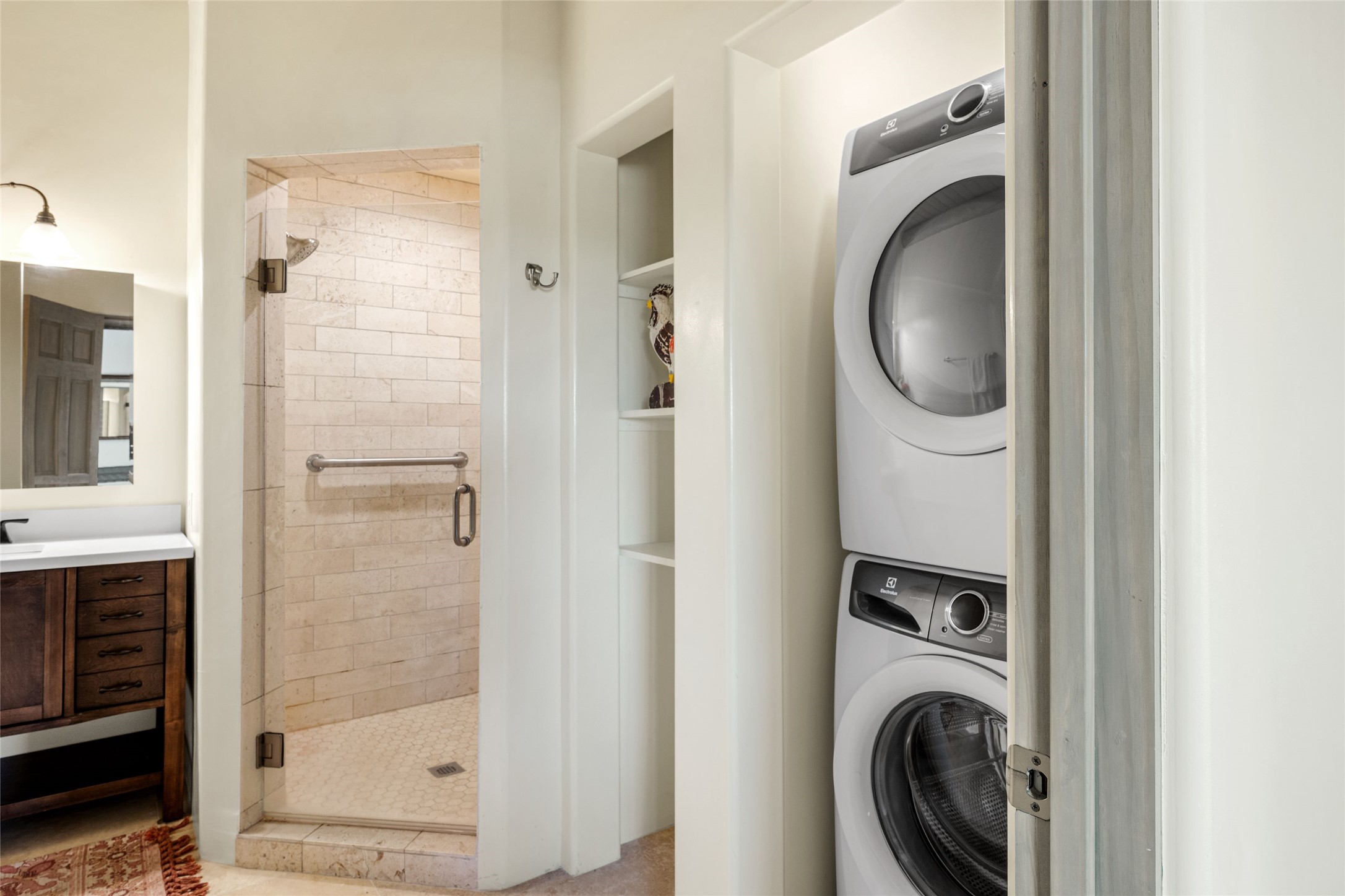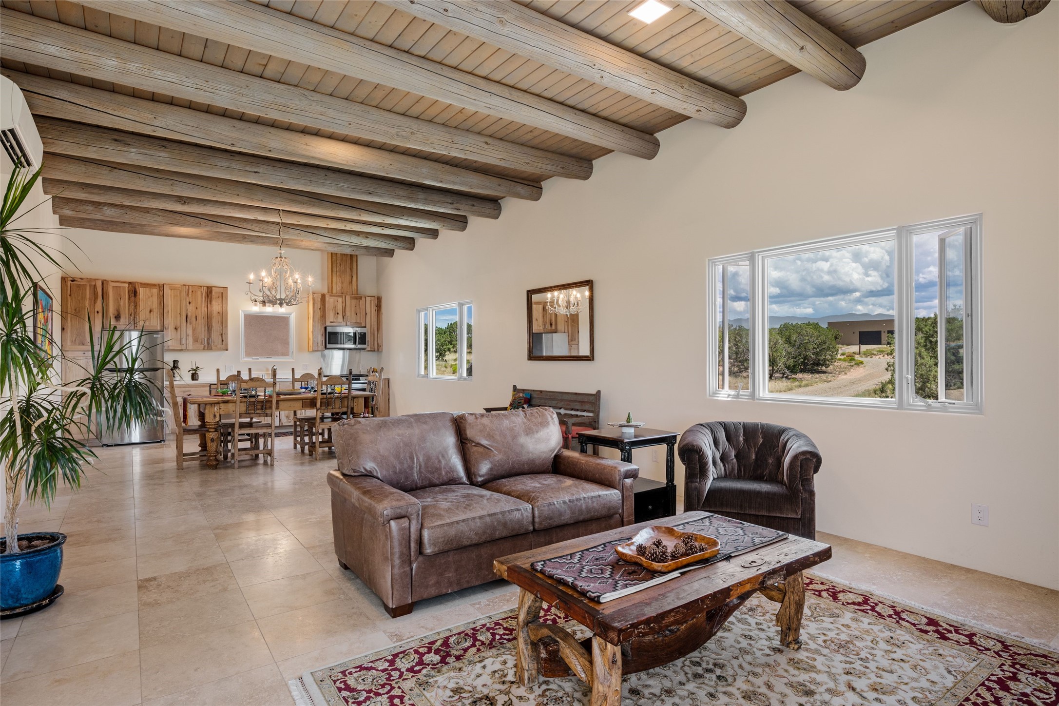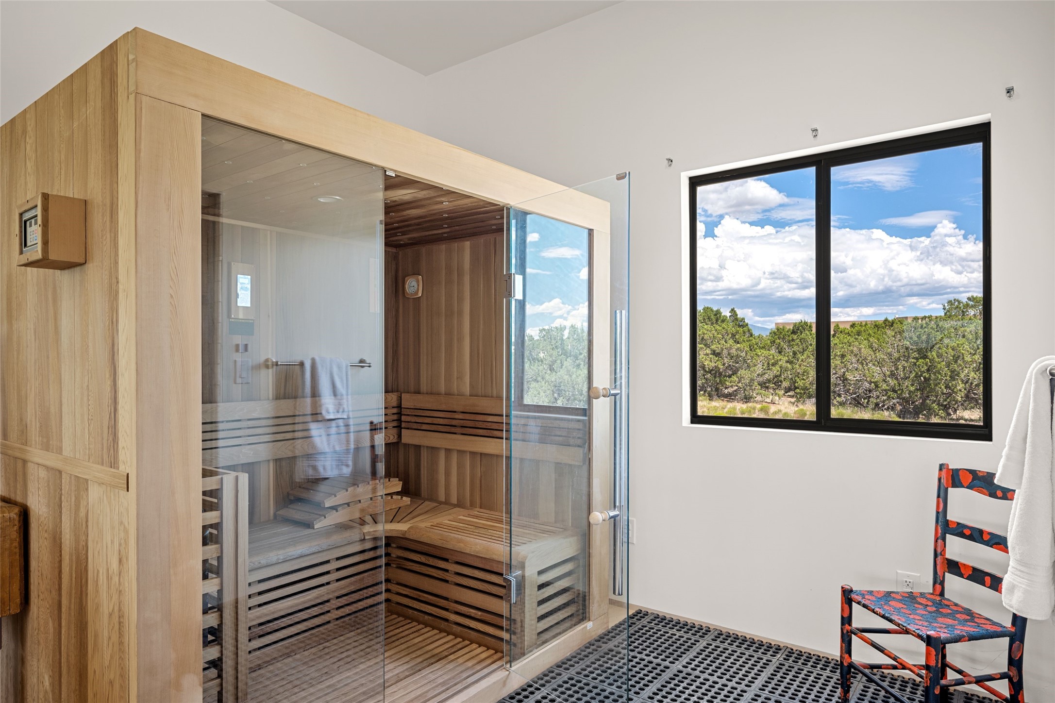 Light and bright two-bedroom home with large studio or guesthouse and Sangre de Cristo Mountain views. Set in a gated and peaceful compound between Aldea and Las Campanas, this beautifully designed home offers a rare combination of natural beauty, privacy, and versatile living. This 2,215 square foot residence, built in 2021 and feels brand new! The home enjoys a modern floor plan featuring high ceilings with light wood vigas, travertine tile floors, a gas fireplace and a lovely modern kitchen. The separate studio/office or guest house provides many options for a flexible lifestyle. Surrounded by pion and juniper trees but just minutes from town, this property is a true Santa Fe retreat, set on 2.5 acres that provide dramatic sunsets, and the quiet serenity of open skies. The large windows welcome natural light for style and comfortable living space, perfect for relaxing or entertaining. The kitchen is both functional and stylish, featuring stainless steel appliances, custom wood cabinetry, and room for a large dining table. Two bedrooms in the main house share a spacious bathroom. From the front portal, enjoy breathtaking mountain views and morning light. On the back portal, the property opens to quiet nature and big-sky vistas. Connected to the home, but with a private entrance, the large, attached studio offers endless possibilities. Whether used as a guest suite, creative workspace, home office, gym, or wellness retreat this generous space includes a kitchenette, large living/sleeping area, dry sauna, steam shower, and access to a private covered portal perfect for enjoying stunning Santa Fe sunsets. Comfortable year-round with radiant floor heating and mini-splits, this home is ideal for those seeking beauty, versatility, and a connection to the land--all without sacrificing convenience. Located just minutes from downtown Santa Fe, yet worlds away from the hustle and bustle, this unique property captures the essence of peaceful living in the high desert.