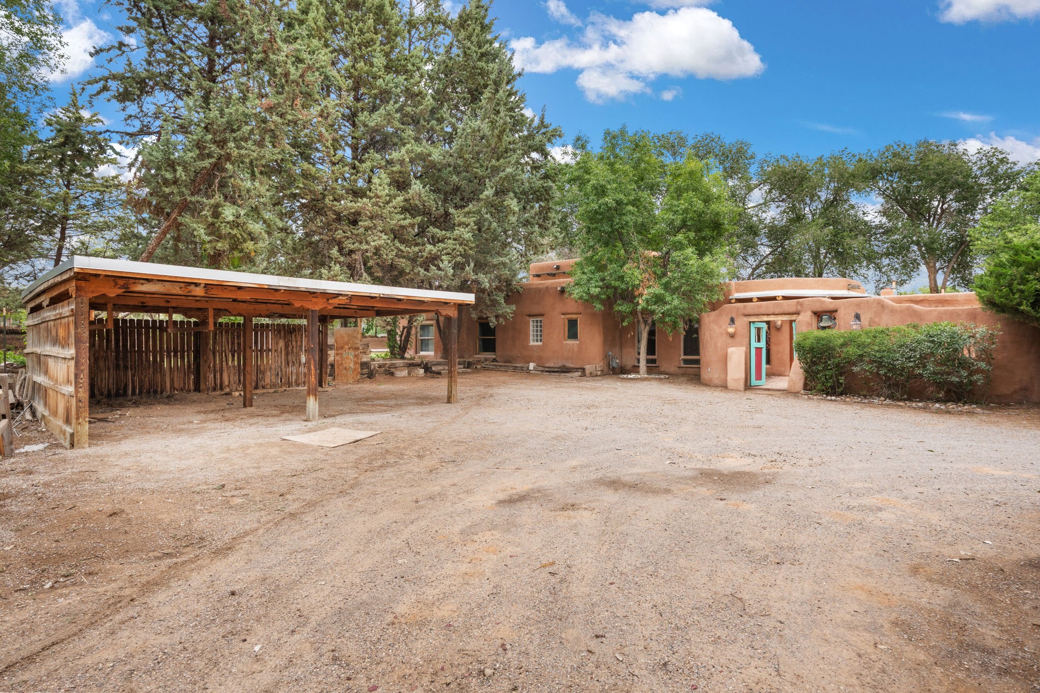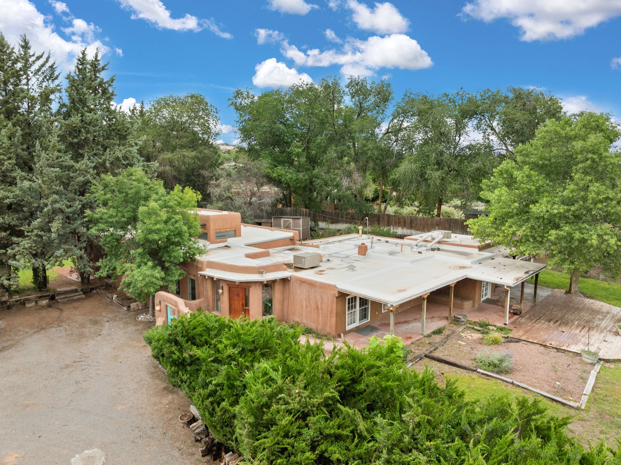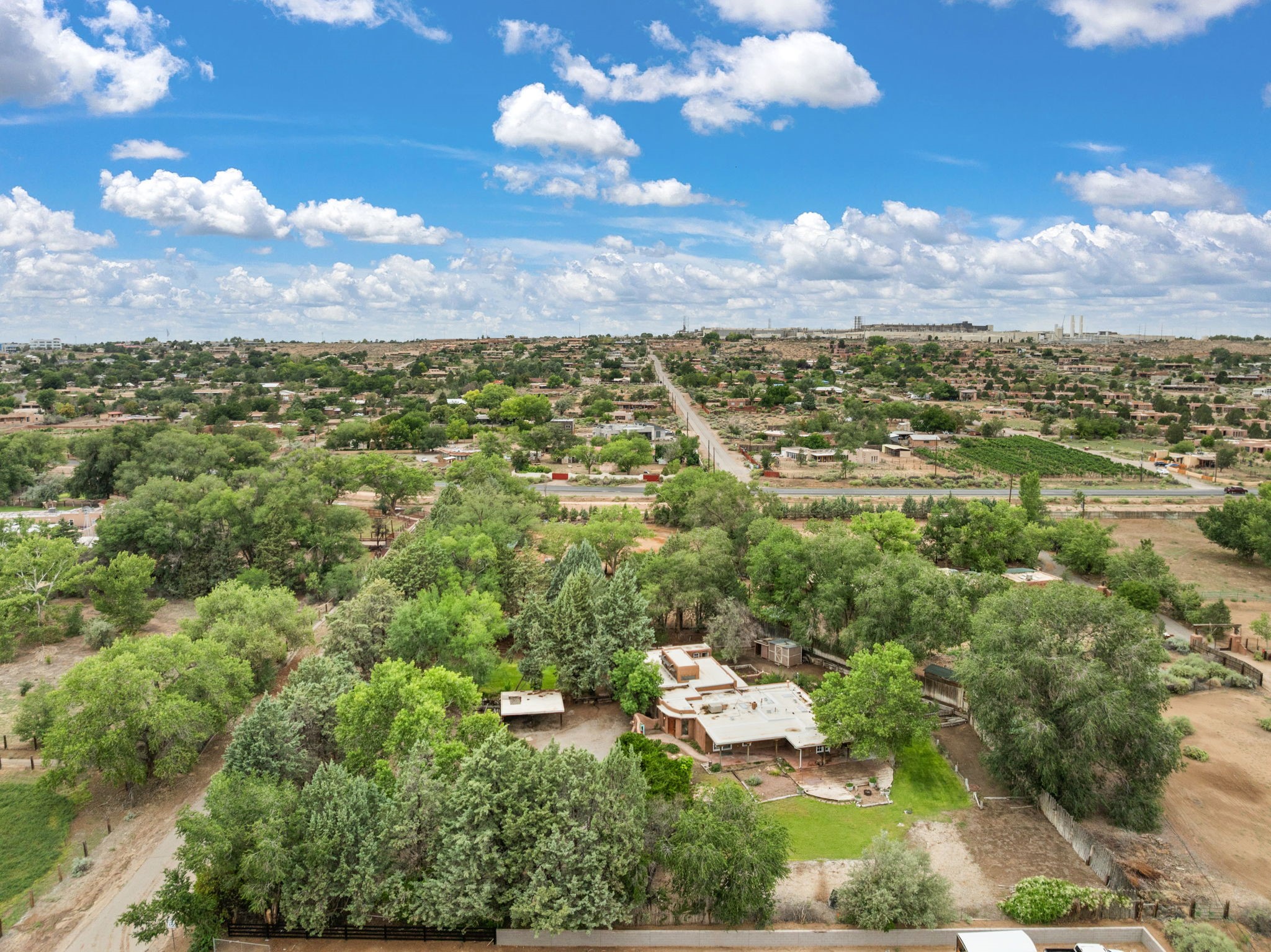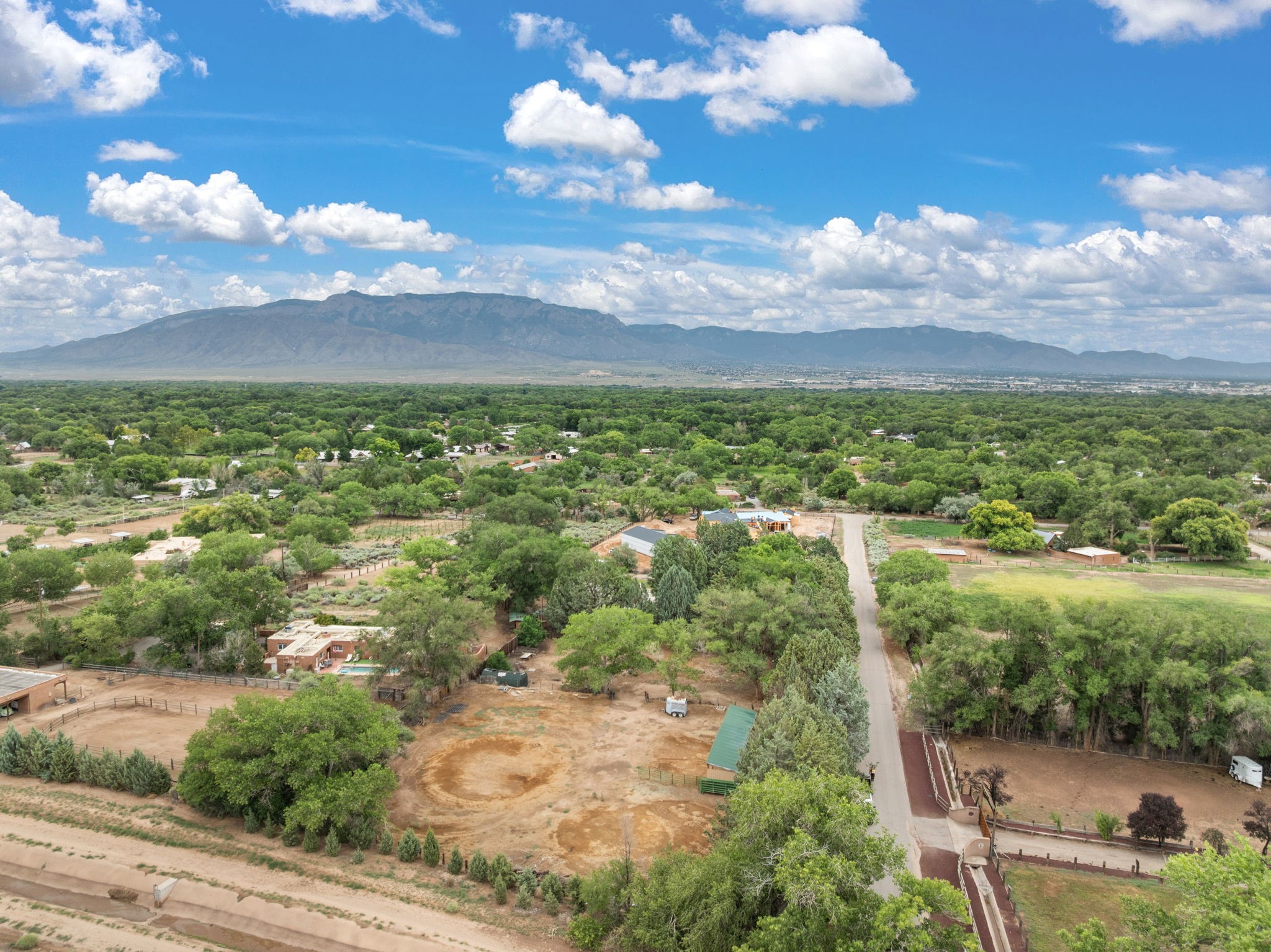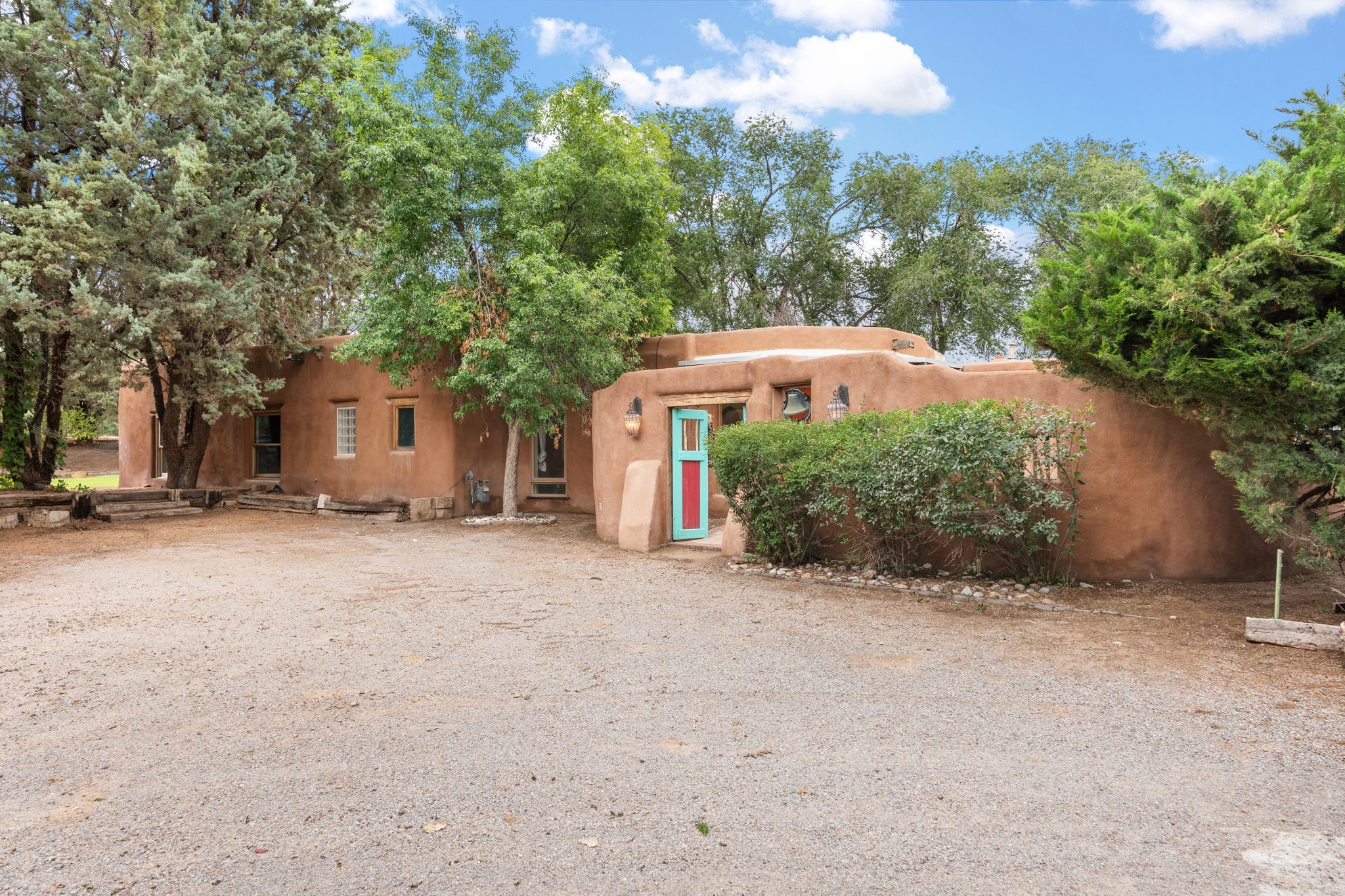 Enveloped by trees in a private 2 acre setting is this unique Corrales adobe style home. Over 3600 sf of living, featuring courtyard entry, living room with kiva fireplace, spacious kitchen with bar, granite and plenty of counter space. Informal and formal dining, a separate primary suite w/ large walk in closet, garden bath, and lounging room that access the east portal. Beams, brick, wood floors, doors, create the flavor of timeless living. A separate wing features 3 generous bedrooms plus an office as well as a full bath and a storage room. Separate wing was added after 1981, as well as many updates in the last years. The acreage is fabulous, perfect for the equestrian or farmer. Convenient location for shopping, riding, biking, trails, local restaurants and pubs.