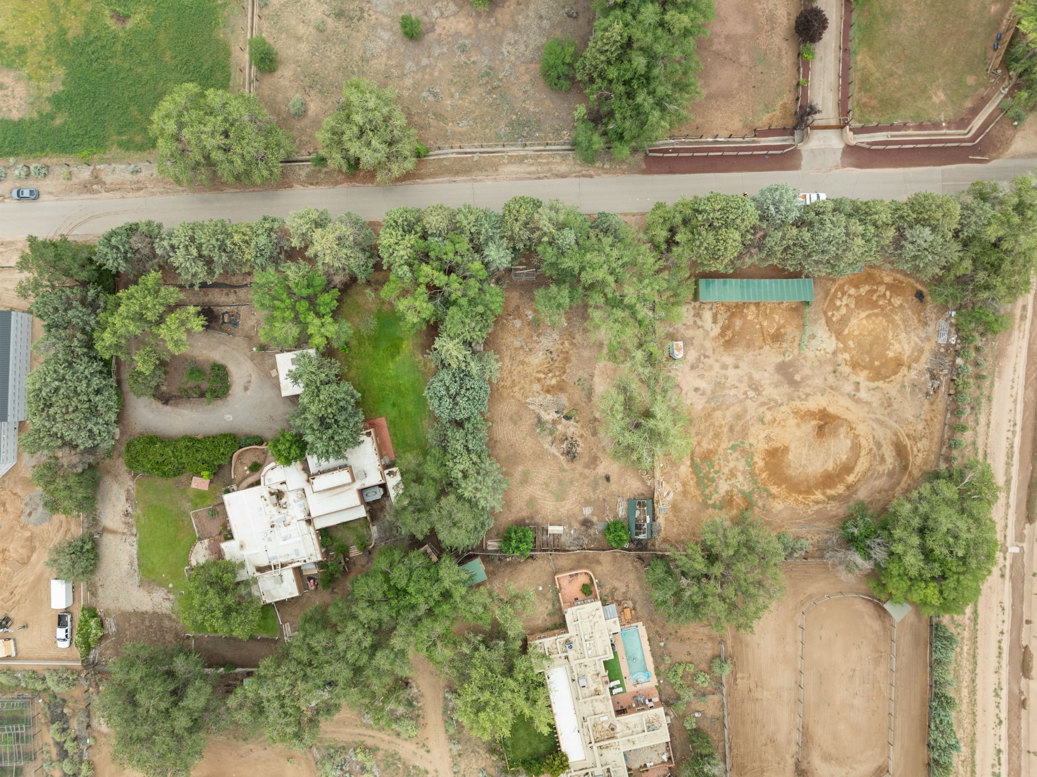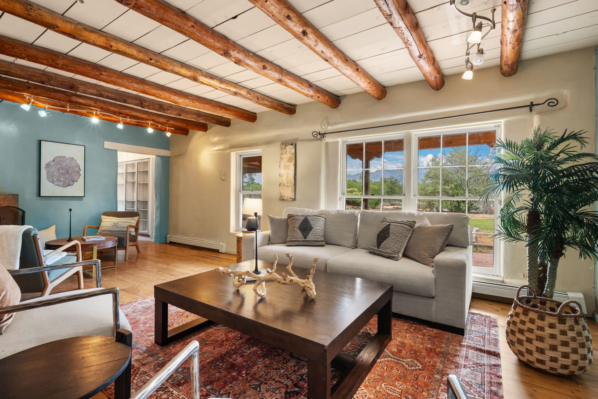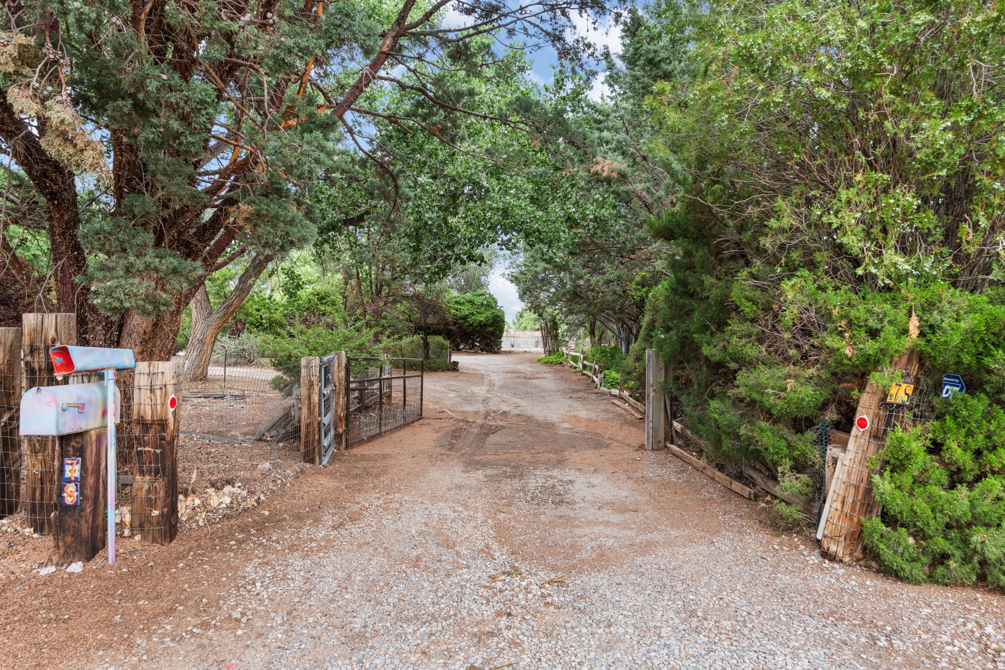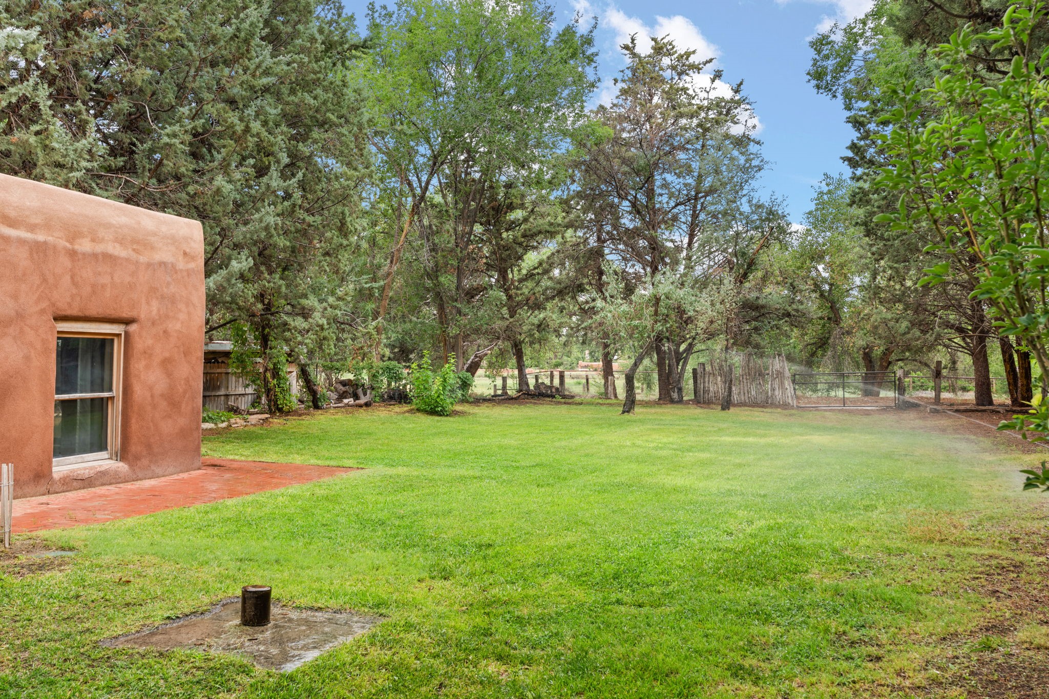 Enveloped by trees in a private 2 acre setting is this unique Corrales adobe style home. Over 3600 sf of living, featuring courtyard entry, living room with kiva fireplace, spacious kitchen with bar, granite and plenty of counter space. Informal and formal dining, a separate primary suite w/ large walk in closet, garden bath, and lounging room that access the east portal. Beams, brick, wood floors, doors, create the flavor of timeless living. A separate wing features 3 generous bedrooms plus an office as well as a full bath and a storage room. Separate wing was added after 1981, as well as many updates in the last years. The acreage is fabulous, perfect for the equestrian or farmer. Convenient location for shopping, riding, biking, trails, local restaurants and pubs.