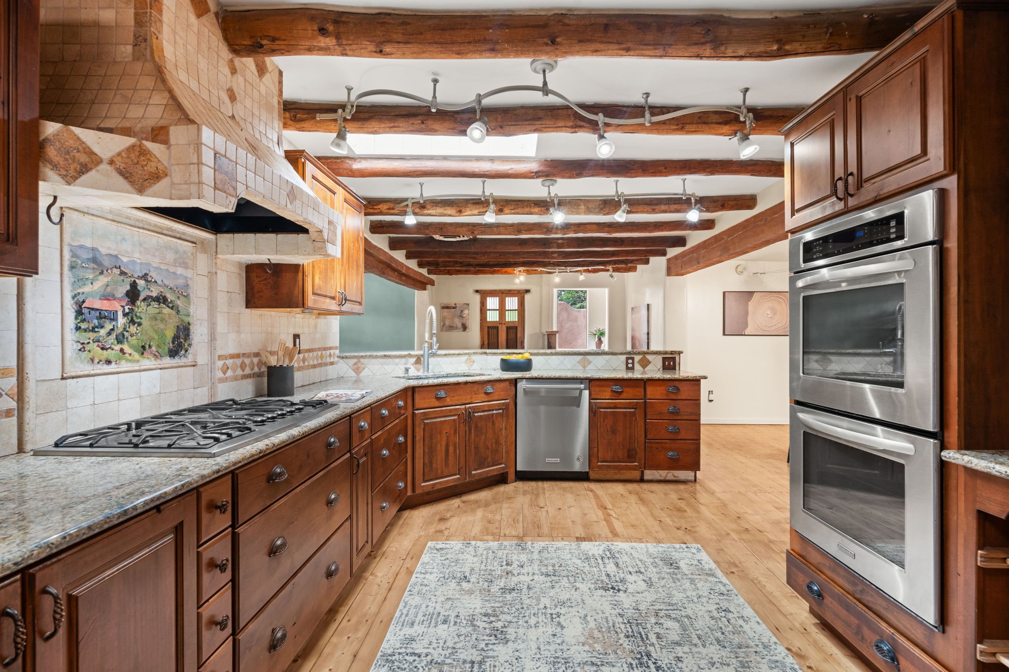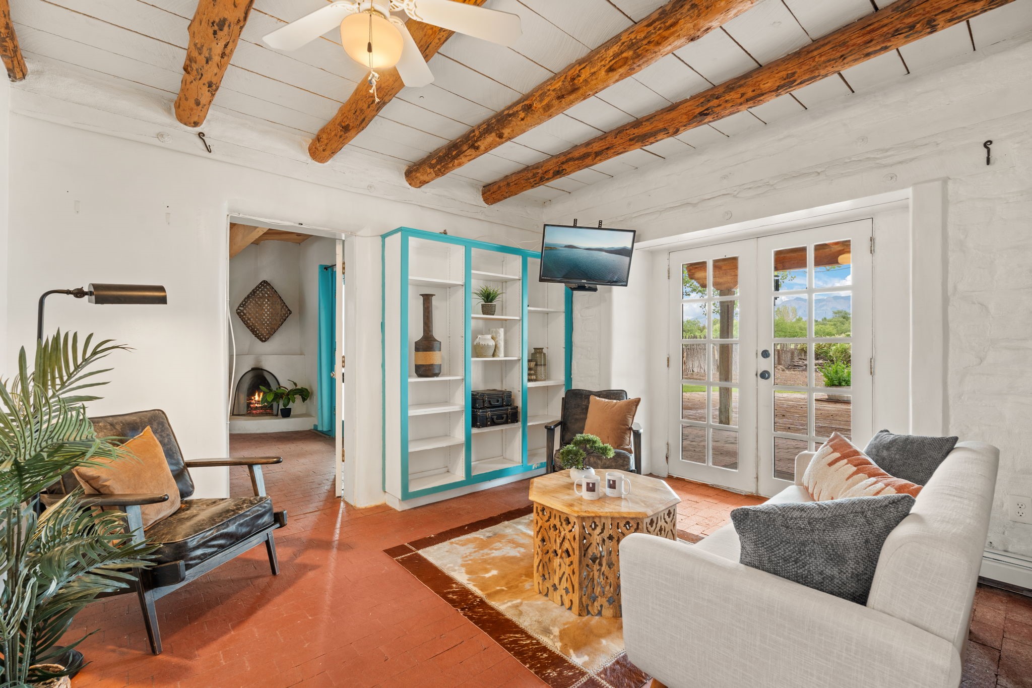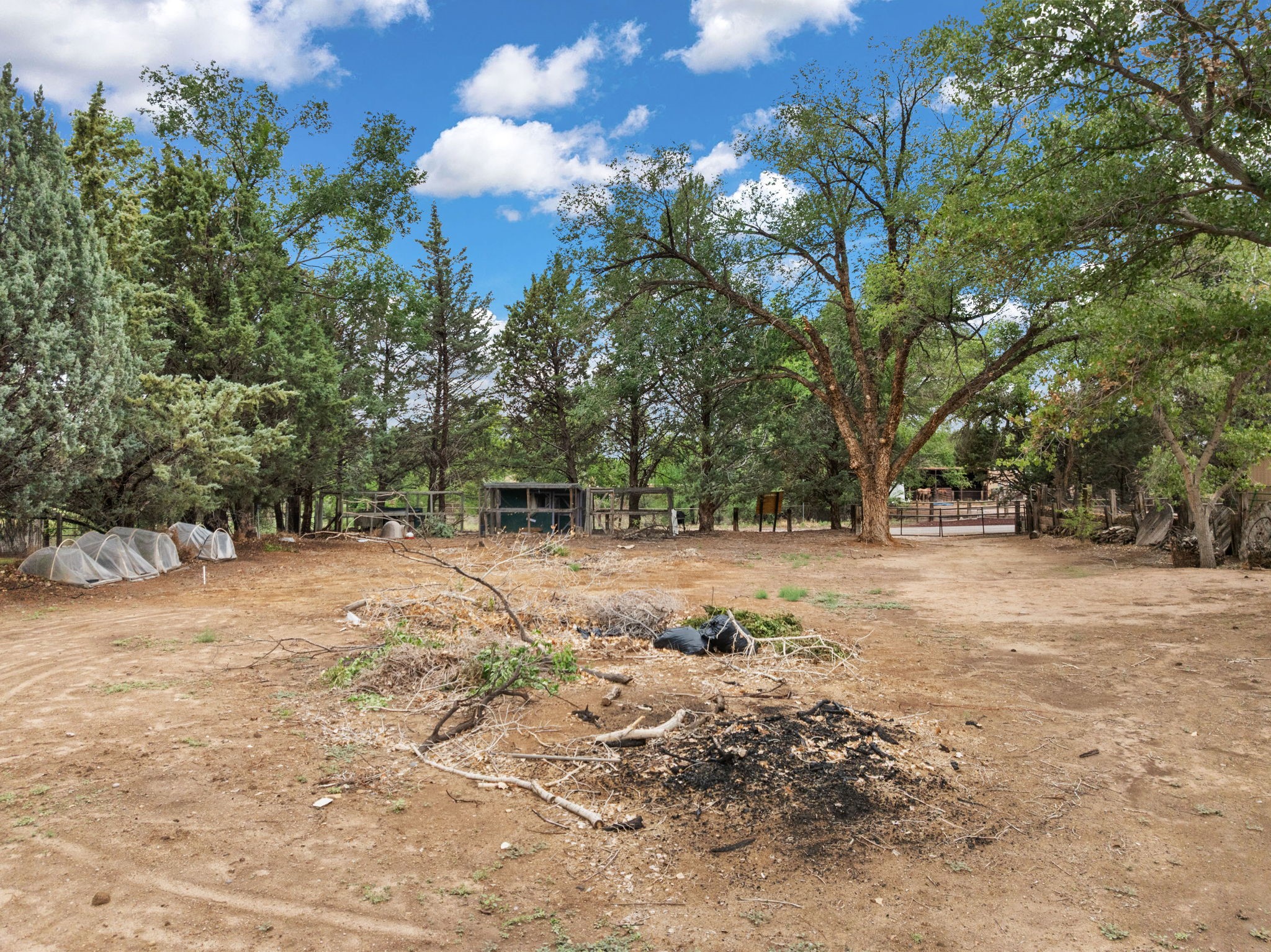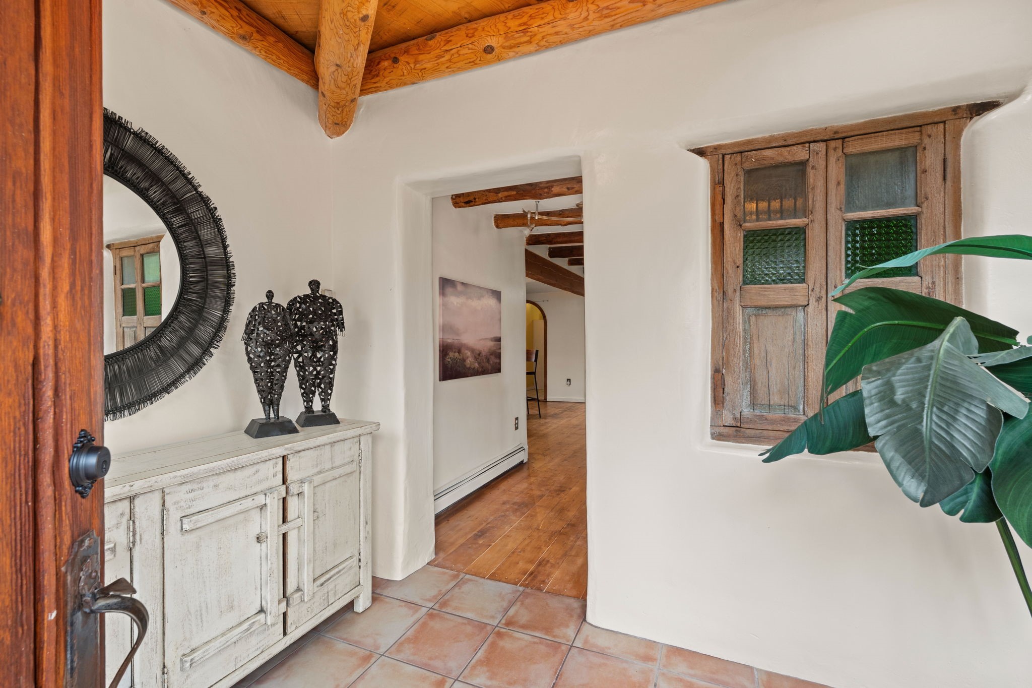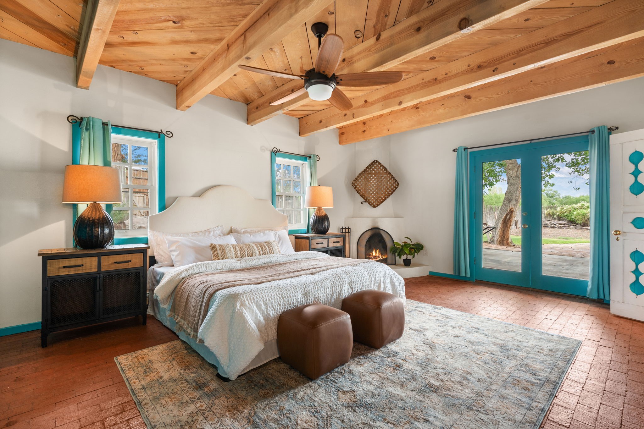 Enveloped by trees in a private 2 acre setting is this unique Corrales adobe style home. Over 3600 sf of living, featuring courtyard entry, living room with kiva fireplace, spacious kitchen with bar, granite and plenty of counter space. Informal and formal dining, a separate primary suite w/ large walk in closet, garden bath, and lounging room that access the east portal. Beams, brick, wood floors, doors, create the flavor of timeless living. A separate wing features 3 generous bedrooms plus an office as well as a full bath and a storage room. Separate wing was added after 1981, as well as many updates in the last years. The acreage is fabulous, perfect for the equestrian or farmer. Convenient location for shopping, riding, biking, trails, local restaurants and pubs.