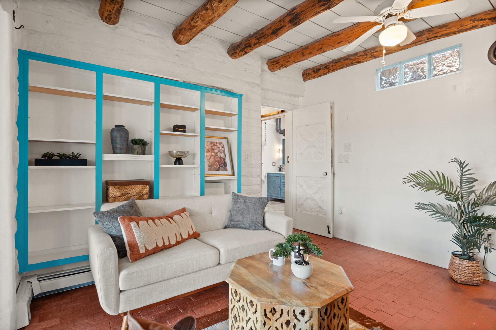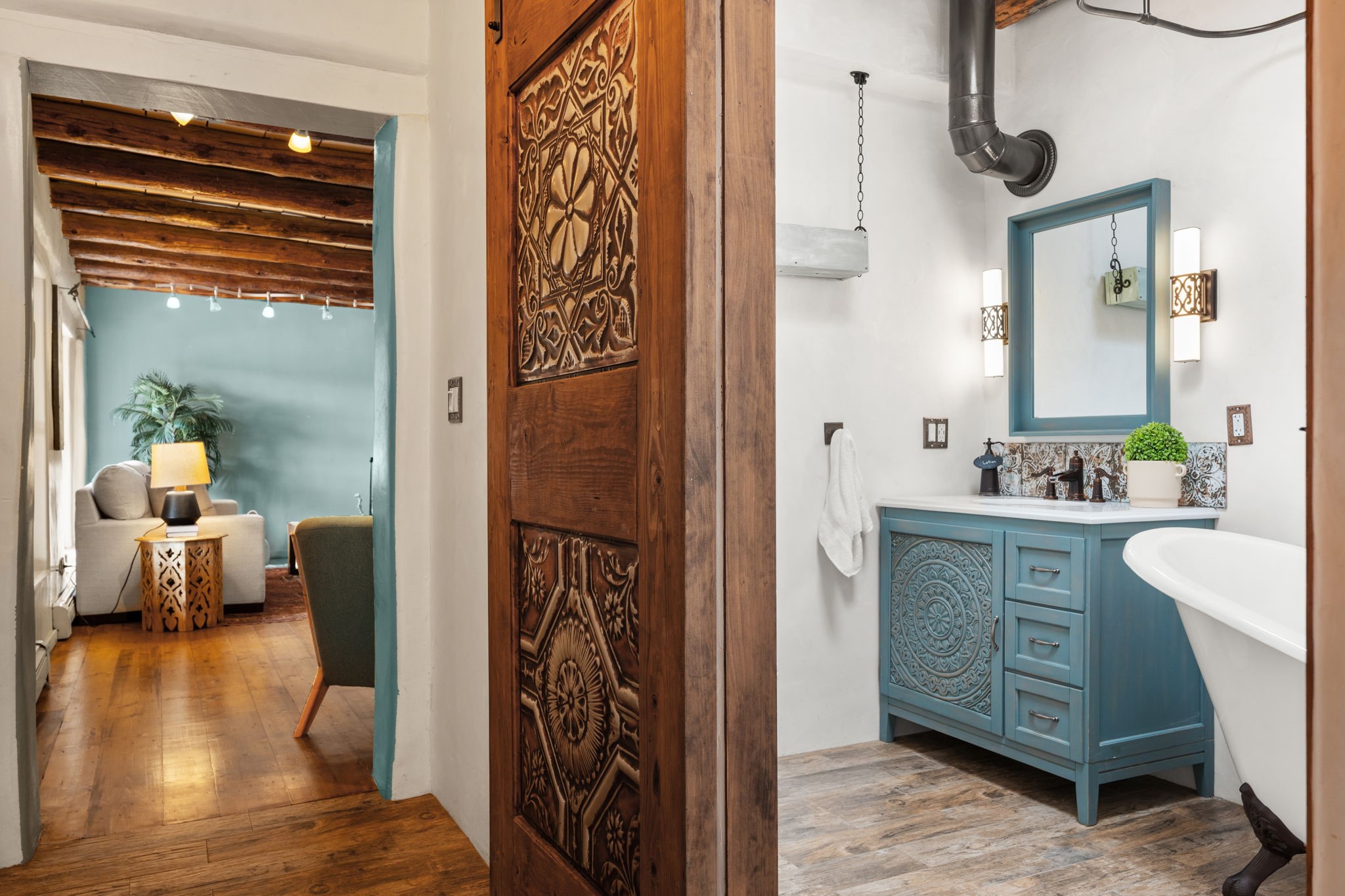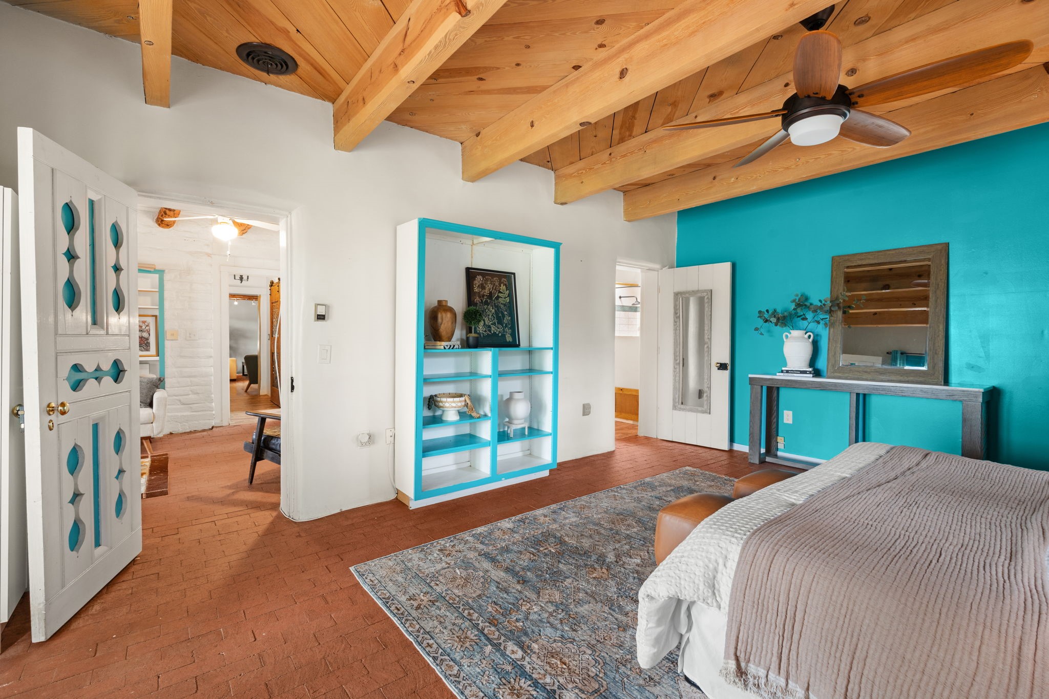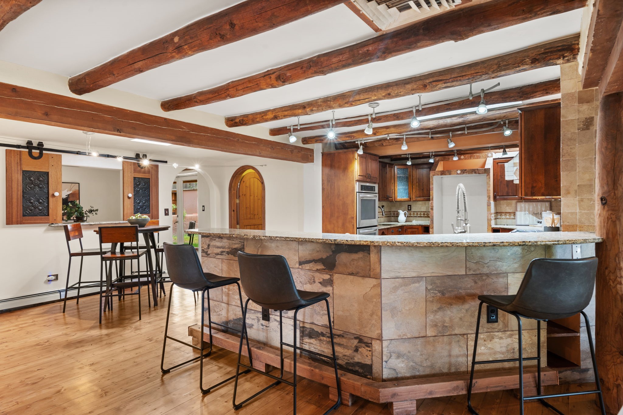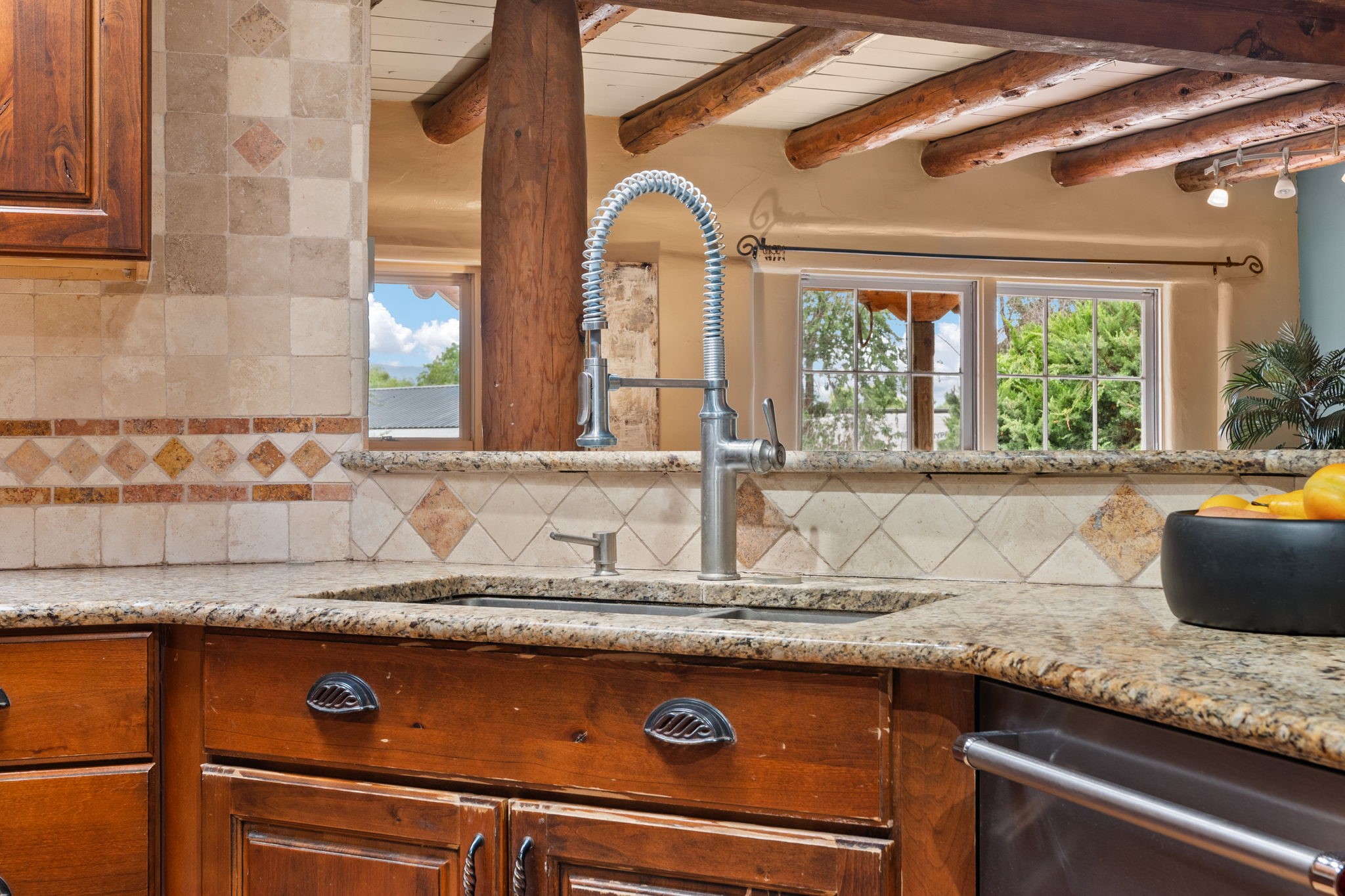 Enveloped by trees in a private 2 acre setting is this unique Corrales adobe style home. Over 3600 sf of living, featuring courtyard entry, living room with kiva fireplace, spacious kitchen with bar, granite and plenty of counter space. Informal and formal dining, a separate primary suite w/ large walk in closet, garden bath, and lounging room that access the east portal. Beams, brick, wood floors, doors, create the flavor of timeless living. A separate wing features 3 generous bedrooms plus an office as well as a full bath and a storage room. Separate wing was added after 1981, as well as many updates in the last years. The acreage is fabulous, perfect for the equestrian or farmer. Convenient location for shopping, riding, biking, trails, local restaurants and pubs.