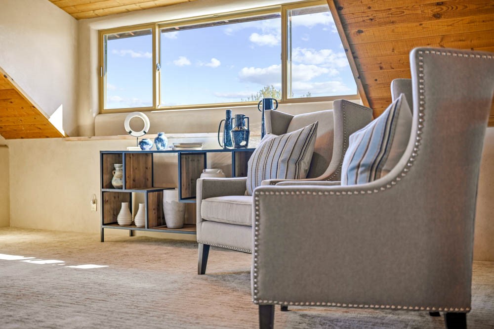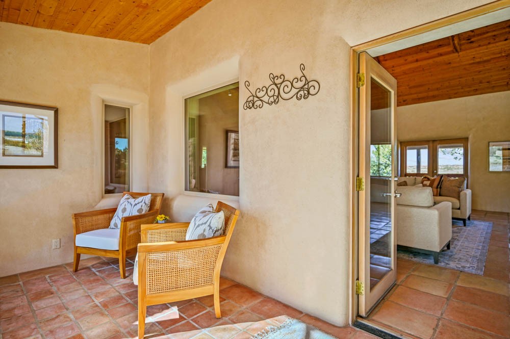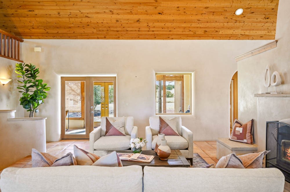 Nestled in the sought-after Art Barns area of Lamy, just a scenic 20-minute drive from Santa Fe, this distinctive 2-bedroom, 2-bath home offers a rare blend of privacy, character, and sweeping mountain views on 5.86 acres. Spanning 2,563 square feet, the residence features beautiful Saltillo tile flooring, comfortable in-floor radiant heating, and a flexible loft space ideal for a home office or family room. A pitched roof and classic Southwestern styling complement the surrounding landscape, while recent 2025 updates--including a new boiler, stucco repairs on the home, and brand-new stucco on the detached oversized 2-car garage--provide peace of mind. With expansive outdoor space, stunning vistas, and easy access to Eldorado's shopping and Santa Fe's amenities, this property is an exceptional opportunity to enjoy serene high-desert living at its finest.