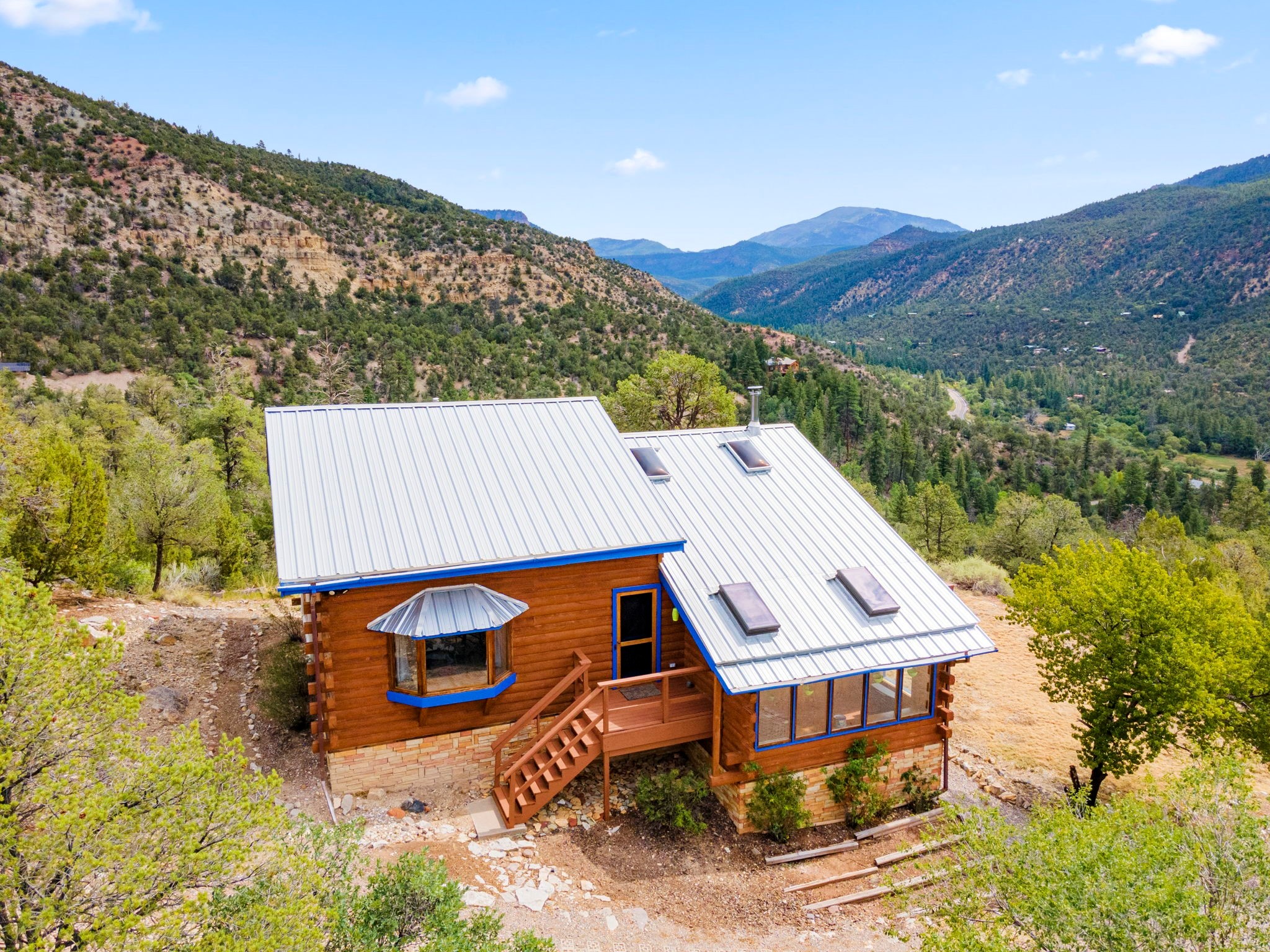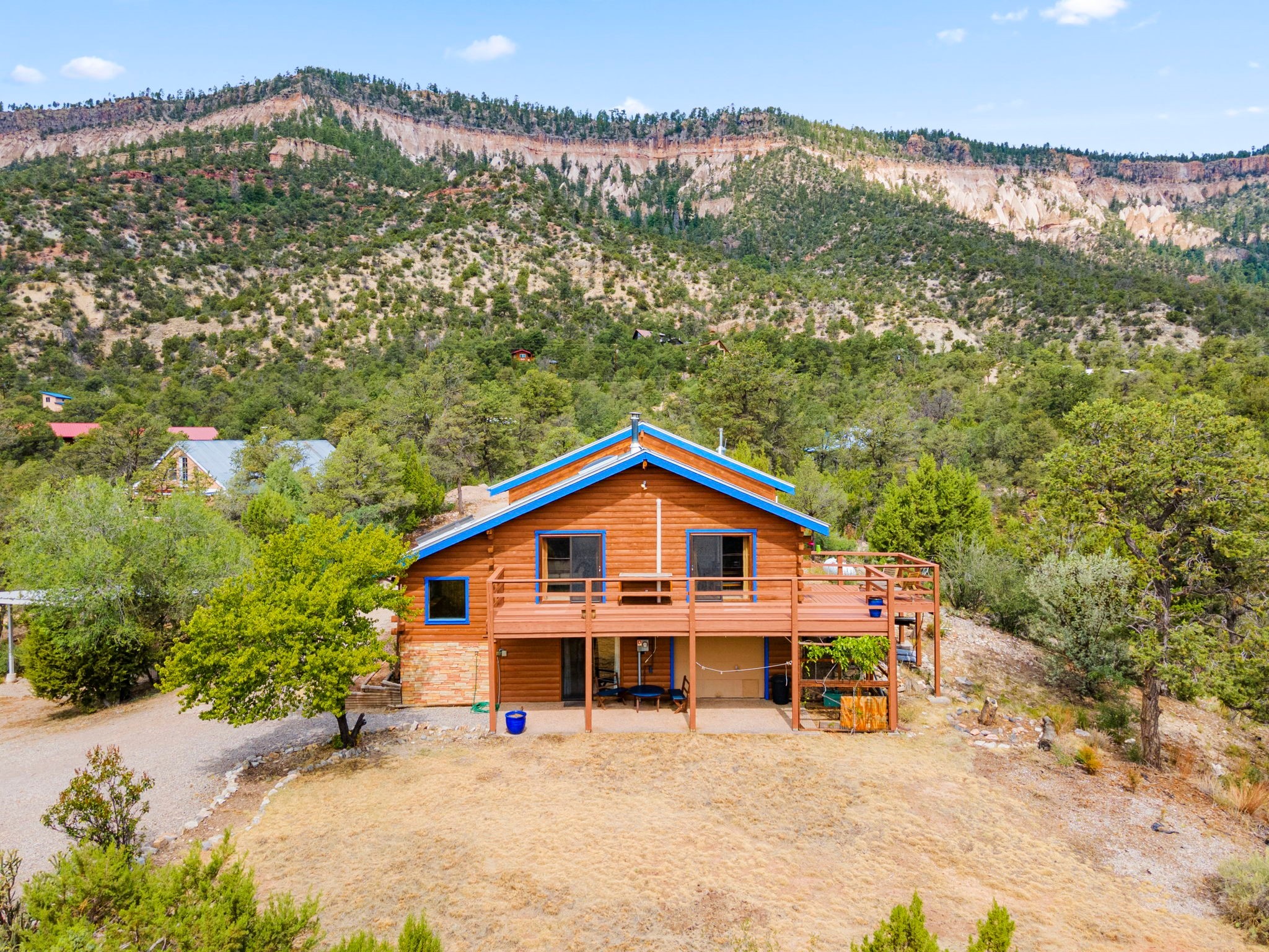 Breathtaking setting for this home in Jemez Springs perched among soaring mountain views. This spacious home has soaring beamed ceilings, wood floors, light-filled rooms, & loft with ample storage. Open floor plan with inviting living & dining area that expands to sunroom. Ideal for cozy reading rm, yoga/meditation or artist studio. Wood stove & mini splits making it comfortable all year long. Newer appliances in the kitchen. Access to expansive deck to enjoy mountain views and cool breezes. Lower level includes 2 flex spaces, a laundry room & full bathroom. Entry to an oversized one car garage. Could be used for a workshop. Property has a detached shed & covered carport, room for 2 vehicles. Home is on a very private lot at the end of cul-de-sac. Easy commute to LANL, Albuquerque, Fenton Lake. Buyer to confirm square footage.