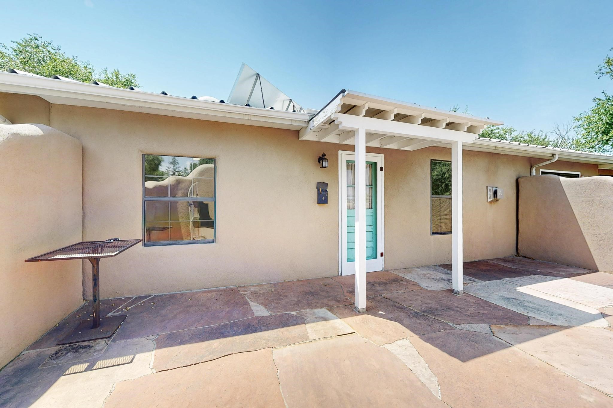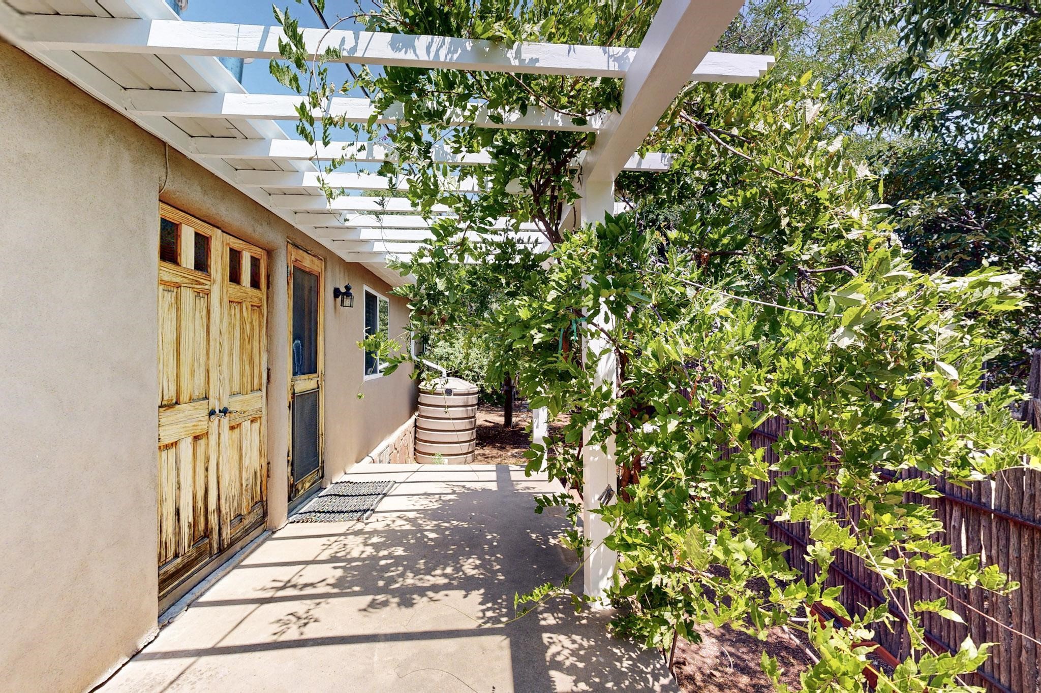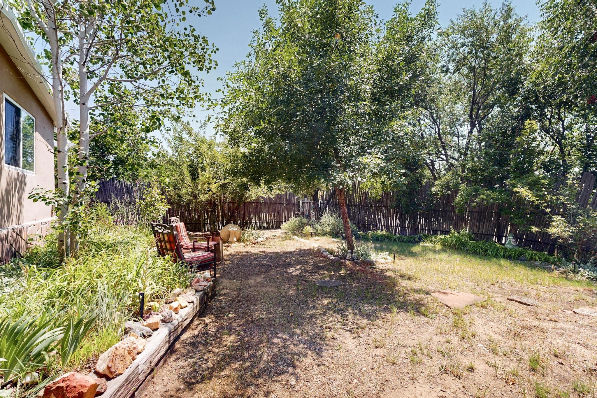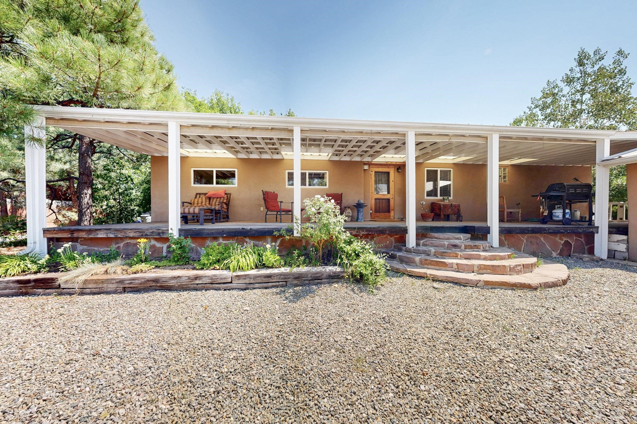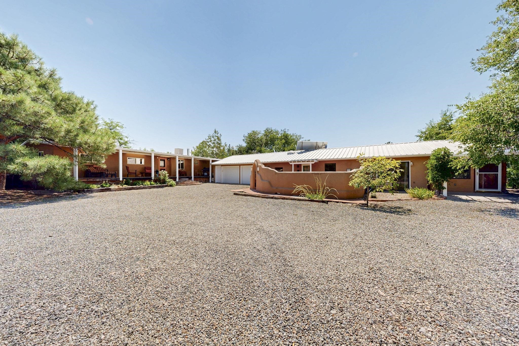 Unique and charming property at the end of Paseo De La Conquistadora on just under a 1/2 acre corner lot. Potentially an ideal ADU (accessory dwelling unit). The property lends itself to multigenerational living with the elderly parents, an offspring and a caregiver living in close proximity but with separate living spaces for privacy. Nestled under mature tree cover this property has three residential dwellings. The site built house is composed of two units. One is a one bedroom with three quarter bath and has its own walled courtyard with flagstone pavers. The smaller unit is an efficiency with a three quarter bath. There is a manufactured home with two bedrooms, two office areas and two baths. It features oak and tile floors and has a nice ambience accented by a kiva fireplace. It also has a 684 square porch running the length of the building. There is a wonderful nicely landscaped side yard that is fenced and very private. The lot has numerous fruit trees, lilacs and tall pines and sits up high above the Santa Fe river and there is a nice view of the Sangres. The Santa Fe river trail is just below the lot. The property has secure access via a remote controlled gate.