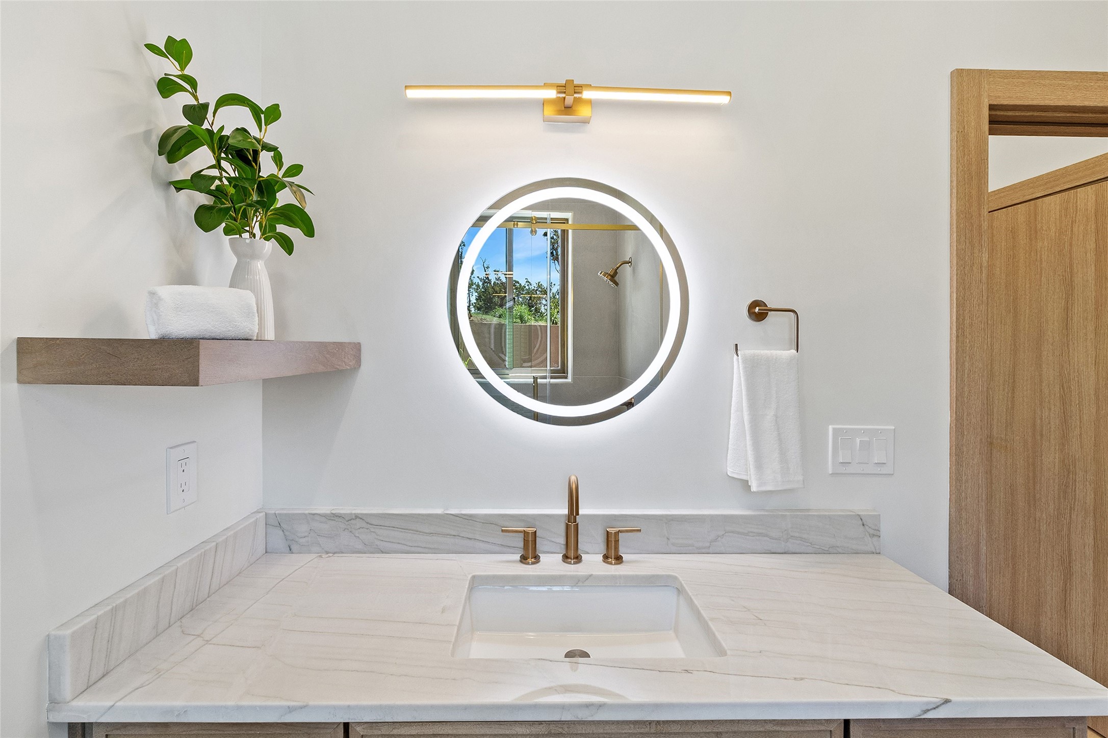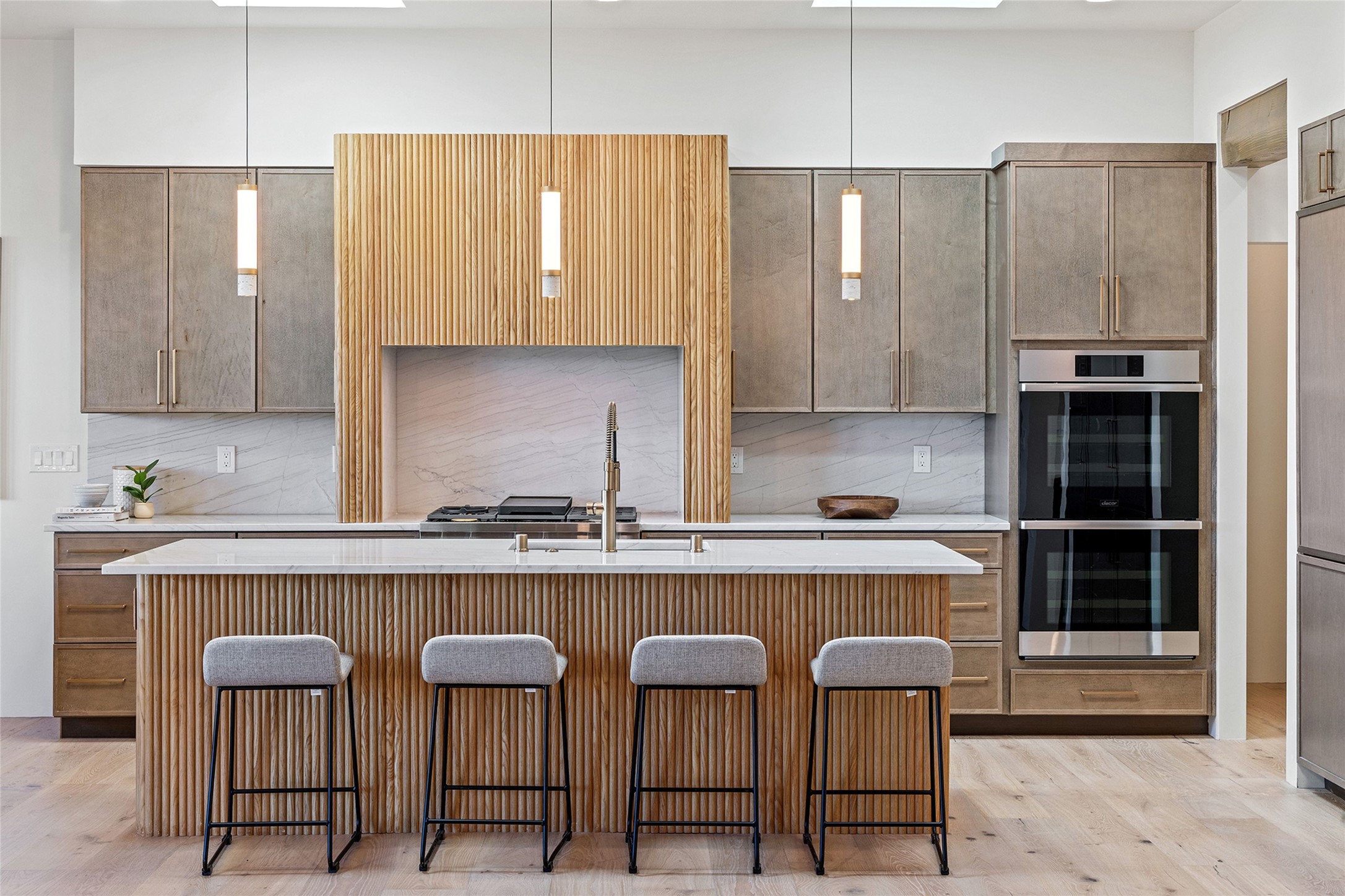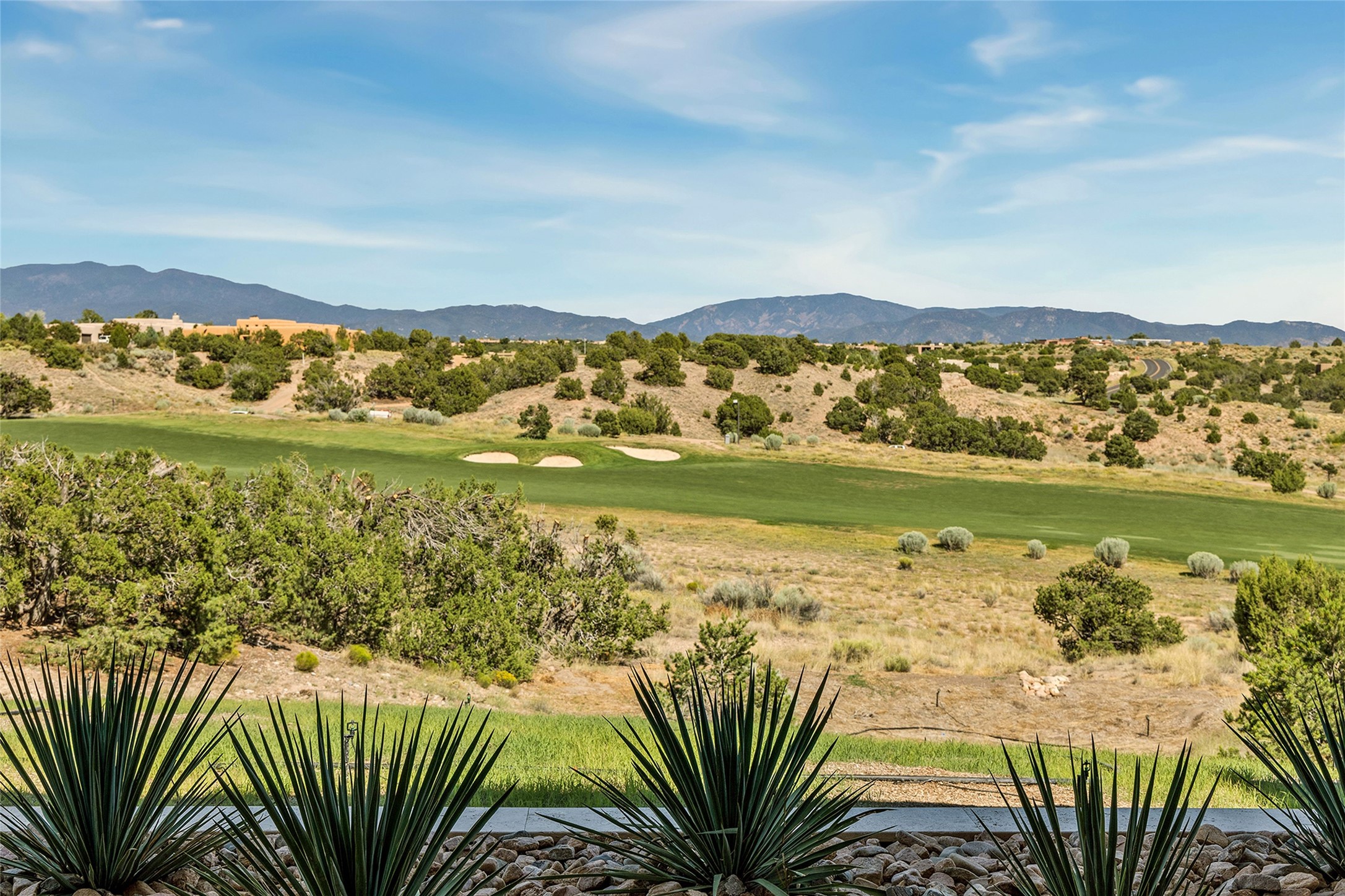 Welcome to 10 Calle Arbusto, an exceptional 2025-built custom contemporary masterpiece by the renowned builder, Clay Custom Homes. Recently completed and featured in the 2025 Haciendas Parade of Homes, this tranquil retreat is perched high above it all, offering breathtaking views of the 17th fairway at Sunset Golf Course and stunning Sangre de Cristo Mountain views. This rare offering showcases striking architecture paired with high-end designer finishes. Located within the famed community of Las Campanas, within close proximity to The Club at Las Campanas, (2) Jack Nicklaus golf courses, Spa, Swim, Tennis & Fitness Center, this home is designed to provide the ultimate indoor-outdoor living experience, ideal as a primary residence or a luxurious secondary retreat. The single-level, open-concept layout features a spacious living room with a wet bar and wine cooler, gas fireplace, sliding glass doors and a spacious dining area that seamlessly extends to outdoor living spaces, including a covered portal with an outdoor fireplace. The state-of-the-art island kitchen boasts expansive mountain and golf course views, rich cabinetry, tambour wood accents, a walk-in pantry, and top-of-the-line Dacor appliances and (2) dishwashers. The generously sized owner's suite delights with views, portal access and a spa-inspired bathroom with a glass walk-in shower, soaking tub, and a large walk-in closet. The separate guest wing includes two ensuite bedrooms and a versatile living room, perfect for accommodating guests, or a media room. Additional features include a private dedicated office, built-in BBQ/grilling station and outdoor kitchen, wood flooring, exotic stone countertops, abundant natural light, rich beam accents in the living room, and an oversized 2 car garage. This home exemplifies the pride and craftsmanship that embody the true Santa Fe lifestyle. Membership to The Club at Las Campanas is optional and by invitation only, though required to access all Club amenities.