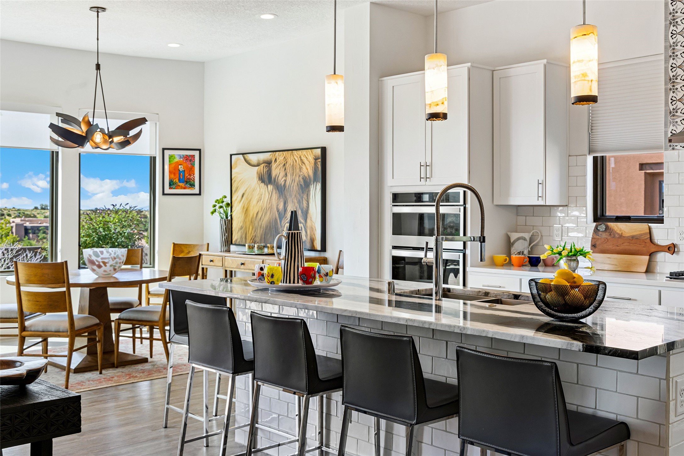 Experience the ultimate Las Campanas lifestyle with stunning golf course views and just a short walk to The Club at Las Campanas! Elevated above it all, this beautifully upgraded and custom-designed Santa Fe retreat offers four bedrooms and four bathrooms in a turnkey package, including all furnishings and artwork. Boasting exceptional golf course and sunset views, this exciting home seamlessly combines contemporary architecture with Santa Fe warmth. Sited on an elevated view lot, the residence welcomes you through a private, gated front courtyard featuring a tranquil fountain. Inside, the spacious, open-concept great room showcases breathtaking golf course views, a gas fireplace with stone accents, and a generous dining area. The newly updated chef's kitchen is a culinary dream, with natural stone countertops, an expansive island, a walk-in pantry, top-of-the-line appliances, and a casual dining space.The luxurious owner's suite offers a curved wall of windows framing the stunning views, along with a renovated en-suite bath featuring dual vanities, a soaking tub, walk-in shower, and a spacious walk-in closet. The separate guest wing provides three additional bedrooms for complete privacy from the main living areas.Step outside to an exceptional outdoor living space, one of the finest in Las Campanas, overlooking dual golf fairways and the newly opened Jemez Putting Course. Entertain effortlessly with a newly installed pizza oven, built-in BBQ grill, covered portal, and enclosed courtyard--perfect for pets and privacy.This defines excellence and offers an incredible and immediate opportunity to start enjoying the Santa Fe lifestyle. The owner's Equity Golf Membership to The Club at Las Campanas is also available for purchase separately.