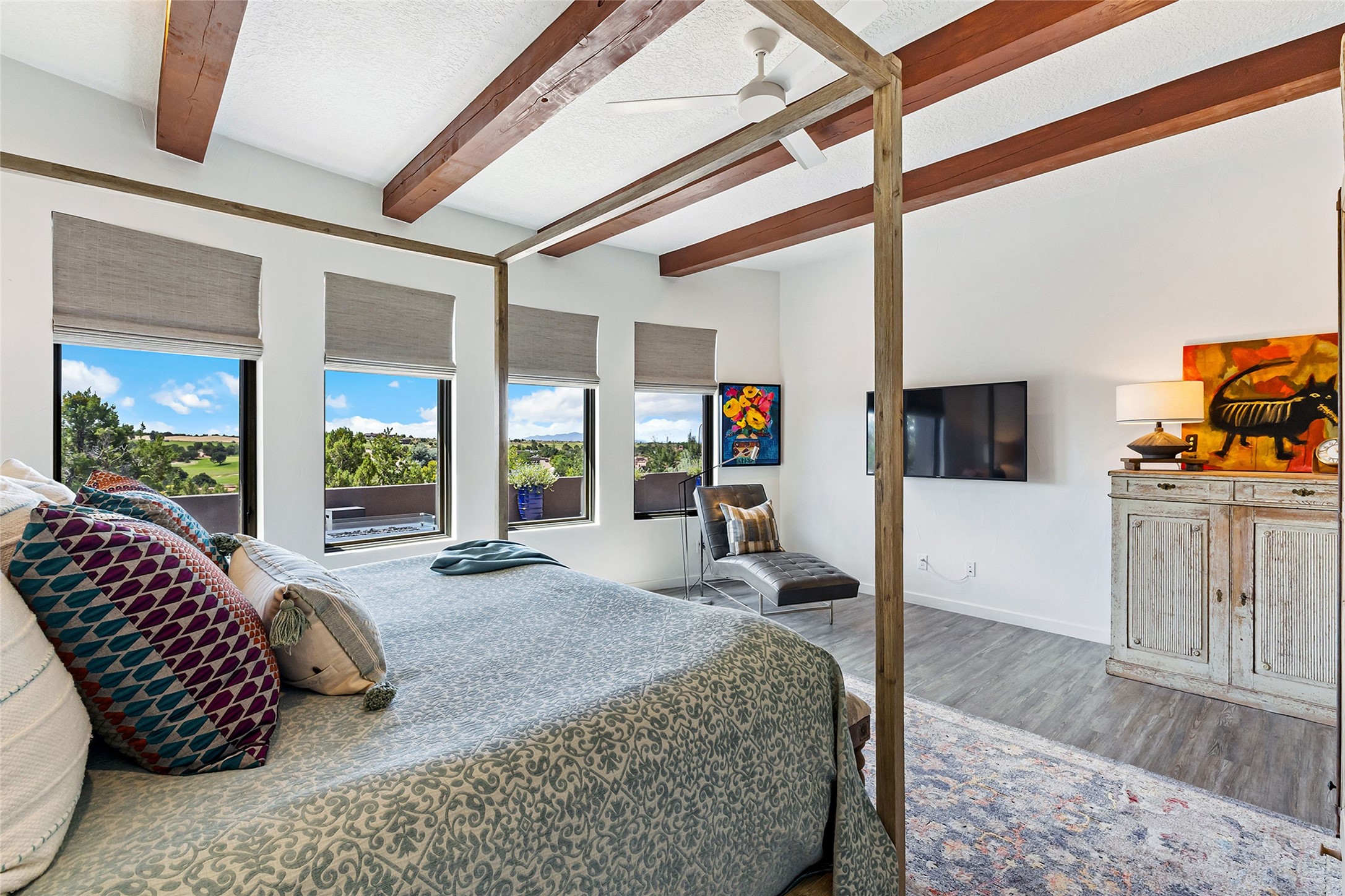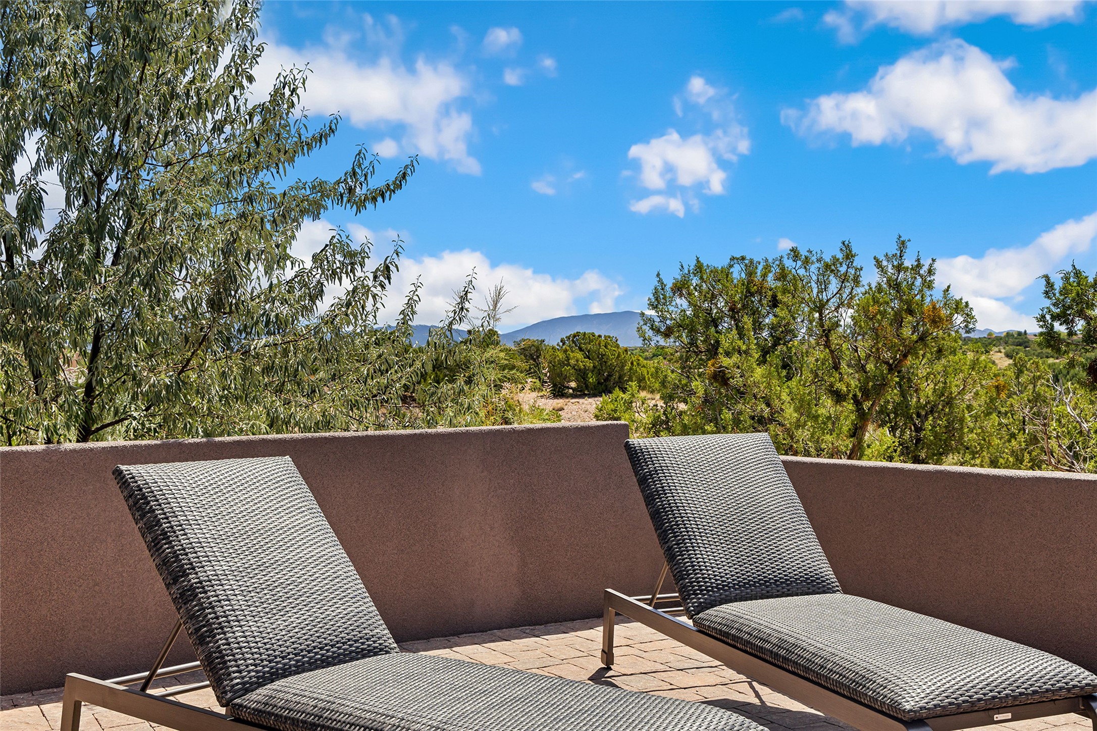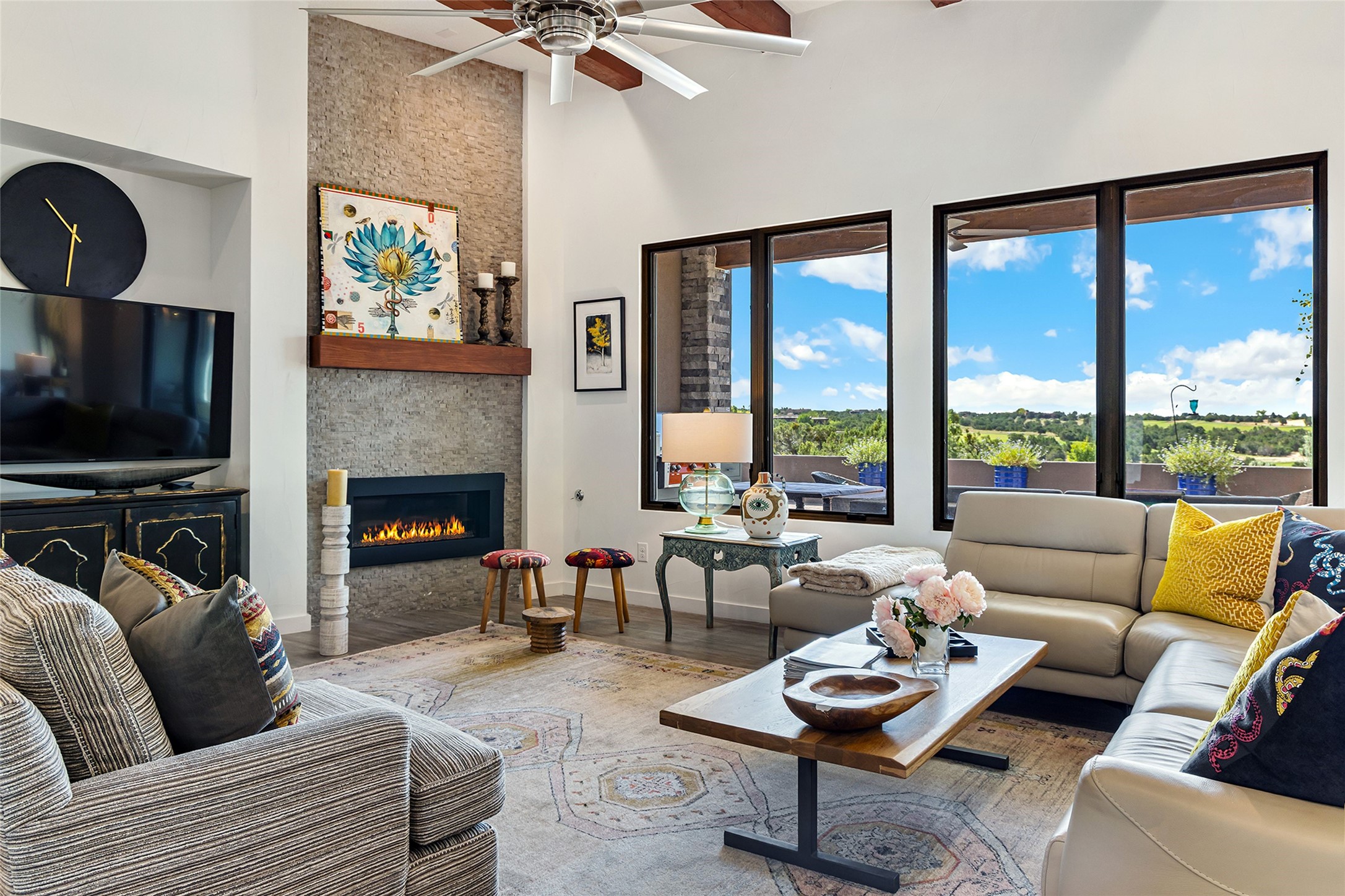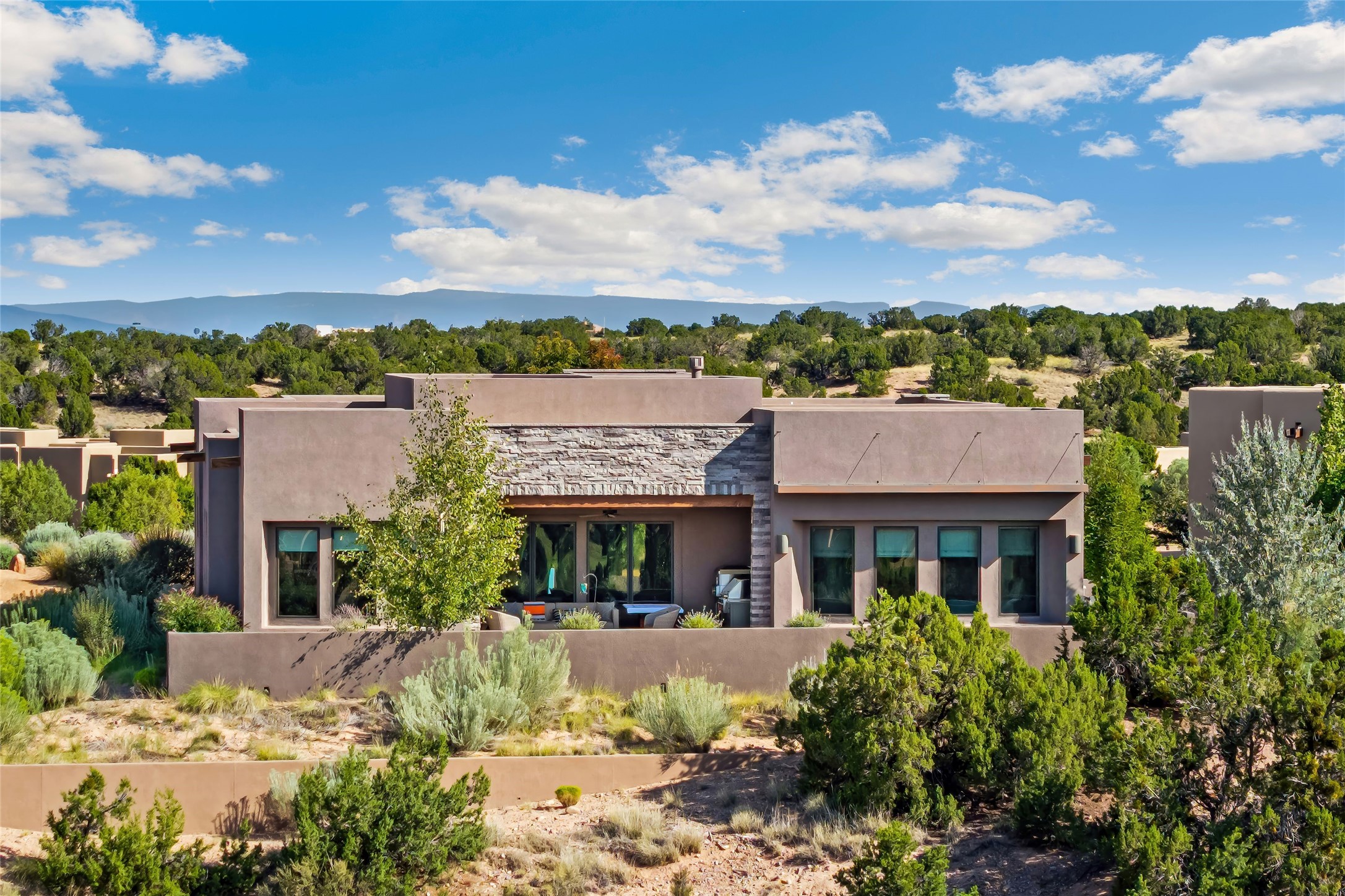 Experience the ultimate Las Campanas lifestyle with stunning golf course views and just a short walk to The Club at Las Campanas! Elevated above it all, this beautifully upgraded and custom-designed Santa Fe retreat offers four bedrooms and four bathrooms in a turnkey package, including all furnishings and artwork. Boasting exceptional golf course and sunset views, this exciting home seamlessly combines contemporary architecture with Santa Fe warmth. Sited on an elevated view lot, the residence welcomes you through a private, gated front courtyard featuring a tranquil fountain. Inside, the spacious, open-concept great room showcases breathtaking golf course views, a gas fireplace with stone accents, and a generous dining area. The newly updated chef's kitchen is a culinary dream, with natural stone countertops, an expansive island, a walk-in pantry, top-of-the-line appliances, and a casual dining space.The luxurious owner's suite offers a curved wall of windows framing the stunning views, along with a renovated en-suite bath featuring dual vanities, a soaking tub, walk-in shower, and a spacious walk-in closet. The separate guest wing provides three additional bedrooms for complete privacy from the main living areas.Step outside to an exceptional outdoor living space, one of the finest in Las Campanas, overlooking dual golf fairways and the newly opened Jemez Putting Course. Entertain effortlessly with a newly installed pizza oven, built-in BBQ grill, covered portal, and enclosed courtyard--perfect for pets and privacy.This defines excellence and offers an incredible and immediate opportunity to start enjoying the Santa Fe lifestyle. The owner's Equity Golf Membership to The Club at Las Campanas is also available for purchase separately.