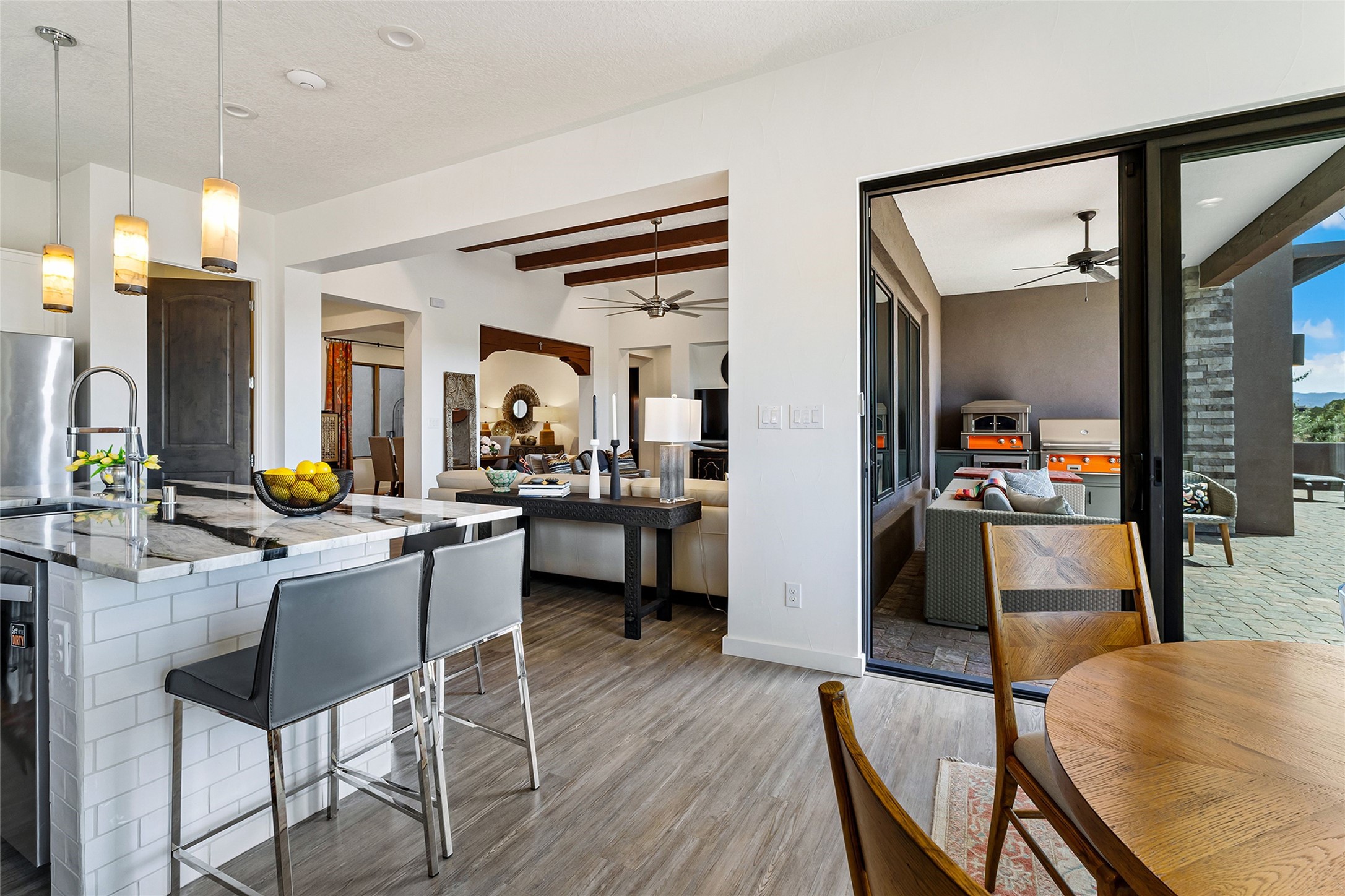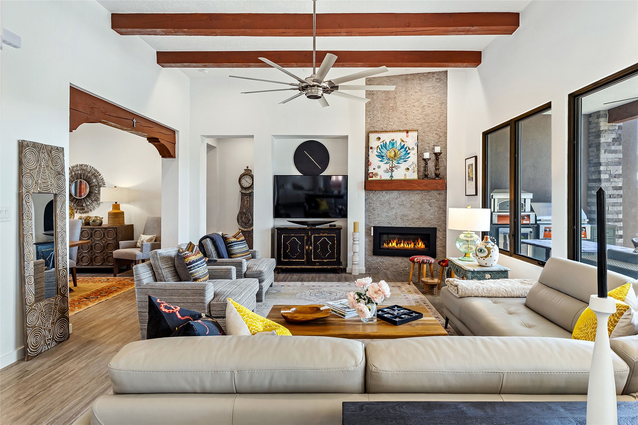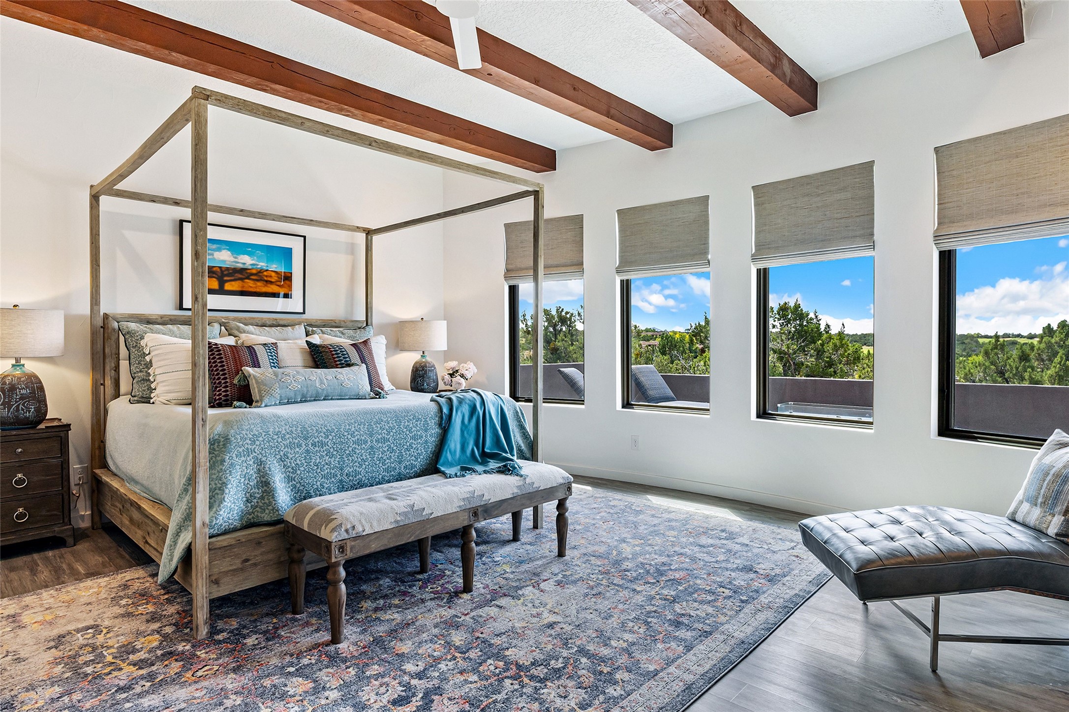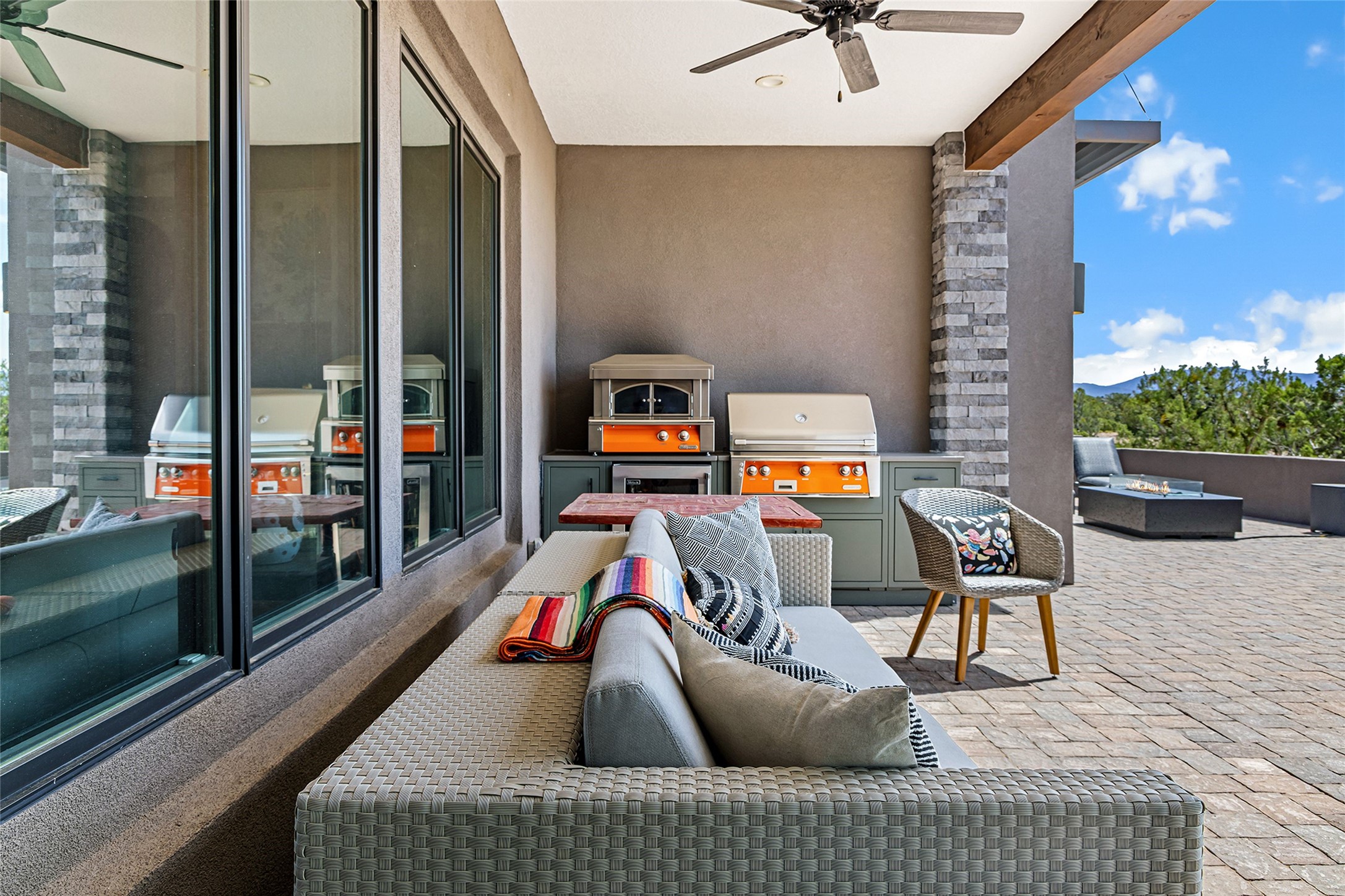 Experience the ultimate Las Campanas lifestyle with stunning golf course views and just a short walk to The Club at Las Campanas! Elevated above it all, this beautifully upgraded and custom-designed Santa Fe retreat offers four bedrooms and four bathrooms in a turnkey package, including all furnishings and artwork. Boasting exceptional golf course and sunset views, this exciting home seamlessly combines contemporary architecture with Santa Fe warmth. Sited on an elevated view lot, the residence welcomes you through a private, gated front courtyard featuring a tranquil fountain. Inside, the spacious, open-concept great room showcases breathtaking golf course views, a gas fireplace with stone accents, and a generous dining area. The newly updated chef's kitchen is a culinary dream, with natural stone countertops, an expansive island, a walk-in pantry, top-of-the-line appliances, and a casual dining space.The luxurious owner's suite offers a curved wall of windows framing the stunning views, along with a renovated en-suite bath featuring dual vanities, a soaking tub, walk-in shower, and a spacious walk-in closet. The separate guest wing provides three additional bedrooms for complete privacy from the main living areas.Step outside to an exceptional outdoor living space, one of the finest in Las Campanas, overlooking dual golf fairways and the newly opened Jemez Putting Course. Entertain effortlessly with a newly installed pizza oven, built-in BBQ grill, covered portal, and enclosed courtyard--perfect for pets and privacy.This defines excellence and offers an incredible and immediate opportunity to start enjoying the Santa Fe lifestyle. The owner's Equity Golf Membership to The Club at Las Campanas is also available for purchase separately.