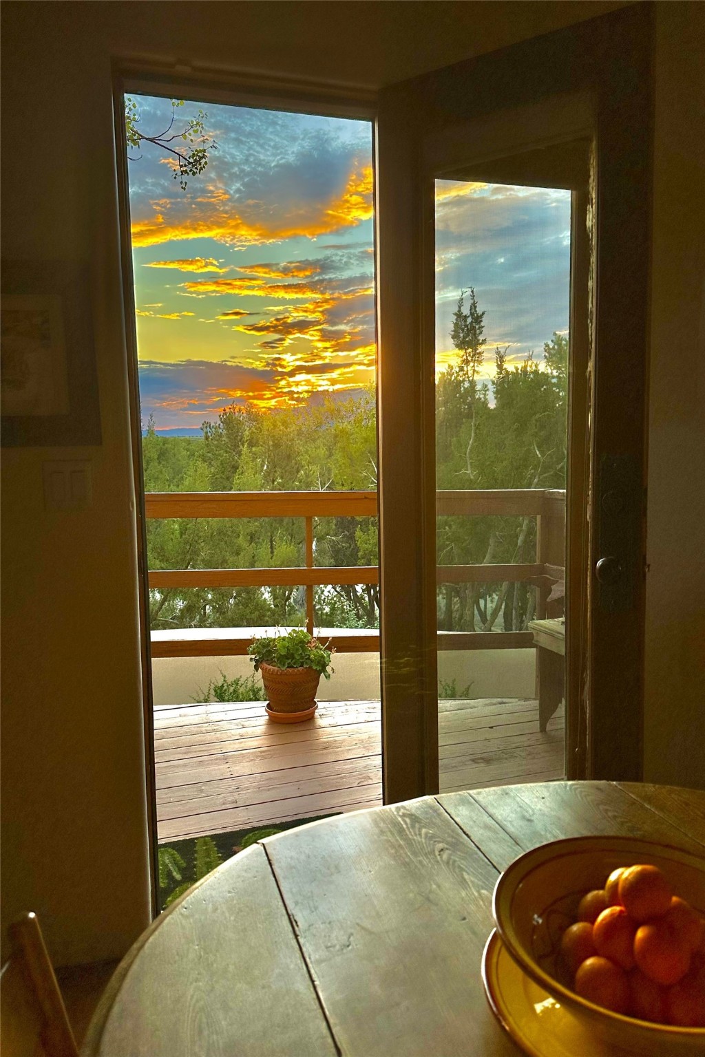 This handsome traditional residence is graced with enchanting and abundant architectural elements, including soaring ceilings, vigas, latillas, exceptional tilework, and arched doorways, as well as breathtaking sunsets and stunning mountain views. Warmth and elegance are hallmarks of this beautiful property, just five minutes from the Santa Fe Plaza. On over an acre on the coveted north side, the impressive size of the rooms is superb for both entertaining and private luxurious enjoyment. Abundant outdoor areas, accessible from several rooms, are embraced by handsome coyote and post-fencing, and stunning evergreens. Delightful alfresco and entertaining options include a dining portal, a grill area, and flagstone terraces. The flexible floor plan, with two kitchens, living and dining areas, is ideal for multi-generational living, or as a single residence with fabulous guest wing. There are two oversized principal suites, one with sweeping mountain views. The generous family room has a lovely fireplace, custom cabinetry, and French doors to a private terrace. The impressive dining room with an adjacent buffet area, is marvelous for gatherings with friends and family. There is also a beautiful library/music room that easily accommodates a grand piano - an extraordinary offering.