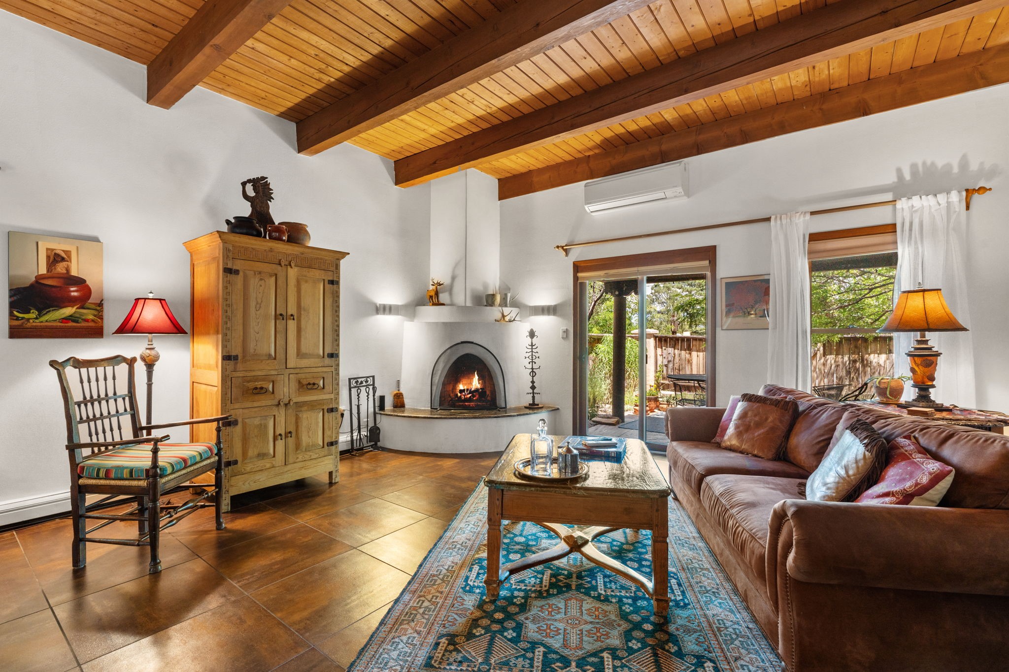 Tucked into a quiet, private cul-de-sac in the sought-after Park Plazas community, this beautifully updated 1,806 sq. ft. home offers the perfect blend of Santa Fe charm and modern comfort. With 2 spacious bedrooms, plus a versatile library or office featuring exquisite built-in bookshelves, this home provides both elegance and flexibility.Step inside to find 2-foot by 2-foot tile floors flowing throughout, enhancing the clean lines and warm ambiance of the interior. The inviting living and dining area boasts a high beamed ceiling over rich tongue-and-groove wood, anchored by a stunning corner Kiva fireplace -- the ideal spot to gather on crisp Santa Fe evenings. Sliding doors open to a covered portal and a flagstone patio that overlooks lush landscaping lovingly designed by the seller, a Master Gardener, creating a tranquil outdoor sanctuary.The kitchen is a chef's delight, thoughtfully renovated with sleek granite countertops, stainless steel appliances, and abundant cabinetry. Just off the kitchen, a charming breakfast nook/sunroom is bathed in natural light from three sides -- perfect for morning coffee or an afternoon read.Additional highlights include a two-year-old boiler and water heater, a recently installed mini-split A/C (1 year old), and a newer garage door with updated motor. The private entry courtyard is beautifully landscaped, setting a peaceful tone before you even step inside.The home also includes a 2-car garage and access to the exceptional amenities of Park Plazas: tennis courts, miles of walking trails, an off-leash dog park, community garden, and more -- all just 15 minutes from the heart of Santa Fe.This is more than a home -- it's a lifestyle. Come experience the comfort, beauty, and serenity this special property offers.