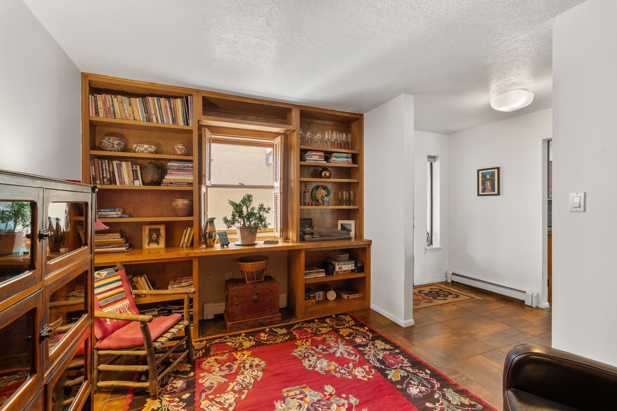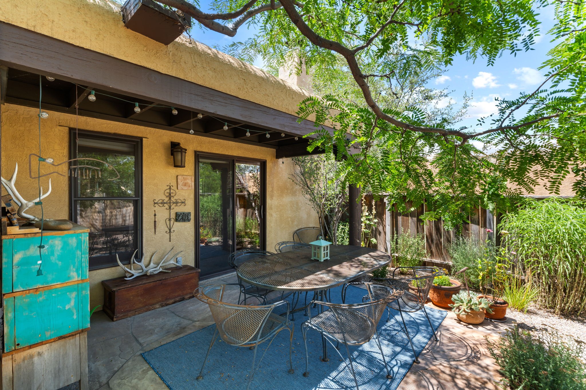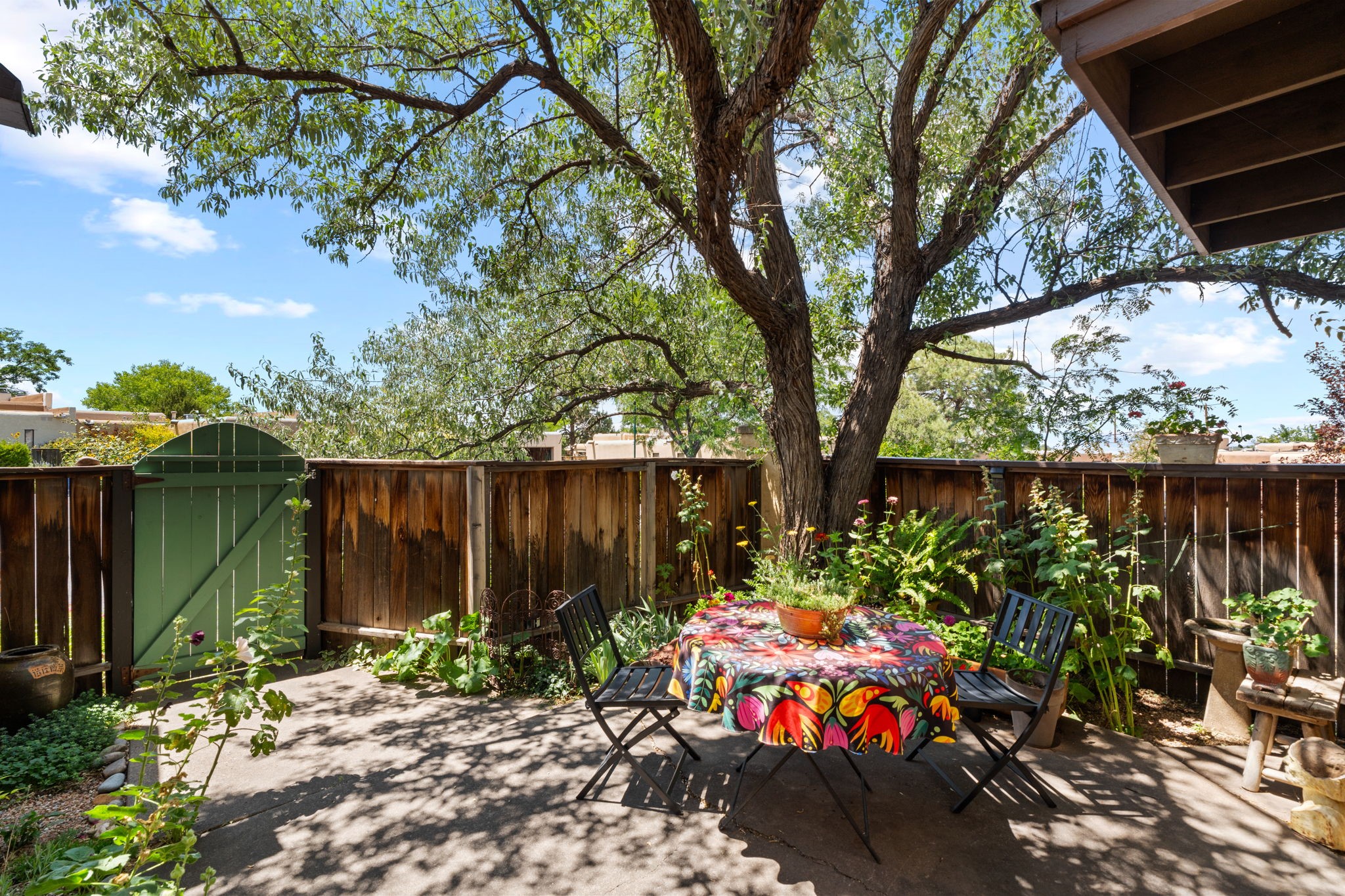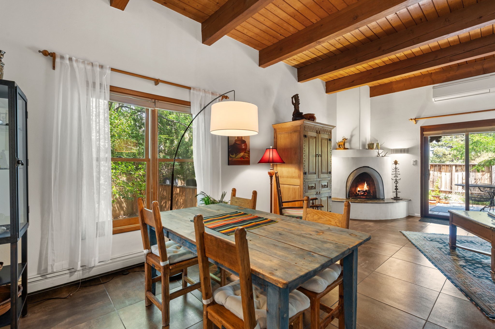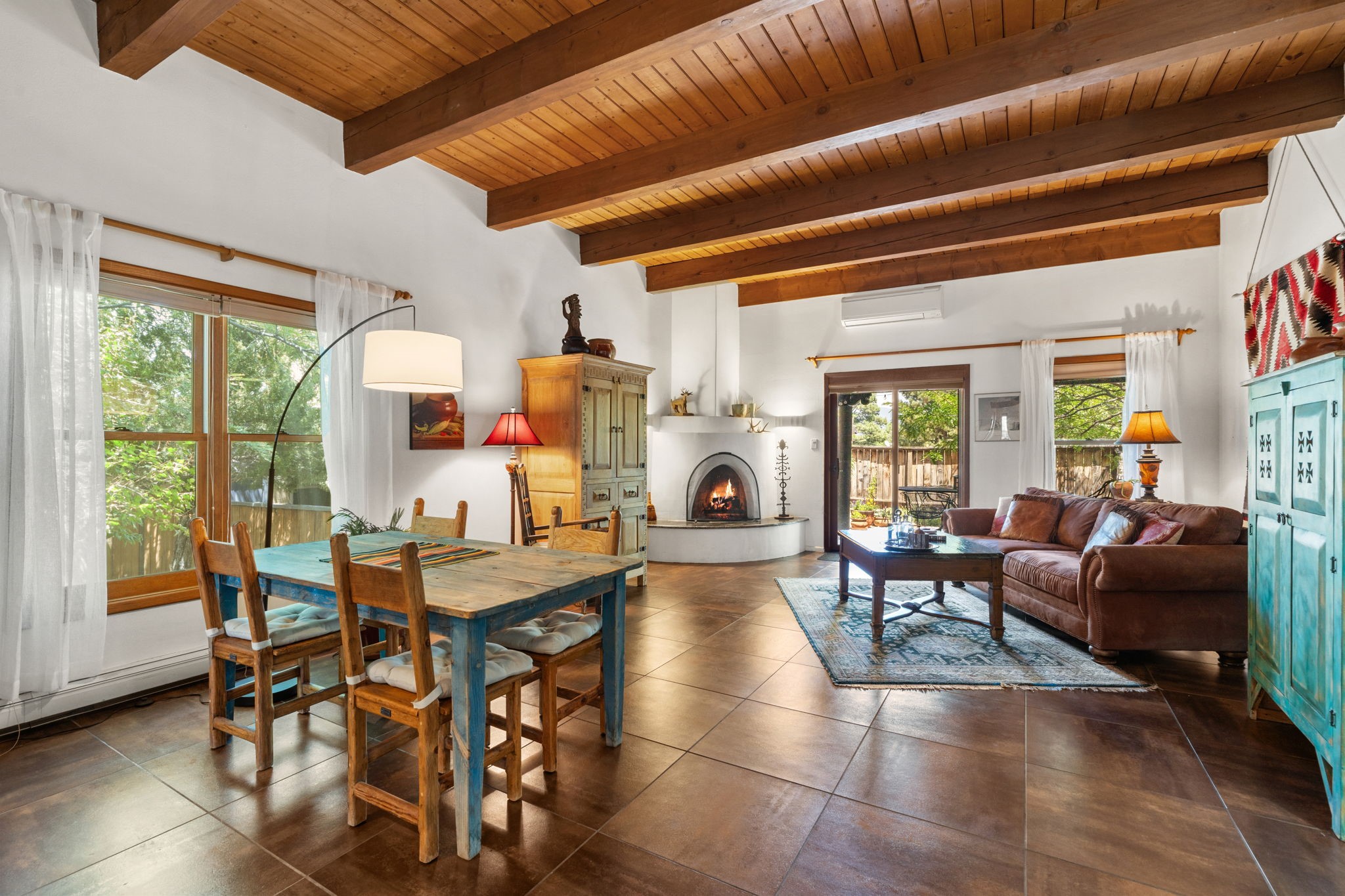 Tucked into a quiet, private cul-de-sac in the sought-after Park Plazas community, this beautifully updated 1,806 sq. ft. home offers the perfect blend of Santa Fe charm and modern comfort. With 2 spacious bedrooms, plus a versatile library or office featuring exquisite built-in bookshelves, this home provides both elegance and flexibility.Step inside to find 2-foot by 2-foot tile floors flowing throughout, enhancing the clean lines and warm ambiance of the interior. The inviting living and dining area boasts a high beamed ceiling over rich tongue-and-groove wood, anchored by a stunning corner Kiva fireplace -- the ideal spot to gather on crisp Santa Fe evenings. Sliding doors open to a covered portal and a flagstone patio that overlooks lush landscaping lovingly designed by the seller, a Master Gardener, creating a tranquil outdoor sanctuary.The kitchen is a chef's delight, thoughtfully renovated with sleek granite countertops, stainless steel appliances, and abundant cabinetry. Just off the kitchen, a charming breakfast nook/sunroom is bathed in natural light from three sides -- perfect for morning coffee or an afternoon read.Additional highlights include a two-year-old boiler and water heater, a recently installed mini-split A/C (1 year old), and a newer garage door with updated motor. The private entry courtyard is beautifully landscaped, setting a peaceful tone before you even step inside.The home also includes a 2-car garage and access to the exceptional amenities of Park Plazas: tennis courts, miles of walking trails, an off-leash dog park, community garden, and more -- all just 15 minutes from the heart of Santa Fe.This is more than a home -- it's a lifestyle. Come experience the comfort, beauty, and serenity this special property offers.