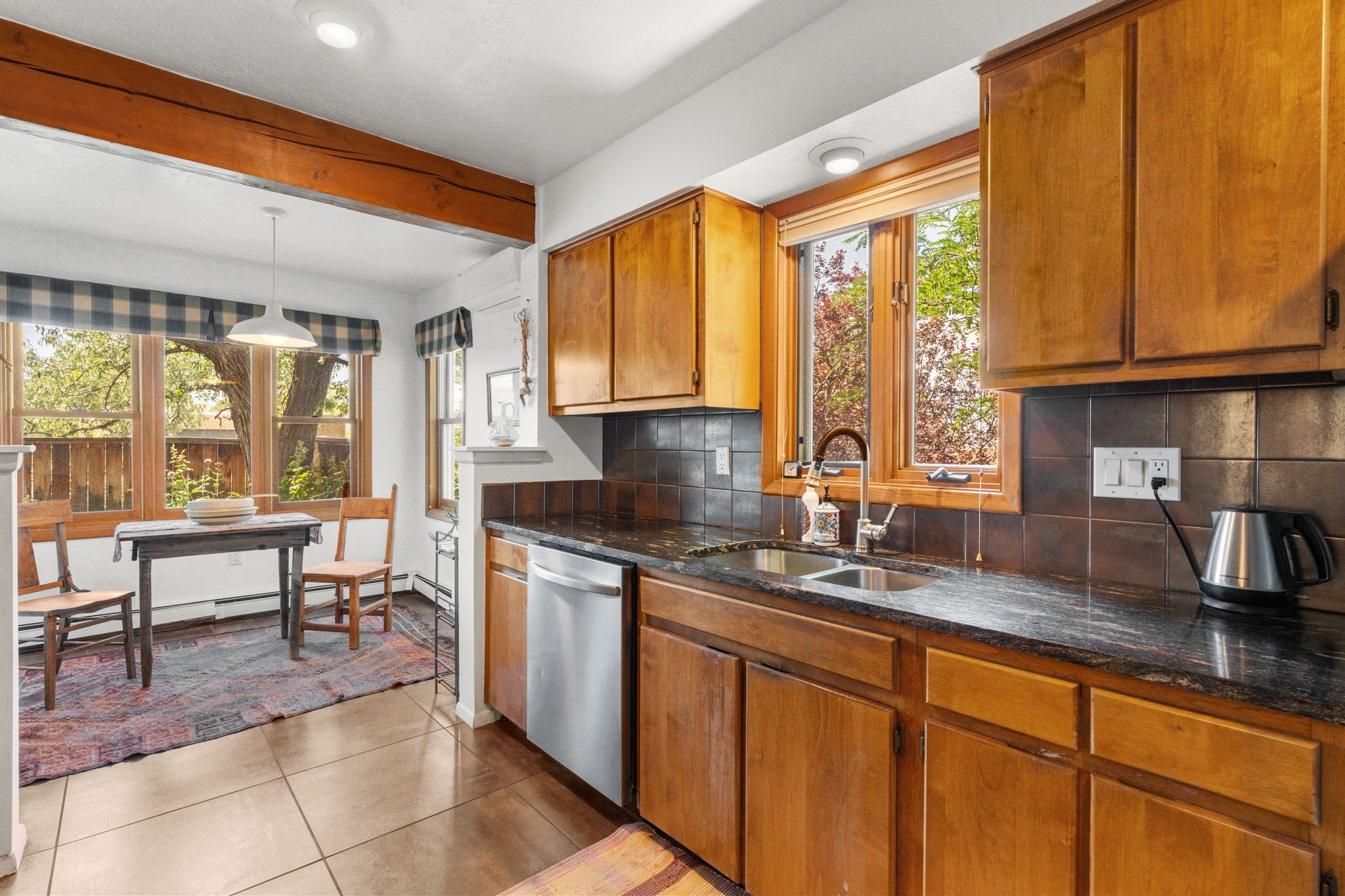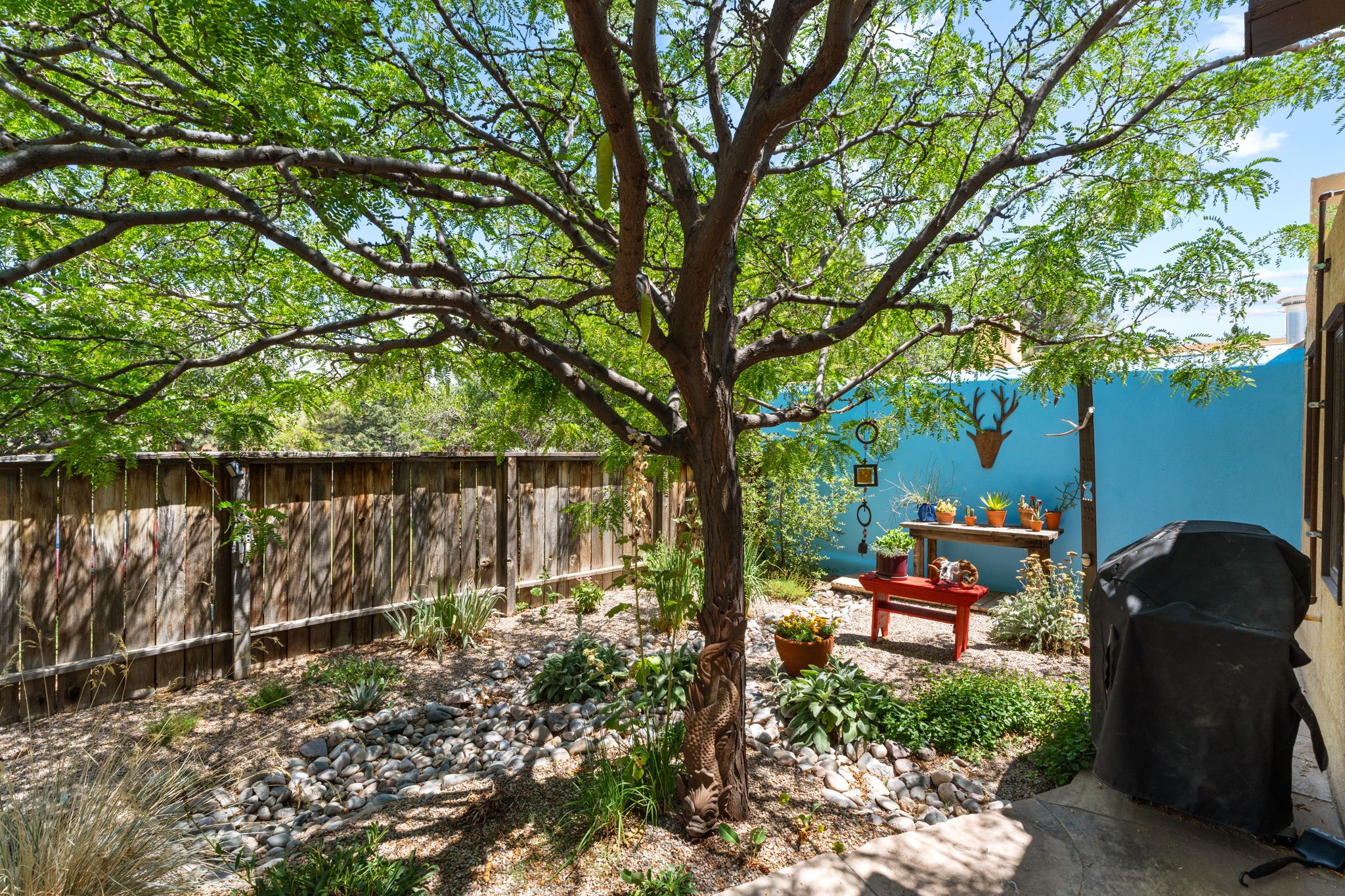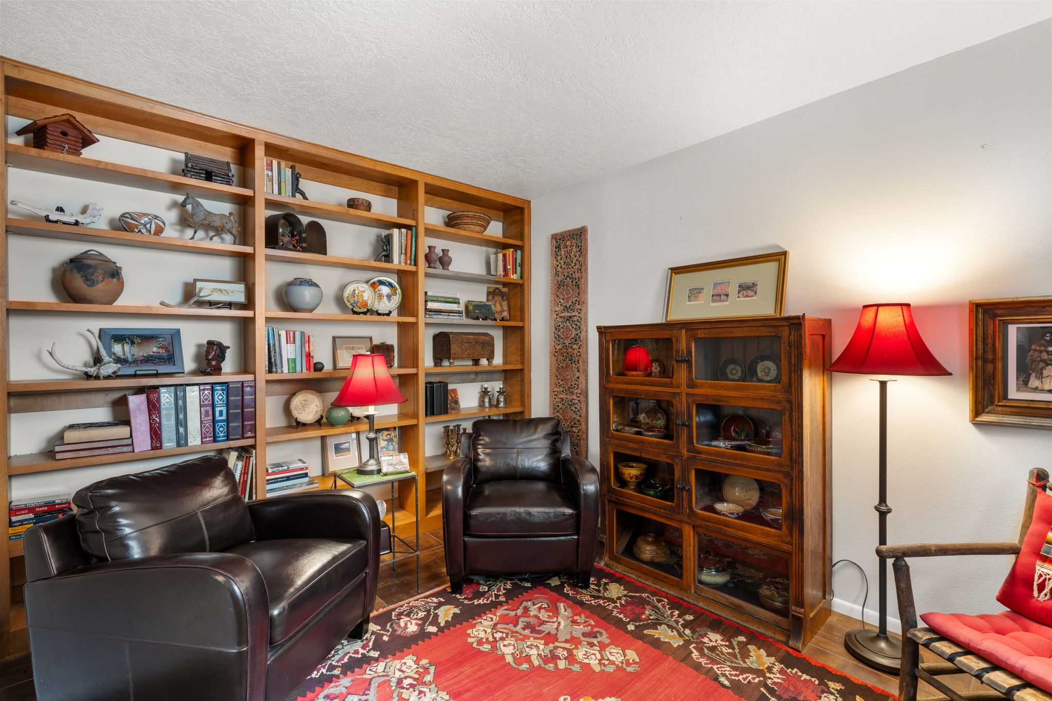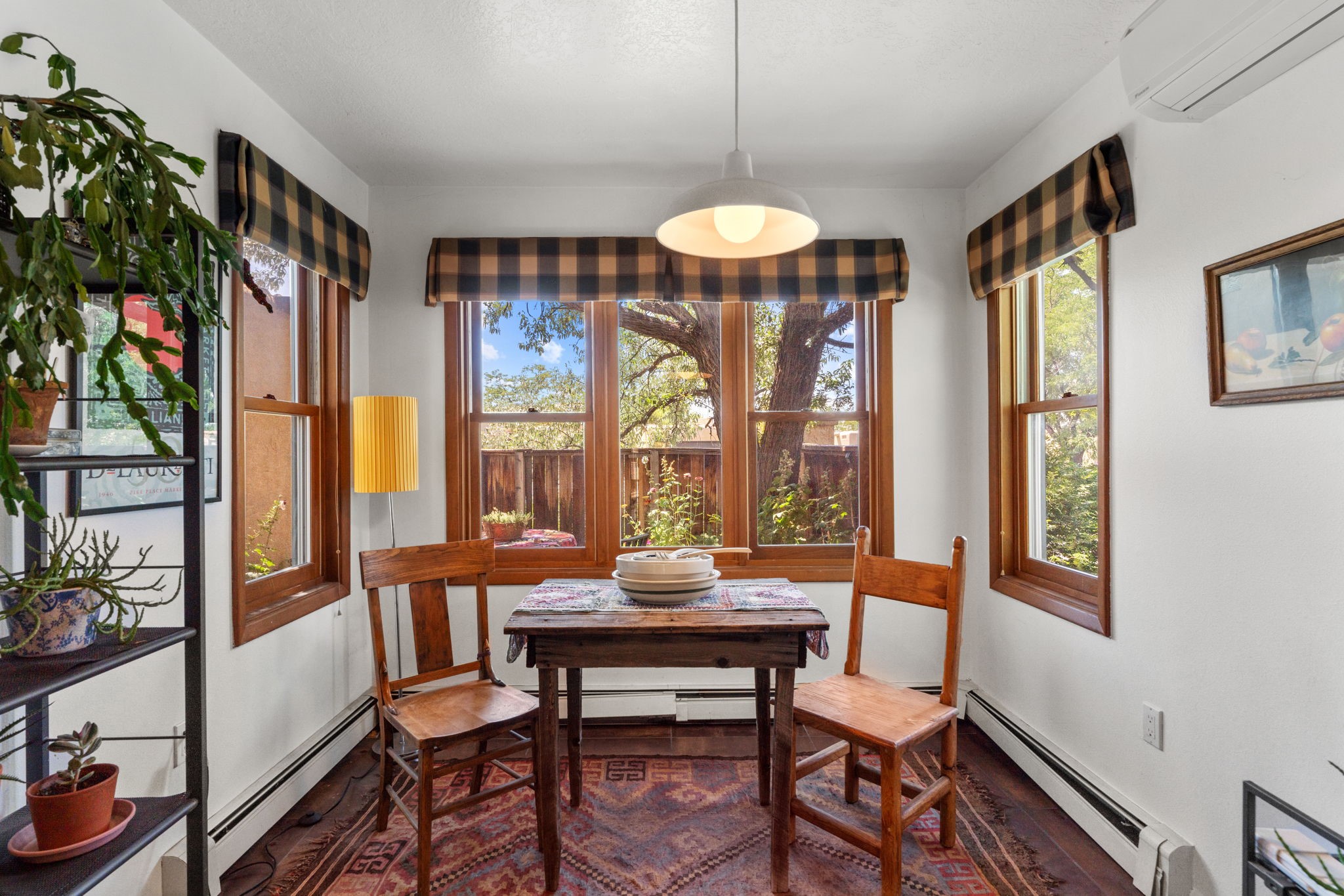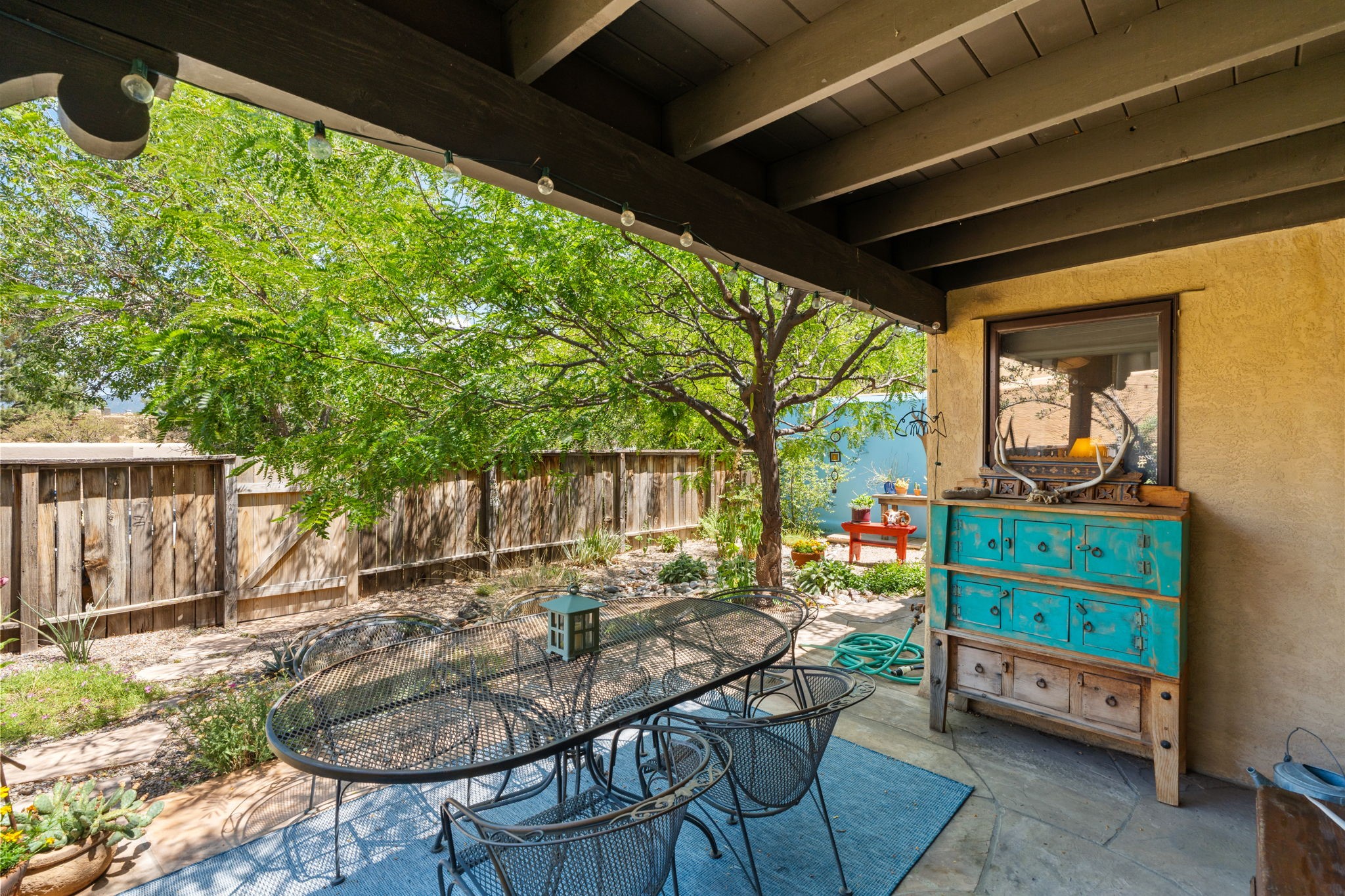 Tucked into a quiet, private cul-de-sac in the sought-after Park Plazas community, this beautifully updated 1,806 sq. ft. home offers the perfect blend of Santa Fe charm and modern comfort. With 2 spacious bedrooms, plus a versatile library or office featuring exquisite built-in bookshelves, this home provides both elegance and flexibility.Step inside to find 2-foot by 2-foot tile floors flowing throughout, enhancing the clean lines and warm ambiance of the interior. The inviting living and dining area boasts a high beamed ceiling over rich tongue-and-groove wood, anchored by a stunning corner Kiva fireplace -- the ideal spot to gather on crisp Santa Fe evenings. Sliding doors open to a covered portal and a flagstone patio that overlooks lush landscaping lovingly designed by the seller, a Master Gardener, creating a tranquil outdoor sanctuary.The kitchen is a chef's delight, thoughtfully renovated with sleek granite countertops, stainless steel appliances, and abundant cabinetry. Just off the kitchen, a charming breakfast nook/sunroom is bathed in natural light from three sides -- perfect for morning coffee or an afternoon read.Additional highlights include a two-year-old boiler and water heater, a recently installed mini-split A/C (1 year old), and a newer garage door with updated motor. The private entry courtyard is beautifully landscaped, setting a peaceful tone before you even step inside.The home also includes a 2-car garage and access to the exceptional amenities of Park Plazas: tennis courts, miles of walking trails, an off-leash dog park, community garden, and more -- all just 15 minutes from the heart of Santa Fe.This is more than a home -- it's a lifestyle. Come experience the comfort, beauty, and serenity this special property offers.