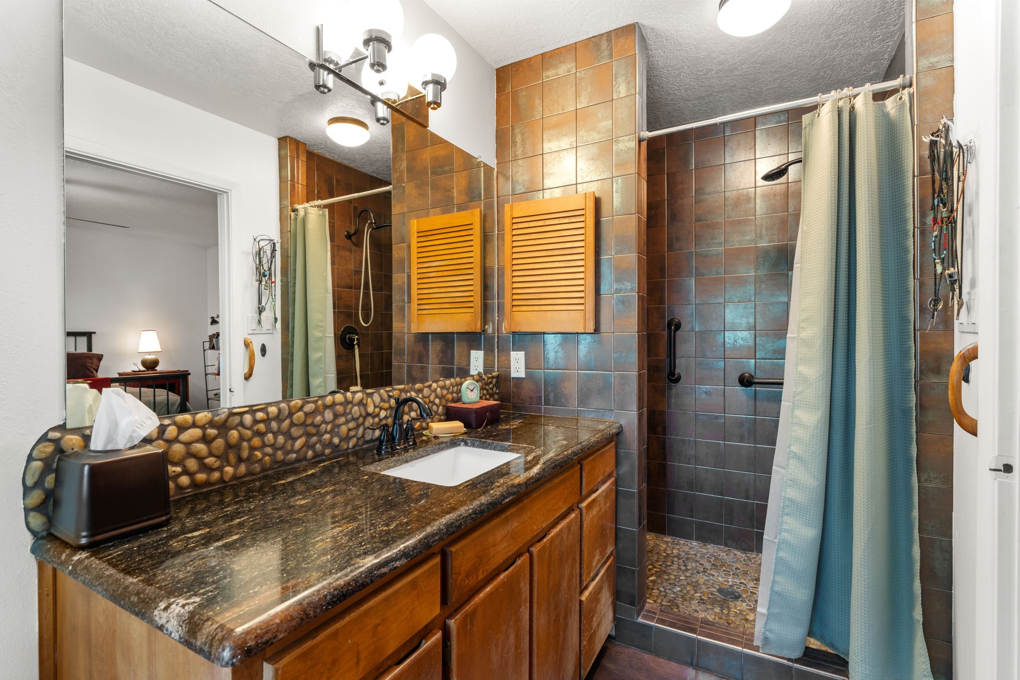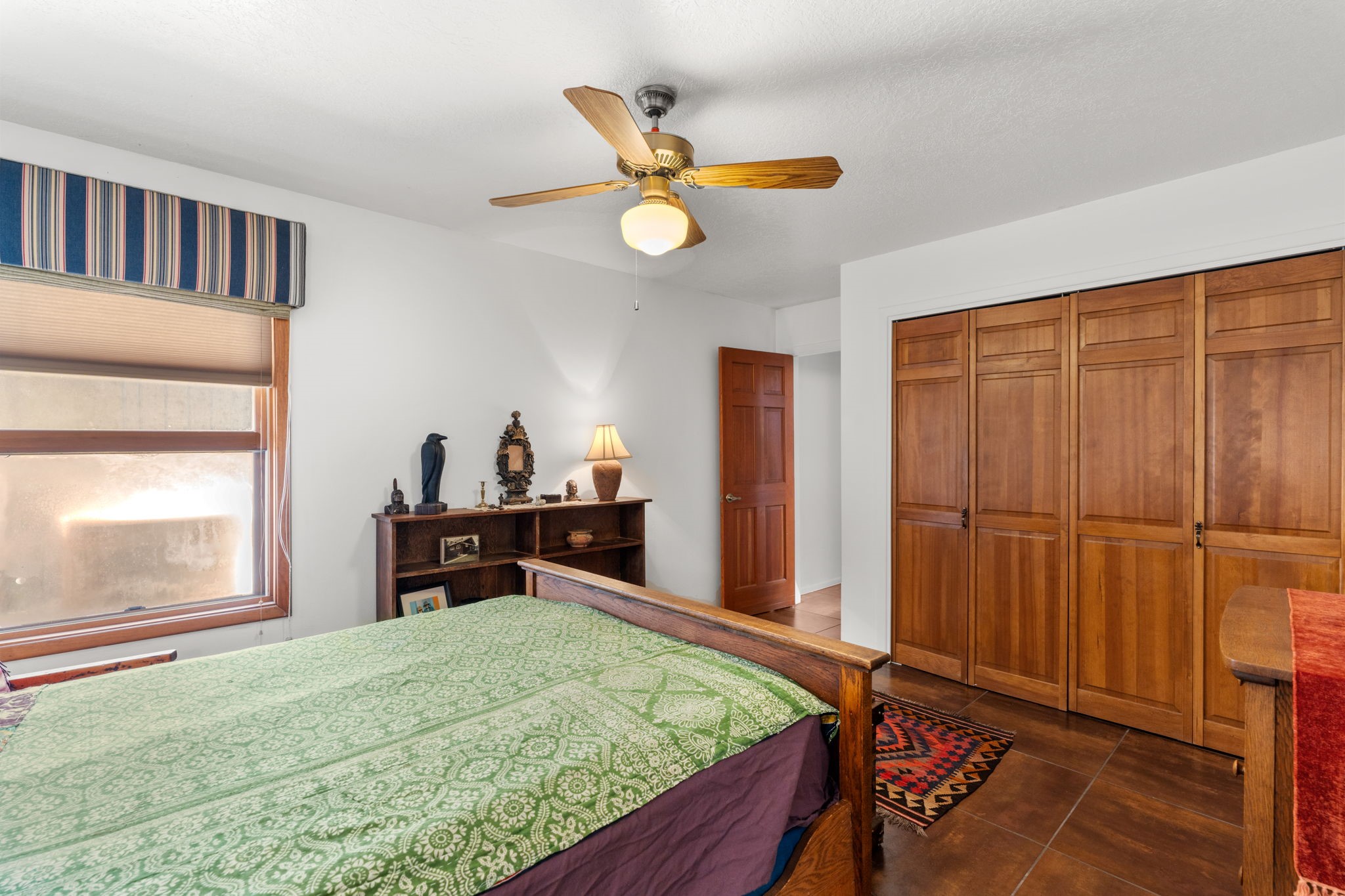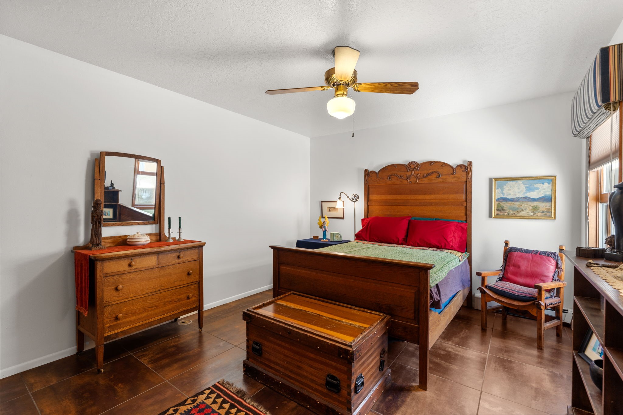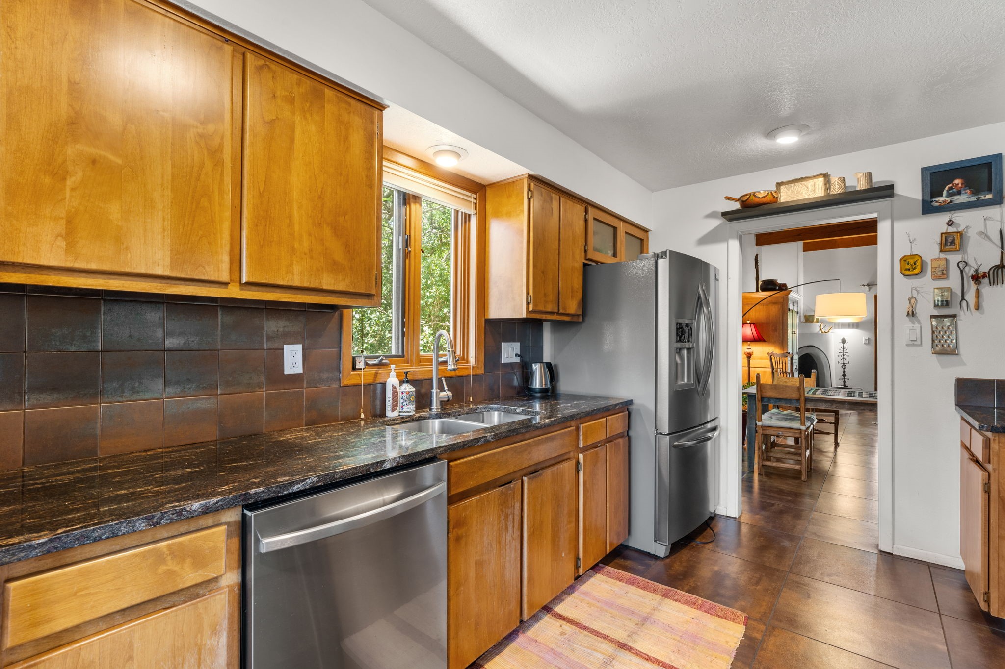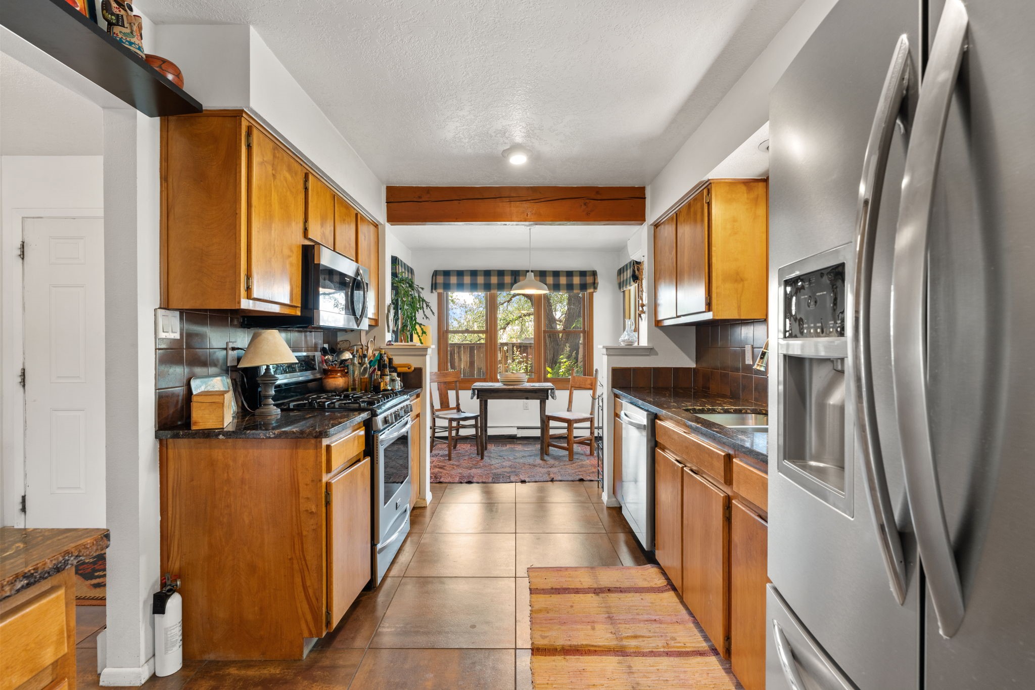 Tucked into a quiet, private cul-de-sac in the sought-after Park Plazas community, this beautifully updated 1,806 sq. ft. home offers the perfect blend of Santa Fe charm and modern comfort. With 2 spacious bedrooms, plus a versatile library or office featuring exquisite built-in bookshelves, this home provides both elegance and flexibility.Step inside to find 2-foot by 2-foot tile floors flowing throughout, enhancing the clean lines and warm ambiance of the interior. The inviting living and dining area boasts a high beamed ceiling over rich tongue-and-groove wood, anchored by a stunning corner Kiva fireplace -- the ideal spot to gather on crisp Santa Fe evenings. Sliding doors open to a covered portal and a flagstone patio that overlooks lush landscaping lovingly designed by the seller, a Master Gardener, creating a tranquil outdoor sanctuary.The kitchen is a chef's delight, thoughtfully renovated with sleek granite countertops, stainless steel appliances, and abundant cabinetry. Just off the kitchen, a charming breakfast nook/sunroom is bathed in natural light from three sides -- perfect for morning coffee or an afternoon read.Additional highlights include a two-year-old boiler and water heater, a recently installed mini-split A/C (1 year old), and a newer garage door with updated motor. The private entry courtyard is beautifully landscaped, setting a peaceful tone before you even step inside.The home also includes a 2-car garage and access to the exceptional amenities of Park Plazas: tennis courts, miles of walking trails, an off-leash dog park, community garden, and more -- all just 15 minutes from the heart of Santa Fe.This is more than a home -- it's a lifestyle. Come experience the comfort, beauty, and serenity this special property offers.