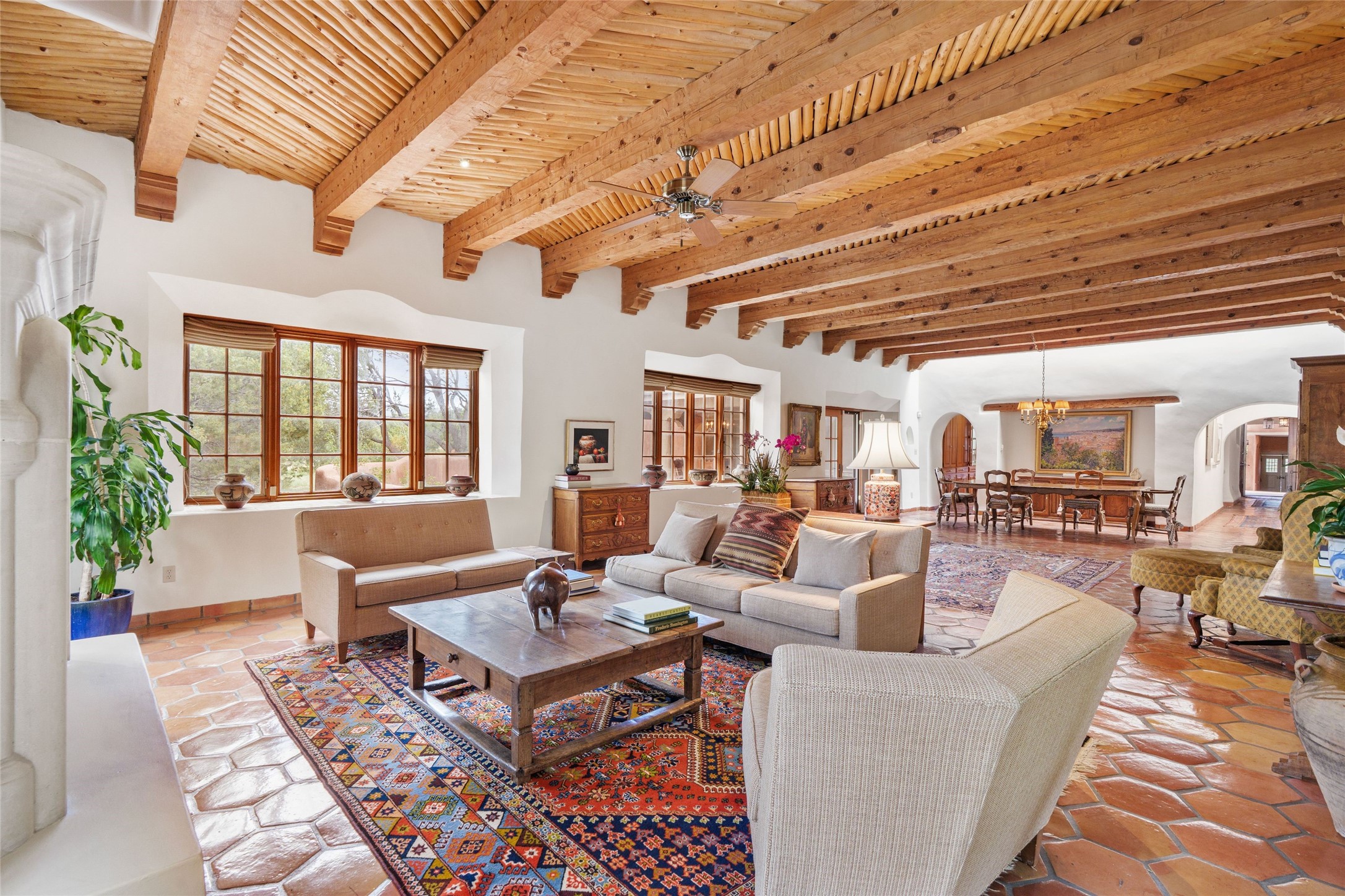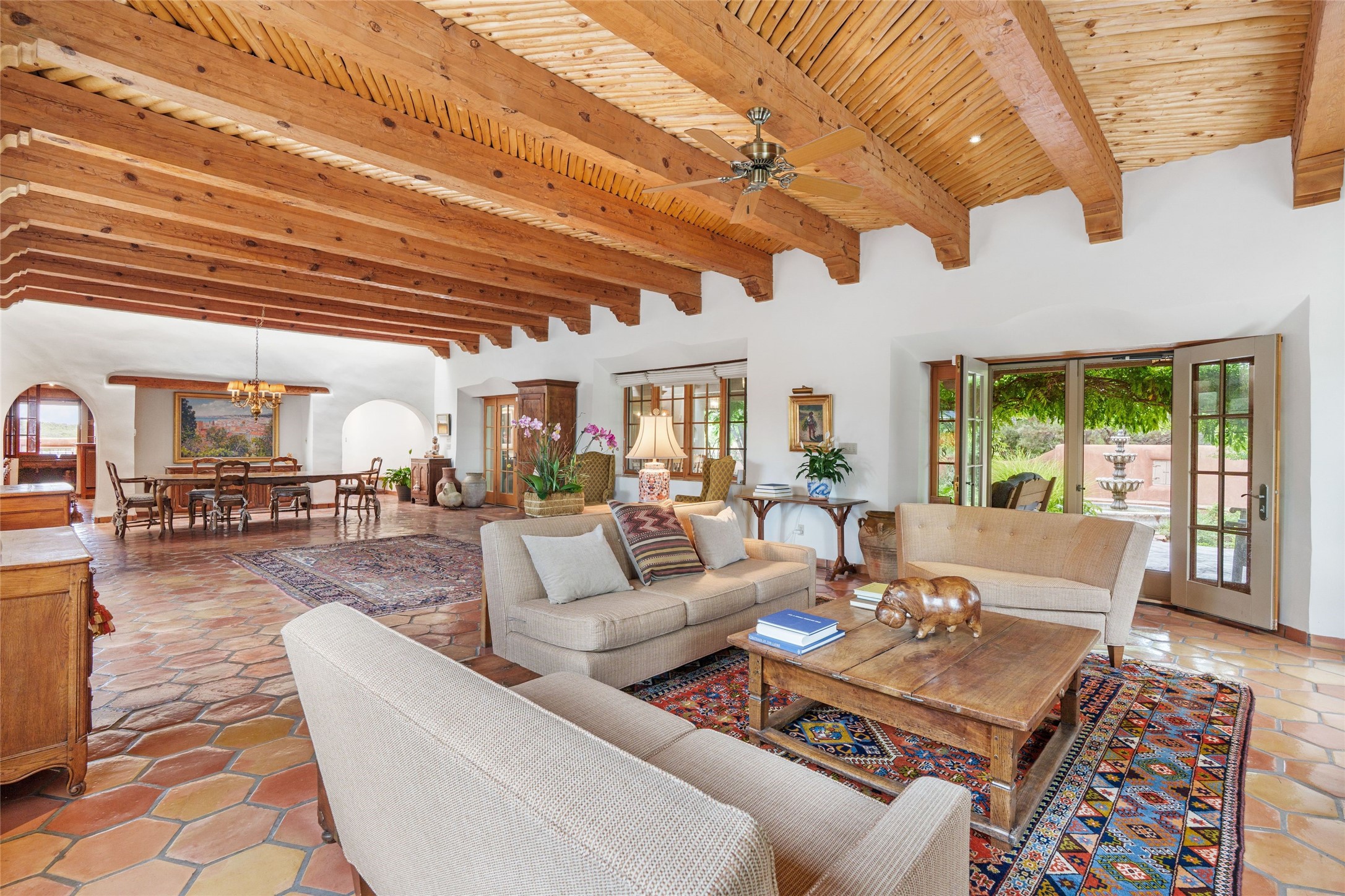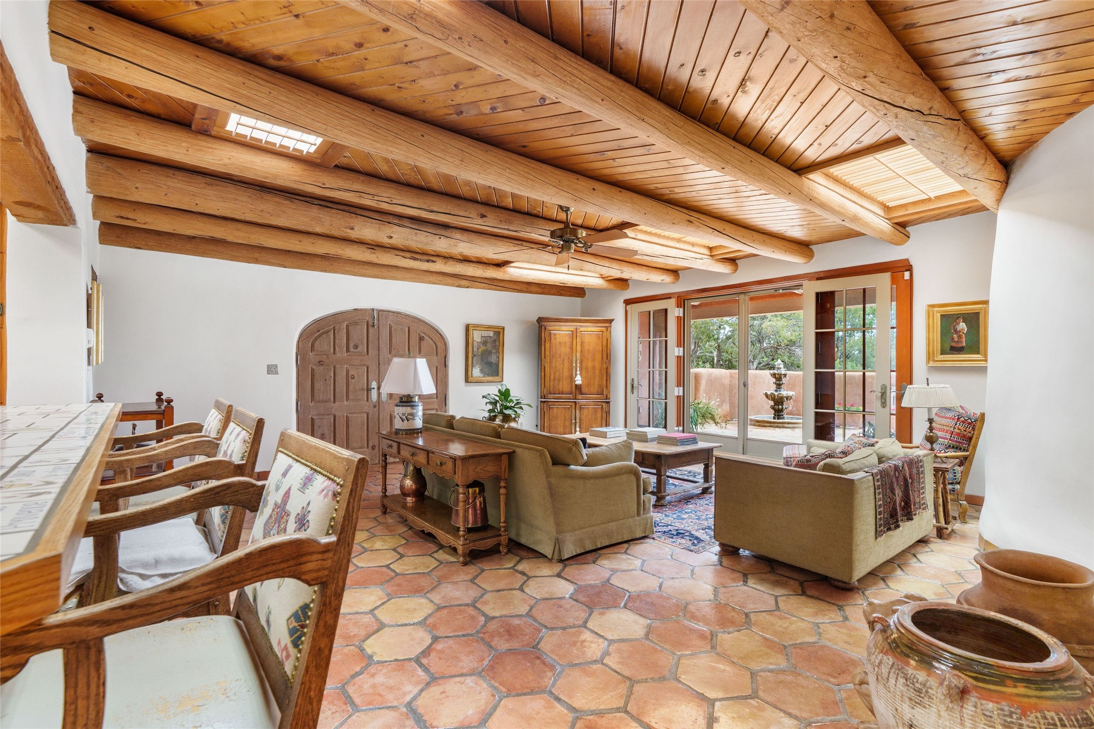 One doesn't simply just buy a Buzz Bainbridge property; one acquires an iconic aesthetic, a lifestyle, an environment of luxurious beauty to live in among his signature Santa Fe features: genuine handmade Adobe walls, some 30" thick; large open room spaces with gorgeous wraparound views and gorgeously embellished high ceilings, wonderful finishes with vigas and latillas and nichos, and kivas, and all the creature comforts of happy living. The intelligent floor plan opens onto gorgeous courtyards, portals, patios, and gardens abounding with high old trees, fountains, and established perennial flowers that embrace the property on the sprawling 7.5 acres. There is even a nurturing, part subterranean greenhouse for year-round blooms and vegetation. The double Adobe main house has three bedrooms, each with its own bath, each with a fireplace, while up the driveway sit the lovely two-bedroom guest house... privately separate, but close enough to borrow a cup of sugar! An additional art studio by the guesthouse with bathroom and fireplace can be an art space or a third bedroom on the guesthouse. There is no HOA to instruct you! The elegant location on prestigious Calle San Martin is 8 minutes to De Vargas mall and 10 to the airport! Yet you feel like you are unwinding in the country! Already pre-inspected with imperfections cured. This is opportunity knocking...!
