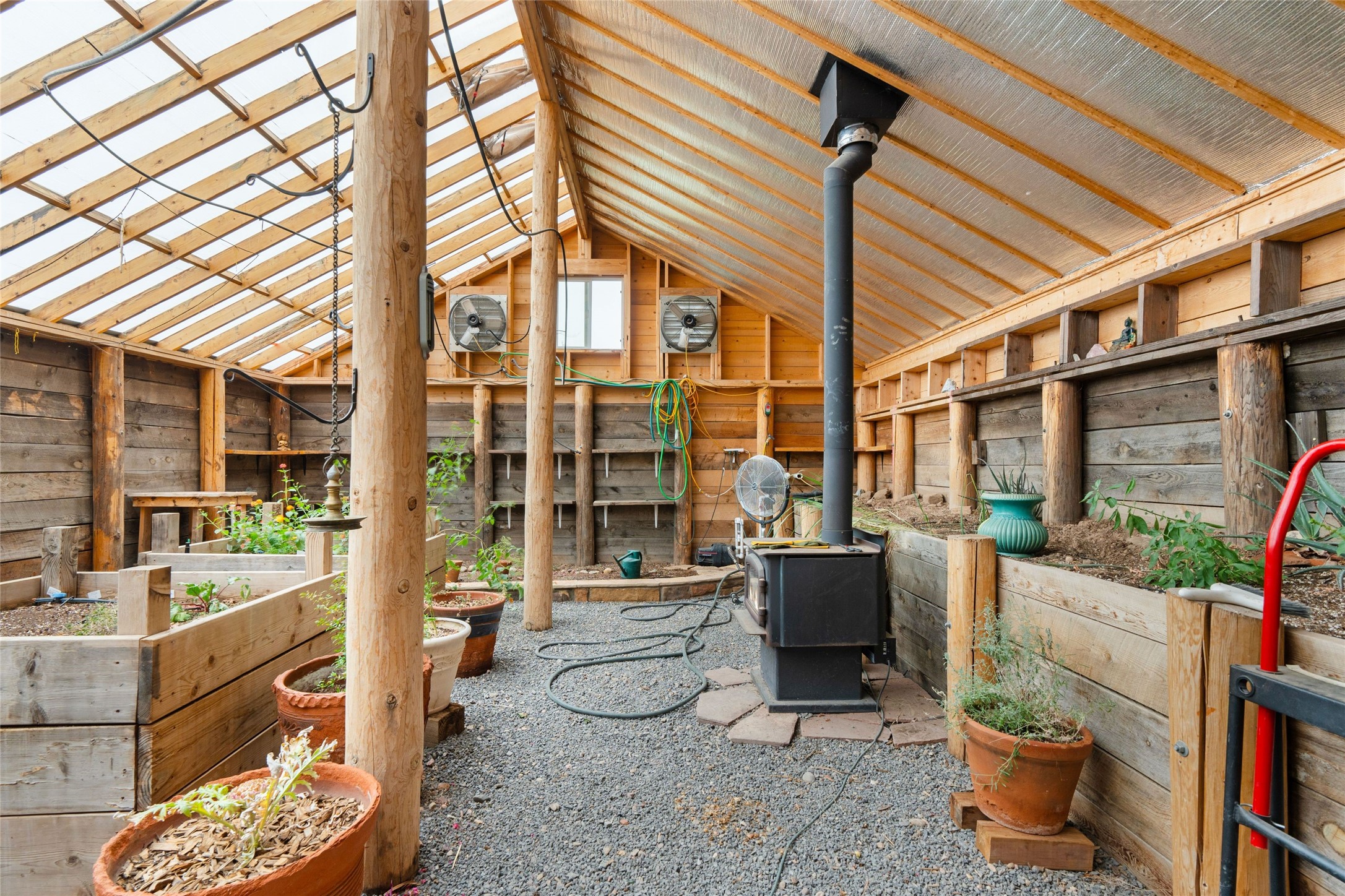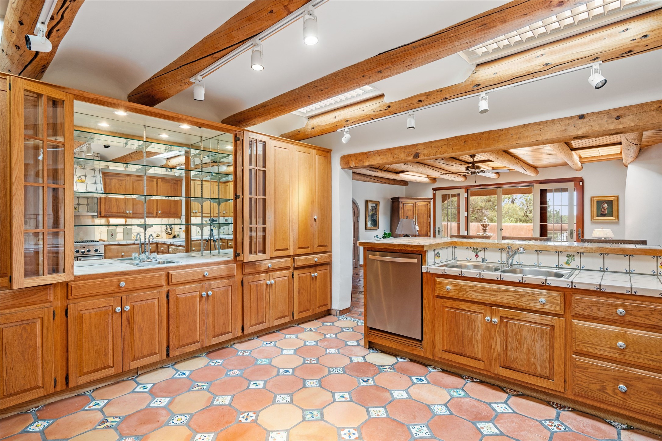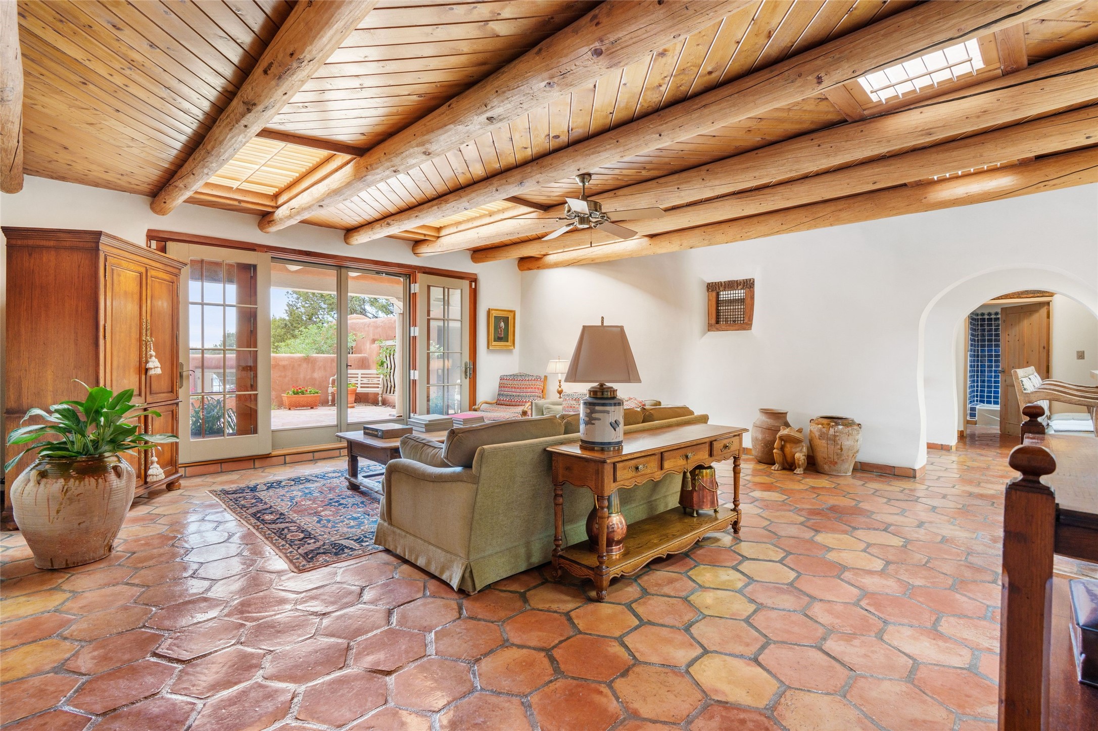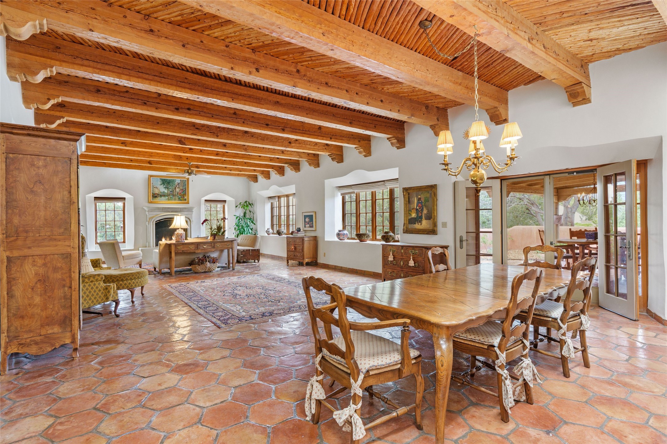 One doesn't simply just buy a Buzz Bainbridge property; one acquires an iconic aesthetic, a lifestyle, an environment of luxurious beauty to live in among his signature Santa Fe features: genuine handmade Adobe walls, some 30" thick; large open room spaces with gorgeous wraparound views and gorgeously embellished high ceilings, wonderful finishes with vigas and latillas and nichos, and kivas, and all the creature comforts of happy living. The intelligent floor plan opens onto gorgeous courtyards, portals, patios, and gardens abounding with high old trees, fountains, and established perennial flowers that embrace the property on the sprawling 7.5 acres. There is even a nurturing, part subterranean greenhouse for year-round blooms and vegetation. The double Adobe main house has three bedrooms, each with its own bath, each with a fireplace, while up the driveway sit the lovely two-bedroom guest house... privately separate, but close enough to borrow a cup of sugar! An additional art studio by the guesthouse with bathroom and fireplace can be an art space or a third bedroom on the guesthouse. There is no HOA to instruct you! The elegant location on prestigious Calle San Martin is 8 minutes to De Vargas mall and 10 to the airport! Yet you feel like you are unwinding in the country! Already pre-inspected with imperfections cured. This is opportunity knocking...!