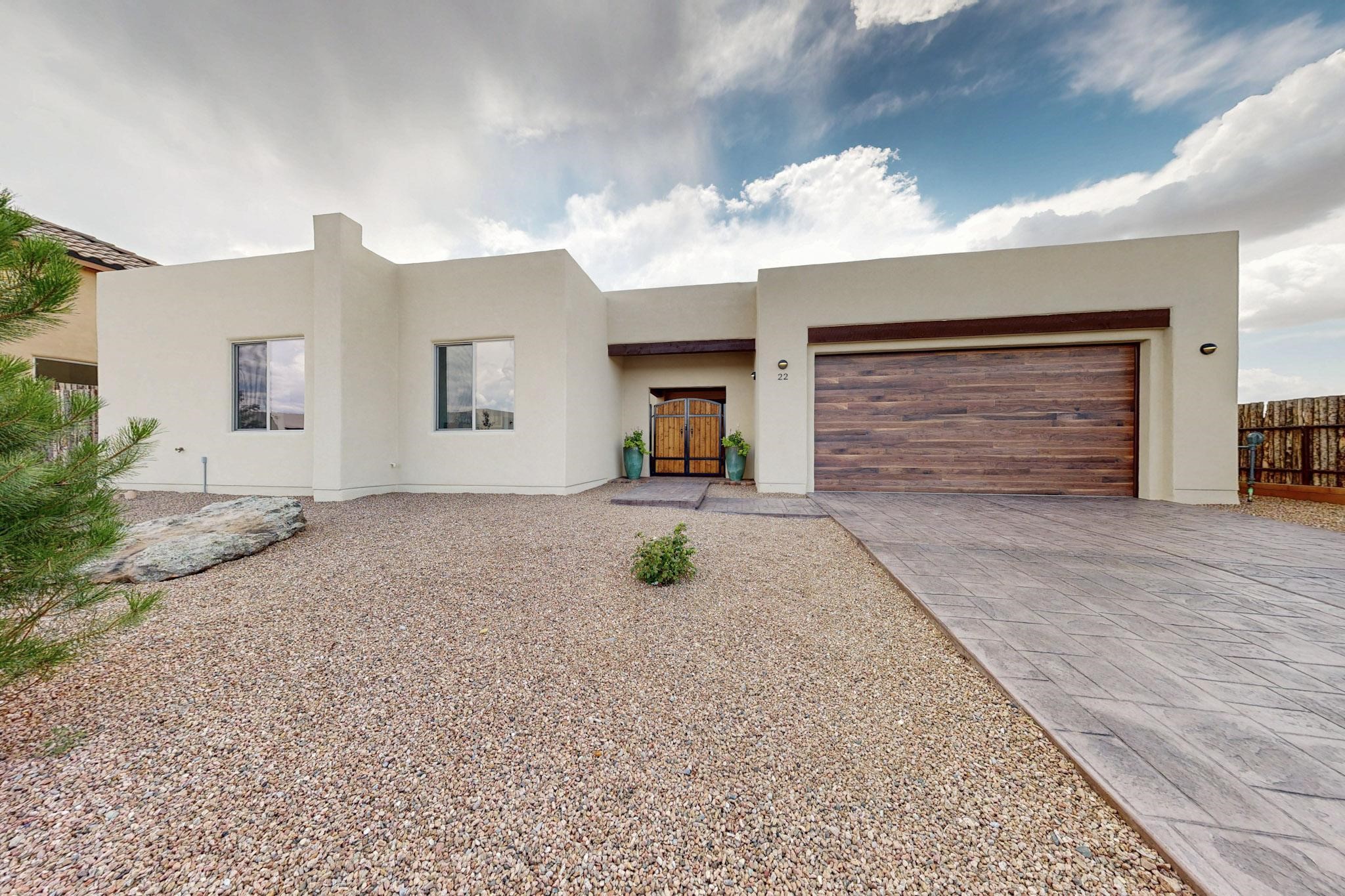 With wonderful 180 degree views this home is situated on one of La Pradera' sbest view lots! Enter this award-winning Zaguan Plan through a lockable double-cedar andwrought iron gate into a covered entry (a "Zaguan") with brick pavers and anopen private courtyard with a fountain. To your left is a separate self-containedliving unit with a living room, bedroom, 3/4 bath and its own HVAC unit and tankless hotwater heater. The main entry with eight-foot-high doors leads to the formalentry with a lighted Nicho. To the left is the owner's suite with a large walk-inshower with euro-style shower fixtures and an overhead rain shower head. Asliding barn separates the owner's bath and bedroom. Directly ahead of theentrance is the open living room with Pickling-White stained beams and T&Gplanking, a kiva fireplace and open kitchen with a 32 square foot oversizedcounter. The kitchen and guest bedroom both open out to a covered portal thathas a gas-fired kiva fireplace and brick pavers. To the right of the entrance is theguest bedroom bath that can also serve as a powder room. The floors are tiledwith Dove Gray porcelain tiles. The exterior is a contemporary design with aTPO roof on the living areas and a clay-like concrete tile roof on the outsideportal that has heavy wood beams and brick pavers. The driveway is coloredstamped concrete design. The insulated two-car garage includes an epoxy-coated floor.