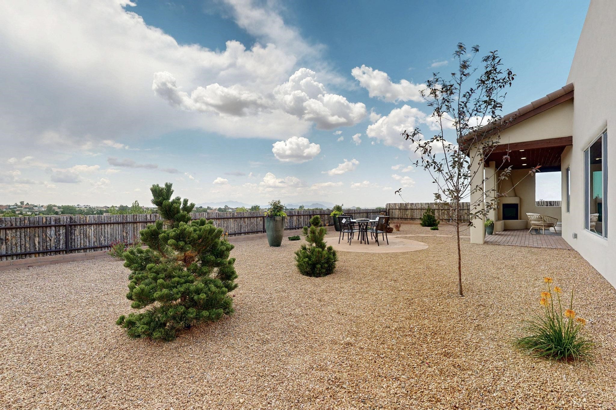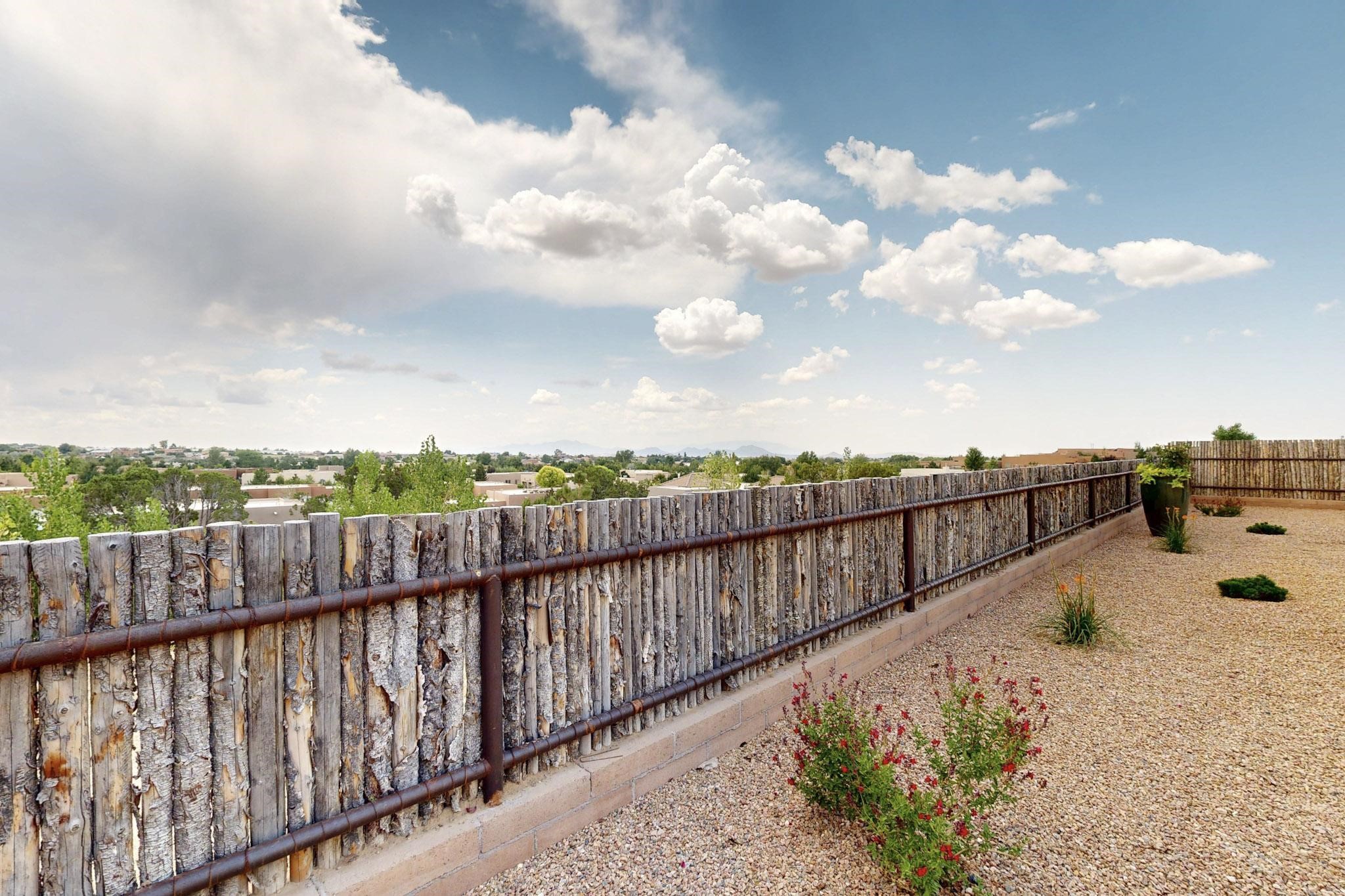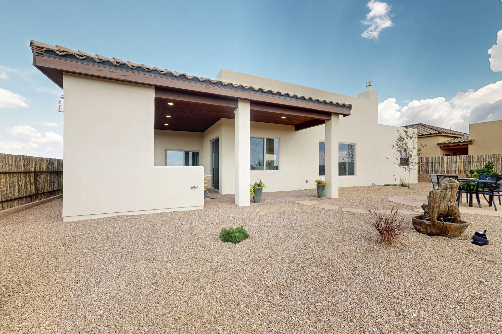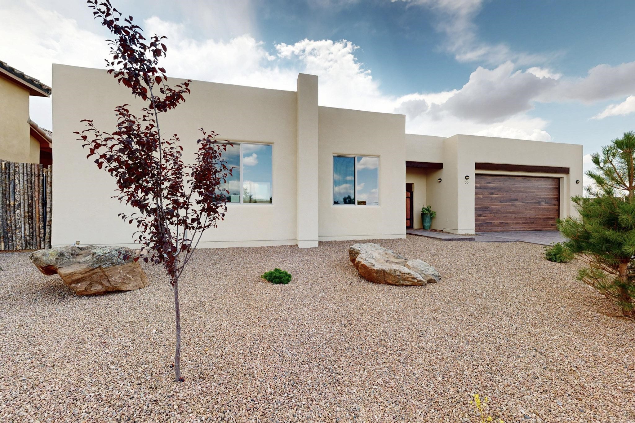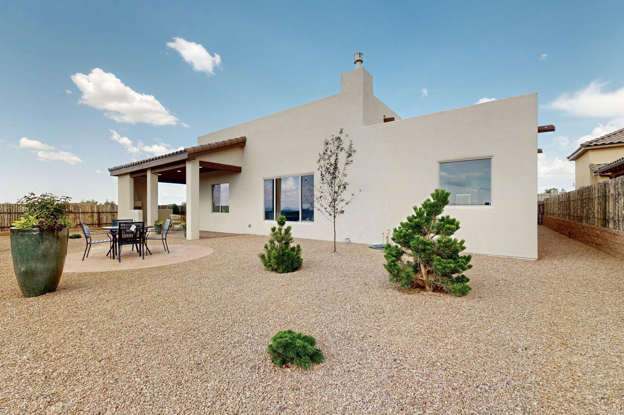 With wonderful 180 degree views this home is situated on one of La Pradera' sbest view lots! Enter this award-winning Zaguan Plan through a lockable double-cedar andwrought iron gate into a covered entry (a "Zaguan") with brick pavers and anopen private courtyard with a fountain. To your left is a separate self-containedliving unit with a living room, bedroom, 3/4 bath and its own HVAC unit and tankless hotwater heater. The main entry with eight-foot-high doors leads to the formalentry with a lighted Nicho. To the left is the owner's suite with a large walk-inshower with euro-style shower fixtures and an overhead rain shower head. Asliding barn separates the owner's bath and bedroom. Directly ahead of theentrance is the open living room with Pickling-White stained beams and T&Gplanking, a kiva fireplace and open kitchen with a 32 square foot oversizedcounter. The kitchen and guest bedroom both open out to a covered portal thathas a gas-fired kiva fireplace and brick pavers. To the right of the entrance is theguest bedroom bath that can also serve as a powder room. The floors are tiledwith Dove Gray porcelain tiles. The exterior is a contemporary design with aTPO roof on the living areas and a clay-like concrete tile roof on the outsideportal that has heavy wood beams and brick pavers. The driveway is coloredstamped concrete design. The insulated two-car garage includes an epoxy-coated floor.
