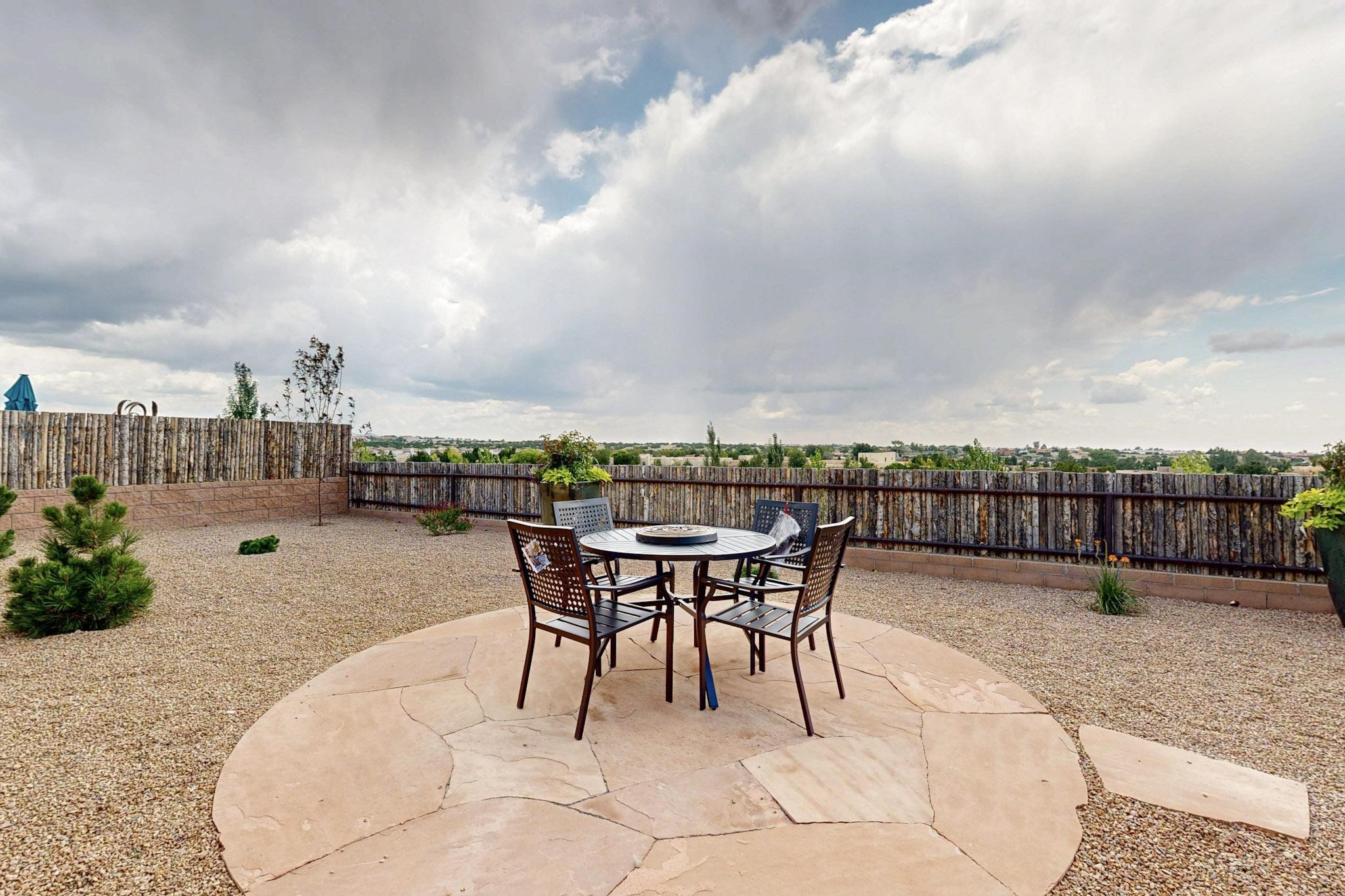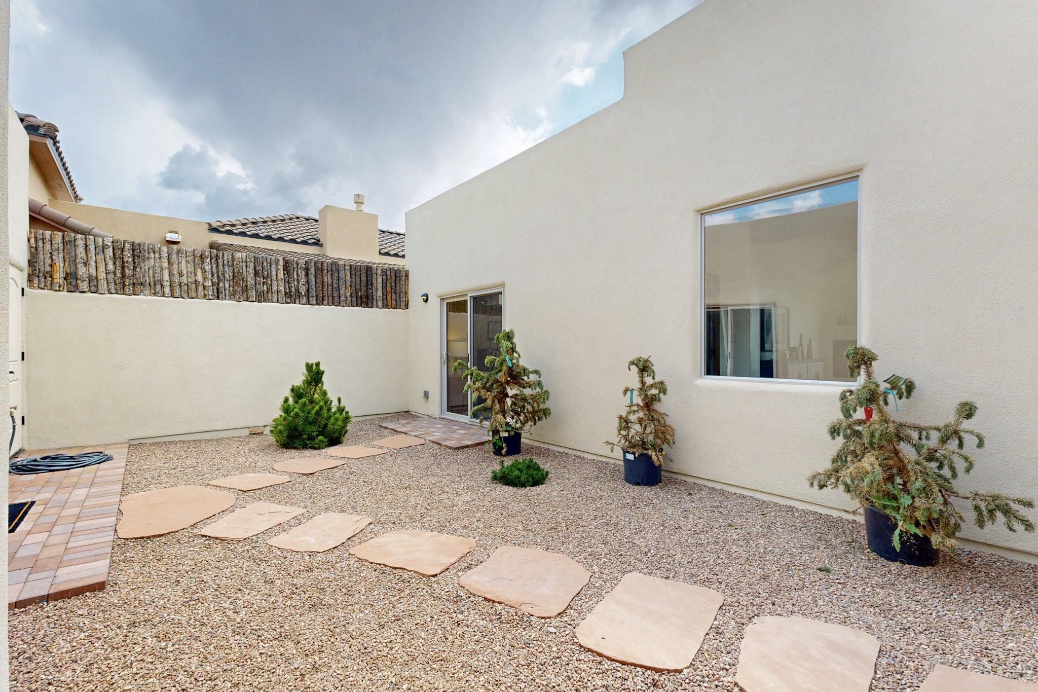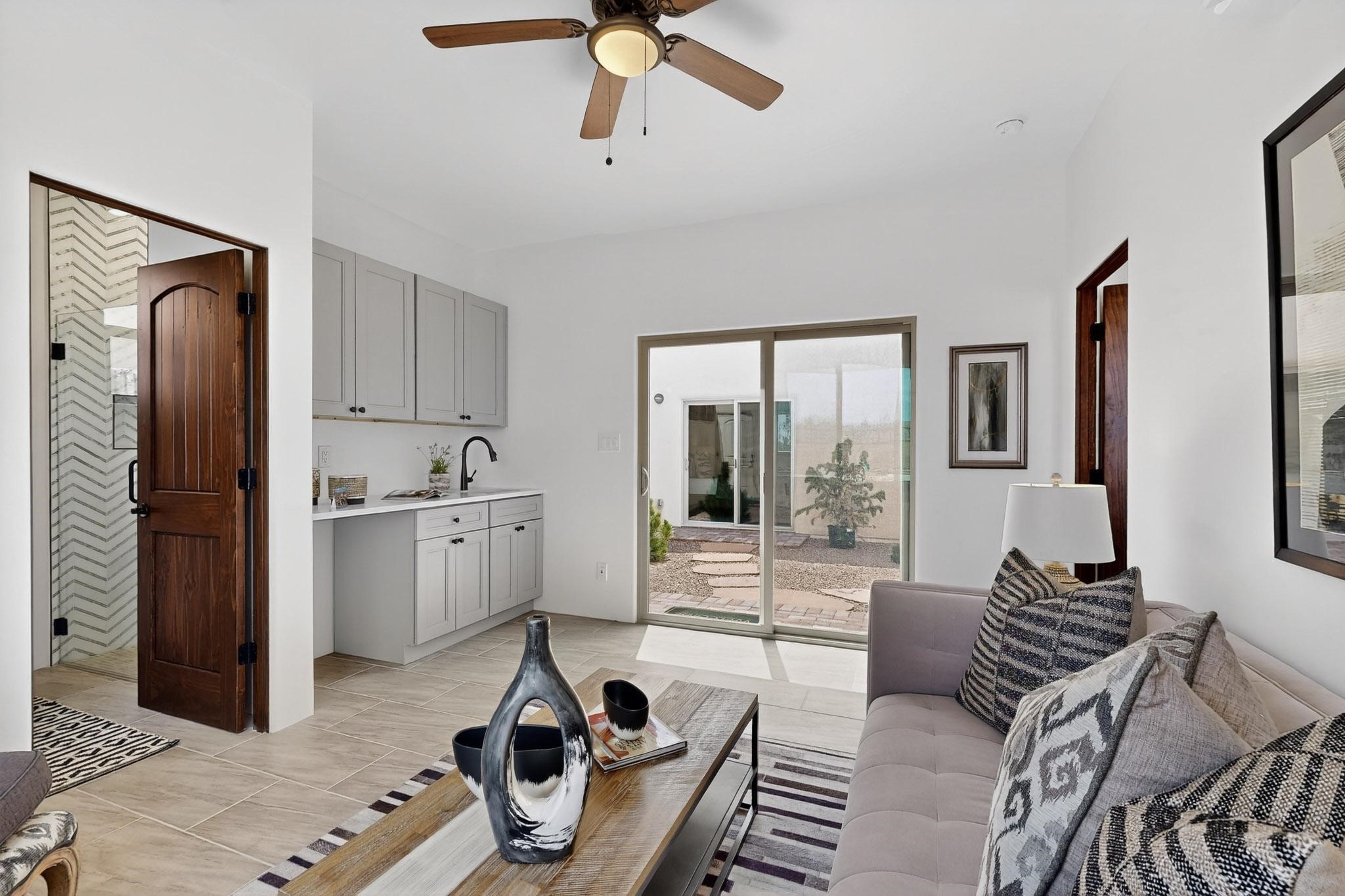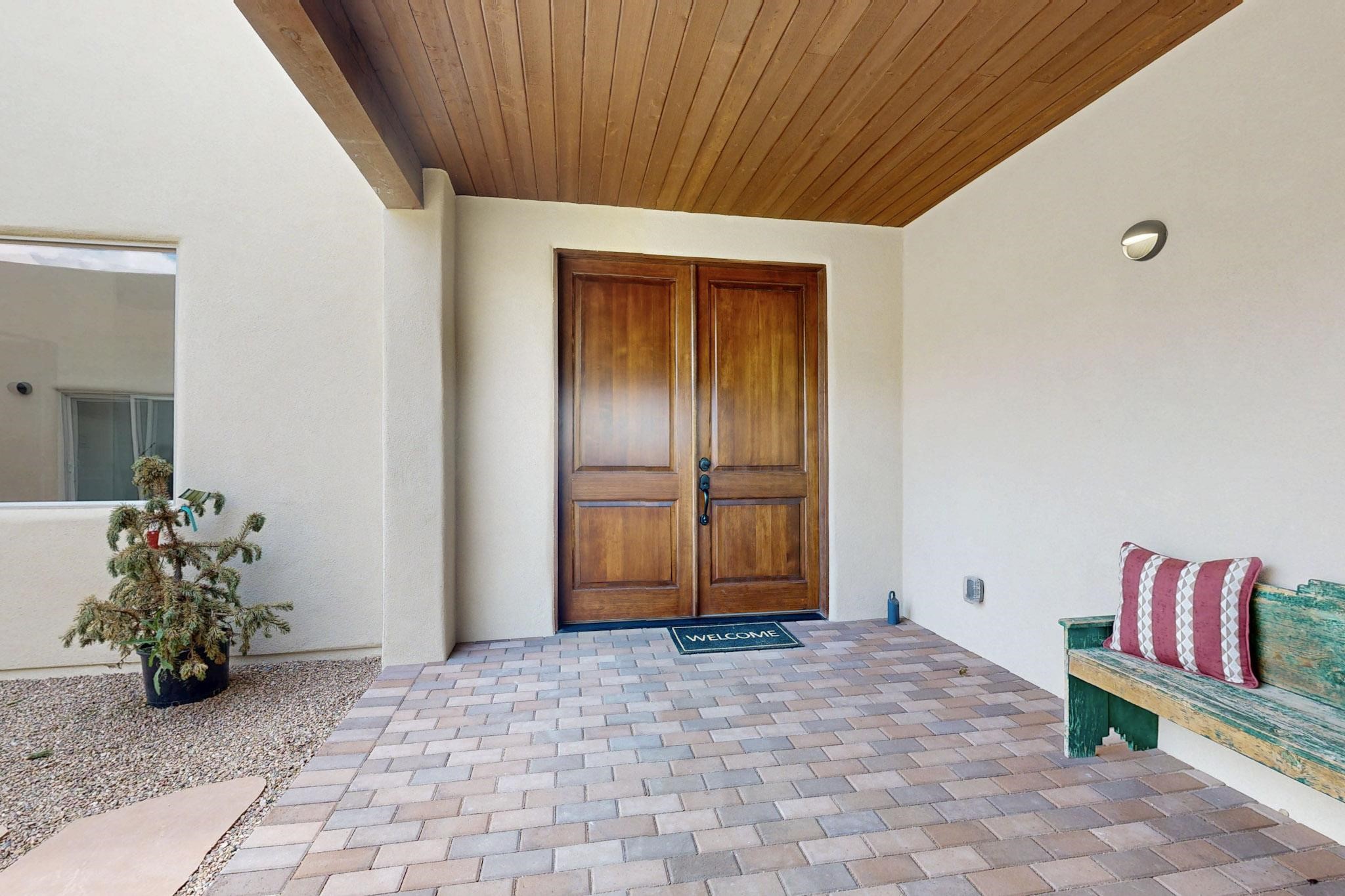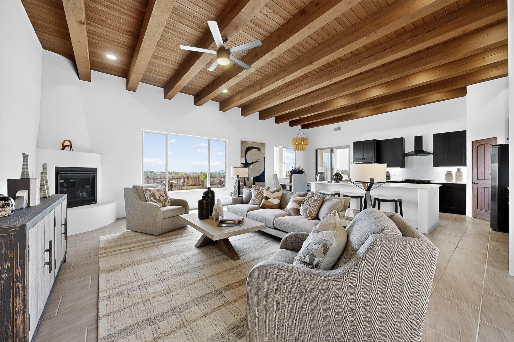 With wonderful 180 degree views this home is situated on one of La Pradera' sbest view lots! Enter this award-winning Zaguan Plan through a lockable double-cedar andwrought iron gate into a covered entry (a "Zaguan") with brick pavers and anopen private courtyard with a fountain. To your left is a separate self-containedliving unit with a living room, bedroom, 3/4 bath and its own HVAC unit and tankless hotwater heater. The main entry with eight-foot-high doors leads to the formalentry with a lighted Nicho. To the left is the owner's suite with a large walk-inshower with euro-style shower fixtures and an overhead rain shower head. Asliding barn separates the owner's bath and bedroom. Directly ahead of theentrance is the open living room with Pickling-White stained beams and T&Gplanking, a kiva fireplace and open kitchen with a 32 square foot oversizedcounter. The kitchen and guest bedroom both open out to a covered portal thathas a gas-fired kiva fireplace and brick pavers. To the right of the entrance is theguest bedroom bath that can also serve as a powder room. The floors are tiledwith Dove Gray porcelain tiles. The exterior is a contemporary design with aTPO roof on the living areas and a clay-like concrete tile roof on the outsideportal that has heavy wood beams and brick pavers. The driveway is coloredstamped concrete design. The insulated two-car garage includes an epoxy-coated floor.