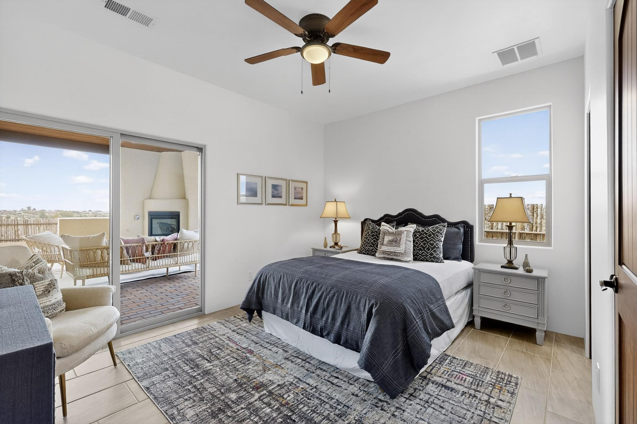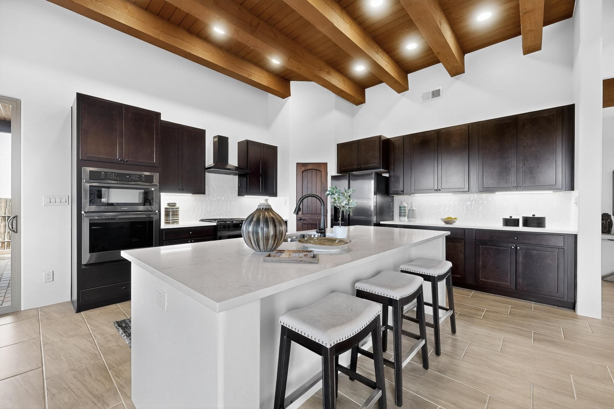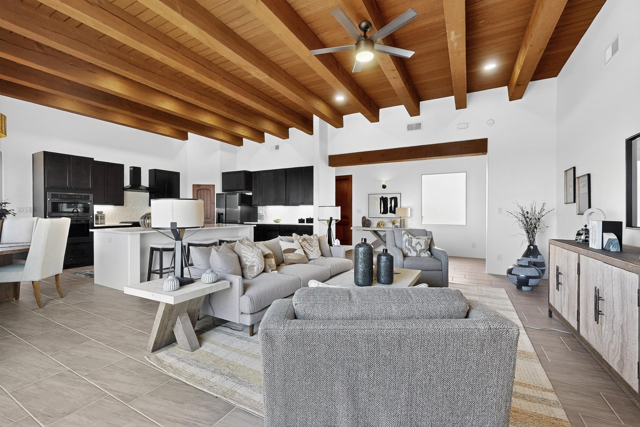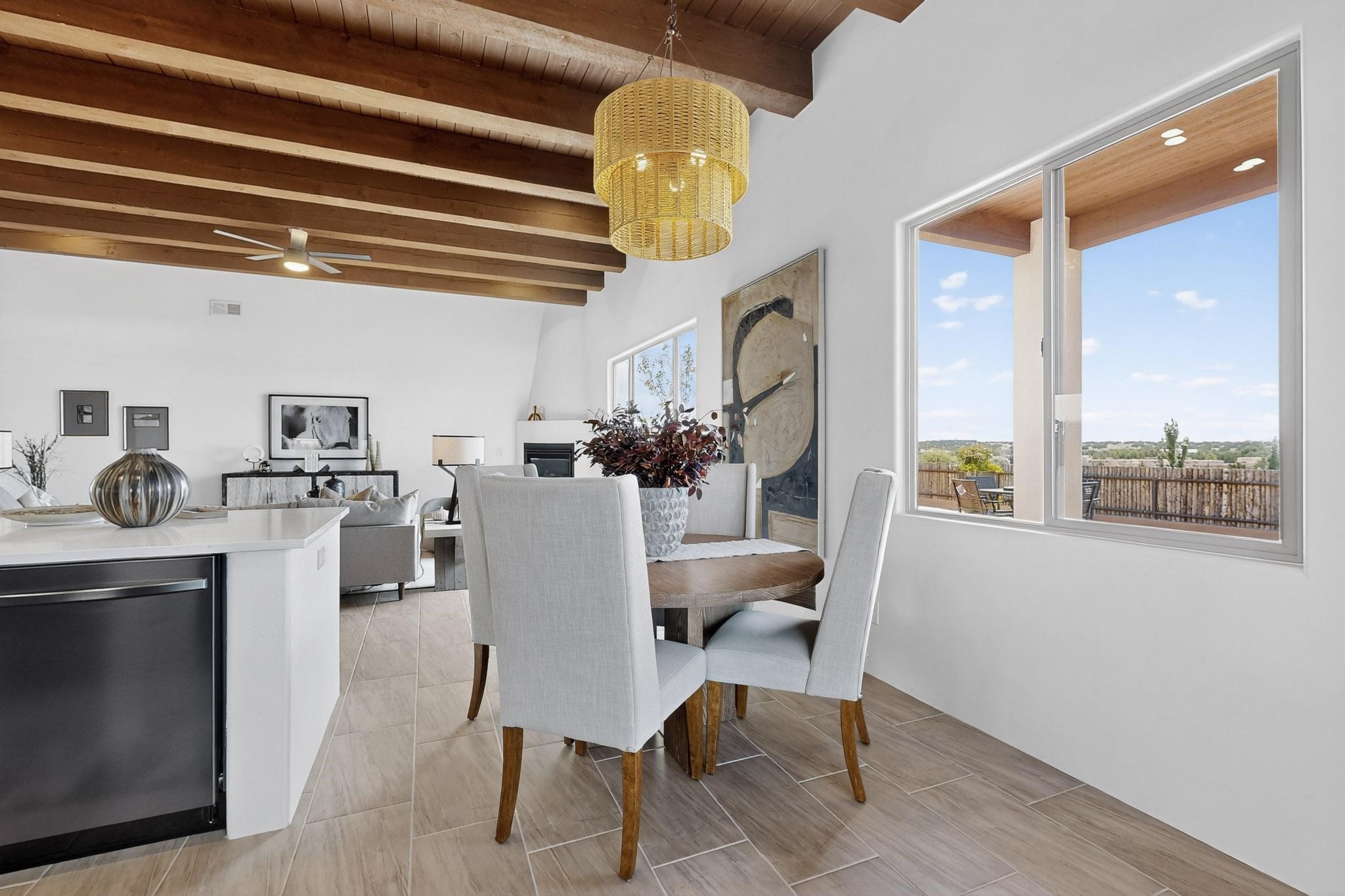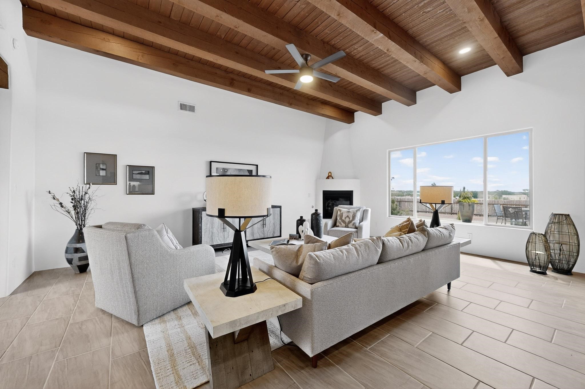 With wonderful 180 degree views this home is situated on one of La Pradera' sbest view lots! Enter this award-winning Zaguan Plan through a lockable double-cedar andwrought iron gate into a covered entry (a "Zaguan") with brick pavers and anopen private courtyard with a fountain. To your left is a separate self-containedliving unit with a living room, bedroom, 3/4 bath and its own HVAC unit and tankless hotwater heater. The main entry with eight-foot-high doors leads to the formalentry with a lighted Nicho. To the left is the owner's suite with a large walk-inshower with euro-style shower fixtures and an overhead rain shower head. Asliding barn separates the owner's bath and bedroom. Directly ahead of theentrance is the open living room with Pickling-White stained beams and T&Gplanking, a kiva fireplace and open kitchen with a 32 square foot oversizedcounter. The kitchen and guest bedroom both open out to a covered portal thathas a gas-fired kiva fireplace and brick pavers. To the right of the entrance is theguest bedroom bath that can also serve as a powder room. The floors are tiledwith Dove Gray porcelain tiles. The exterior is a contemporary design with aTPO roof on the living areas and a clay-like concrete tile roof on the outsideportal that has heavy wood beams and brick pavers. The driveway is coloredstamped concrete design. The insulated two-car garage includes an epoxy-coated floor.