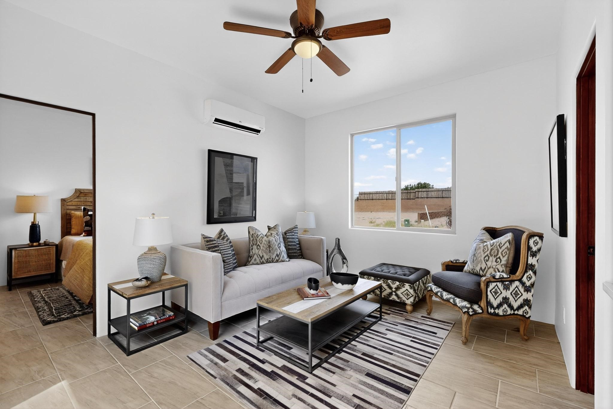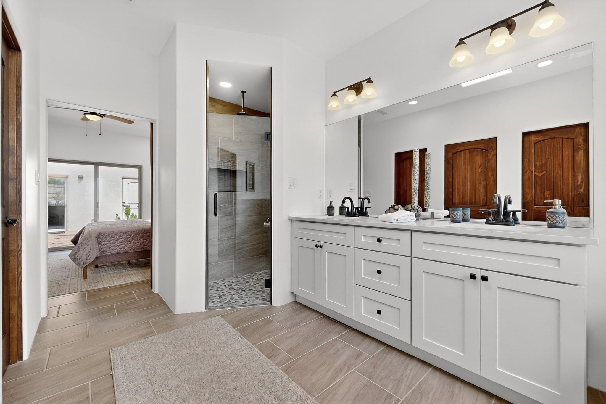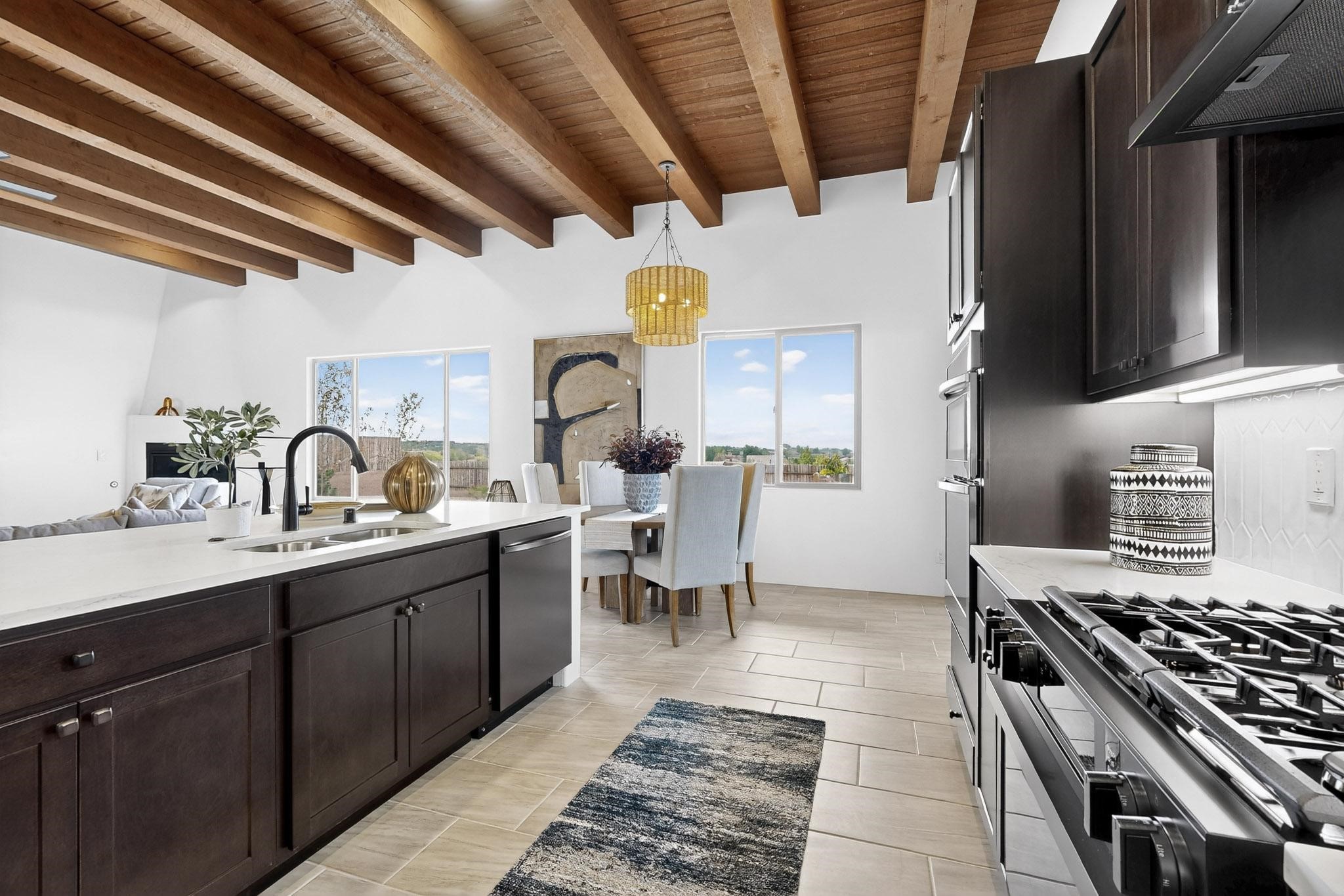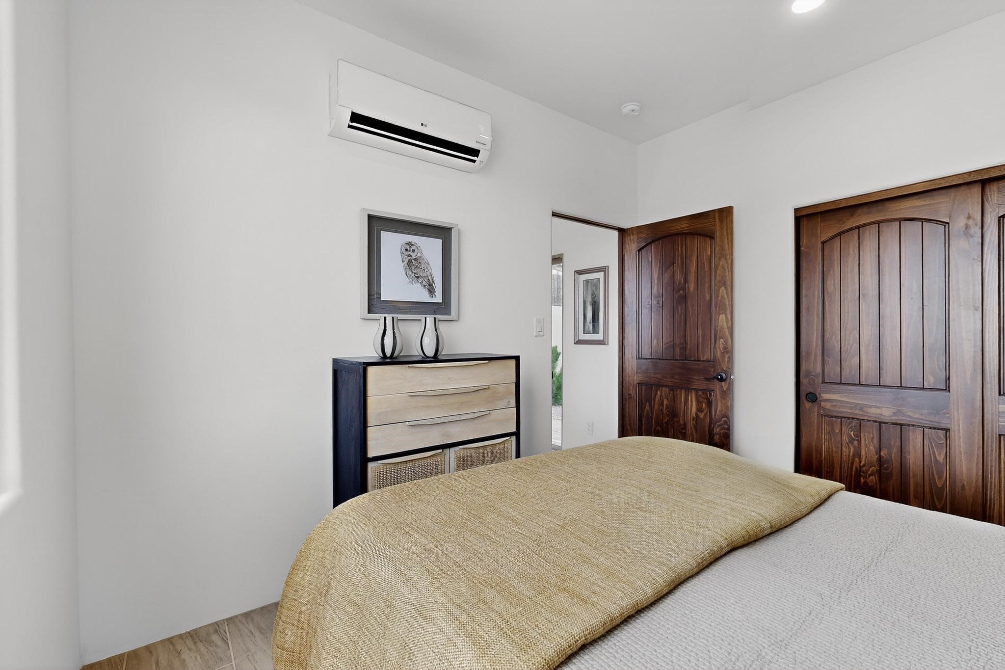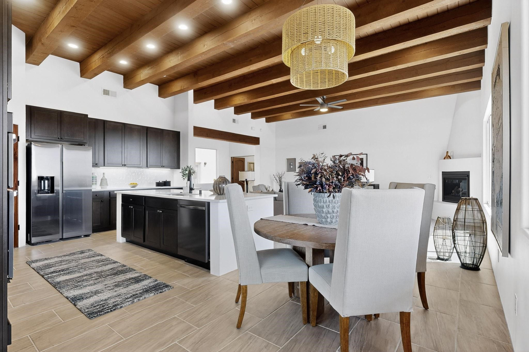 With wonderful 180 degree views this home is situated on one of La Pradera' sbest view lots! Enter this award-winning Zaguan Plan through a lockable double-cedar andwrought iron gate into a covered entry (a "Zaguan") with brick pavers and anopen private courtyard with a fountain. To your left is a separate self-containedliving unit with a living room, bedroom, 3/4 bath and its own HVAC unit and tankless hotwater heater. The main entry with eight-foot-high doors leads to the formalentry with a lighted Nicho. To the left is the owner's suite with a large walk-inshower with euro-style shower fixtures and an overhead rain shower head. Asliding barn separates the owner's bath and bedroom. Directly ahead of theentrance is the open living room with Pickling-White stained beams and T&Gplanking, a kiva fireplace and open kitchen with a 32 square foot oversizedcounter. The kitchen and guest bedroom both open out to a covered portal thathas a gas-fired kiva fireplace and brick pavers. To the right of the entrance is theguest bedroom bath that can also serve as a powder room. The floors are tiledwith Dove Gray porcelain tiles. The exterior is a contemporary design with aTPO roof on the living areas and a clay-like concrete tile roof on the outsideportal that has heavy wood beams and brick pavers. The driveway is coloredstamped concrete design. The insulated two-car garage includes an epoxy-coated floor.