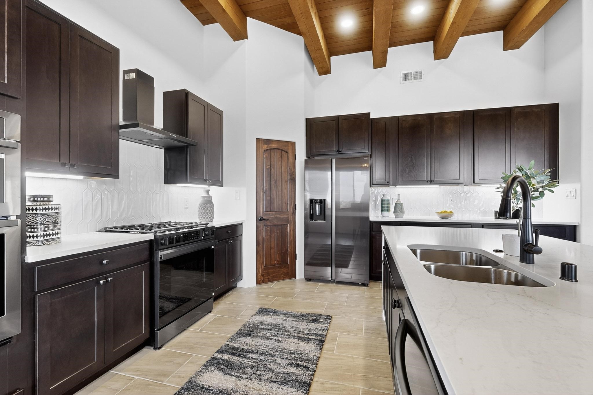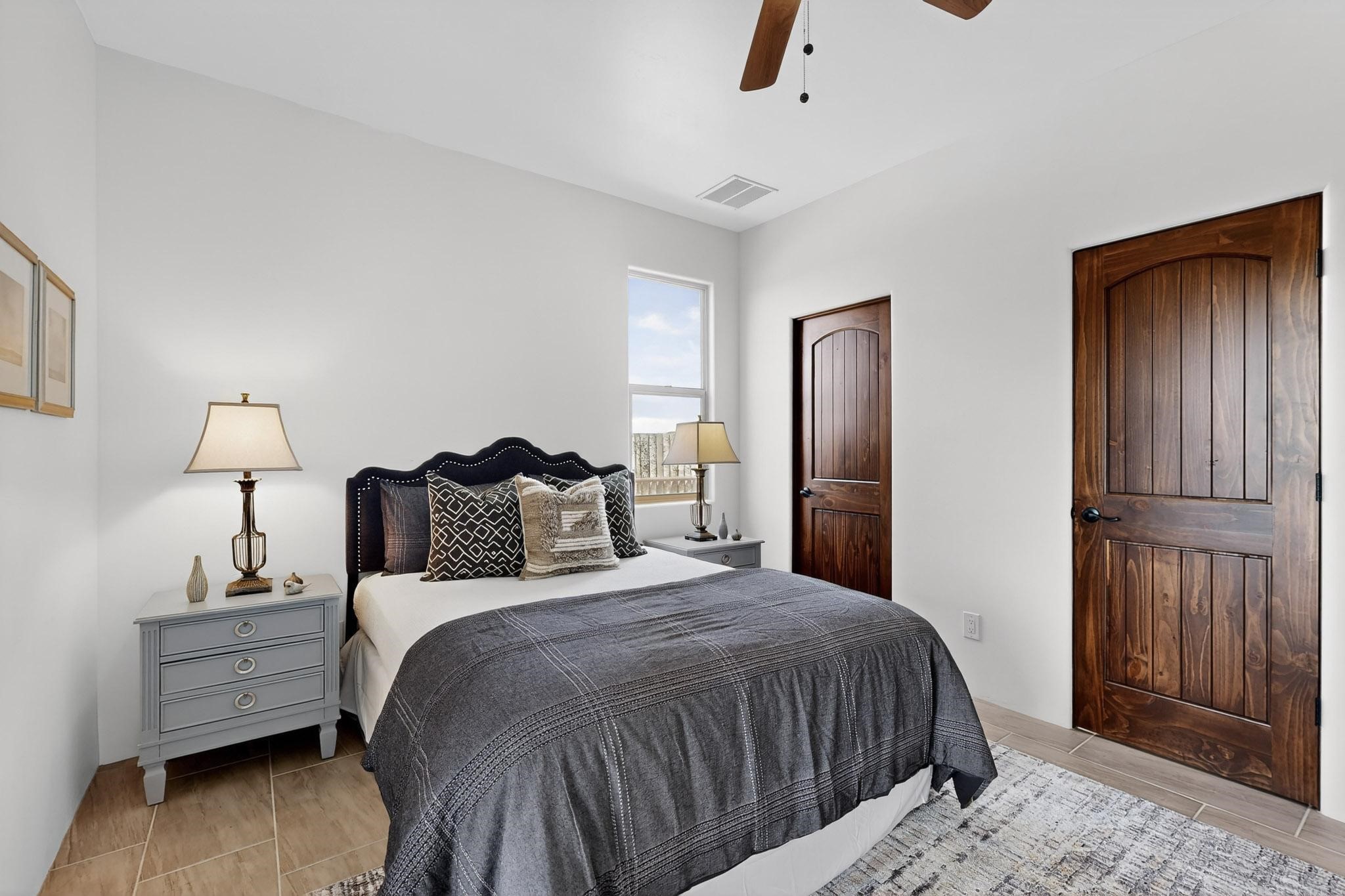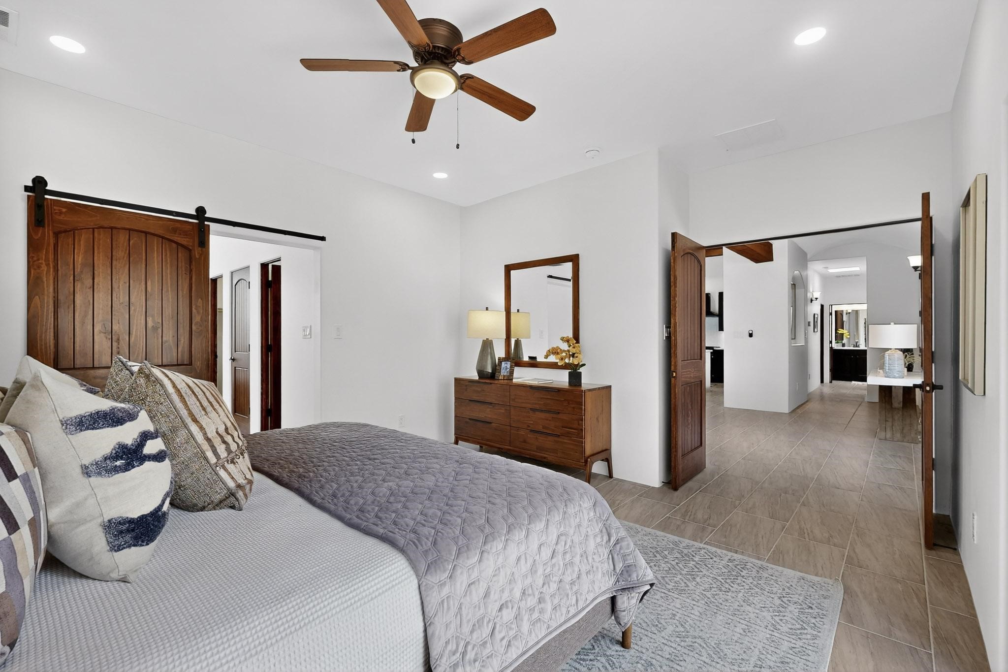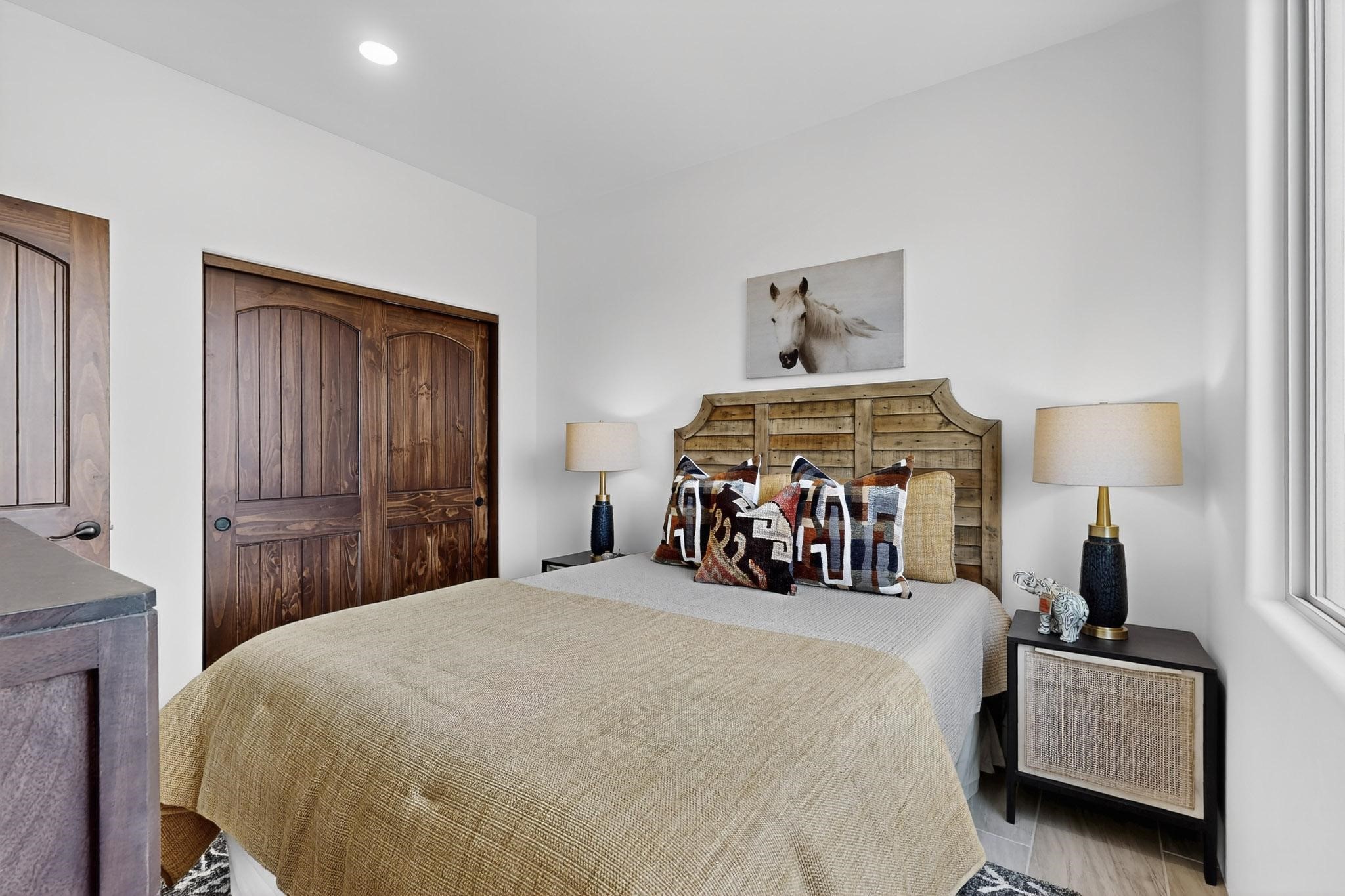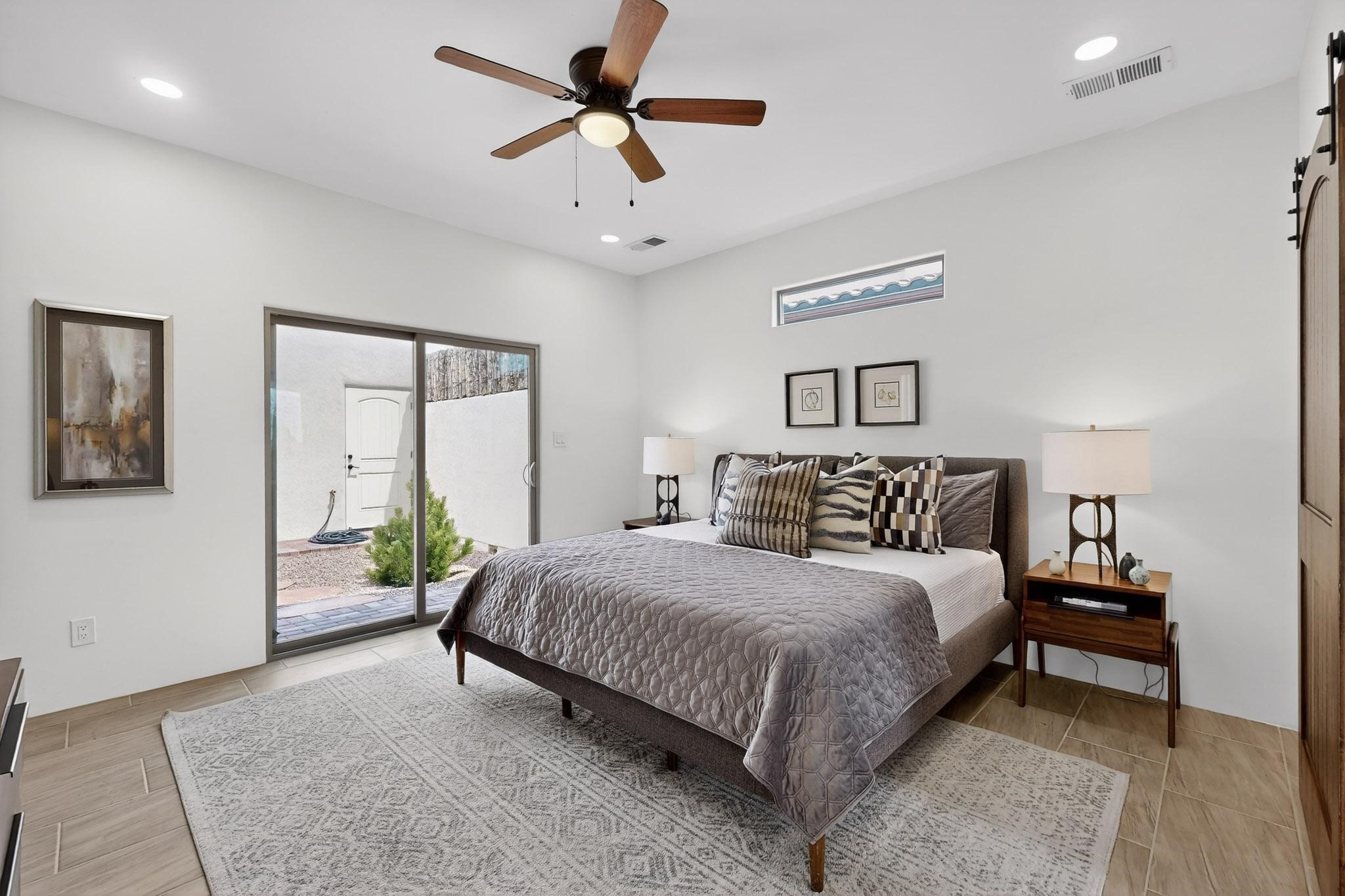 With wonderful 180 degree views this home is situated on one of La Pradera' sbest view lots! Enter this award-winning Zaguan Plan through a lockable double-cedar andwrought iron gate into a covered entry (a "Zaguan") with brick pavers and anopen private courtyard with a fountain. To your left is a separate self-containedliving unit with a living room, bedroom, 3/4 bath and its own HVAC unit and tankless hotwater heater. The main entry with eight-foot-high doors leads to the formalentry with a lighted Nicho. To the left is the owner's suite with a large walk-inshower with euro-style shower fixtures and an overhead rain shower head. Asliding barn separates the owner's bath and bedroom. Directly ahead of theentrance is the open living room with Pickling-White stained beams and T&Gplanking, a kiva fireplace and open kitchen with a 32 square foot oversizedcounter. The kitchen and guest bedroom both open out to a covered portal thathas a gas-fired kiva fireplace and brick pavers. To the right of the entrance is theguest bedroom bath that can also serve as a powder room. The floors are tiledwith Dove Gray porcelain tiles. The exterior is a contemporary design with aTPO roof on the living areas and a clay-like concrete tile roof on the outsideportal that has heavy wood beams and brick pavers. The driveway is coloredstamped concrete design. The insulated two-car garage includes an epoxy-coated floor.