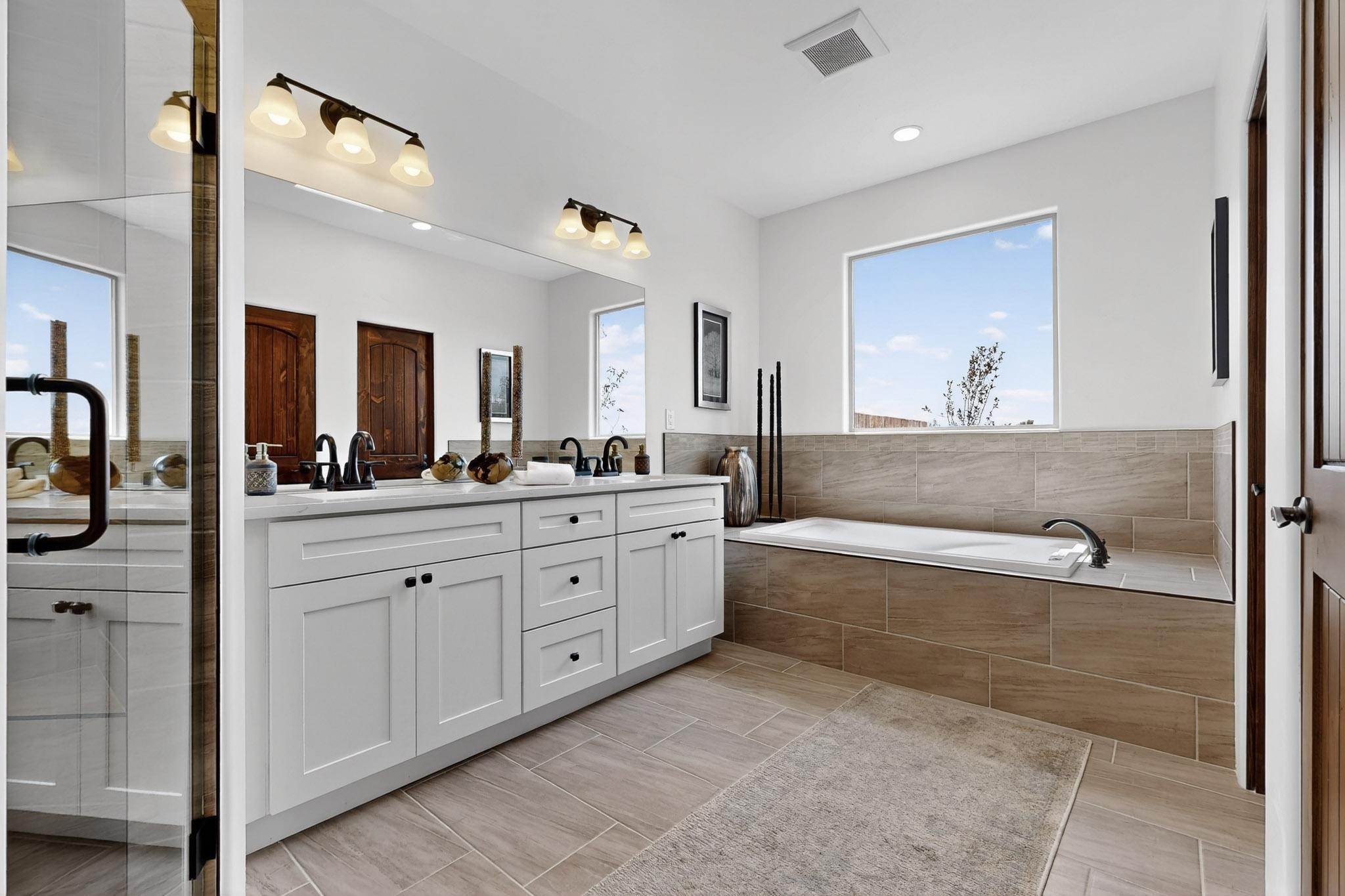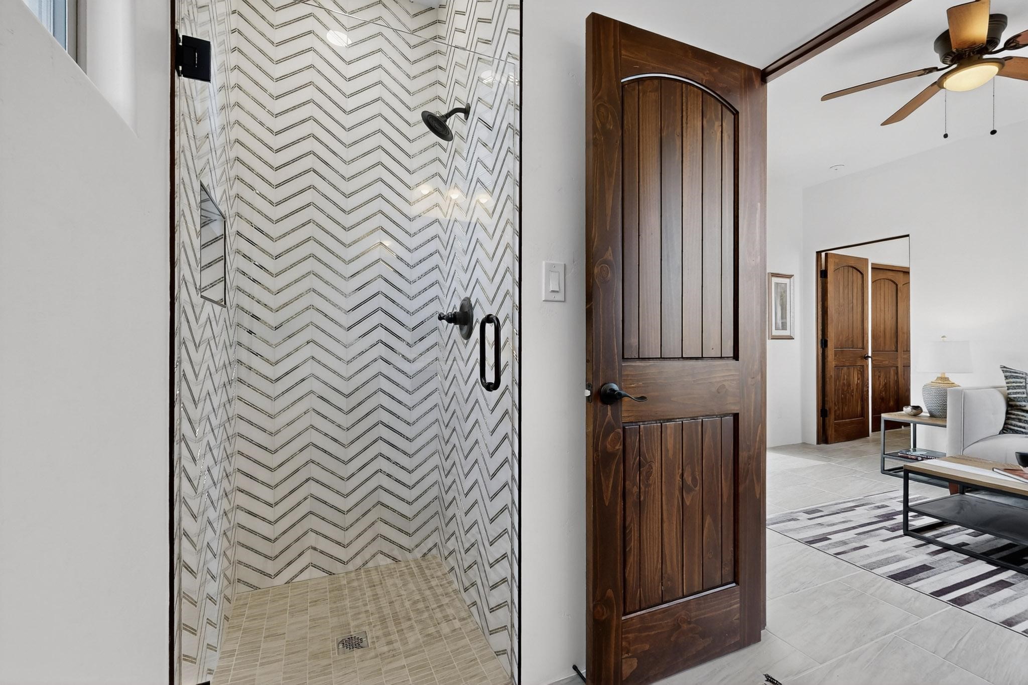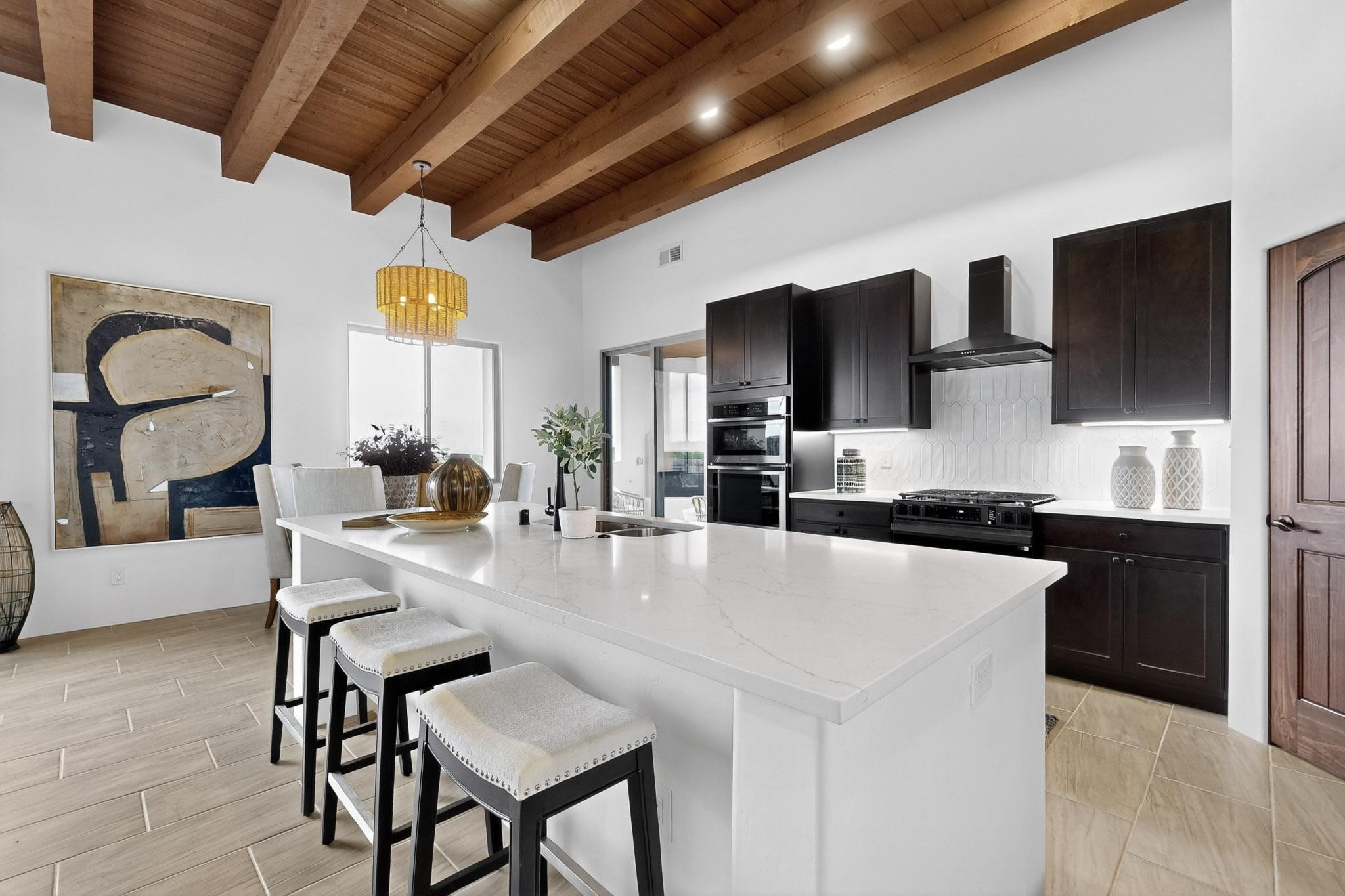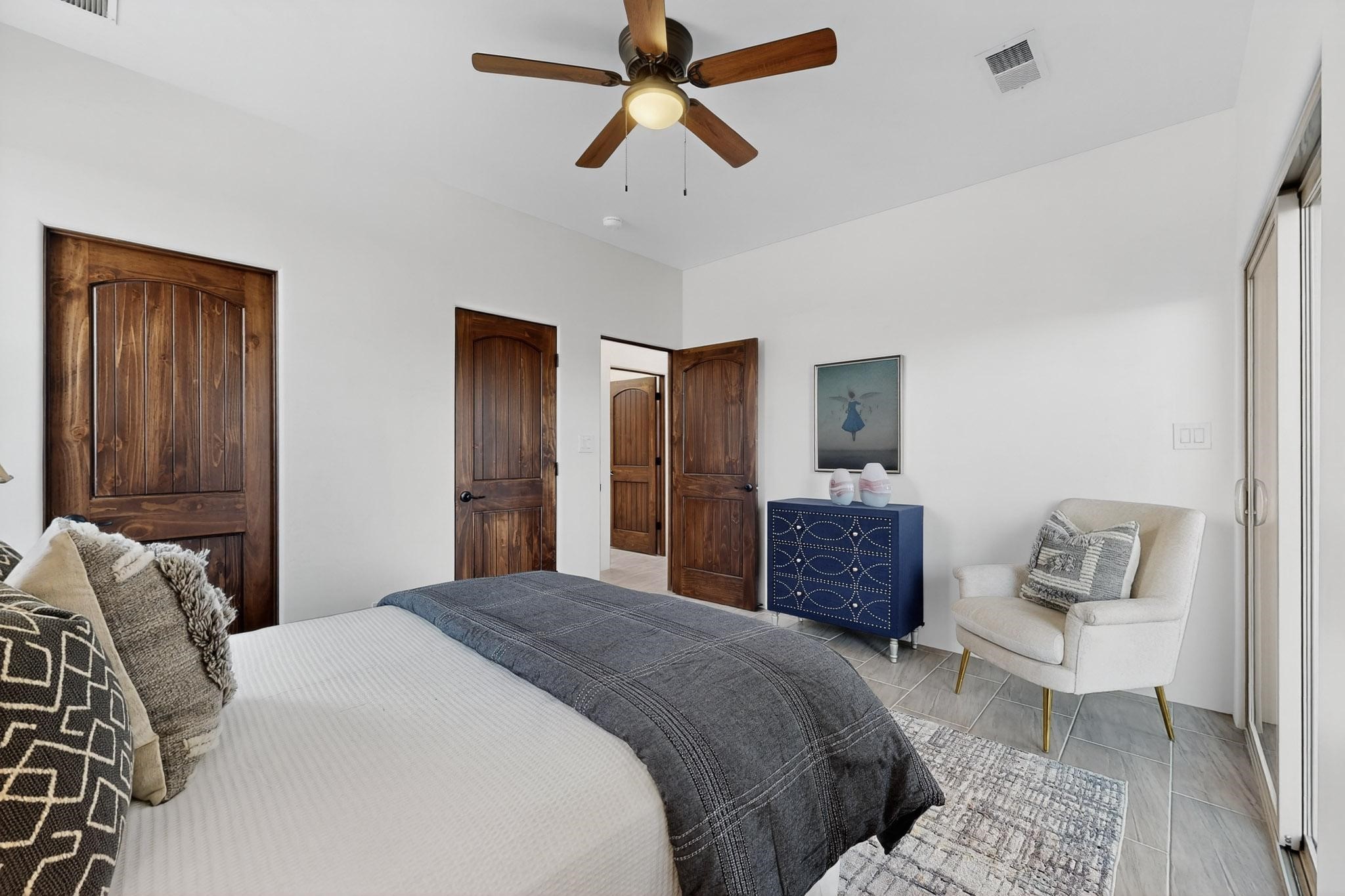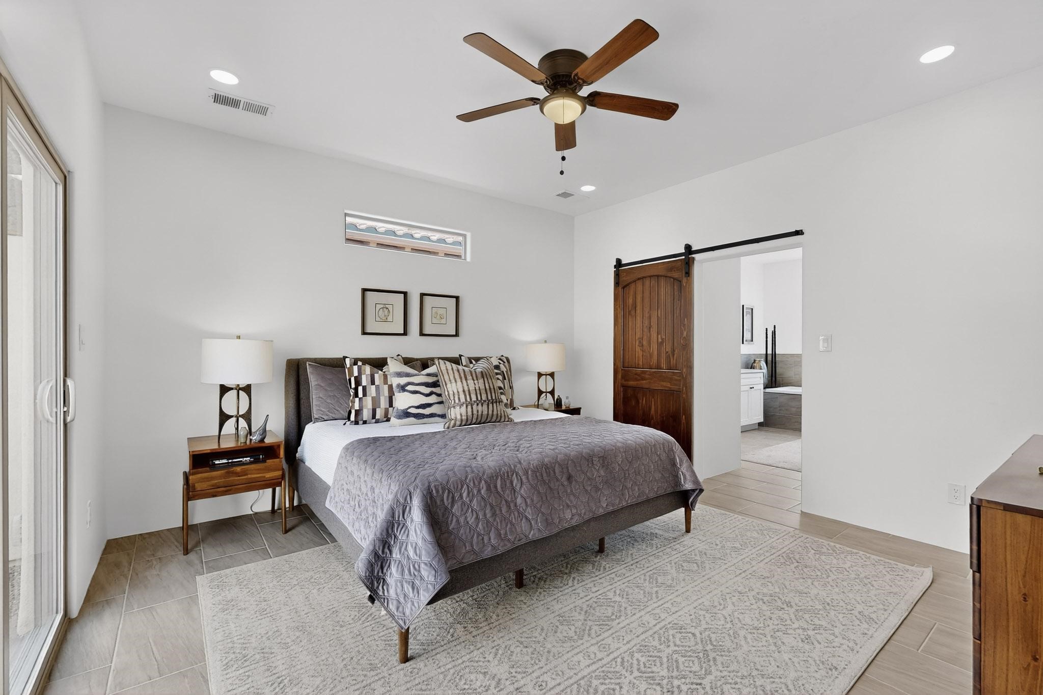 With wonderful 180 degree views this home is situated on one of La Pradera' sbest view lots! Enter this award-winning Zaguan Plan through a lockable double-cedar andwrought iron gate into a covered entry (a "Zaguan") with brick pavers and anopen private courtyard with a fountain. To your left is a separate self-containedliving unit with a living room, bedroom, 3/4 bath and its own HVAC unit and tankless hotwater heater. The main entry with eight-foot-high doors leads to the formalentry with a lighted Nicho. To the left is the owner's suite with a large walk-inshower with euro-style shower fixtures and an overhead rain shower head. Asliding barn separates the owner's bath and bedroom. Directly ahead of theentrance is the open living room with Pickling-White stained beams and T&Gplanking, a kiva fireplace and open kitchen with a 32 square foot oversizedcounter. The kitchen and guest bedroom both open out to a covered portal thathas a gas-fired kiva fireplace and brick pavers. To the right of the entrance is theguest bedroom bath that can also serve as a powder room. The floors are tiledwith Dove Gray porcelain tiles. The exterior is a contemporary design with aTPO roof on the living areas and a clay-like concrete tile roof on the outsideportal that has heavy wood beams and brick pavers. The driveway is coloredstamped concrete design. The insulated two-car garage includes an epoxy-coated floor.