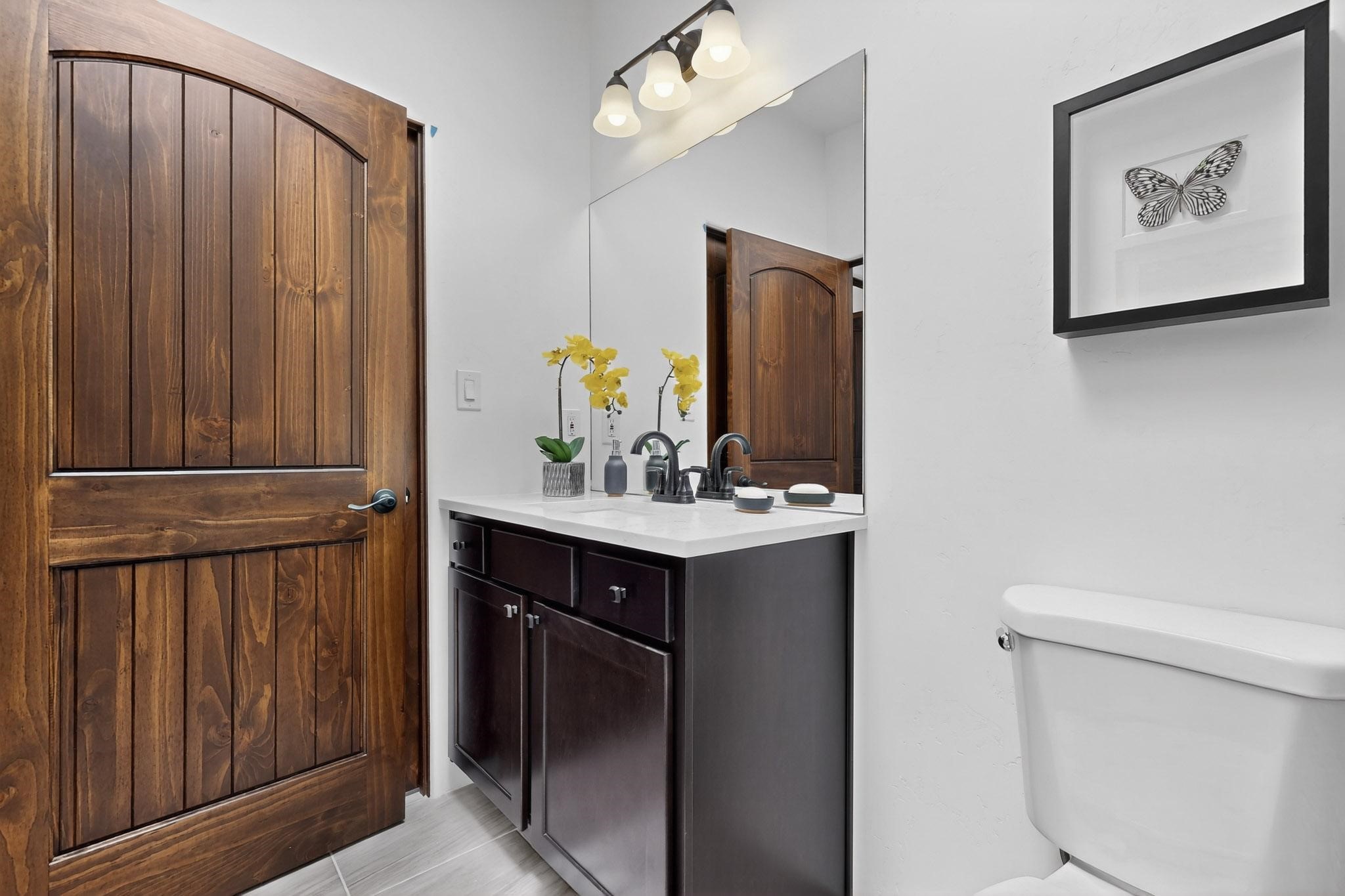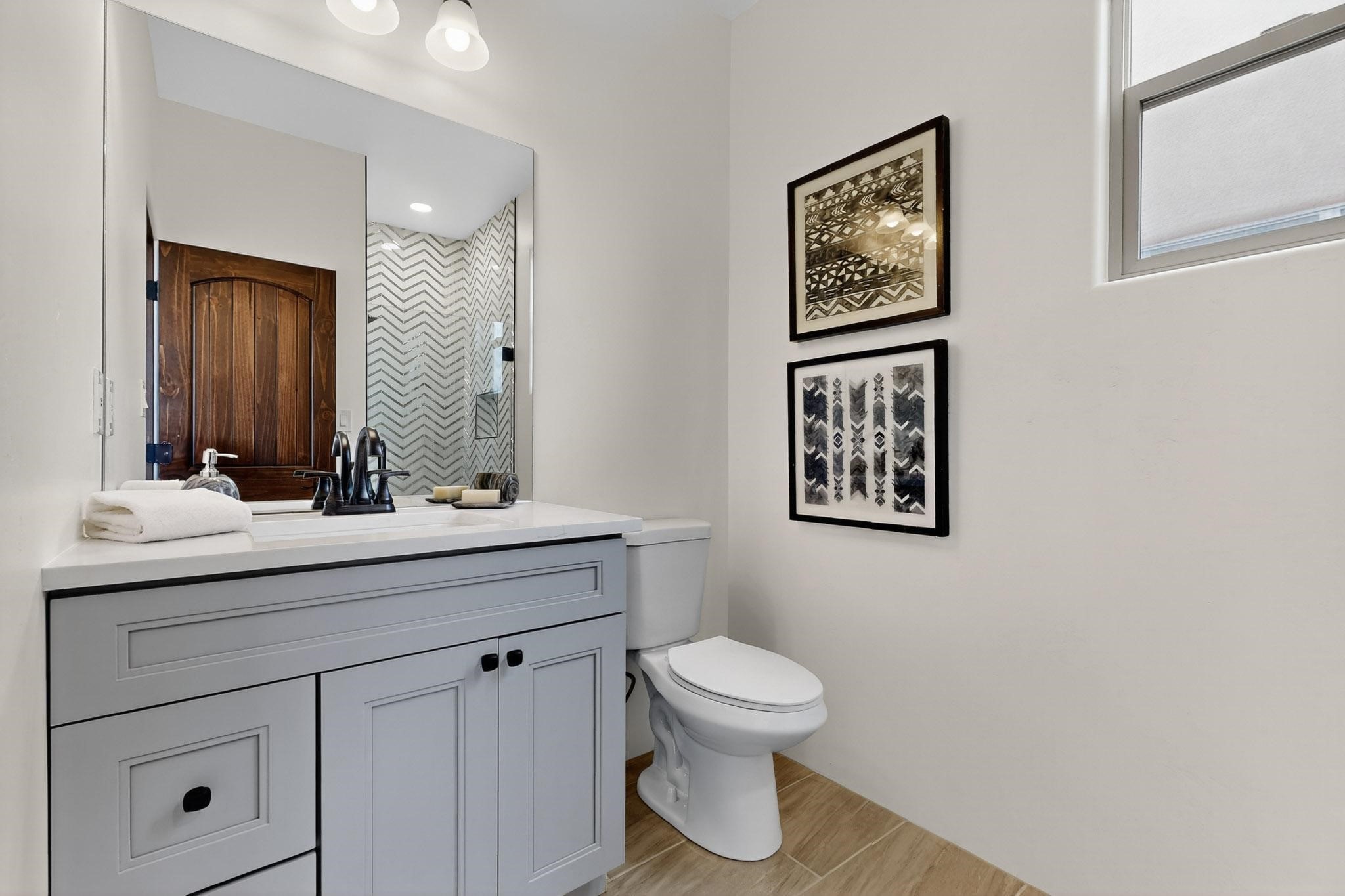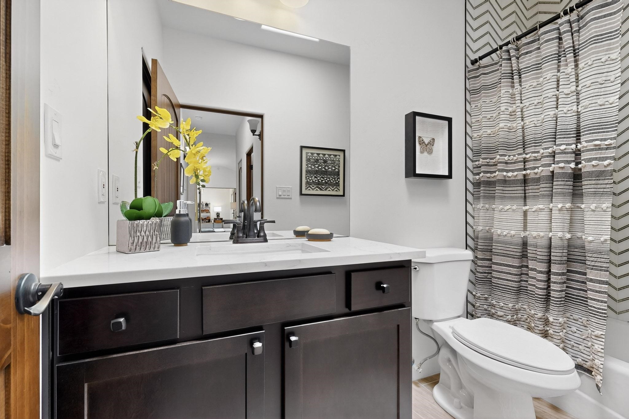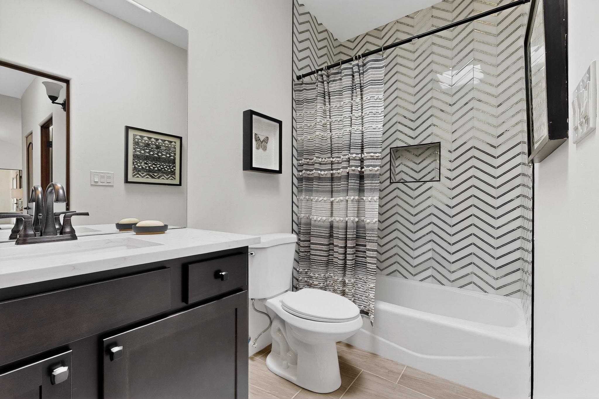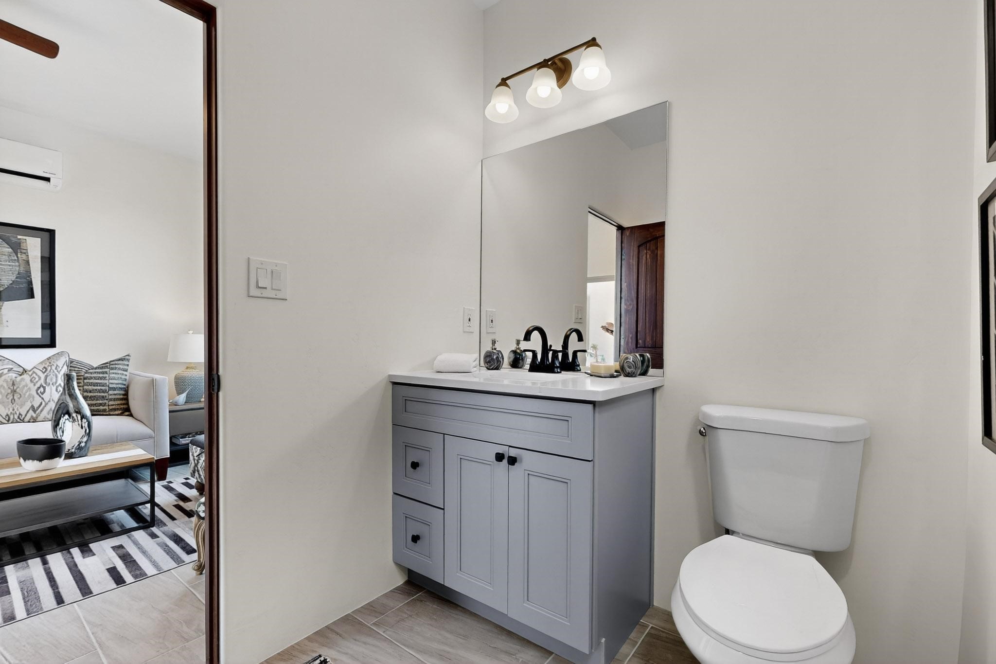 With wonderful 180 degree views this home is situated on one of La Pradera' sbest view lots! Enter this award-winning Zaguan Plan through a lockable double-cedar andwrought iron gate into a covered entry (a "Zaguan") with brick pavers and anopen private courtyard with a fountain. To your left is a separate self-containedliving unit with a living room, bedroom, 3/4 bath and its own HVAC unit and tankless hotwater heater. The main entry with eight-foot-high doors leads to the formalentry with a lighted Nicho. To the left is the owner's suite with a large walk-inshower with euro-style shower fixtures and an overhead rain shower head. Asliding barn separates the owner's bath and bedroom. Directly ahead of theentrance is the open living room with Pickling-White stained beams and T&Gplanking, a kiva fireplace and open kitchen with a 32 square foot oversizedcounter. The kitchen and guest bedroom both open out to a covered portal thathas a gas-fired kiva fireplace and brick pavers. To the right of the entrance is theguest bedroom bath that can also serve as a powder room. The floors are tiledwith Dove Gray porcelain tiles. The exterior is a contemporary design with aTPO roof on the living areas and a clay-like concrete tile roof on the outsideportal that has heavy wood beams and brick pavers. The driveway is coloredstamped concrete design. The insulated two-car garage includes an epoxy-coated floor.