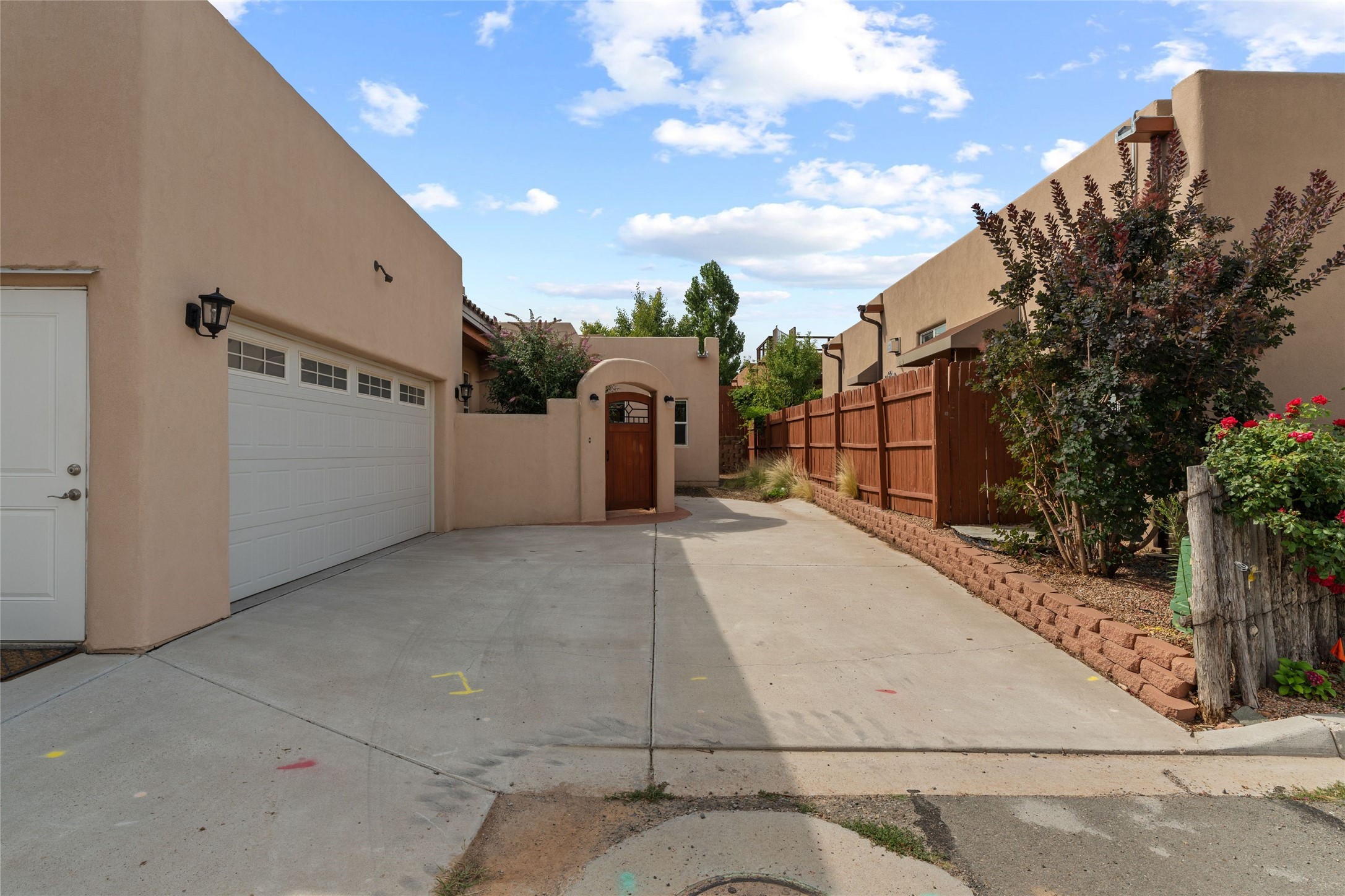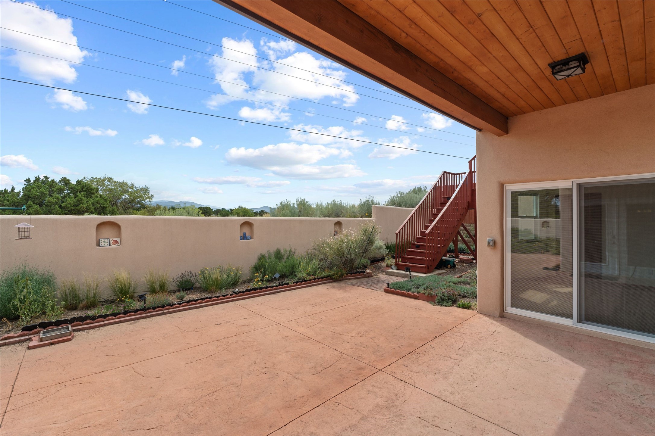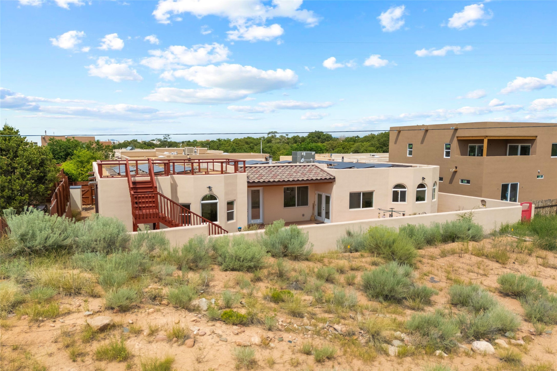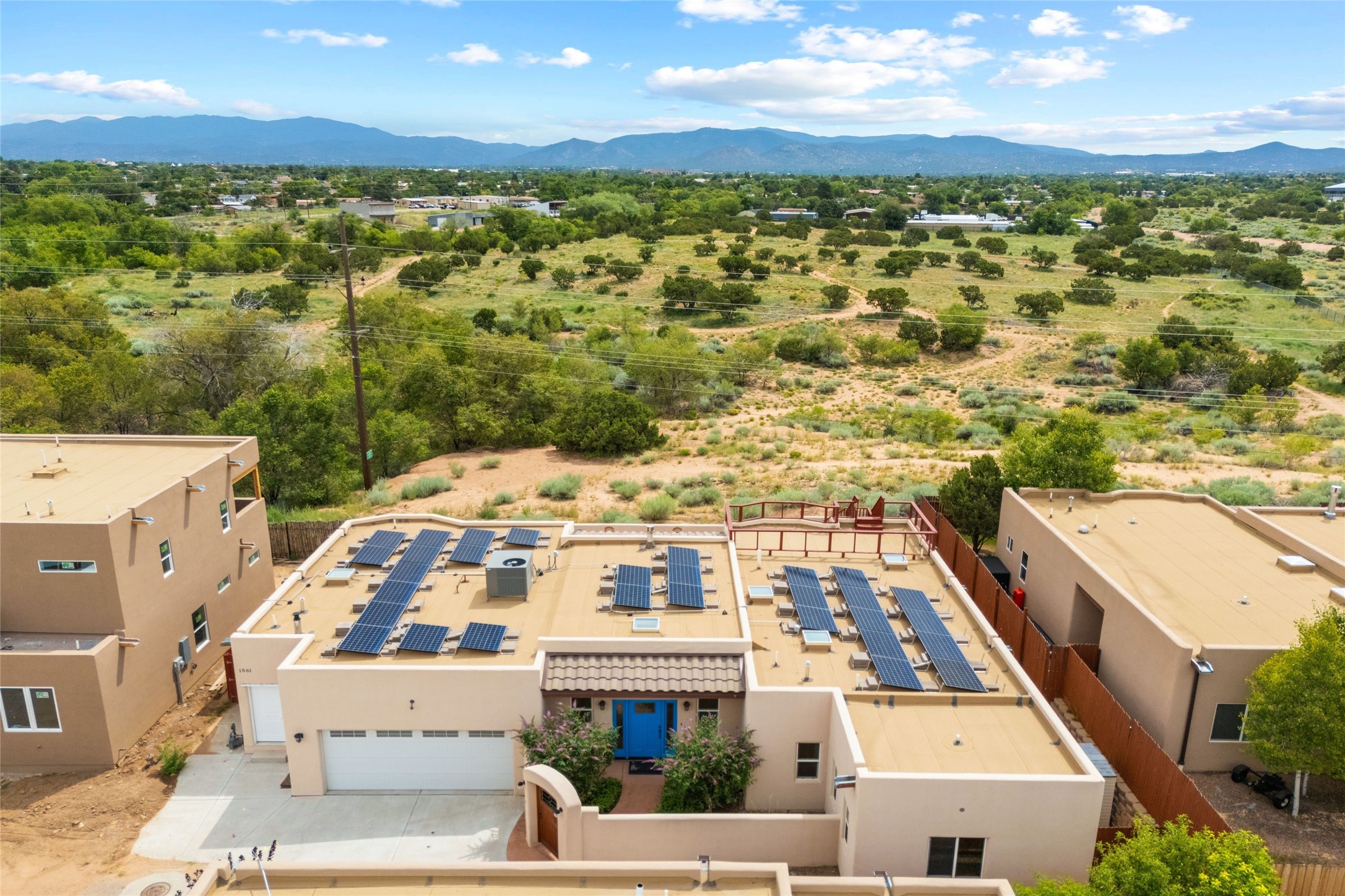 Kachina Ridge 3-bedroom, 2-bathroom residence, crafted by Master Green Builder Arch Sproul, showcases numerous custom upgrades and green features, making it an eco-friendly choice for the modern homeowner. Wide doorways, nichos, and porcelain tile and hardwood hickory floors throughout. The solid knotty pine doors add a touch of rustic charm, while the enlarged living room with log vigas and a gas fireplace with a flagstone hearth, invites you to unwind in style. The bright, east-facing kitchen is appointed with a center island, solid maple cabinets finished in natural tones, Silestone quartz countertops and Energy Star Appliances. The primary suite includes a walk-in closet and en-suite bath with soaking tub and walk-in shower. The two guest bedrooms offer versatile options, whether you need a studio, office, or additional space for visitors. Plus, a bonus room awaits your creativity--perfect for exercise or artistic endeavors. Step outside to the expansive back portal featuring a tongue and groove ceiling, where you can enjoy al fresco dining. The front and backyard gardens are thoughtfully designed with low-water perennials and buried irrigation lines. Enlarged, fully finished garage with 10-foot ceiling and overhead storage. Equipped with 30 photovoltaic panels installed by Positive Energy, you can enjoy lower energy costs while reducing your carbon footprint. The Kachina Ridge Subdivision homes are located adjacent to a greenbelt with no through streets. Convenient city location close to shopping, restaurants and the Santa Fe Plaza.