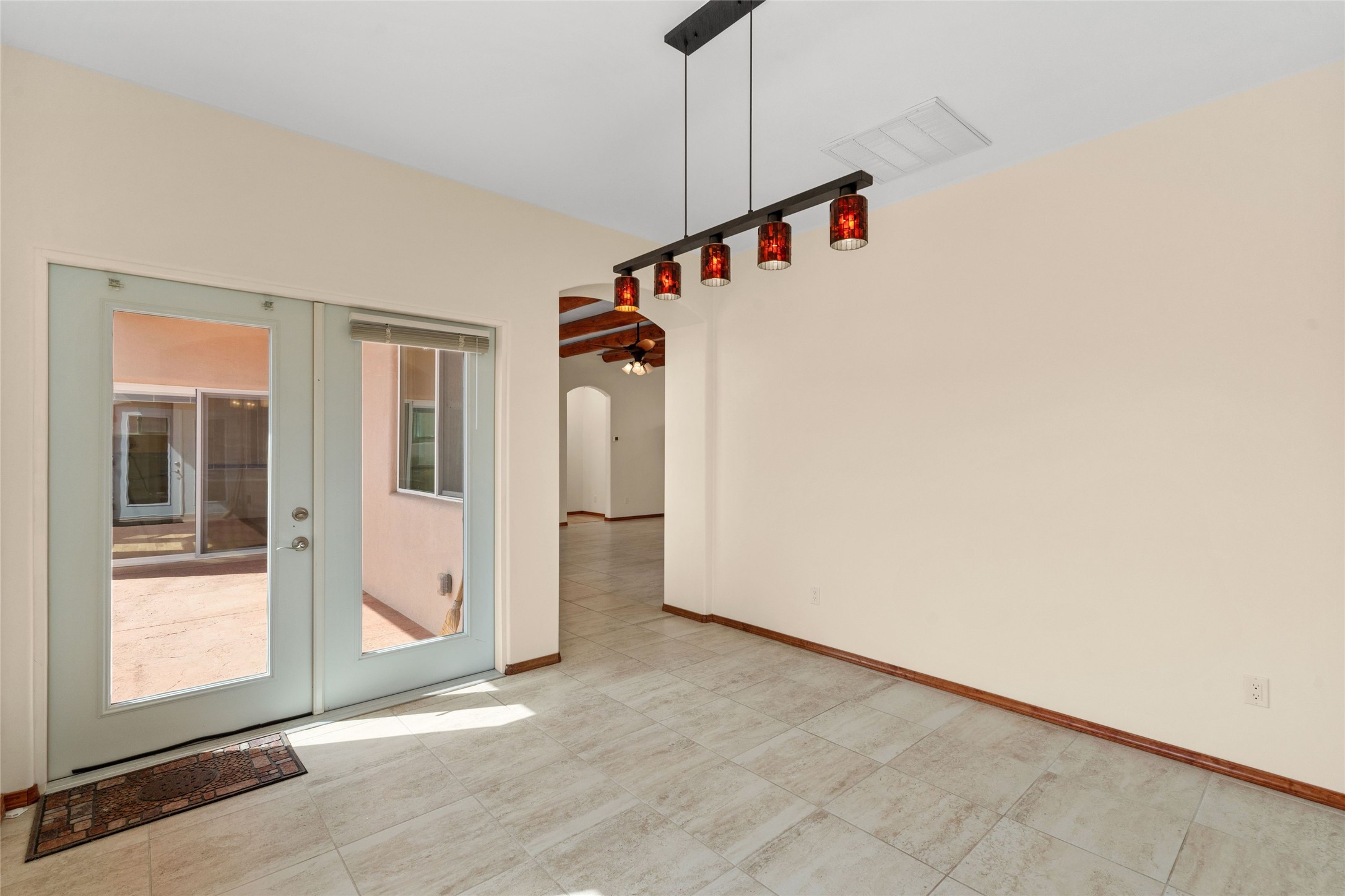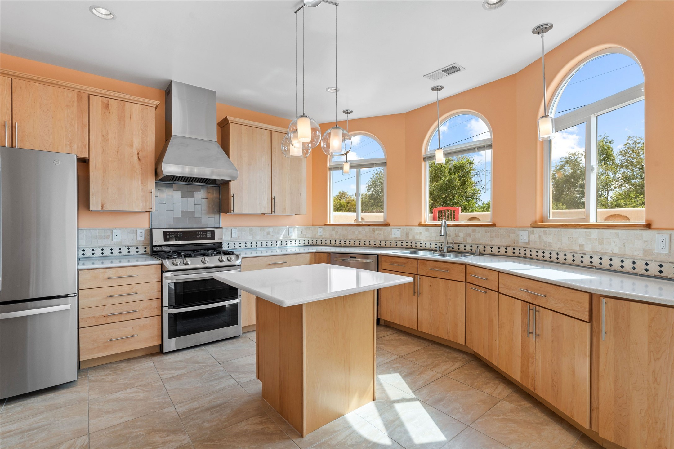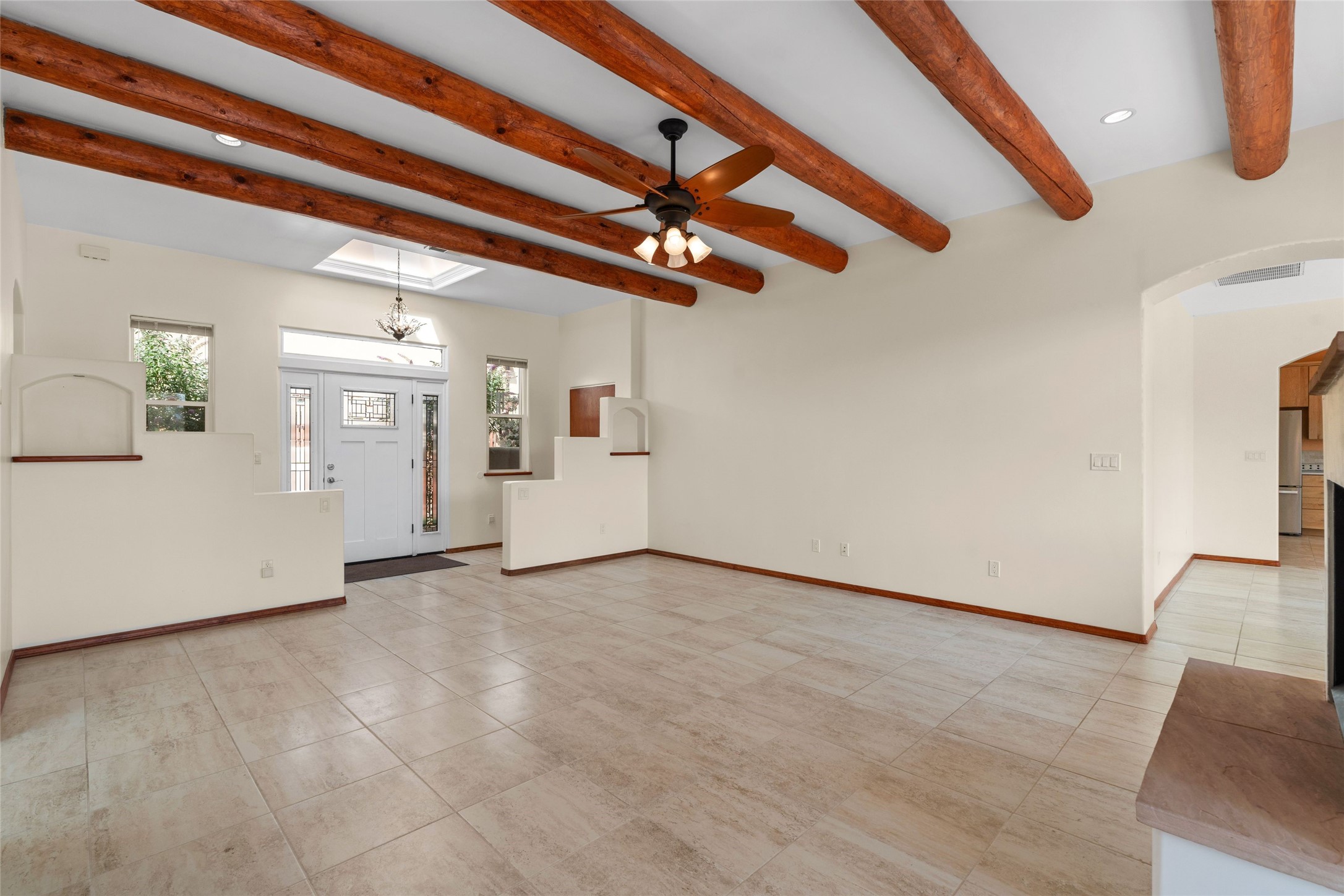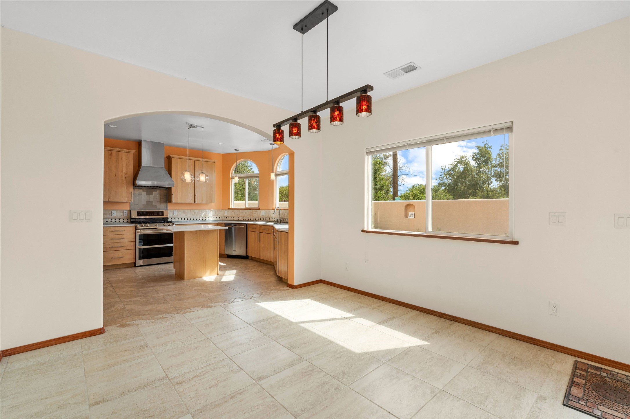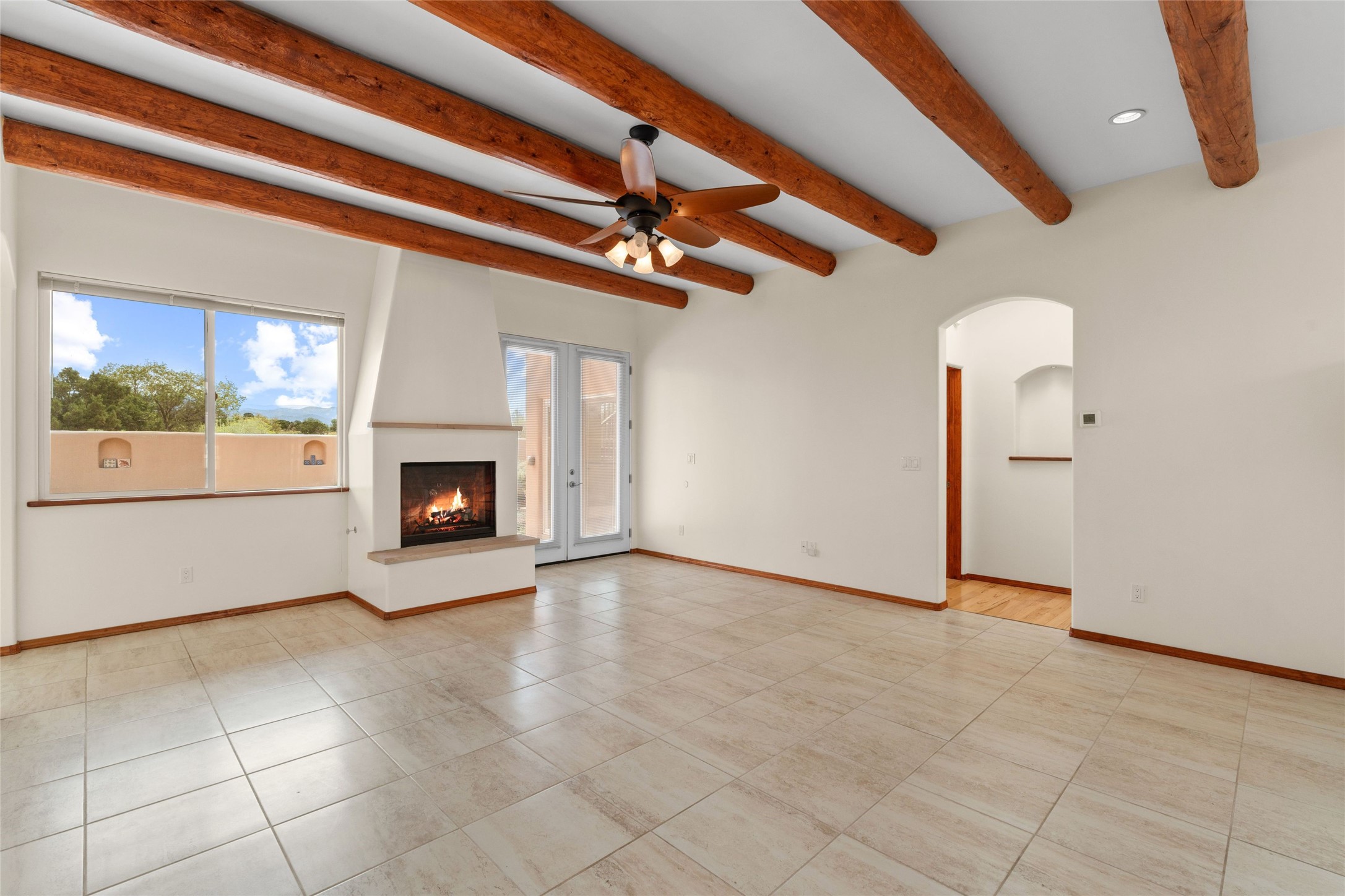 Kachina Ridge 3-bedroom, 2-bathroom residence, crafted by Master Green Builder Arch Sproul, showcases numerous custom upgrades and green features, making it an eco-friendly choice for the modern homeowner. Wide doorways, nichos, and porcelain tile and hardwood hickory floors throughout. The solid knotty pine doors add a touch of rustic charm, while the enlarged living room with log vigas and a gas fireplace with a flagstone hearth, invites you to unwind in style. The bright, east-facing kitchen is appointed with a center island, solid maple cabinets finished in natural tones, Silestone quartz countertops and Energy Star Appliances. The primary suite includes a walk-in closet and en-suite bath with soaking tub and walk-in shower. The two guest bedrooms offer versatile options, whether you need a studio, office, or additional space for visitors. Plus, a bonus room awaits your creativity--perfect for exercise or artistic endeavors. Step outside to the expansive back portal featuring a tongue and groove ceiling, where you can enjoy al fresco dining. The front and backyard gardens are thoughtfully designed with low-water perennials and buried irrigation lines. Enlarged, fully finished garage with 10-foot ceiling and overhead storage. Equipped with 30 photovoltaic panels installed by Positive Energy, you can enjoy lower energy costs while reducing your carbon footprint. The Kachina Ridge Subdivision homes are located adjacent to a greenbelt with no through streets. Convenient city location close to shopping, restaurants and the Santa Fe Plaza.