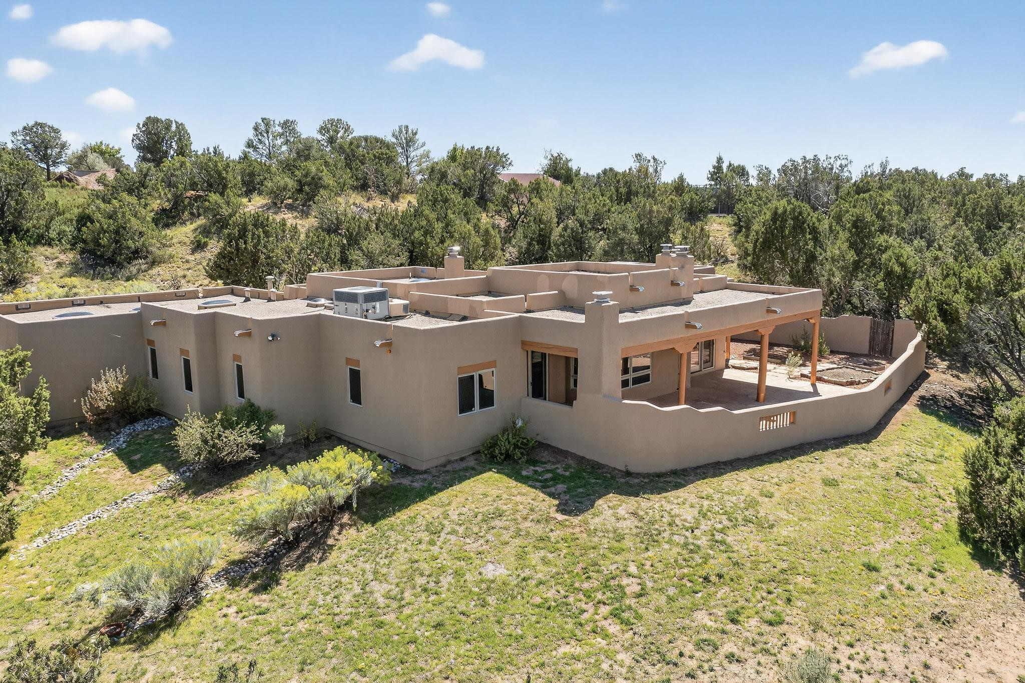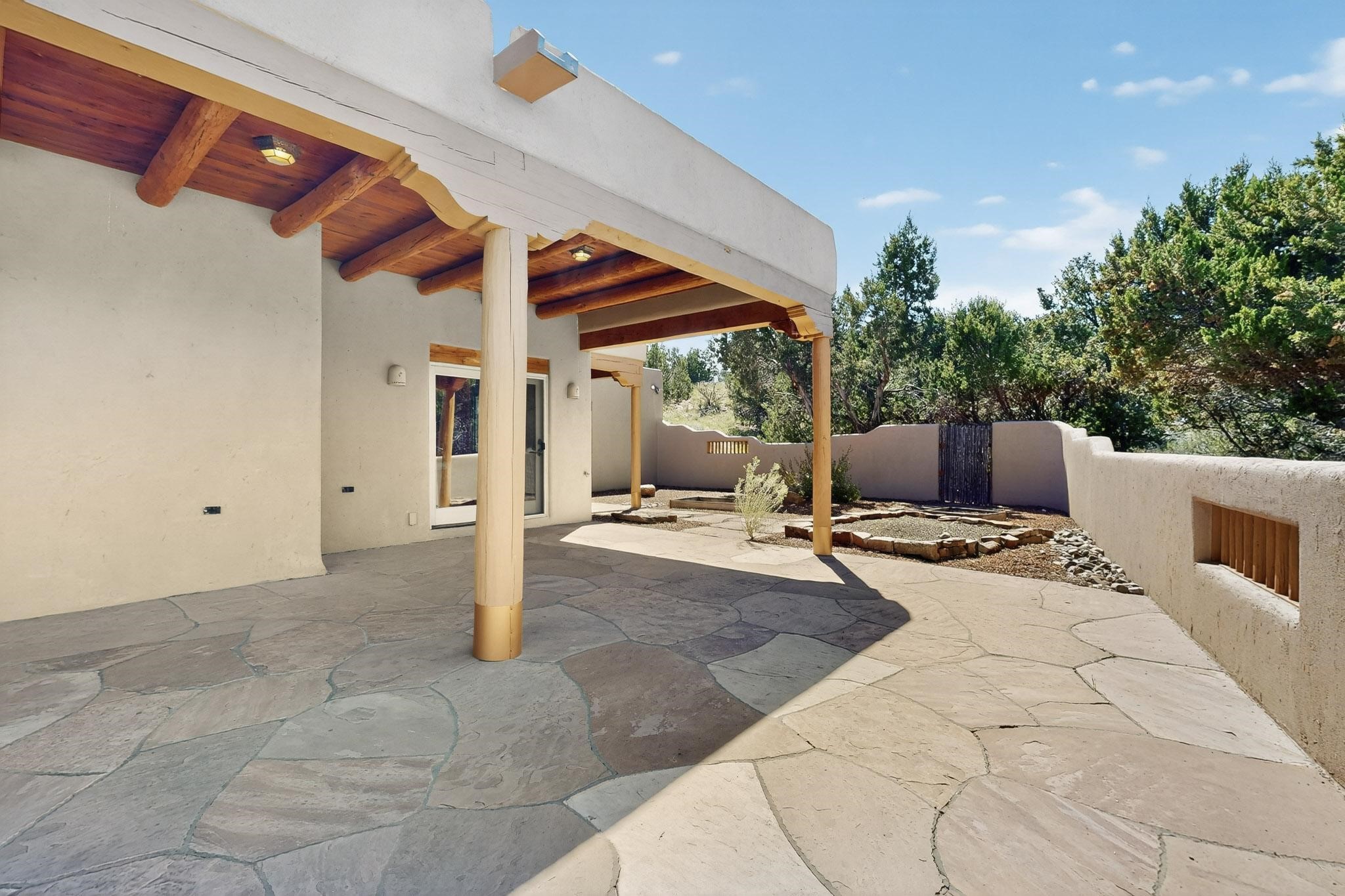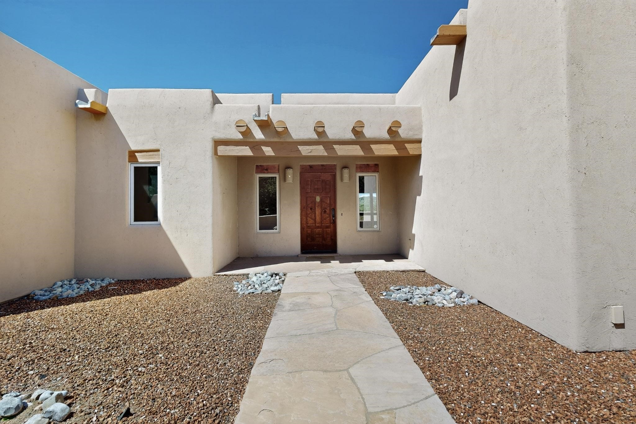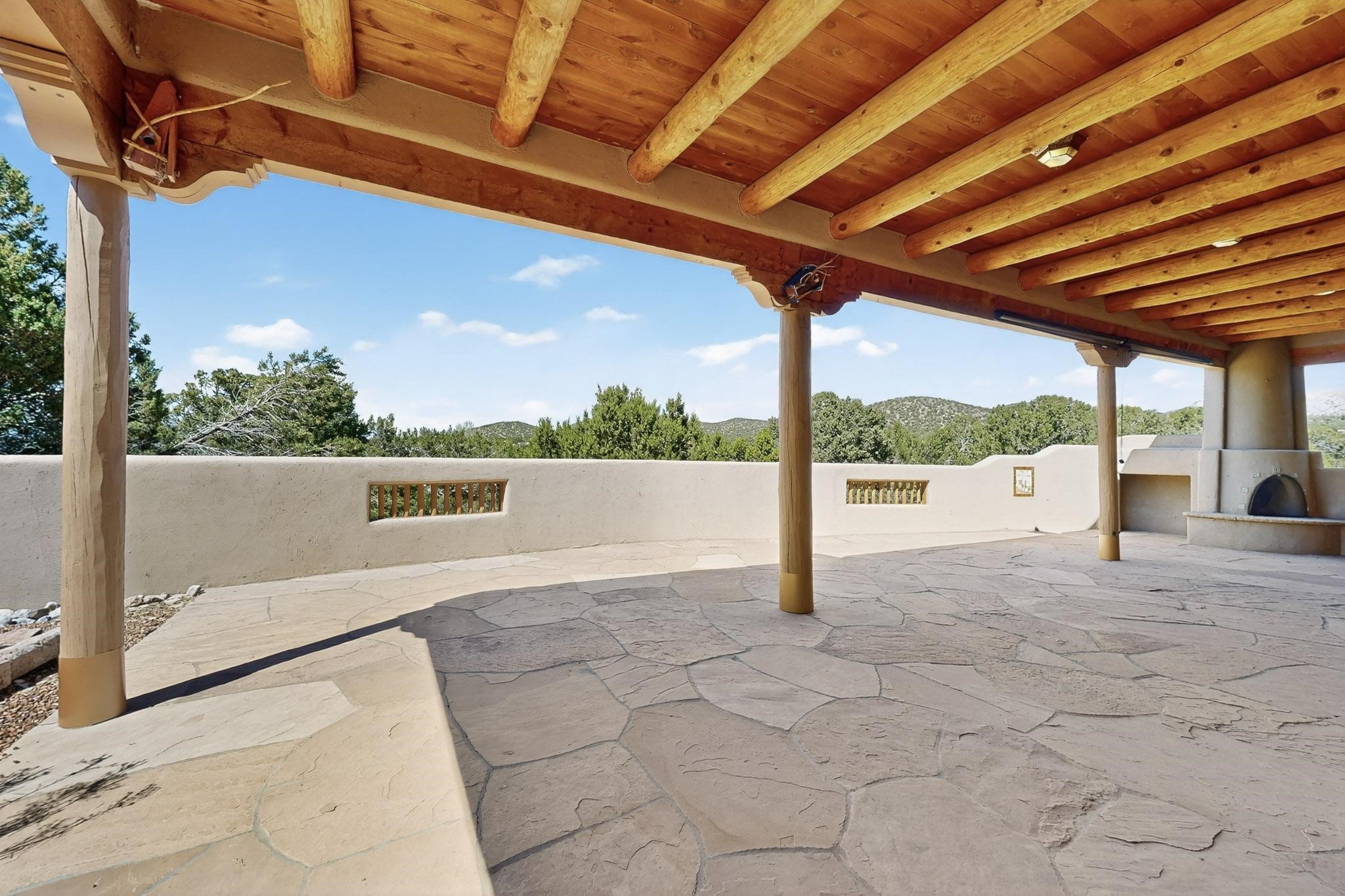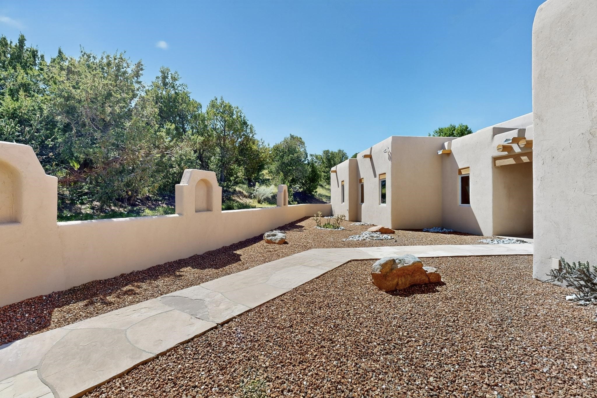 A rare offering in coveted Belicia Estates, custom designed and built this grand Santa Fe pueblo home delights the eye. From gleaming Saltillo tile floors to high viga ceilings, featuring lighted nichos, corbelled beams, 3 traditional kiva fireplaces, a pizza kiva in the kitchen plus an outside kiva for entertainment on the portal. Open plan, split bedroom floorpan creates a separate owners suite with 2 separate bathrooms, a large walk in closet and a separate study/office. There is a grand living room plus family/play room plus formal dining off the kitchen leading out to a wonderfully private walled outside entertainment area with foothill mountain views from the portal. There is a fun chefs kitchen with sunny breakfast nook and large island. There is a separate 2 bedroom and bath guest suite, and convenient laundry room which leads to the spacious 3 car garage. Positioned at the end of a paved cul de sac on 4.3acres close to the gated entry it is within easy reach to 2 local shopping centers, the Galisteo preserve and only minutes into historic Santa Fe. A must see:)