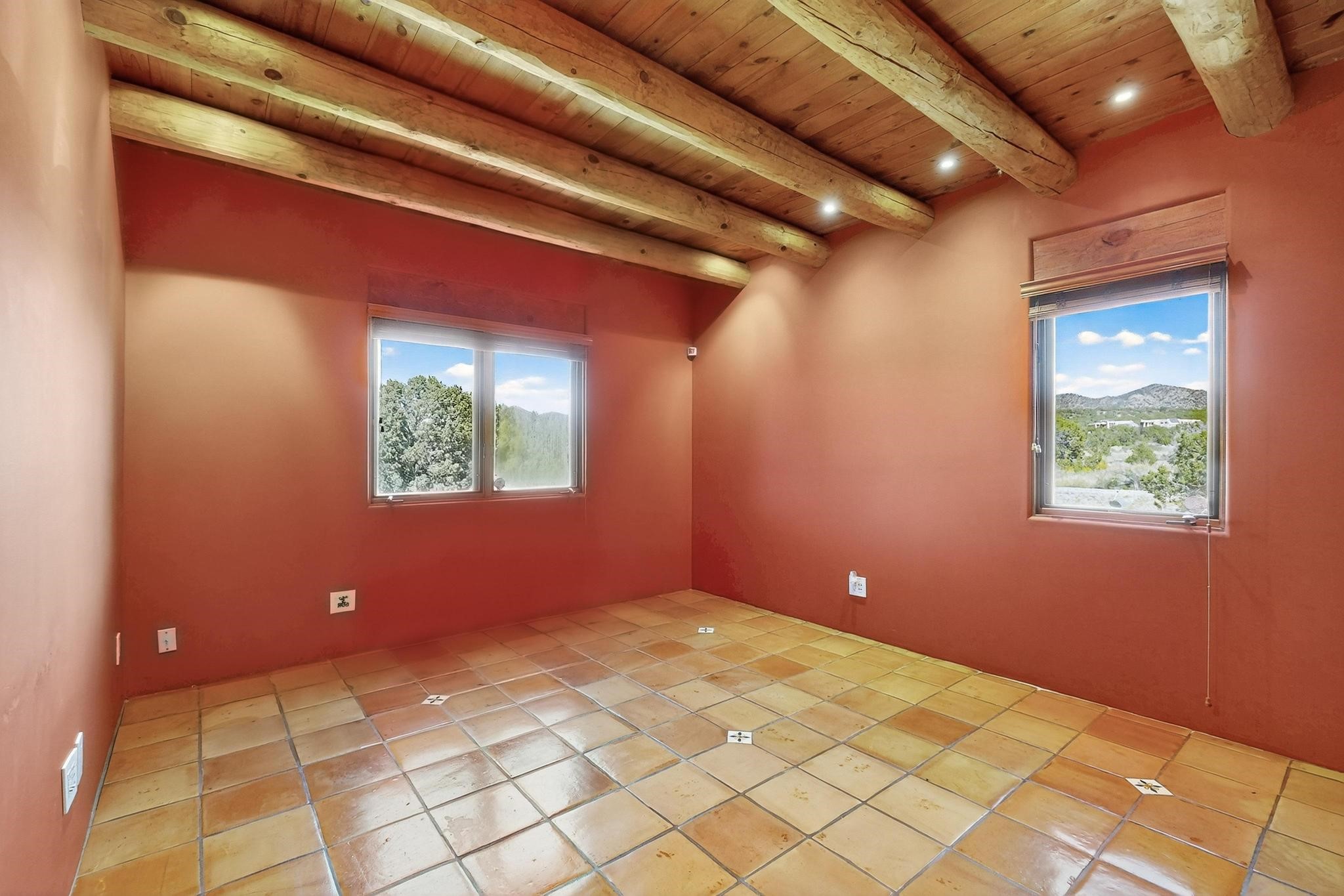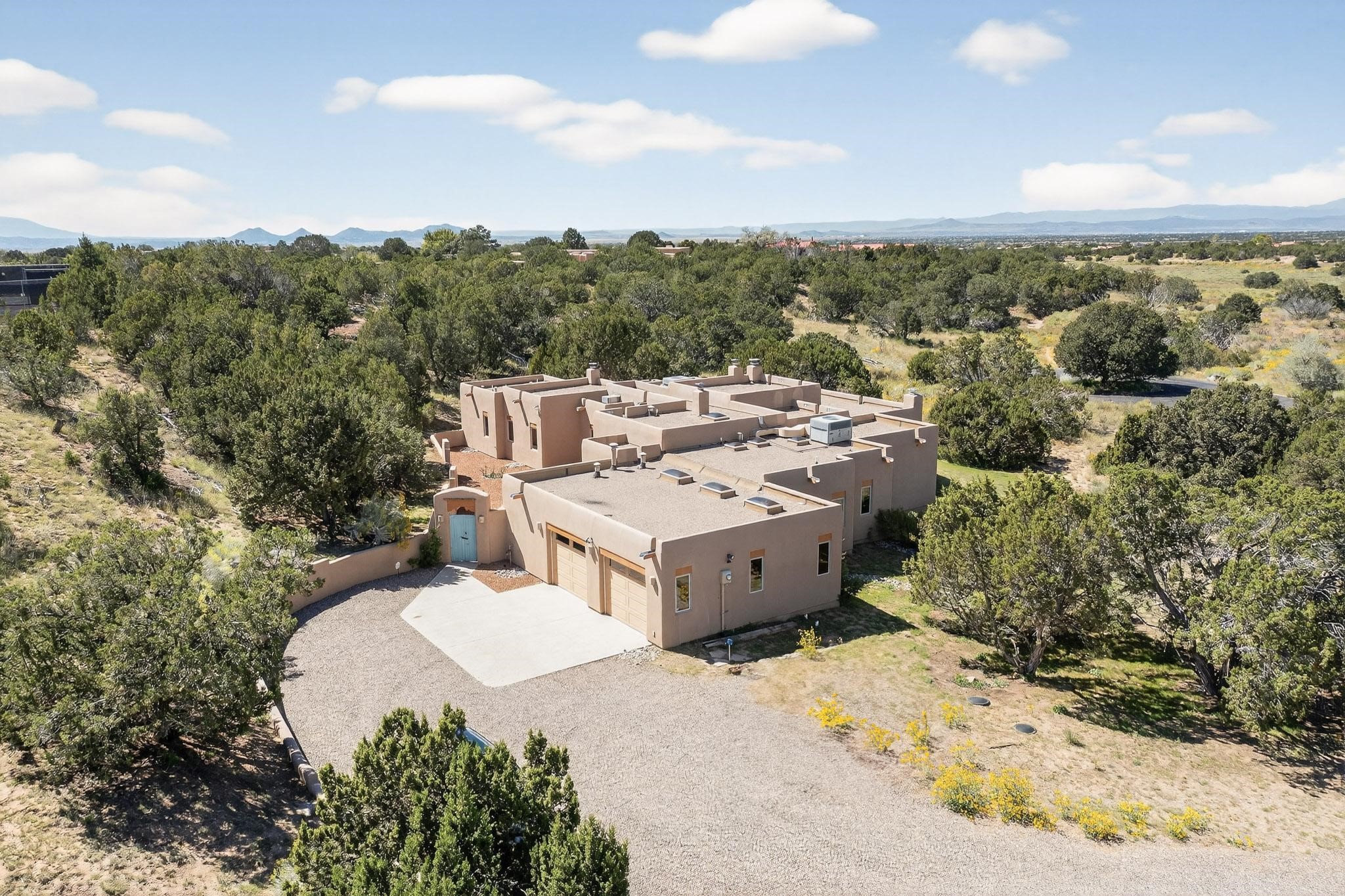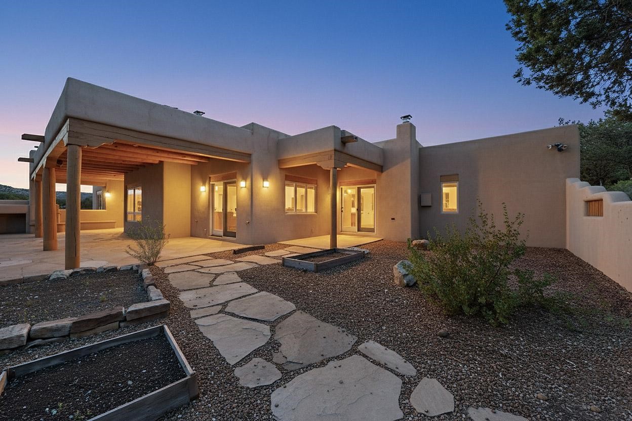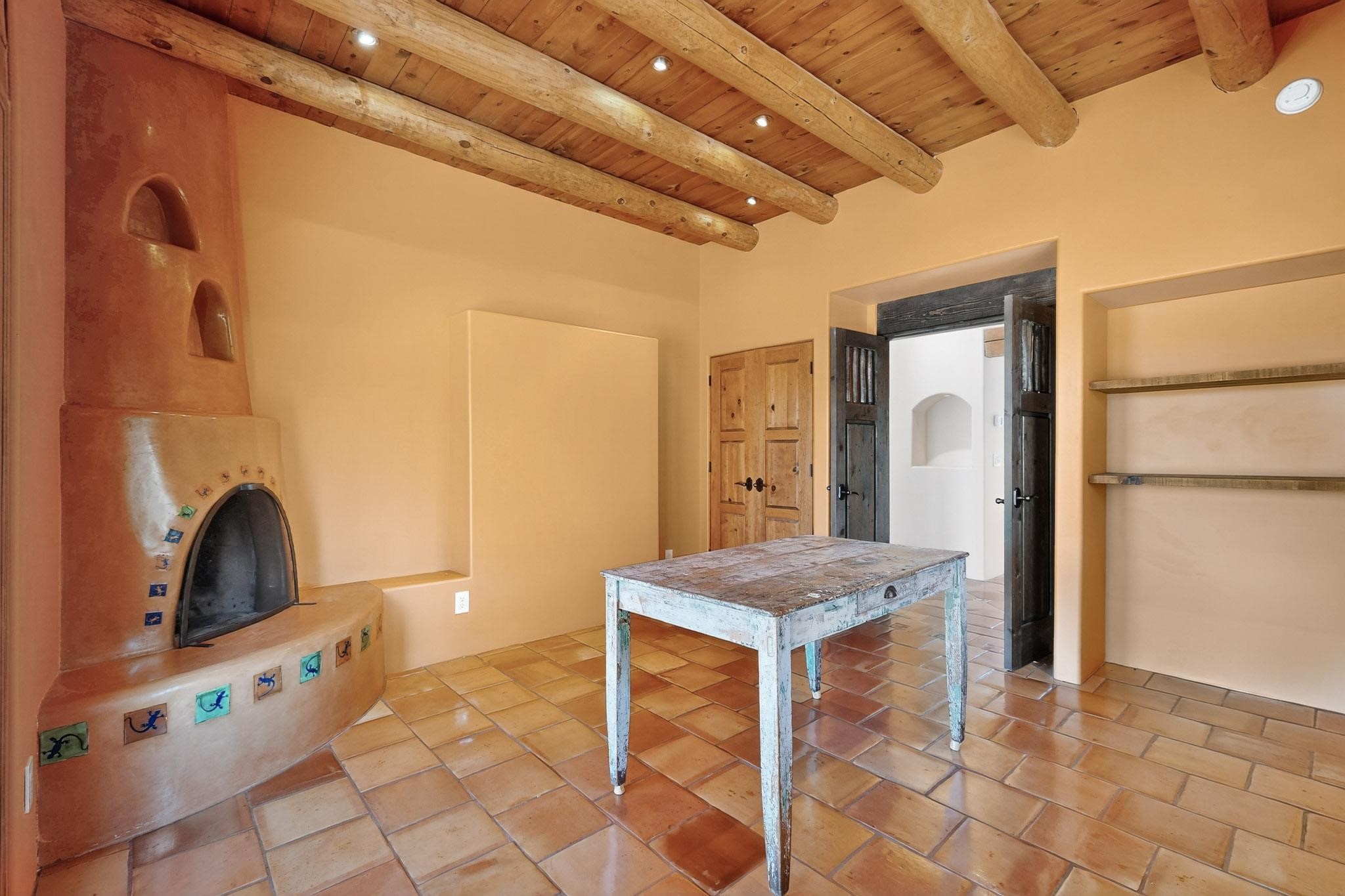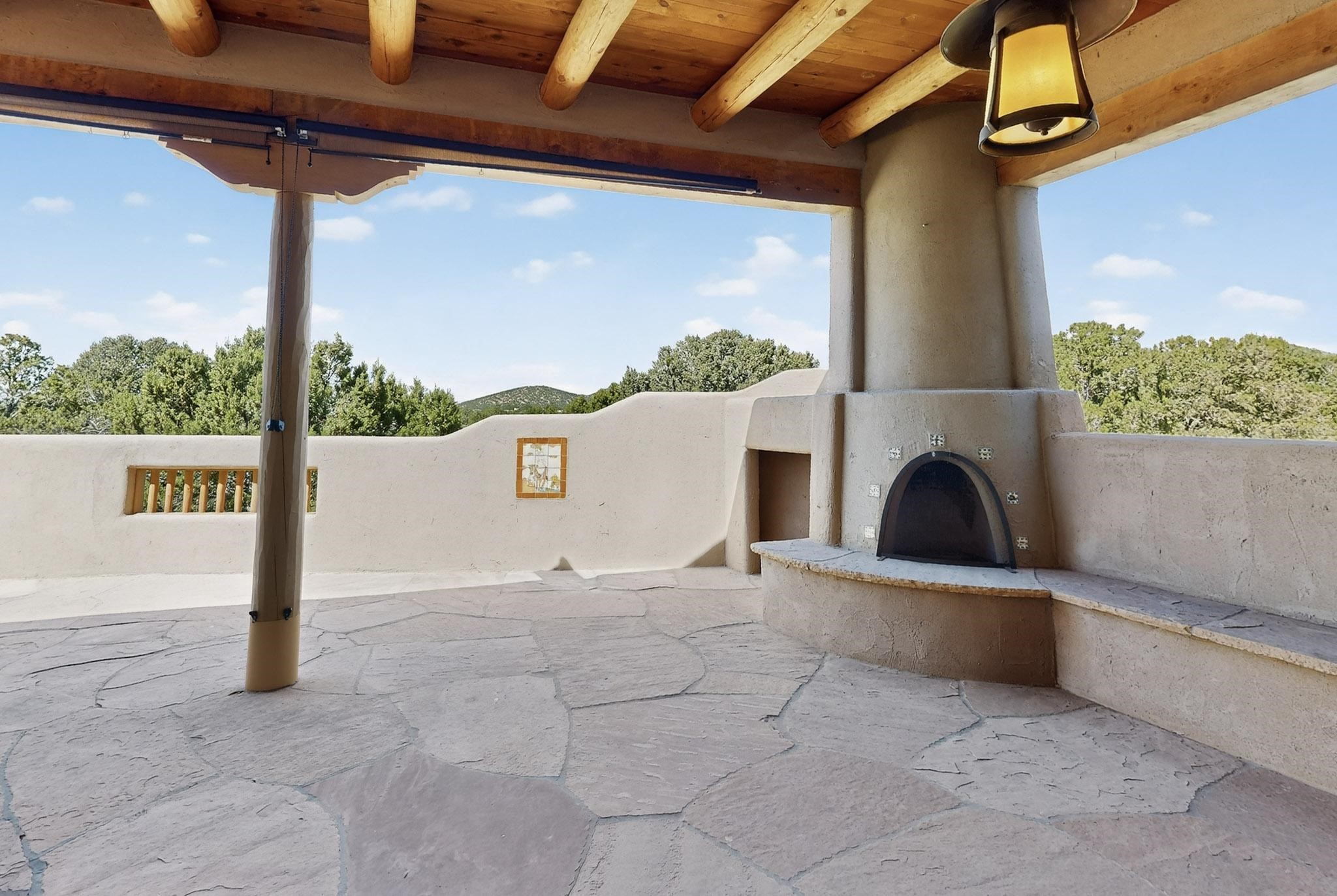 A rare offering in coveted Belicia Estates, custom designed and built this grand Santa Fe pueblo home delights the eye. From gleaming Saltillo tile floors to high viga ceilings, featuring lighted nichos, corbelled beams, 3 traditional kiva fireplaces, a pizza kiva in the kitchen plus an outside kiva for entertainment on the portal. Open plan, split bedroom floorpan creates a separate owners suite with 2 separate bathrooms, a large walk in closet and a separate study/office. There is a grand living room plus family/play room plus formal dining off the kitchen leading out to a wonderfully private walled outside entertainment area with foothill mountain views from the portal. There is a fun chefs kitchen with sunny breakfast nook and large island. There is a separate 2 bedroom and bath guest suite, and convenient laundry room which leads to the spacious 3 car garage. Positioned at the end of a paved cul de sac on 4.3acres close to the gated entry it is within easy reach to 2 local shopping centers, the Galisteo preserve and only minutes into historic Santa Fe. A must see:)
