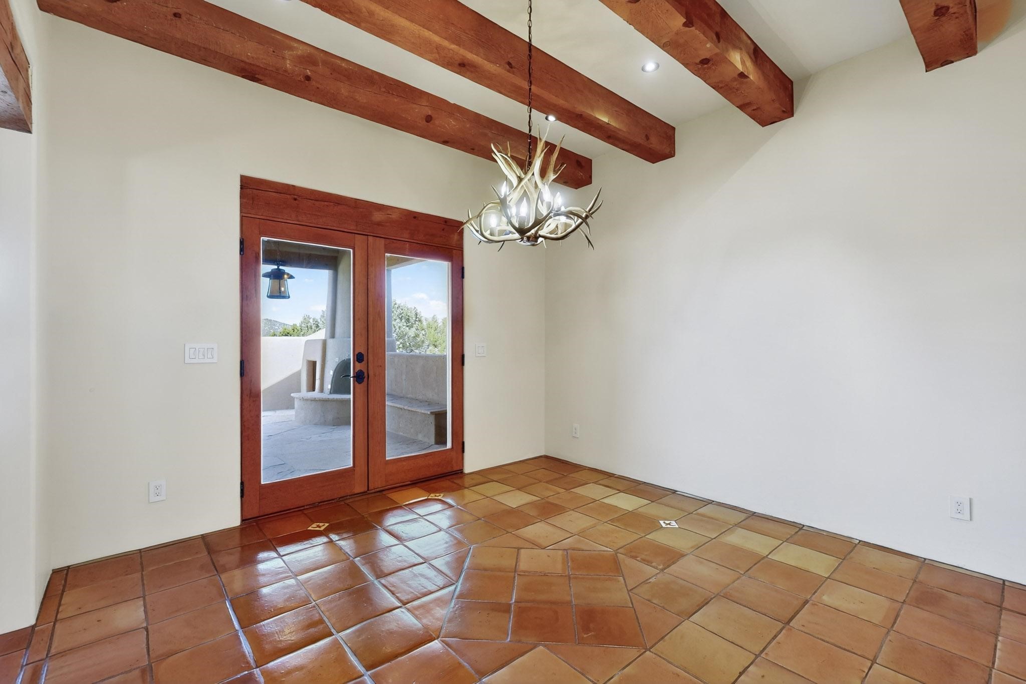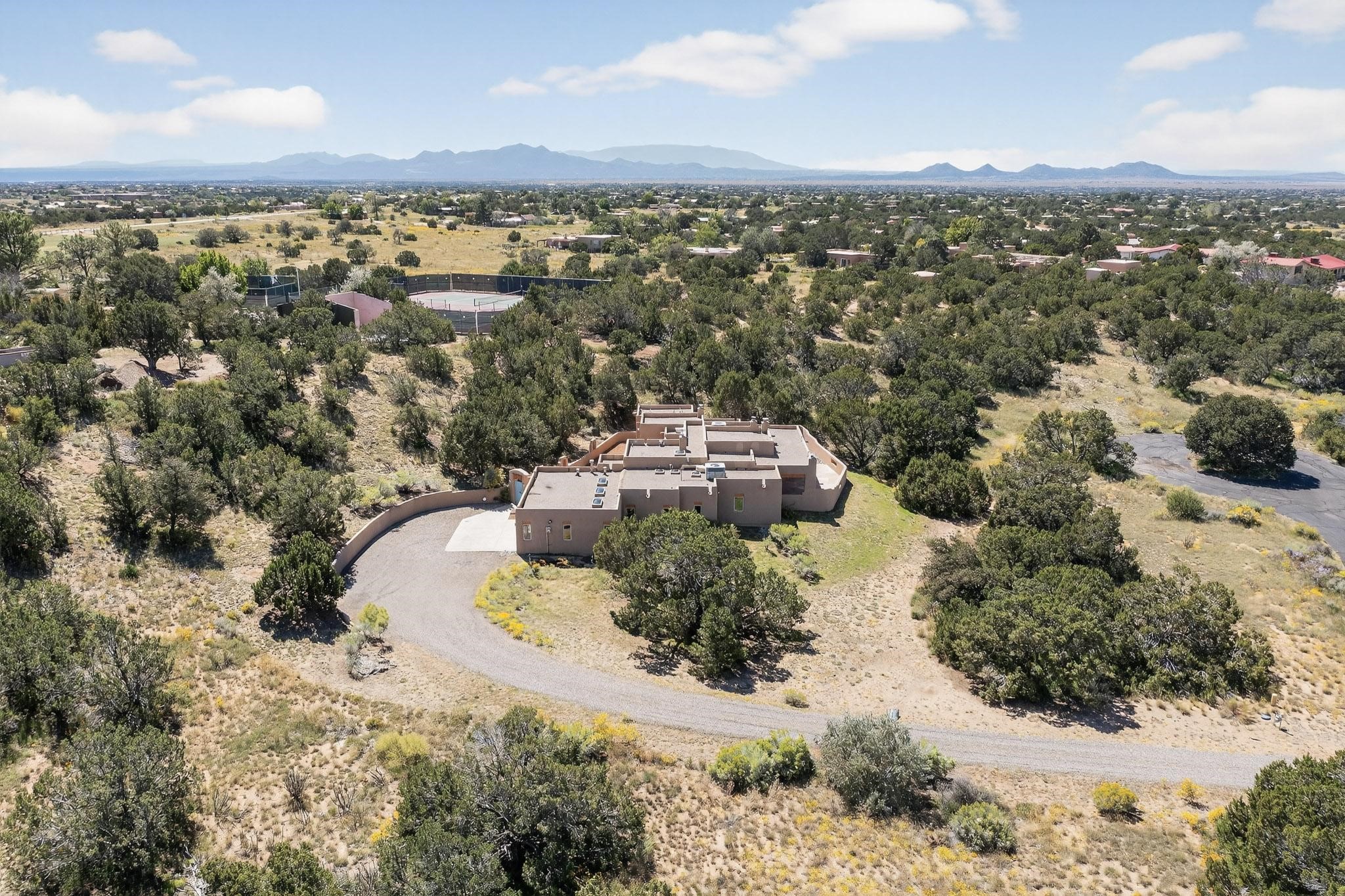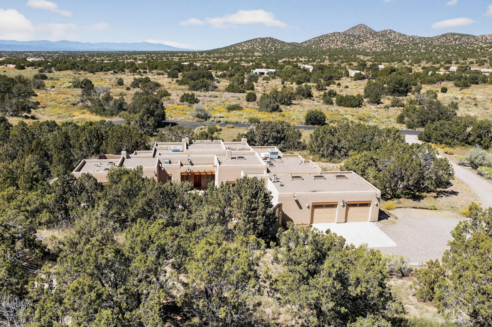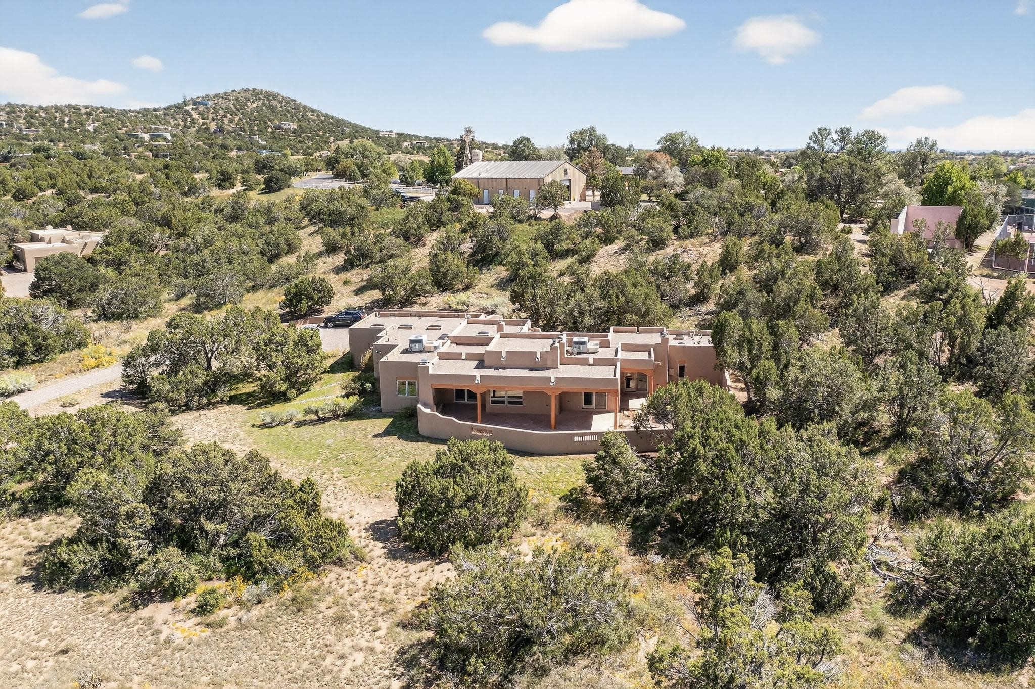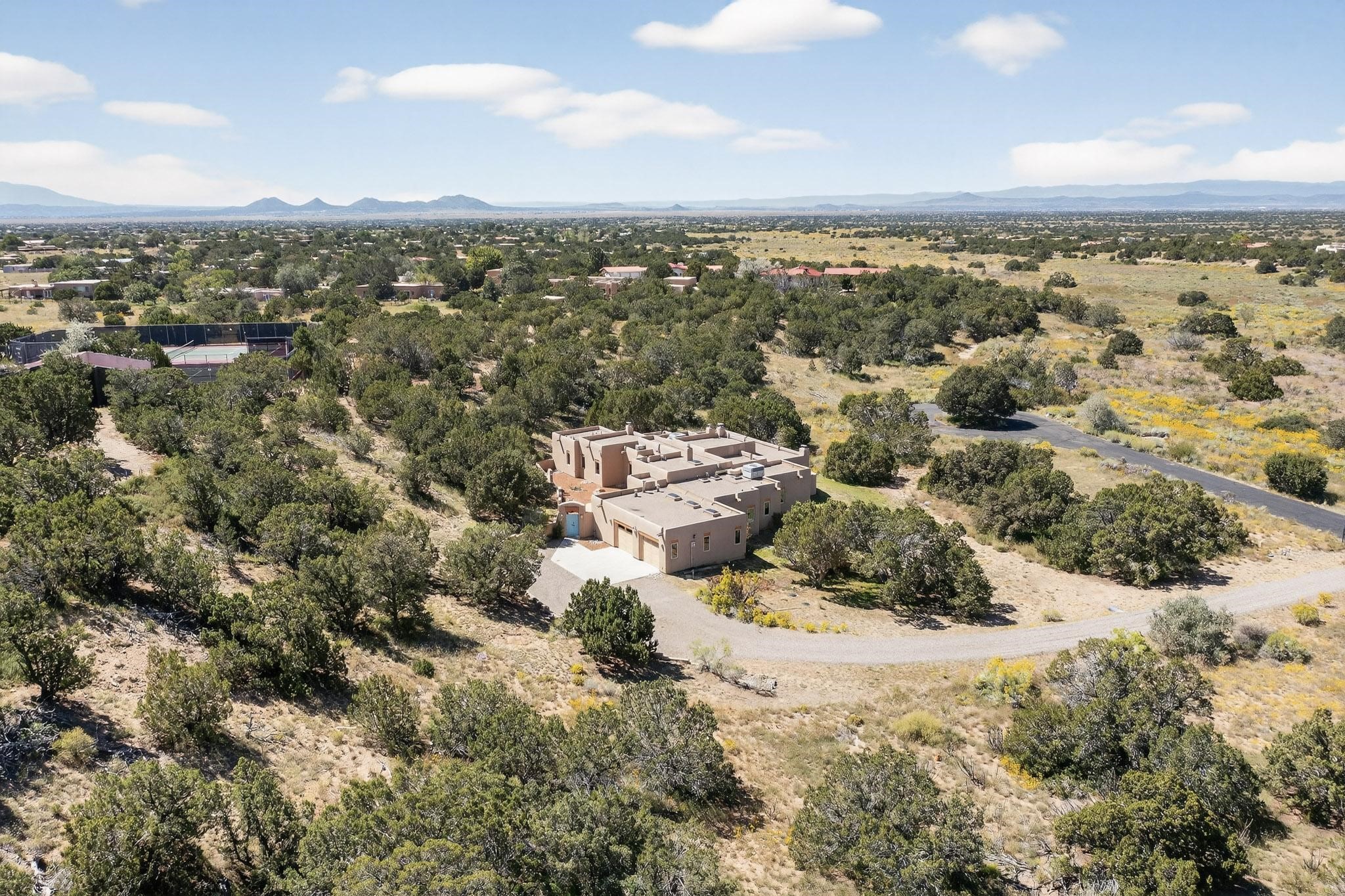 A rare offering in coveted Belicia Estates, custom designed and built this grand Santa Fe pueblo home delights the eye. From gleaming Saltillo tile floors to high viga ceilings, featuring lighted nichos, corbelled beams, 3 traditional kiva fireplaces, a pizza kiva in the kitchen plus an outside kiva for entertainment on the portal. Open plan, split bedroom floorpan creates a separate owners suite with 2 separate bathrooms, a large walk in closet and a separate study/office. There is a grand living room plus family/play room plus formal dining off the kitchen leading out to a wonderfully private walled outside entertainment area with foothill mountain views from the portal. There is a fun chefs kitchen with sunny breakfast nook and large island. There is a separate 2 bedroom and bath guest suite, and convenient laundry room which leads to the spacious 3 car garage. Positioned at the end of a paved cul de sac on 4.3acres close to the gated entry it is within easy reach to 2 local shopping centers, the Galisteo preserve and only minutes into historic Santa Fe. A must see:)