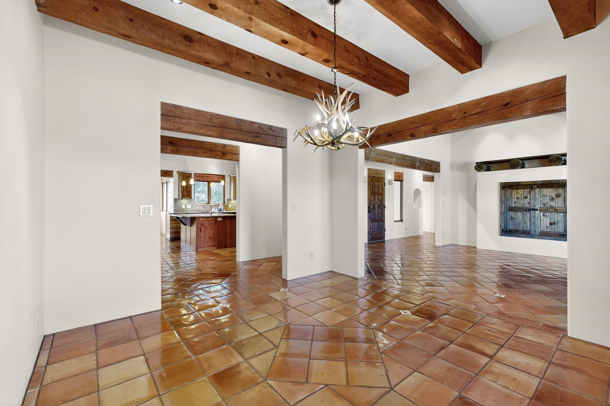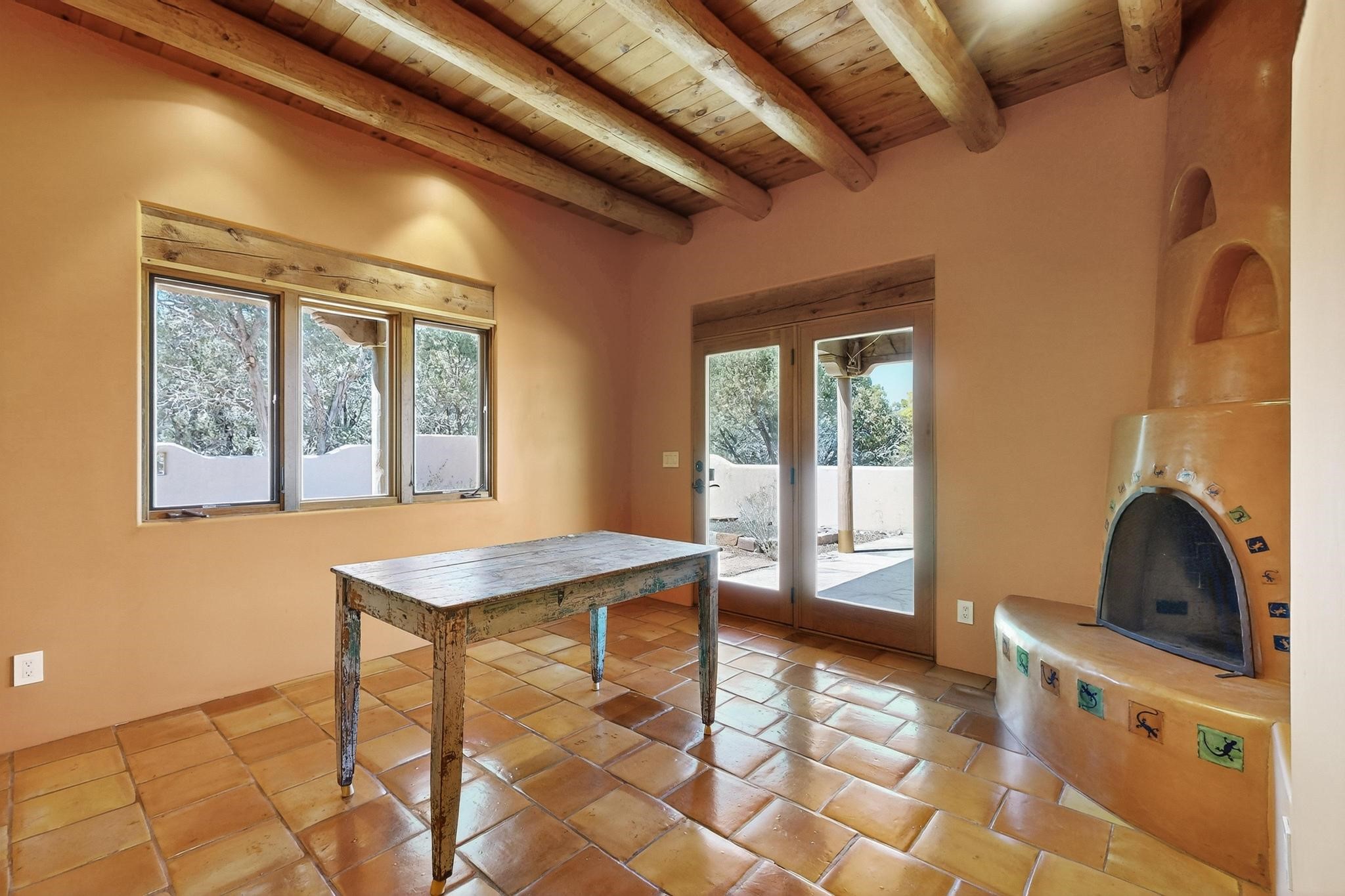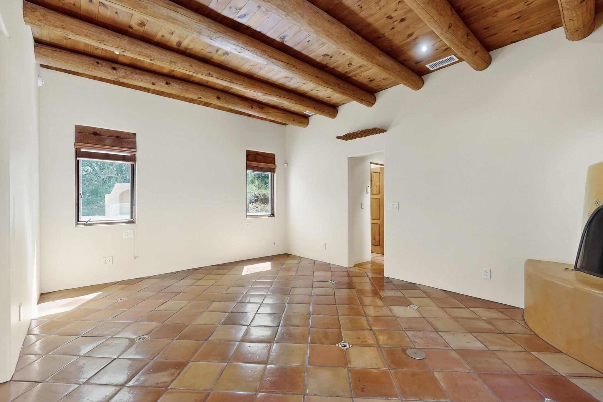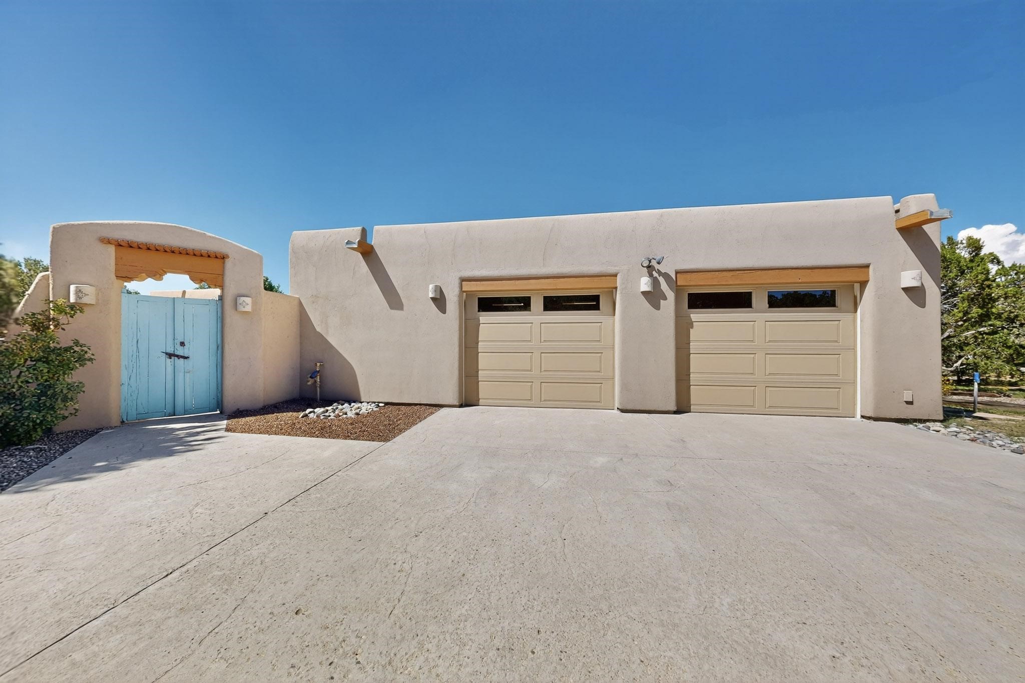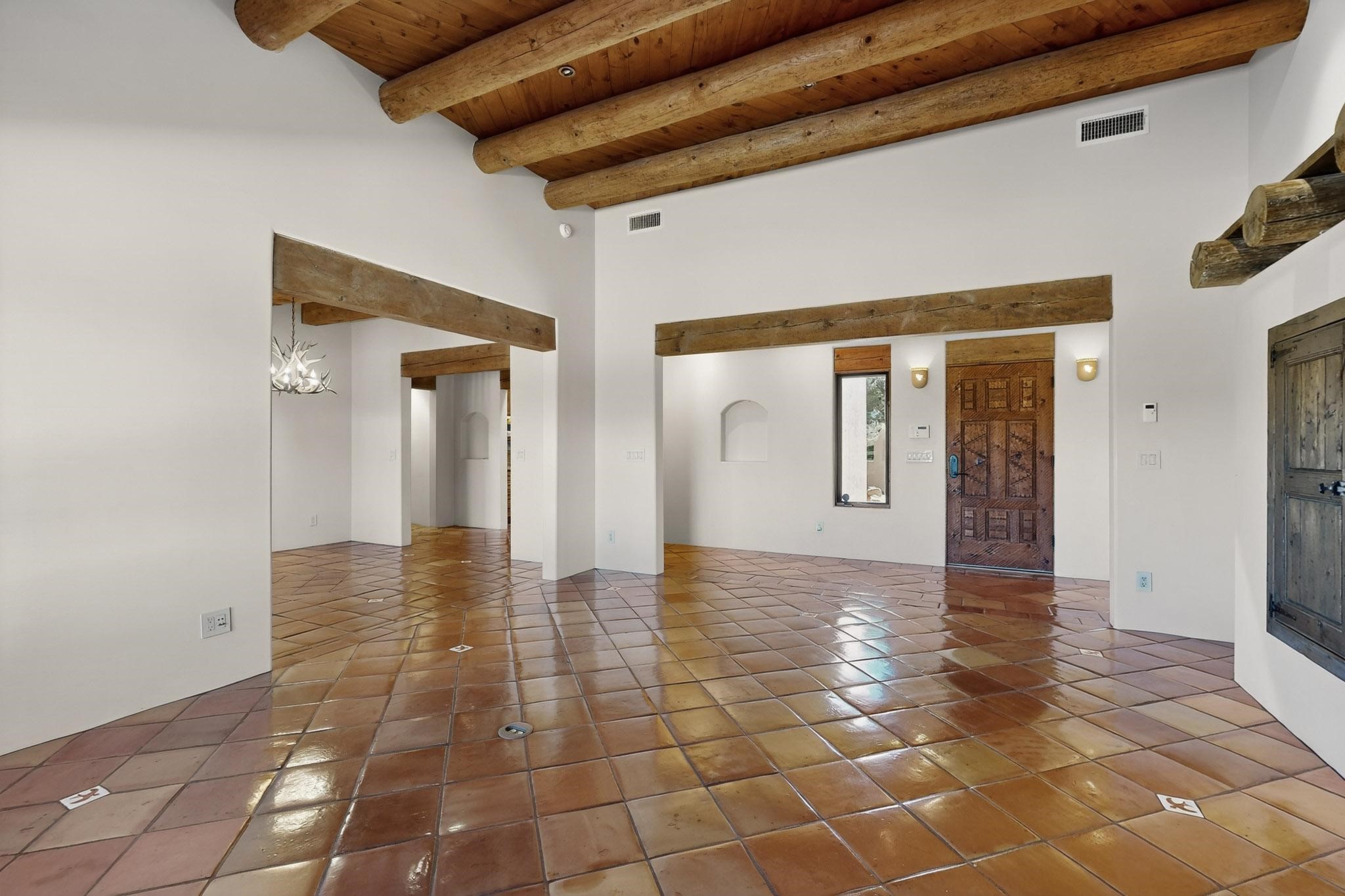 A rare offering in coveted Belicia Estates, custom designed and built this grand Santa Fe pueblo home delights the eye. From gleaming Saltillo tile floors to high viga ceilings, featuring lighted nichos, corbelled beams, 3 traditional kiva fireplaces, a pizza kiva in the kitchen plus an outside kiva for entertainment on the portal. Open plan, split bedroom floorpan creates a separate owners suite with 2 separate bathrooms, a large walk in closet and a separate study/office. There is a grand living room plus family/play room plus formal dining off the kitchen leading out to a wonderfully private walled outside entertainment area with foothill mountain views from the portal. There is a fun chefs kitchen with sunny breakfast nook and large island. There is a separate 2 bedroom and bath guest suite, and convenient laundry room which leads to the spacious 3 car garage. Positioned at the end of a paved cul de sac on 4.3acres close to the gated entry it is within easy reach to 2 local shopping centers, the Galisteo preserve and only minutes into historic Santa Fe. A must see:)