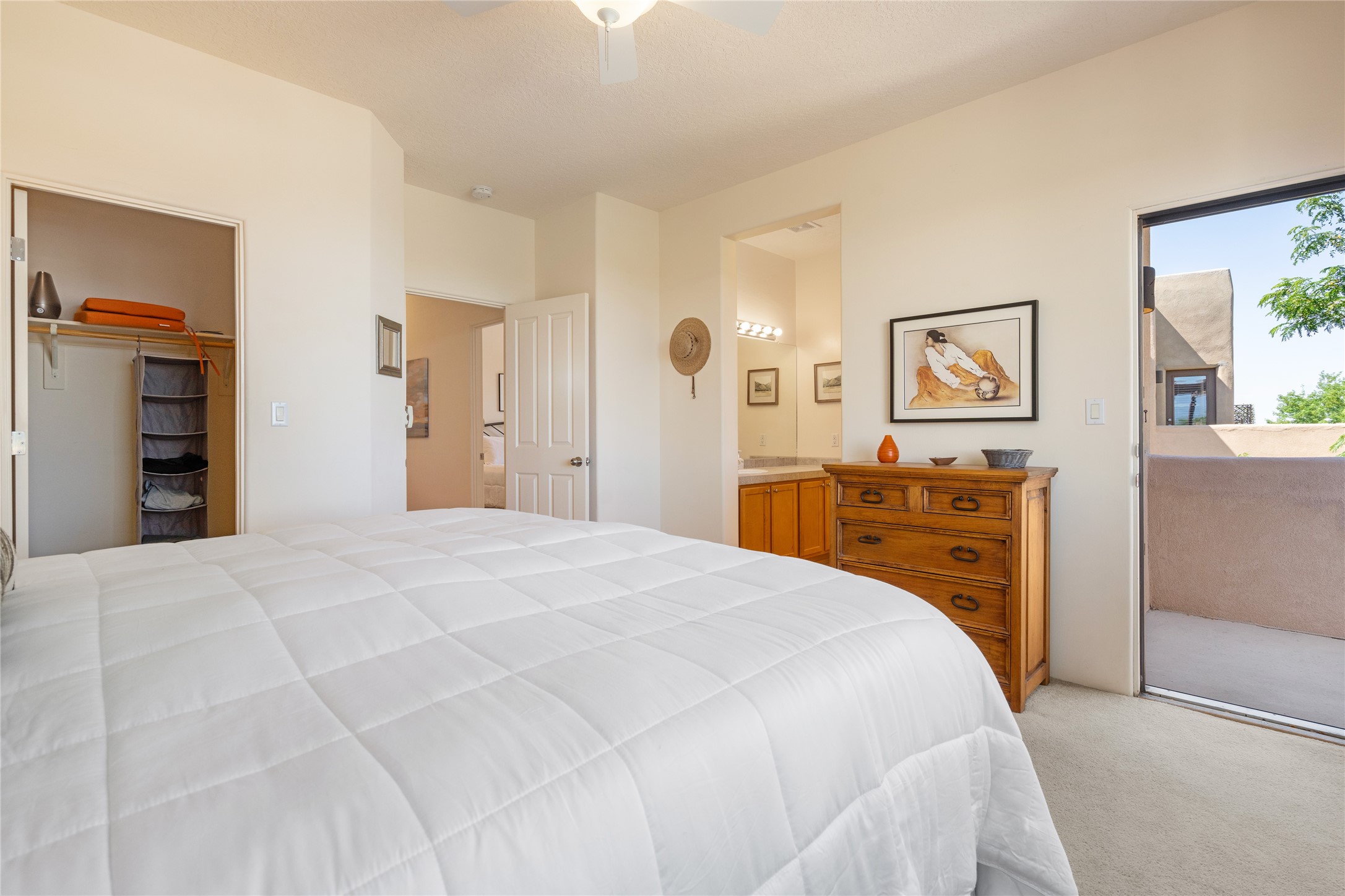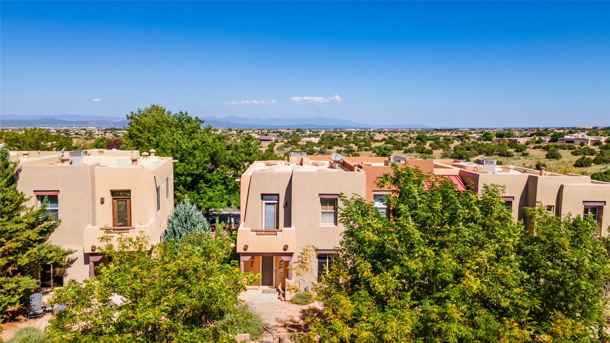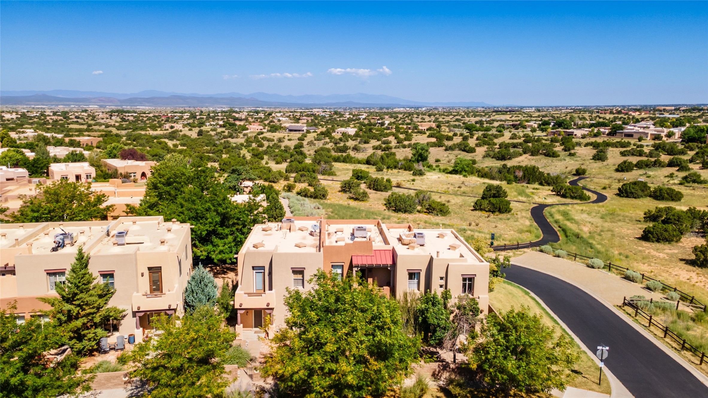 The seller will pay 1 YEAR HOA DUES with an acceptable offer for this Outstanding Windmill Ridge Townhome! So lightly lived in, you'll be amazed at its pristine condition! Located in the desirable Windmill Ridge area of Rancho Viejo, this turn-key property is ideal for full-time living or as a low-maintenance lock-and-leave. The main living area features beautiful tile floors and a soaring 20-foot ceiling, creating an open and expansive feel. A charming gas kiva fireplace, vigas, and wood ceilings add authentic Santa Fe warmth. The kitchen offers generous storage within maple cabinetry, complemented by soft neutral-toned tile countertops. A convenient laundry room and powder bath are located on the main level. Upstairs, a versatile loft provides the perfect space for a home office, media area, or reading nook, complete with a small balcony overlooking southern views and the neighborhood park. The primary suite boasts its own spacious balcony with sweeping views of designated open space and both the Jemez and Sangre de Cristo mountains. This immaculate home is part of a welcoming community featuring over 12 miles of paved walking trails, multiple parks, and an active HOA. Exterior maintenance is included in the townhome dues, making for stress-free living. Priced to sell and ready for its next owner!