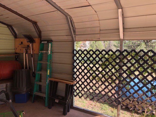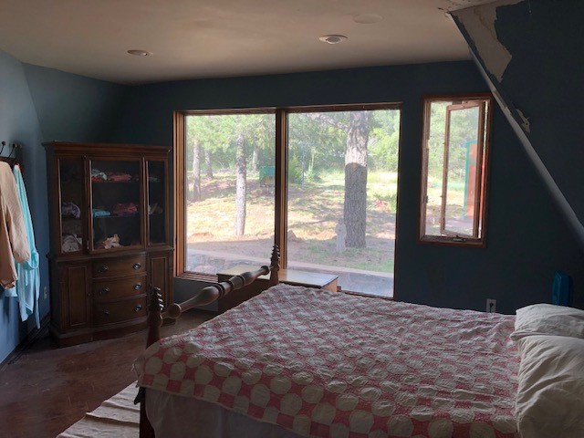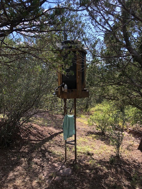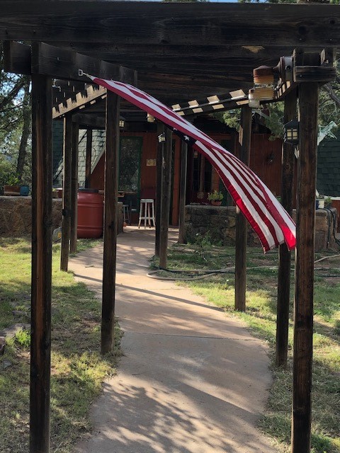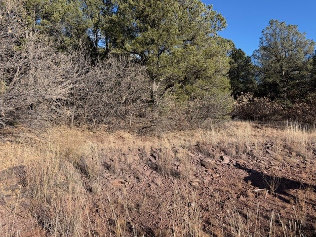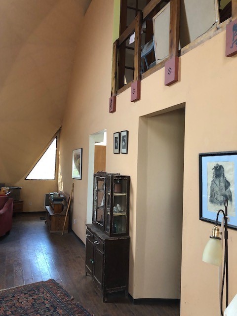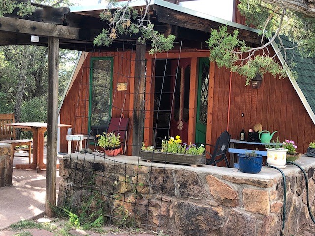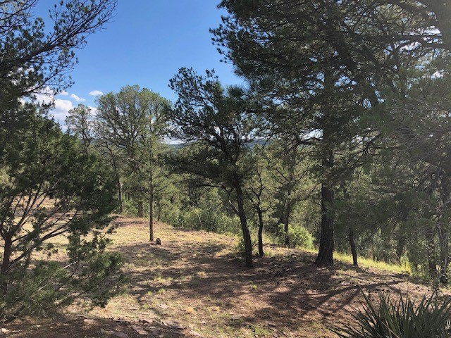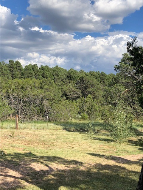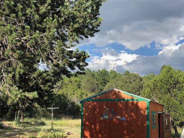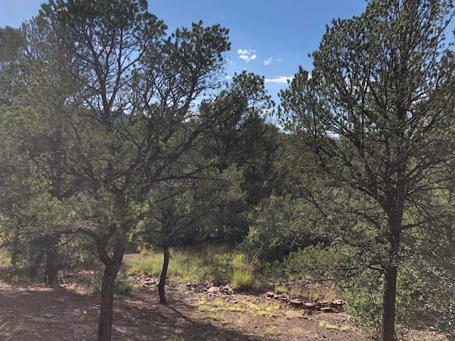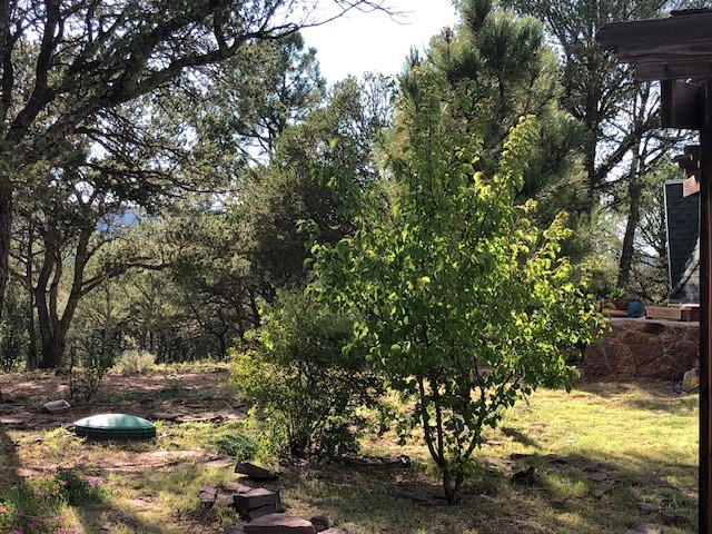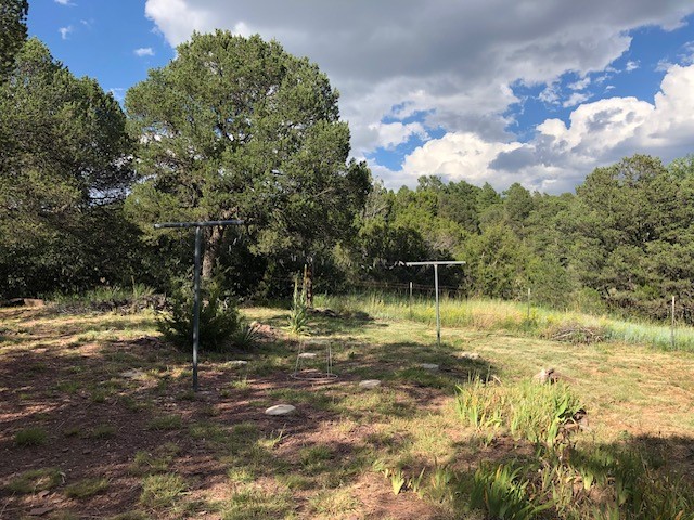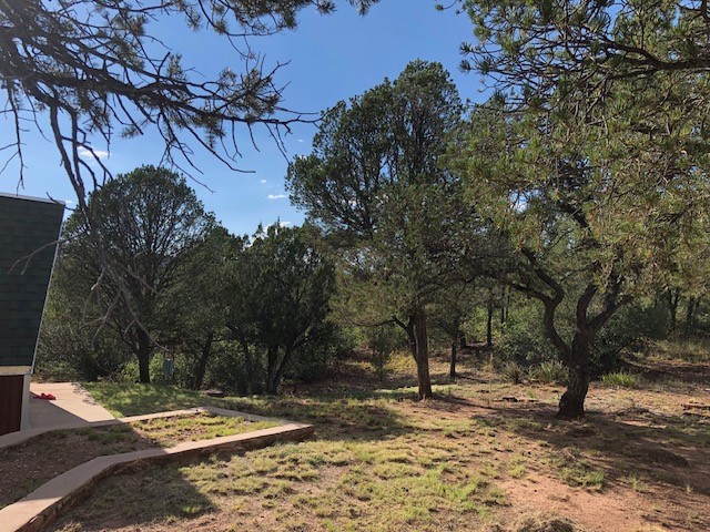 Fascinating geodesic dome home on five fenced acres which can be subdivided into 2 acre lots. The home features two primary suites with adjoining living areas. Downstairs suite has a Jacuzzi tub and a new Andersen window with eastern exposure. Awaken with the morning sun! Sunsets illuminate the upstairs suite with an unobstructed view of Hermit's Peak and beyond. New Andersen windows catch the breeze through the trees for cross ventilation.The manicured front yard is great for bocce ball or chipping from the rough. Enclosed carport and workshop are joined by a concrete pad. The 464' deep well pumps 15 GPM and is sufficient to water the trees, raised beds, a garden, and wash the cars, as well as provide for all domestic needs.The lower acreage is heavily forested and has a separate entrance. Water and power are available on the road. There is a 40' x 60' paved tennis court that has been protected by a retaining wall.