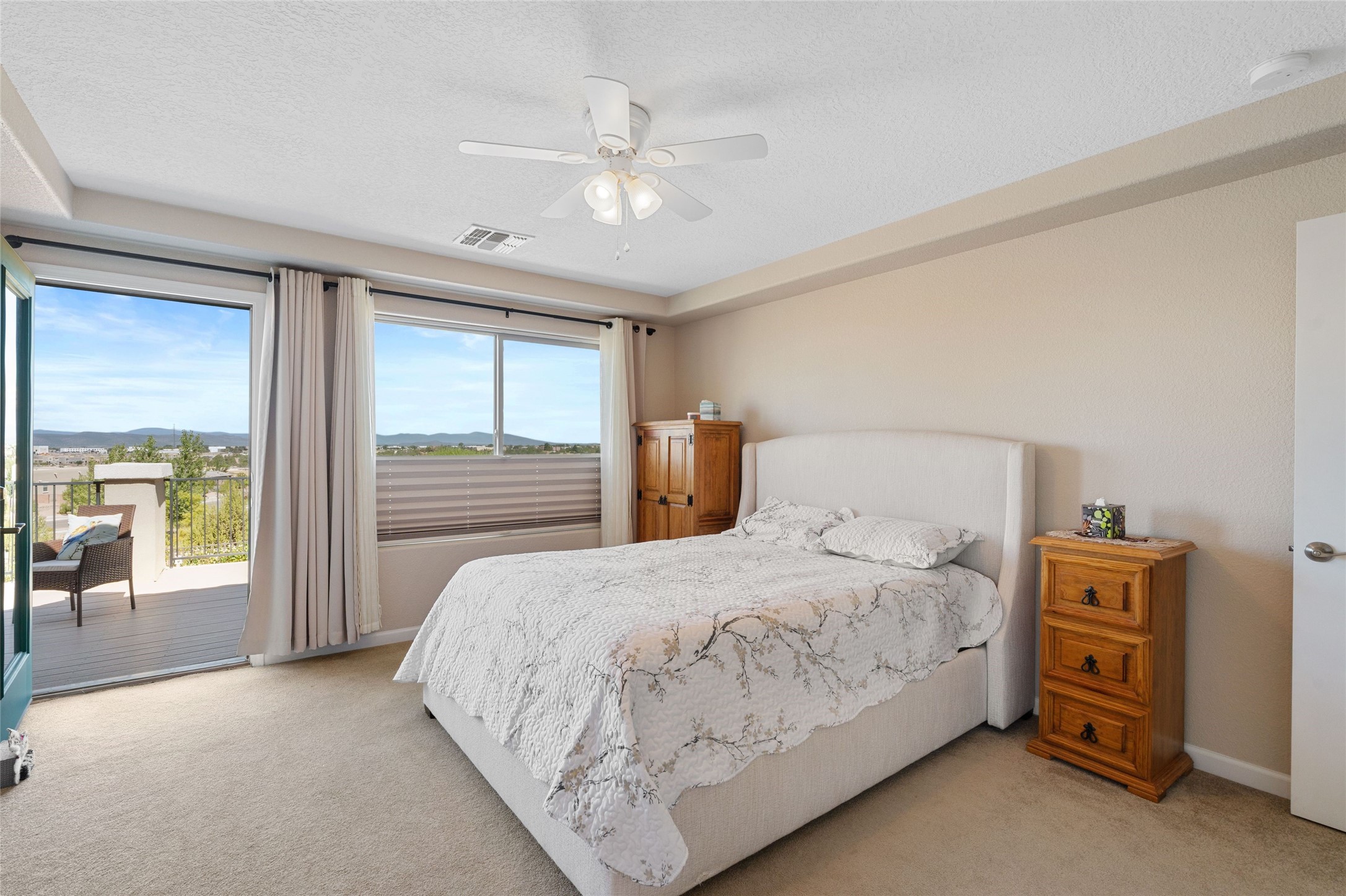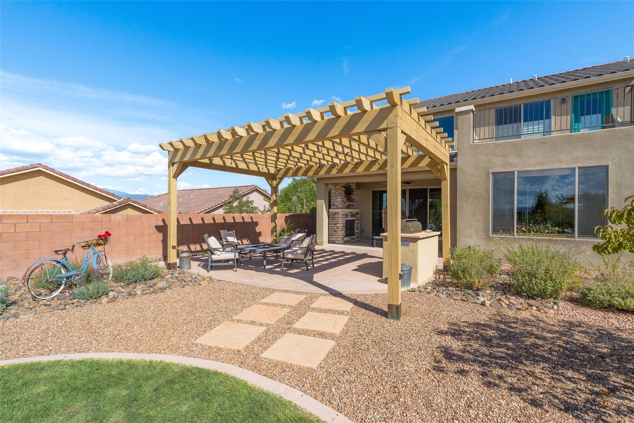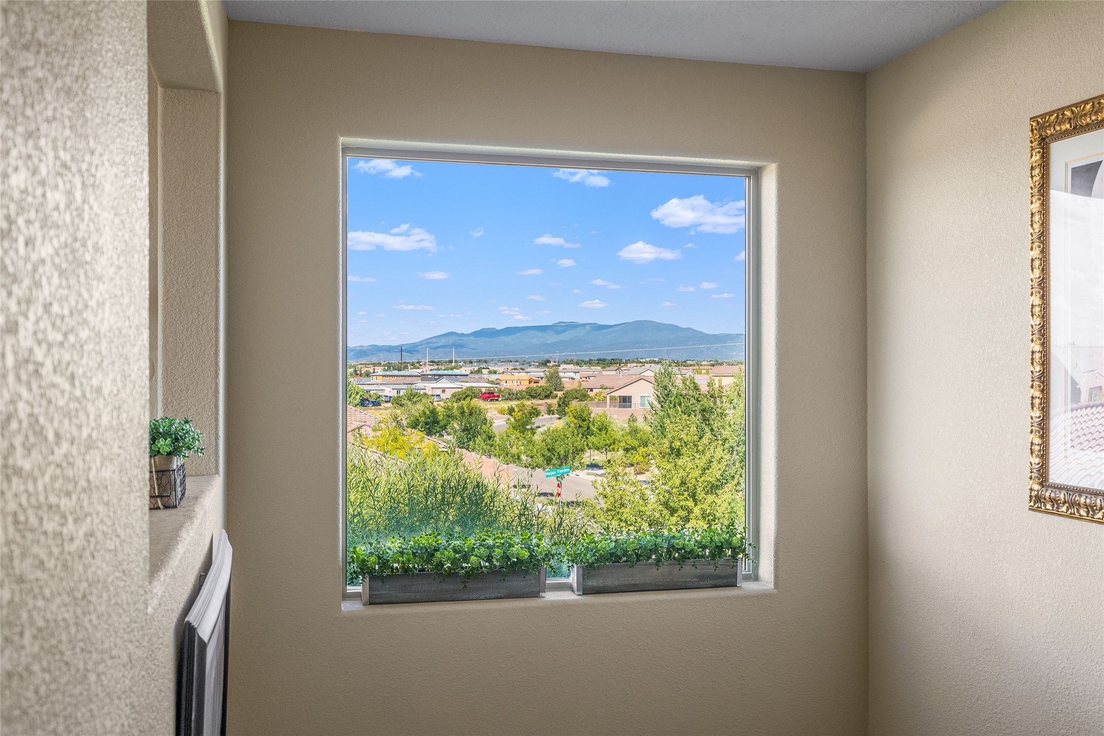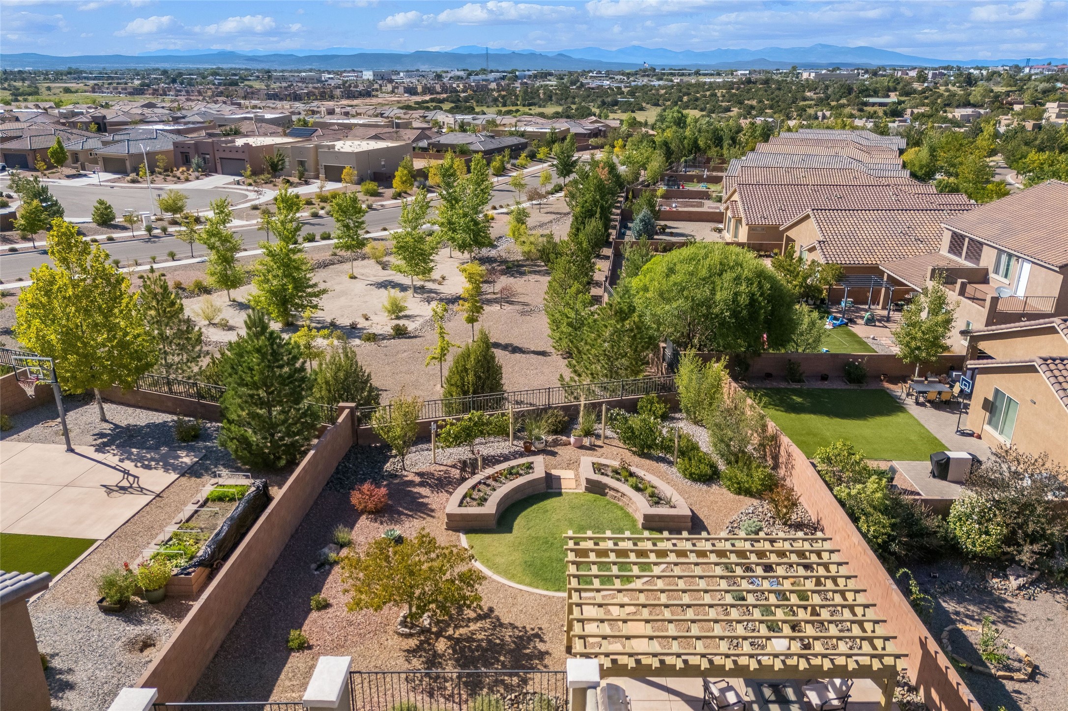5-bedroom 3 bath residence with captivating mountain and garden views located in Vista de las Solares neighborhood. This thoughtfully designed home provides plenty of space for comfortable living. The upgraded kitchen includes a modern cabinet system, perfect for culinary enthusiasts, while two inviting fireplaces enhance the warmth and charm of the living areas. The primary bedroom serves as a private sanctuary, offering a spacious walk-in closet, a relaxing soaking tub, and access to a private deck--ideal for enjoying the serene surroundings. The third and fourth bedrooms present flexible options, easily transforming into an office, studio, or exercise room based on your needs. A guest bedroom and bath are conveniently situated on the first floor, ensuring comfort for visitors. 2 bathrooms come with grab bars for safety and convenience. Step outside to discover a large backyard featuring grapevines, peach and plum trees, and raised garden beds, ideal for gardening aficionados. This outdoor space is equipped with two irrigation systems, a freeze-proof hydrant, and outdoor lighting, creating an inviting atmosphere for gatherings or quiet evenings. Landscaped yard with drought resistant garden with buffalo grass. Energy efficiency is a highlight of this property with photovoltaic solar panels, SMART home upgrades and wired garage for an EV charger, all promoting sustainable living. Conveniently located near the Santa Fe Regional Airport, Santa Fe Place Mall, and Presbyterian Medical Center.