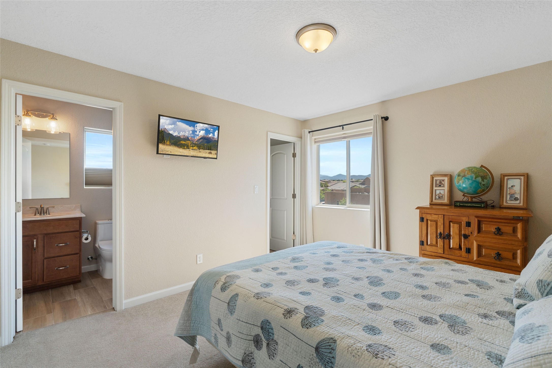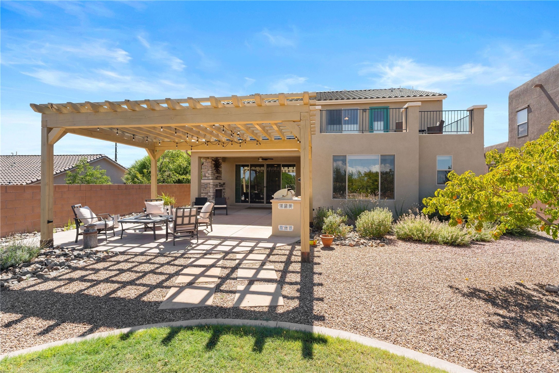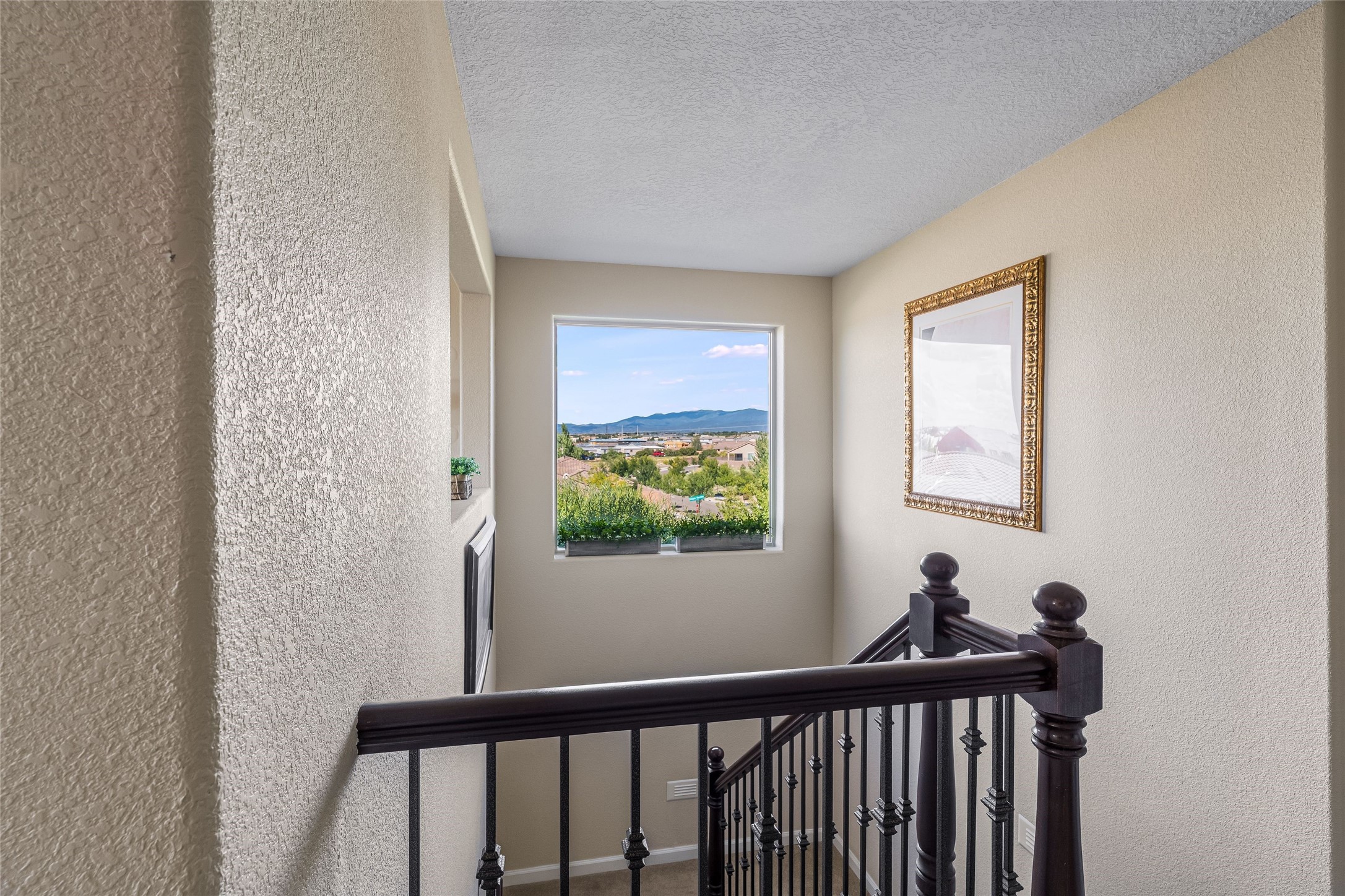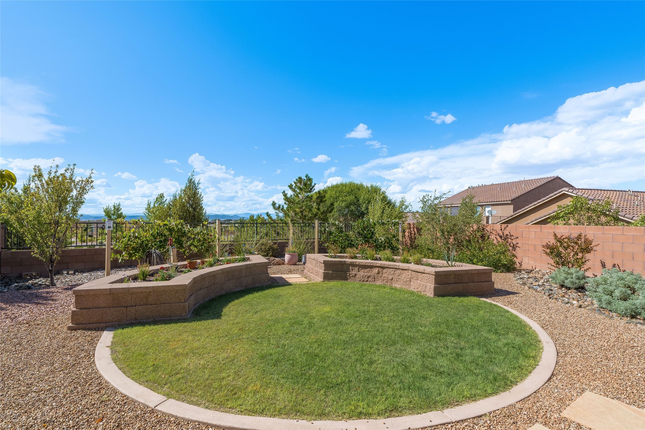 5-bedroom 3 bath residence with captivating mountain and garden views located in Vista de las Solares neighborhood. This thoughtfully designed home provides plenty of space for comfortable living. The upgraded kitchen includes a modern cabinet system, perfect for culinary enthusiasts, while two inviting fireplaces enhance the warmth and charm of the living areas. The primary bedroom serves as a private sanctuary, offering a spacious walk-in closet, a relaxing soaking tub, and access to a private deck--ideal for enjoying the serene surroundings. The third and fourth bedrooms present flexible options, easily transforming into an office, studio, or exercise room based on your needs. A guest bedroom and bath are conveniently situated on the first floor, ensuring comfort for visitors. 2 bathrooms come with grab bars for safety and convenience. Step outside to discover a large backyard featuring grapevines, peach and plum trees, and raised garden beds, ideal for gardening aficionados. This outdoor space is equipped with two irrigation systems, a freeze-proof hydrant, and outdoor lighting, creating an inviting atmosphere for gatherings or quiet evenings. Landscaped yard with drought resistant garden with buffalo grass. Energy efficiency is a highlight of this property with photovoltaic solar panels, SMART home upgrades and wired garage for an EV charger, all promoting sustainable living. Conveniently located near the Santa Fe Regional Airport, Santa Fe Place Mall, and Presbyterian Medical Center.