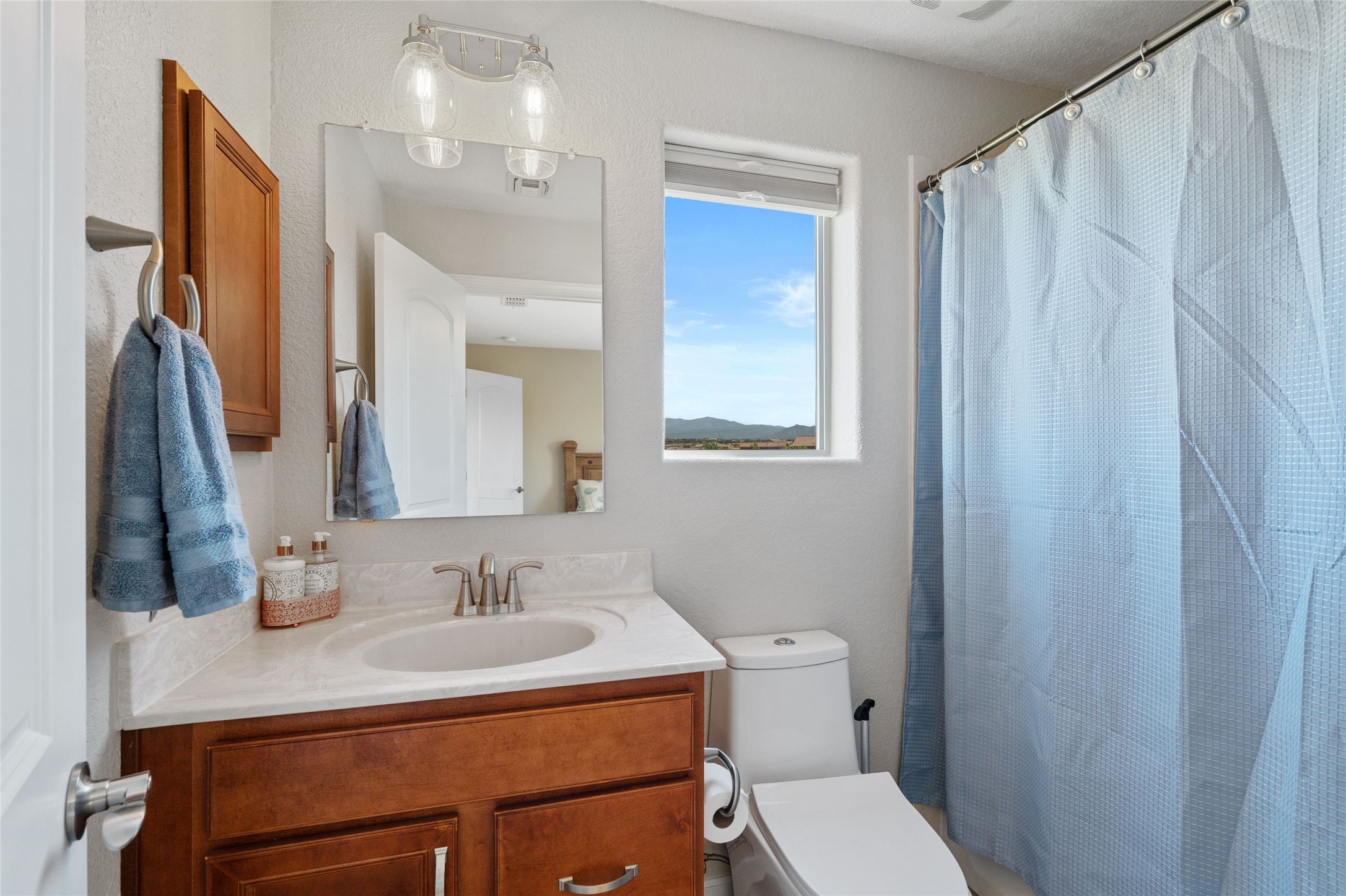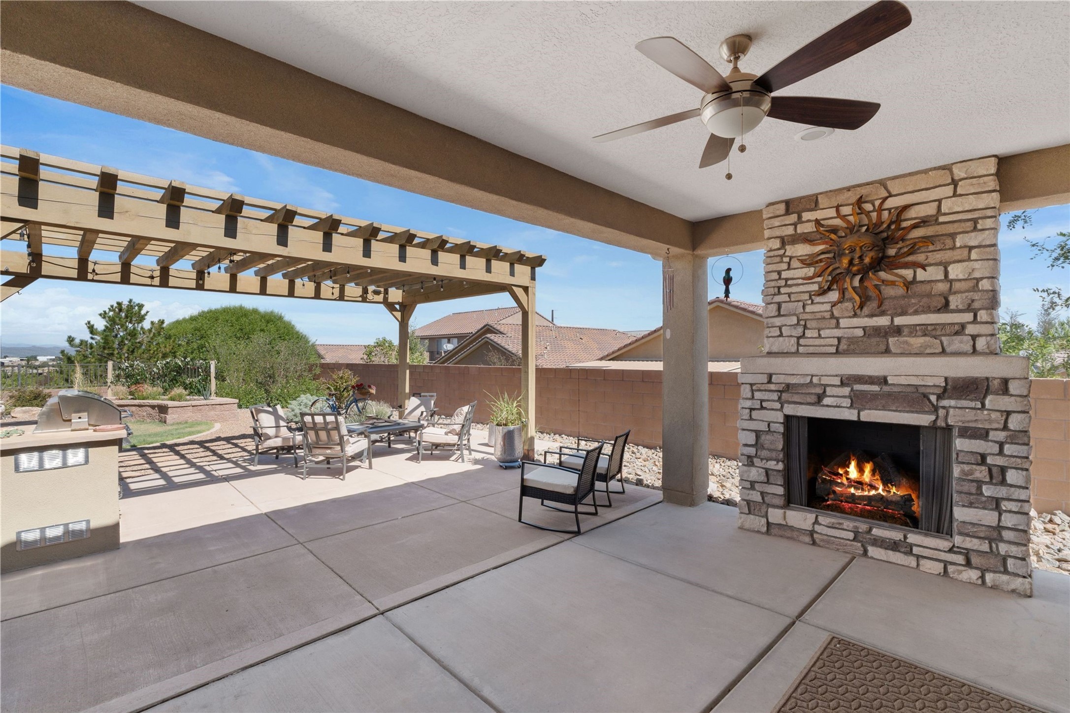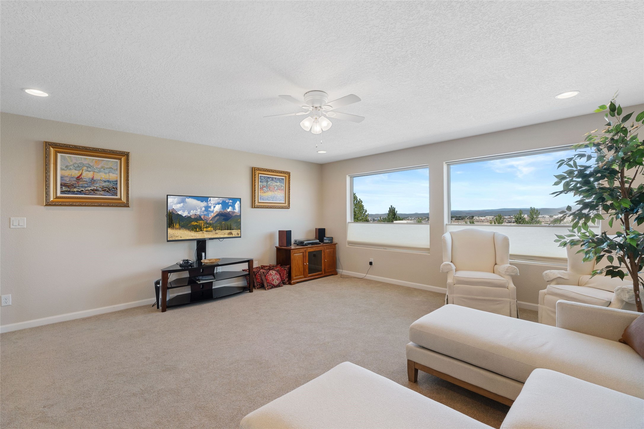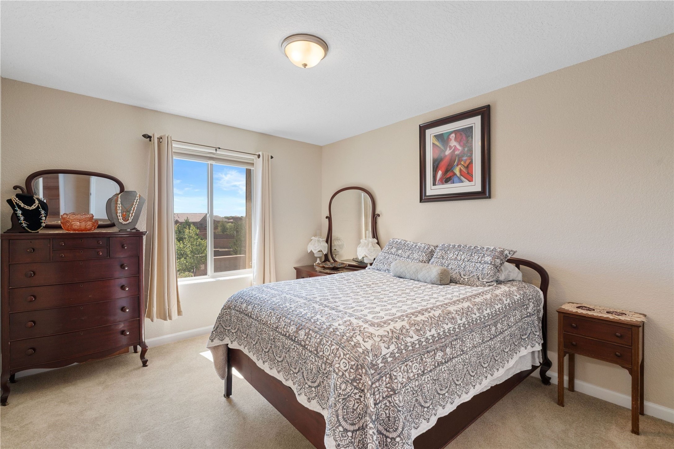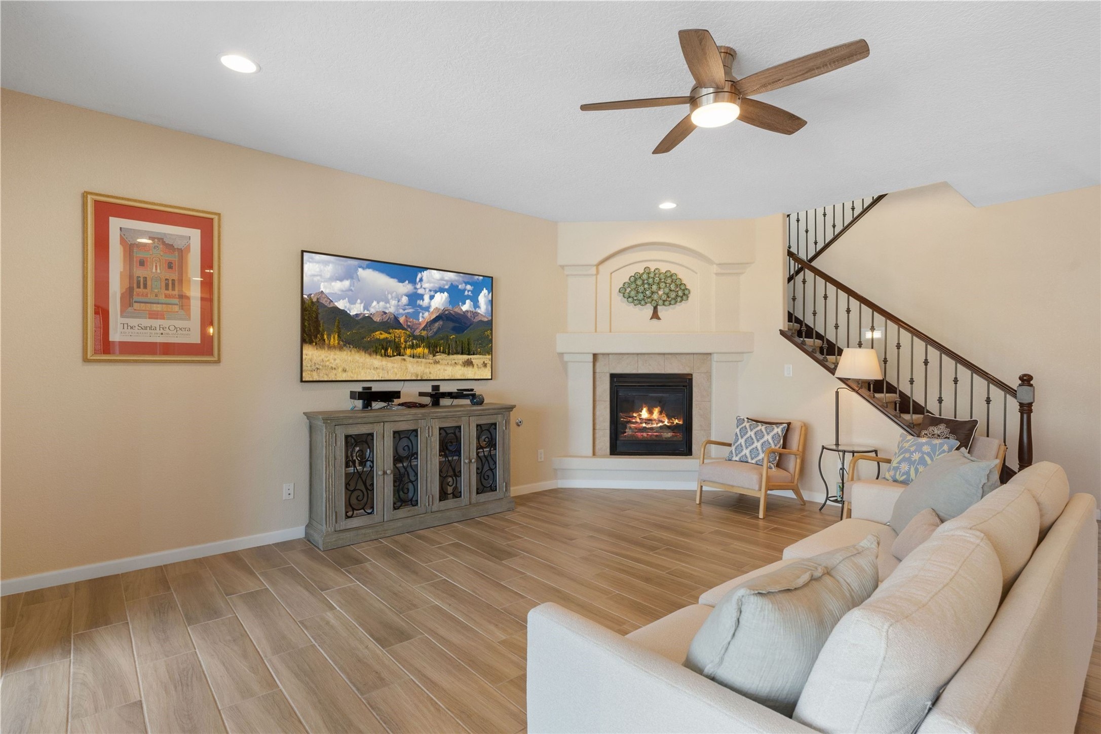 5-bedroom 3 bath residence with captivating mountain and garden views located in Vista de las Solares neighborhood. This thoughtfully designed home provides plenty of space for comfortable living. The upgraded kitchen includes a modern cabinet system, perfect for culinary enthusiasts, while two inviting fireplaces enhance the warmth and charm of the living areas. The primary bedroom serves as a private sanctuary, offering a spacious walk-in closet, a relaxing soaking tub, and access to a private deck--ideal for enjoying the serene surroundings. The third and fourth bedrooms present flexible options, easily transforming into an office, studio, or exercise room based on your needs. A guest bedroom and bath are conveniently situated on the first floor, ensuring comfort for visitors. 2 bathrooms come with grab bars for safety and convenience. Step outside to discover a large backyard featuring grapevines, peach and plum trees, and raised garden beds, ideal for gardening aficionados. This outdoor space is equipped with two irrigation systems, a freeze-proof hydrant, and outdoor lighting, creating an inviting atmosphere for gatherings or quiet evenings. Landscaped yard with drought resistant garden with buffalo grass. Energy efficiency is a highlight of this property with photovoltaic solar panels, SMART home upgrades and wired garage for an EV charger, all promoting sustainable living. Conveniently located near the Santa Fe Regional Airport, Santa Fe Place Mall, and Presbyterian Medical Center.