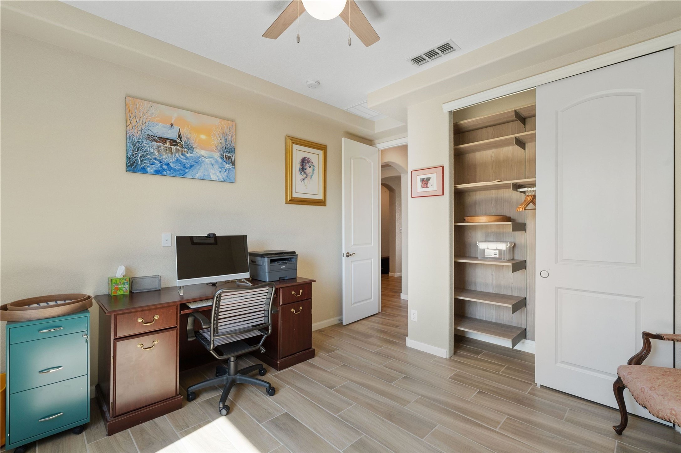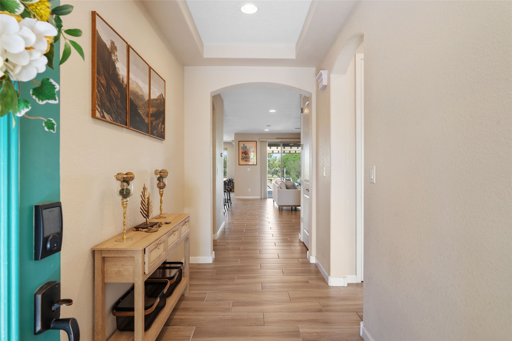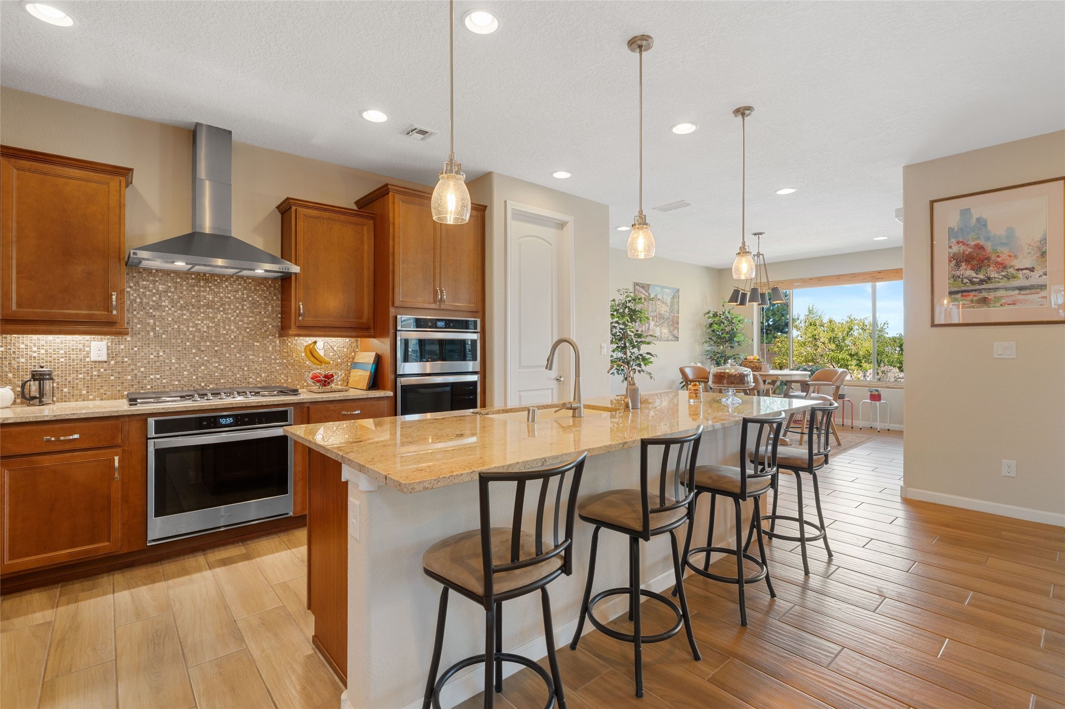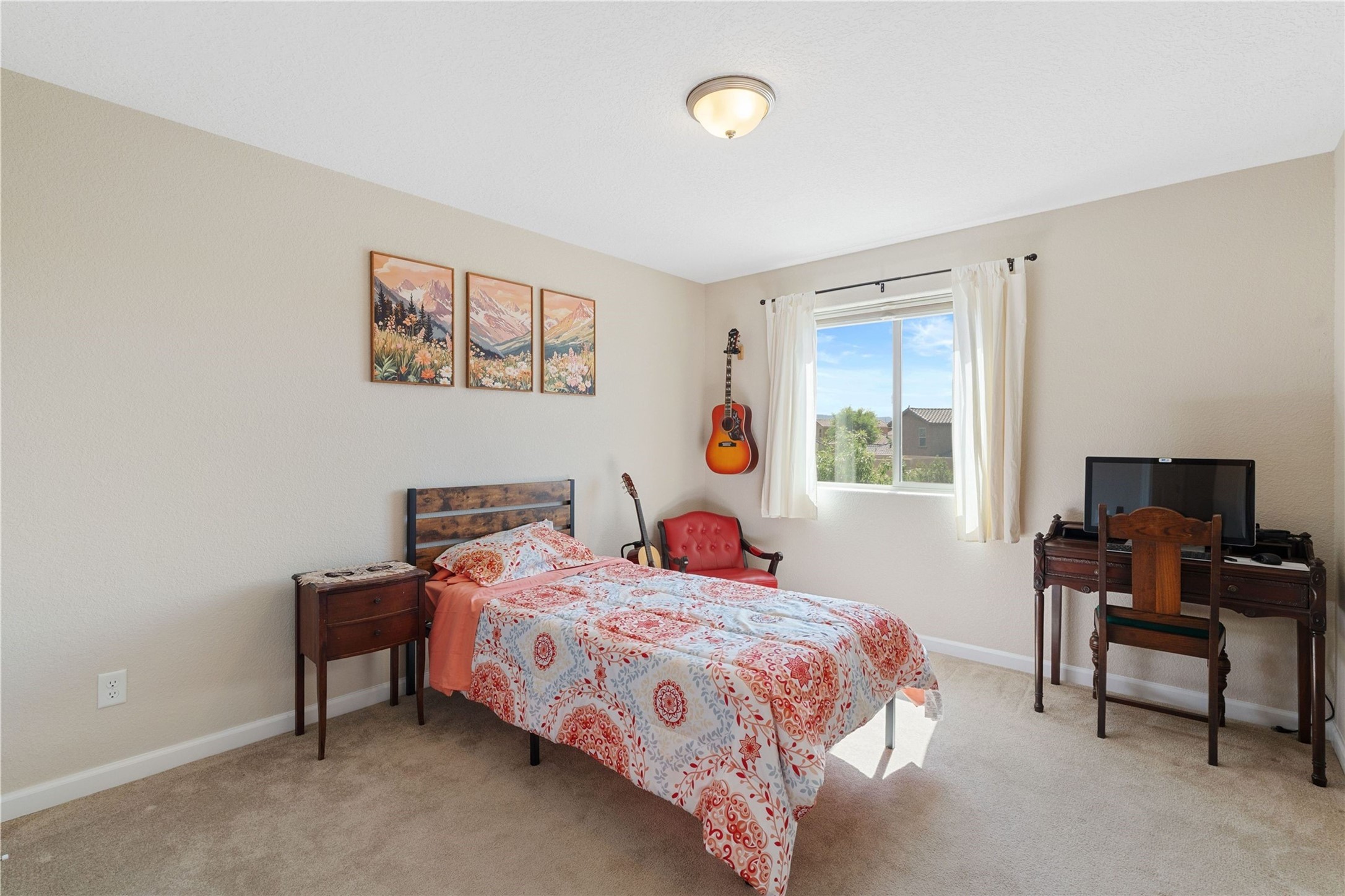5-bedroom 3 bath residence with captivating mountain and garden views located in Vista de las Solares neighborhood. This thoughtfully designed home provides plenty of space for comfortable living. The upgraded kitchen includes a modern cabinet system, perfect for culinary enthusiasts, while two inviting fireplaces enhance the warmth and charm of the living areas. The primary bedroom serves as a private sanctuary, offering a spacious walk-in closet, a relaxing soaking tub, and access to a private deck--ideal for enjoying the serene surroundings. The third and fourth bedrooms present flexible options, easily transforming into an office, studio, or exercise room based on your needs. A guest bedroom and bath are conveniently situated on the first floor, ensuring comfort for visitors. 2 bathrooms come with grab bars for safety and convenience. Step outside to discover a large backyard featuring grapevines, peach and plum trees, and raised garden beds, ideal for gardening aficionados. This outdoor space is equipped with two irrigation systems, a freeze-proof hydrant, and outdoor lighting, creating an inviting atmosphere for gatherings or quiet evenings. Landscaped yard with drought resistant garden with buffalo grass. Energy efficiency is a highlight of this property with photovoltaic solar panels, SMART home upgrades and wired garage for an EV charger, all promoting sustainable living. Conveniently located near the Santa Fe Regional Airport, Santa Fe Place Mall, and Presbyterian Medical Center.